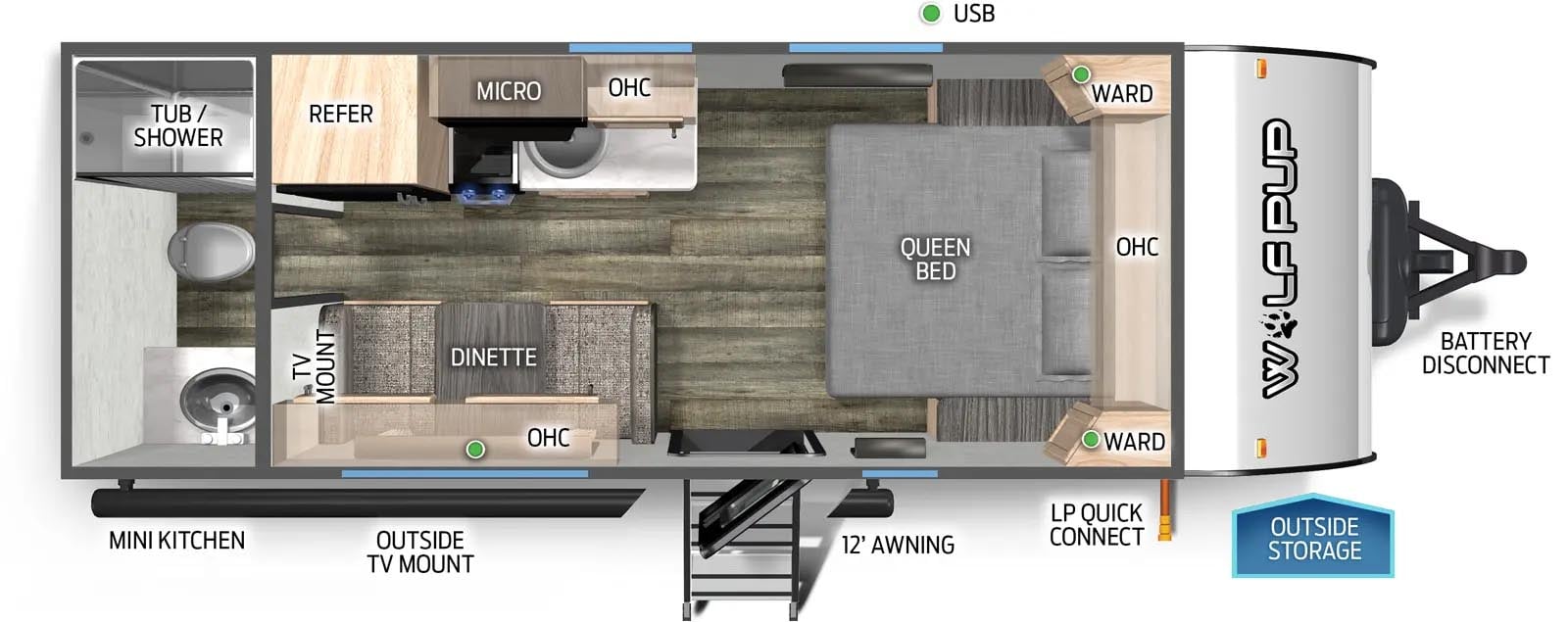 There’s a variety of different Wolf Pup Black Label floor plans available to suit families of all sizes and camping styles. The 16FQWBL features a comfy queen bed, perfect for couples who want a cozy getaway, while the 17JWBL comes with bunk beds and a convertible dinette to accommodate up to eight. If you’re into toy haulers, you’ll love the 18RJBWBL, which sports a 13’11” garage ideal for bringing along ATVs and motorcycles. All models include great standard features such as 13,500 BTU air conditioning and 20,000 BTU furnaces, as well as seamless roofing membranes to keep things comfortable inside.