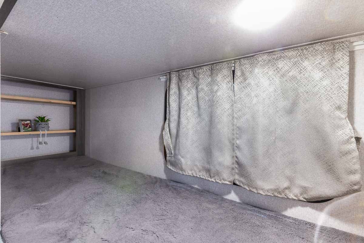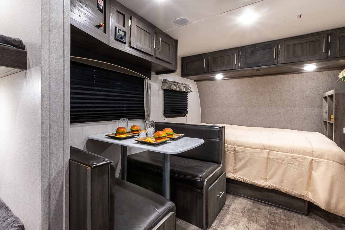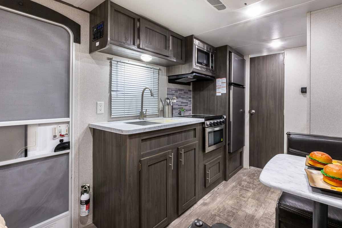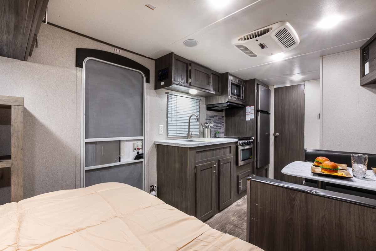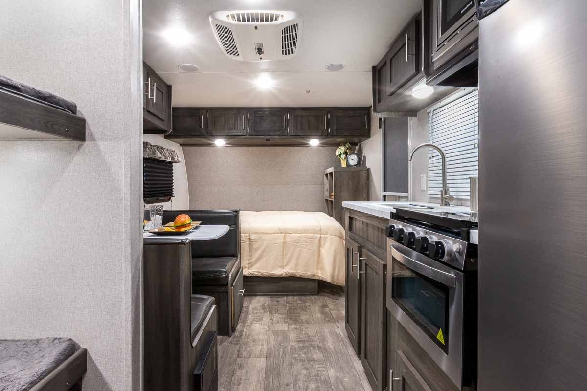 Inside, the well-planned layout features a front queen bed, rear bunk beds, and a convertible dinette, providing comfortable sleeping space for the whole family. Ample storage is available throughout. The kitchen comes fully equipped with a 12V refrigerator, microwave, range/oven, a large sink, and a residential-style faucet. The bathroom includes a shower, toilet, and vanity for the privacy and convenience of home on the road.