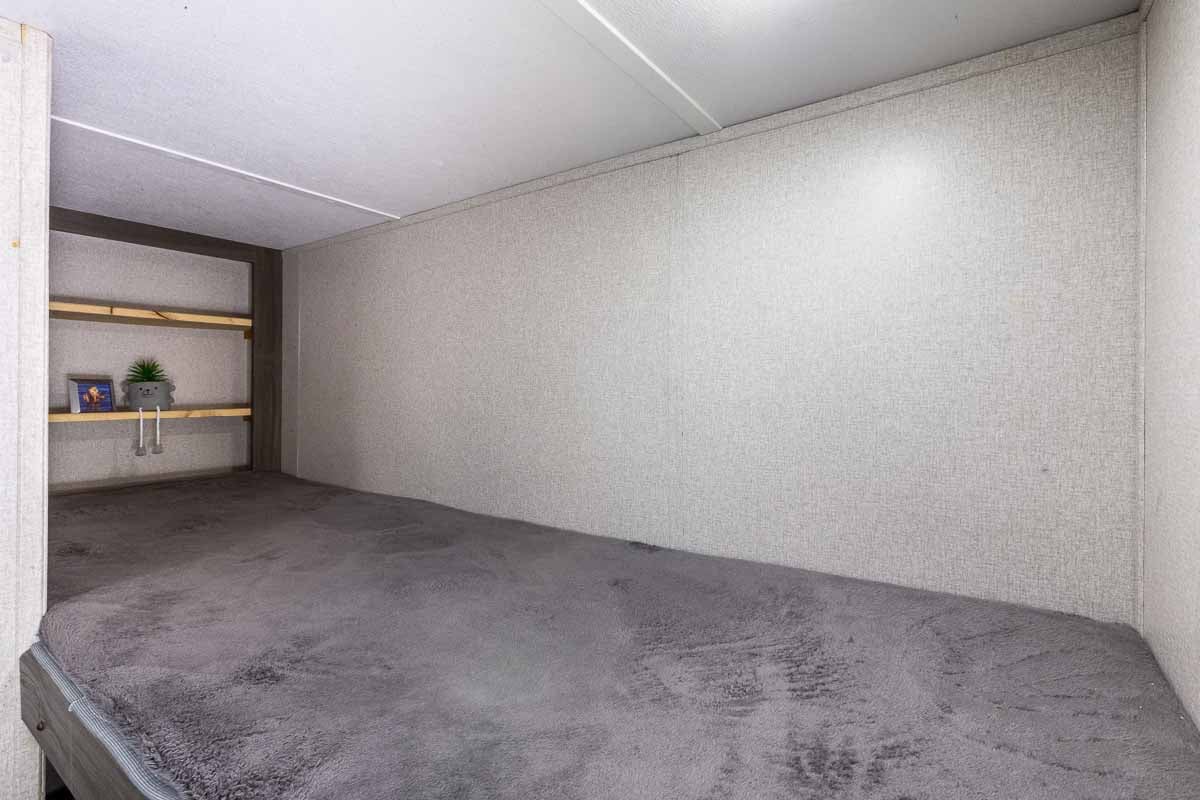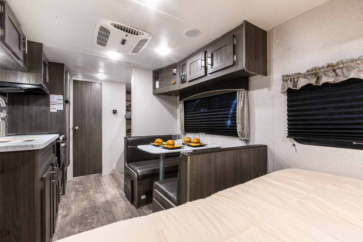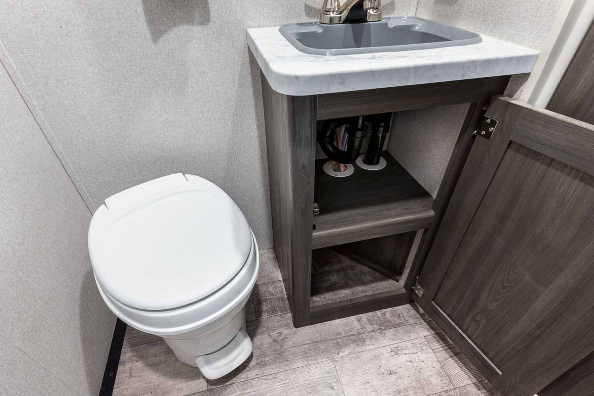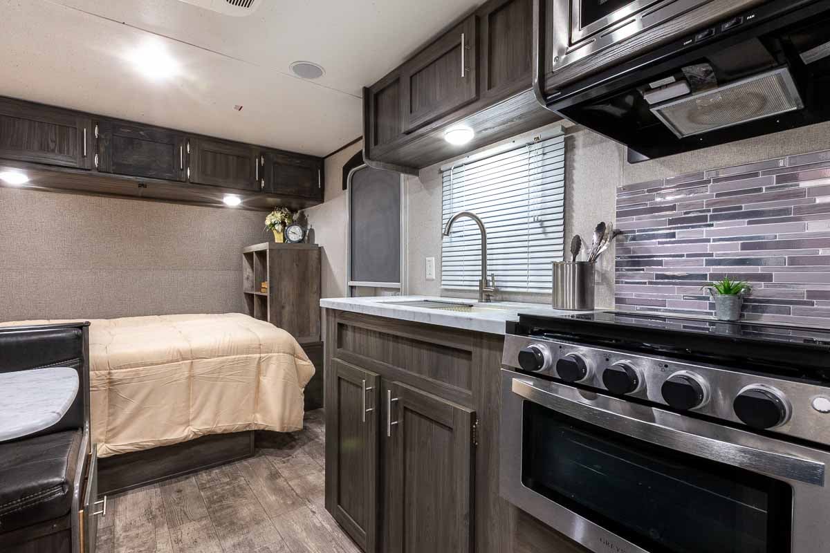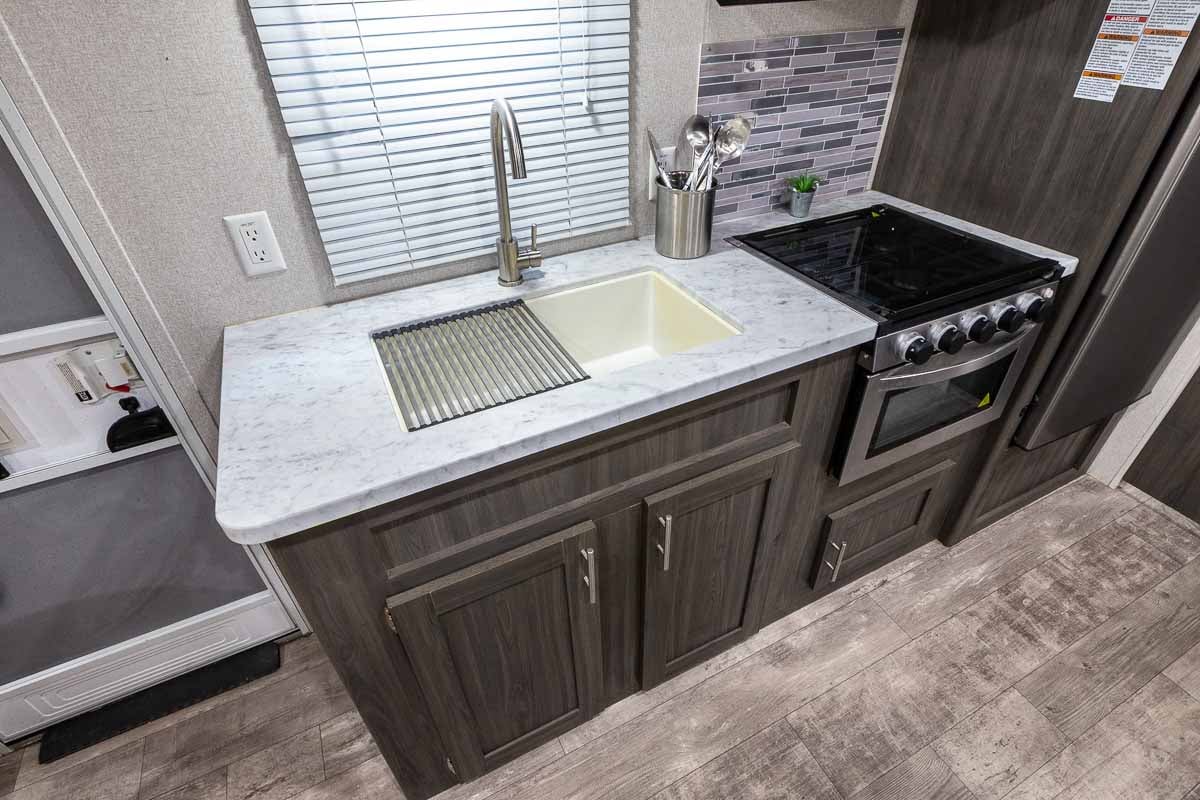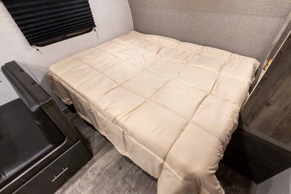Inside, the well-planned layout features a front queen bed, rear bunk beds, and a convertible dinette, providing comfortable sleeping space for the whole family. Ample storage is available throughout. The kitchen comes fully equipped with a 12V refrigerator, microwave, range/oven, a large sink, and a residential-style faucet. The bathroom includes a shower, toilet, and vanity for the privacy and convenience of home on the road.