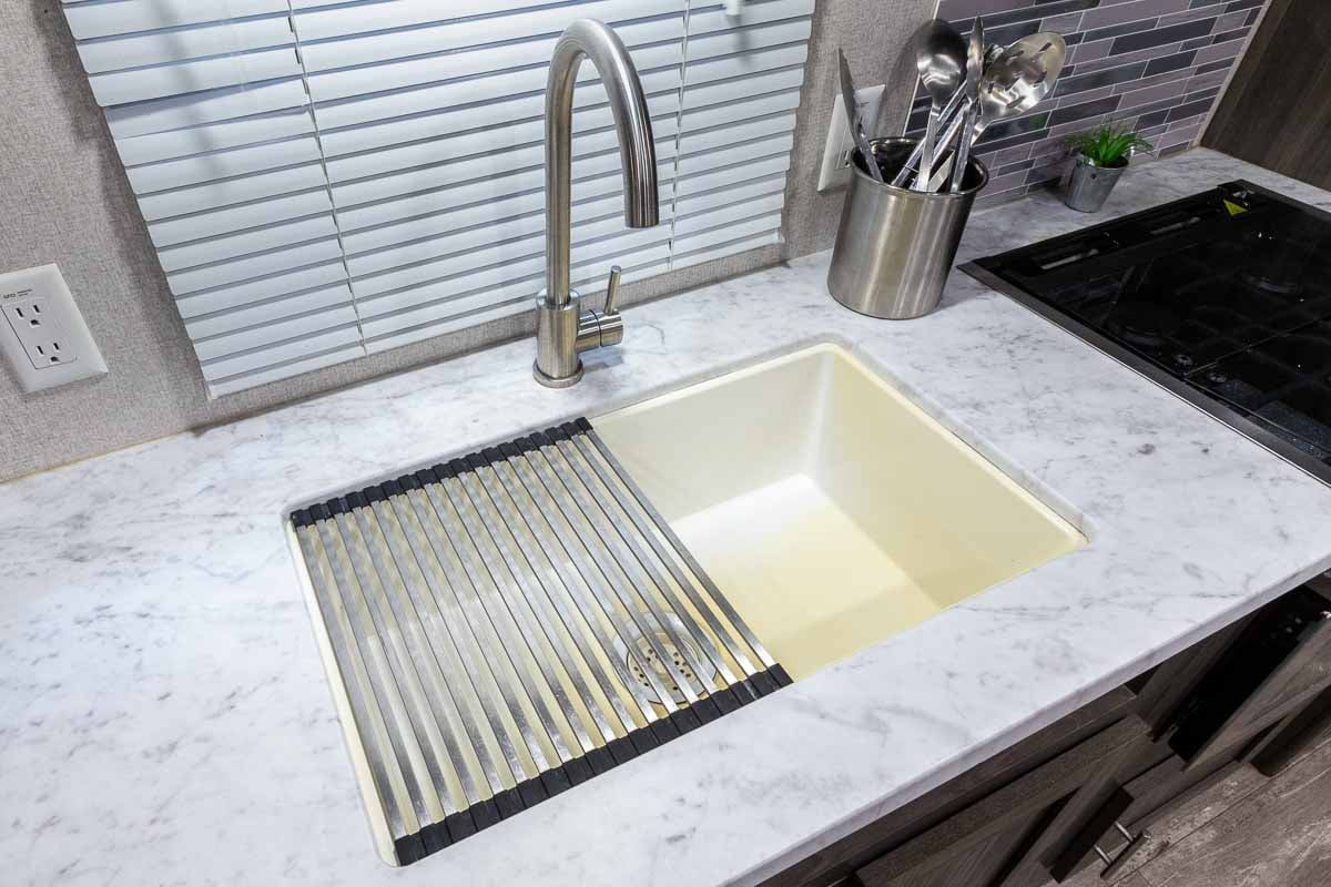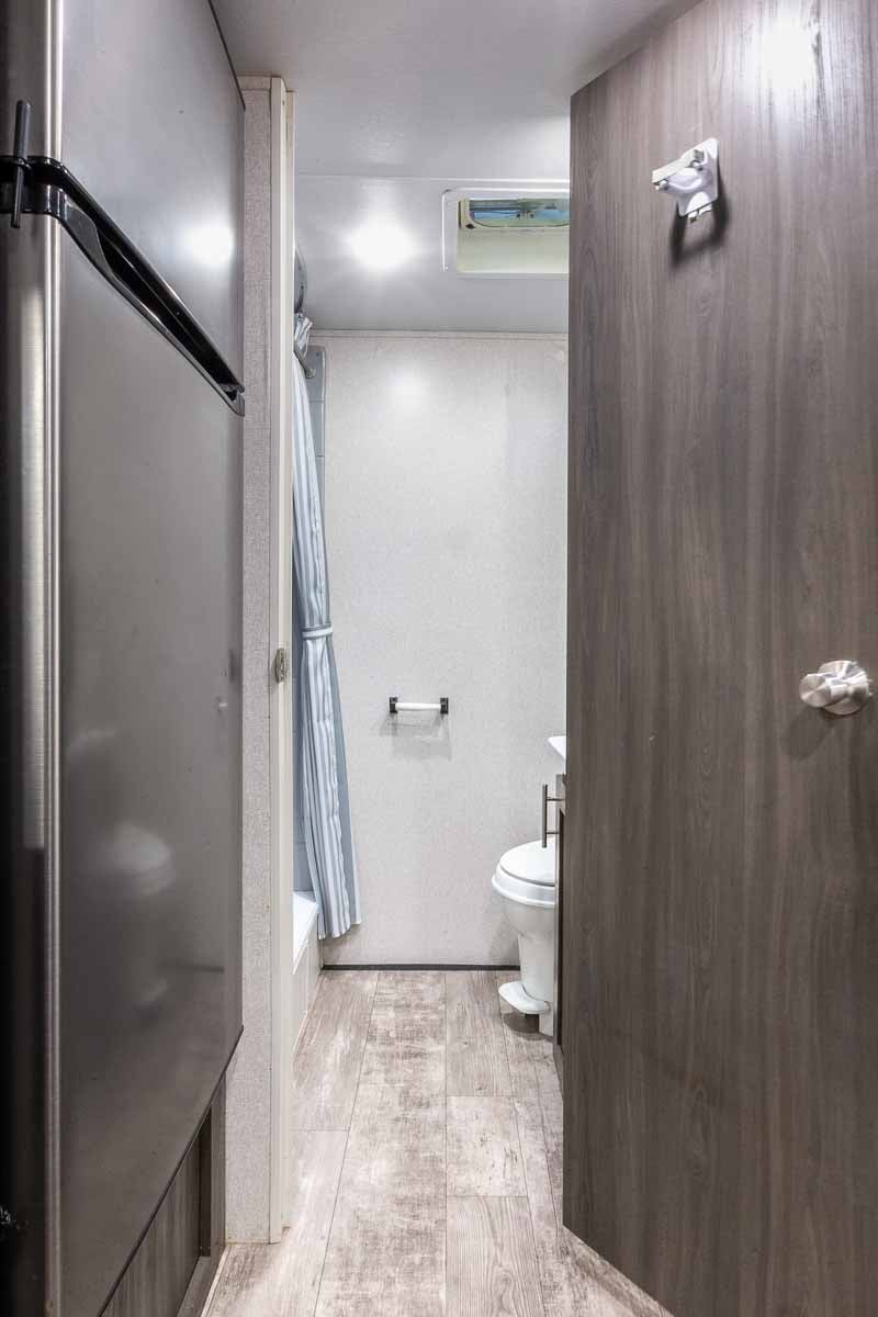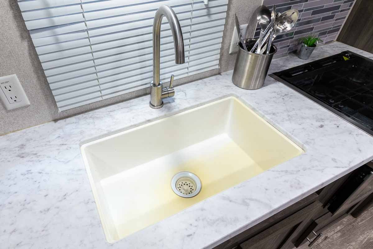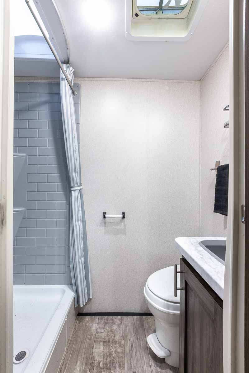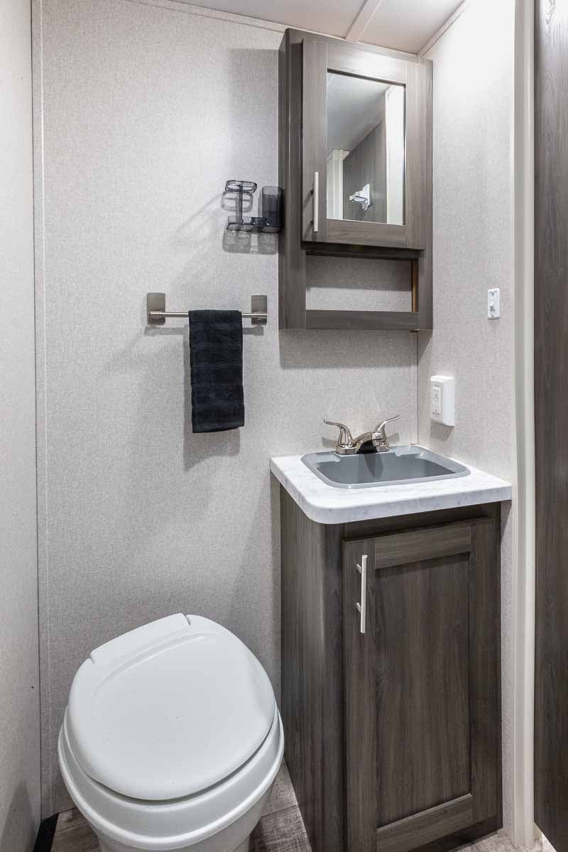 Inside, the well-planned layout features a front queen bed, rear bunk beds, and a convertible dinette, providing comfortable sleeping space for the whole family. Ample storage is available throughout. The kitchen comes fully equipped with a 12V refrigerator, microwave, range/oven, a large sink, and a residential-style faucet. The bathroom includes a shower, toilet, and vanity for the privacy and convenience of home on the road.