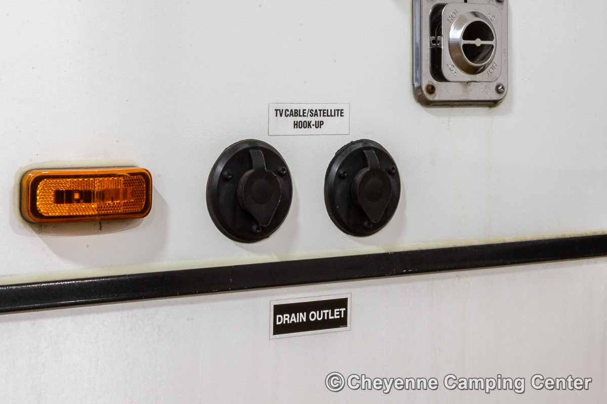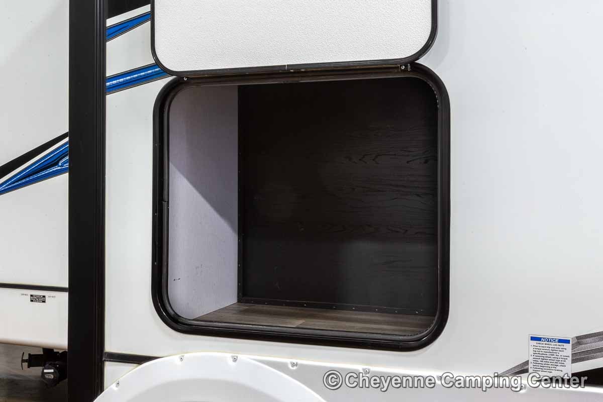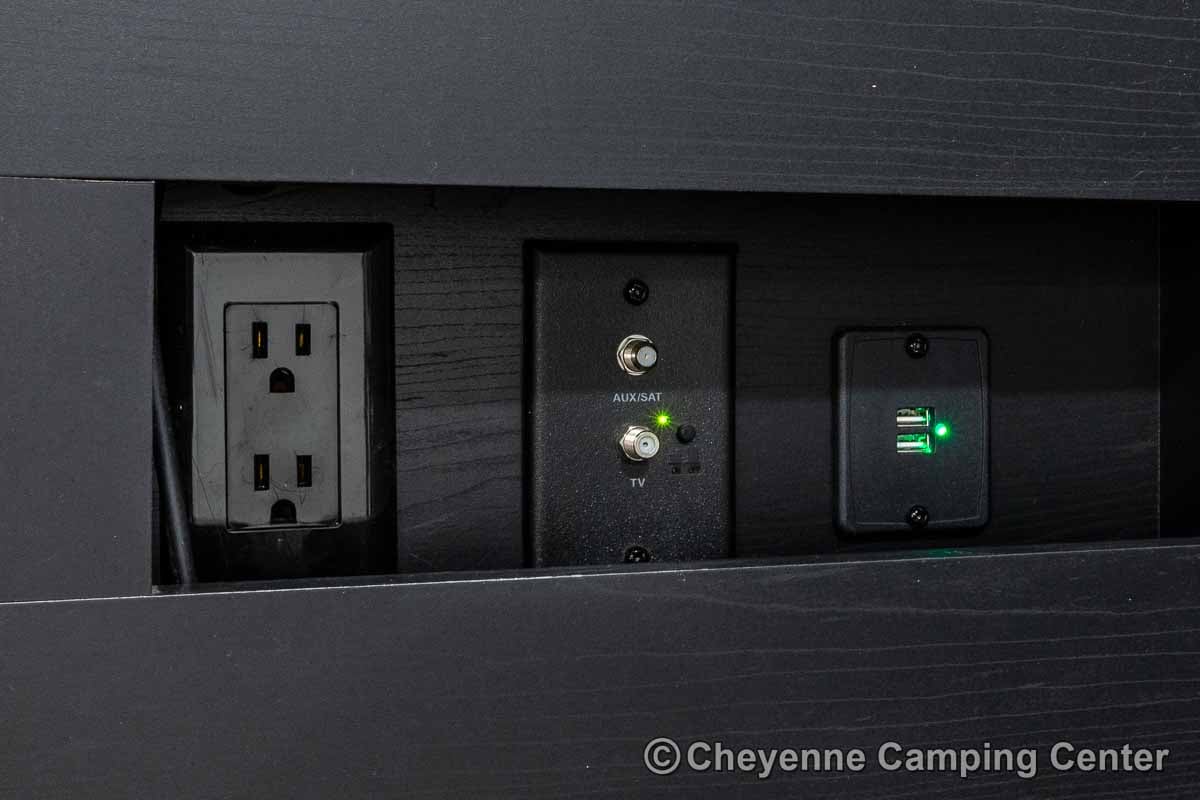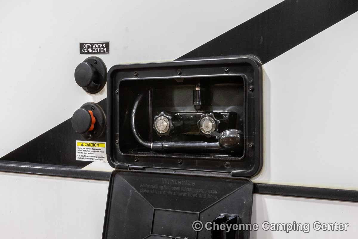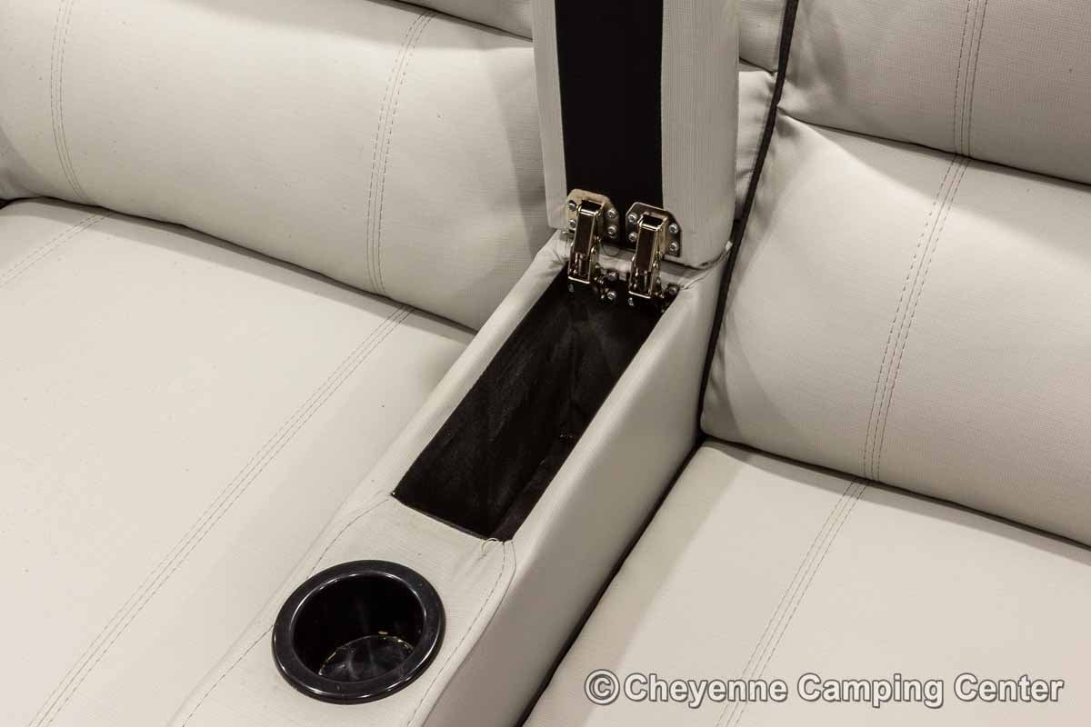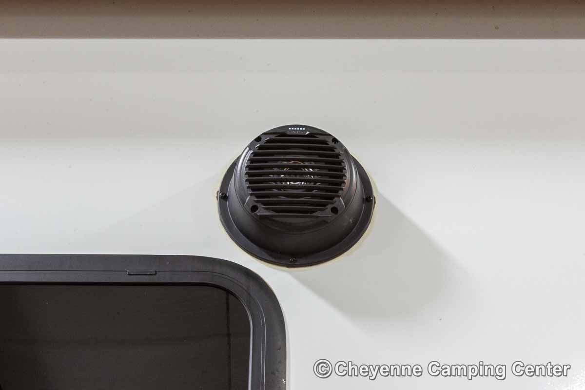 Outside, you’ll find gel-gloss fiberglass, marine-grade speakers, an outdoor shower, multiple storage compartments, and an adjustable power awning for easy outdoor living.