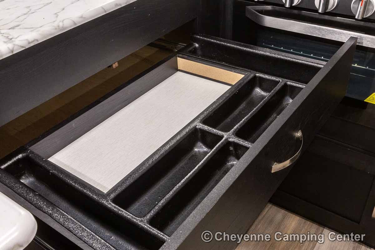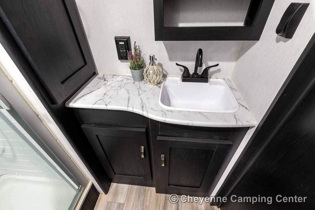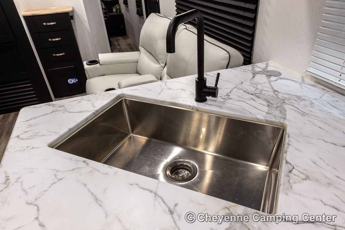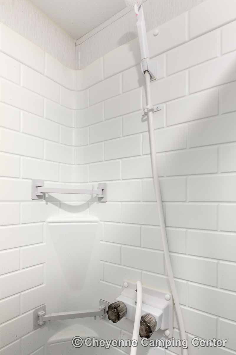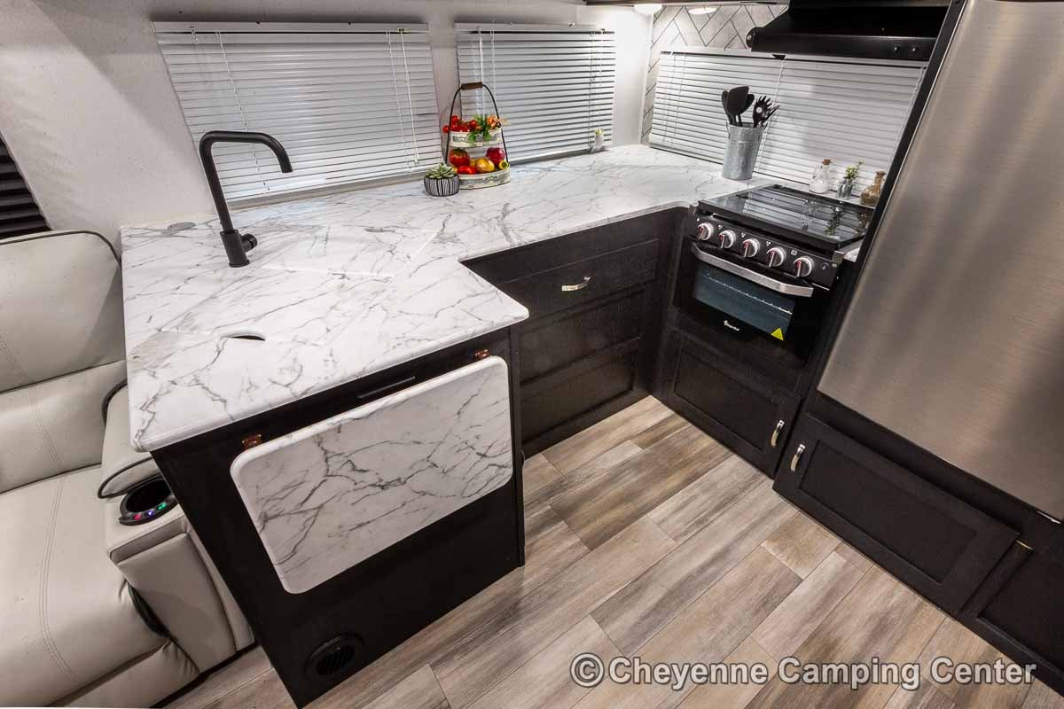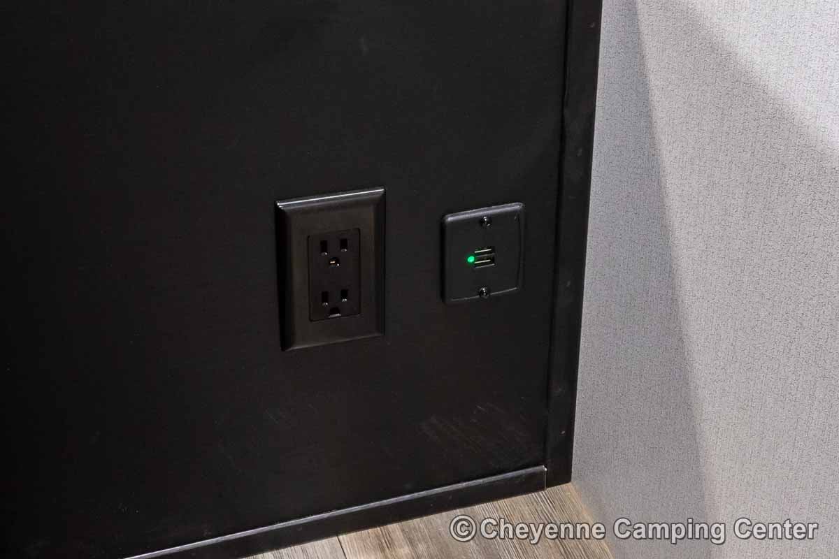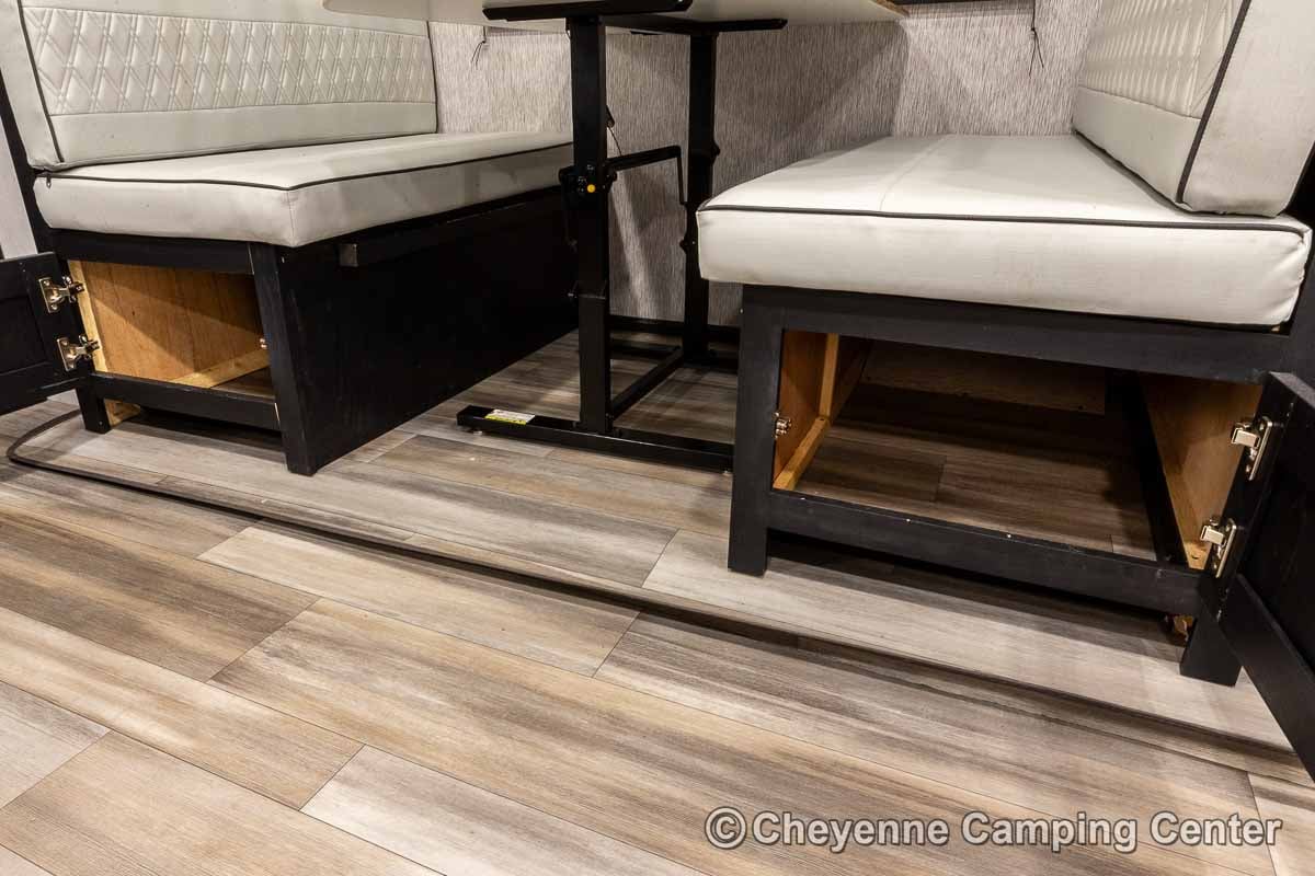 Outside, you’ll find gel-gloss fiberglass, marine-grade speakers, an outdoor shower, multiple storage compartments, and an adjustable power awning for easy outdoor living.