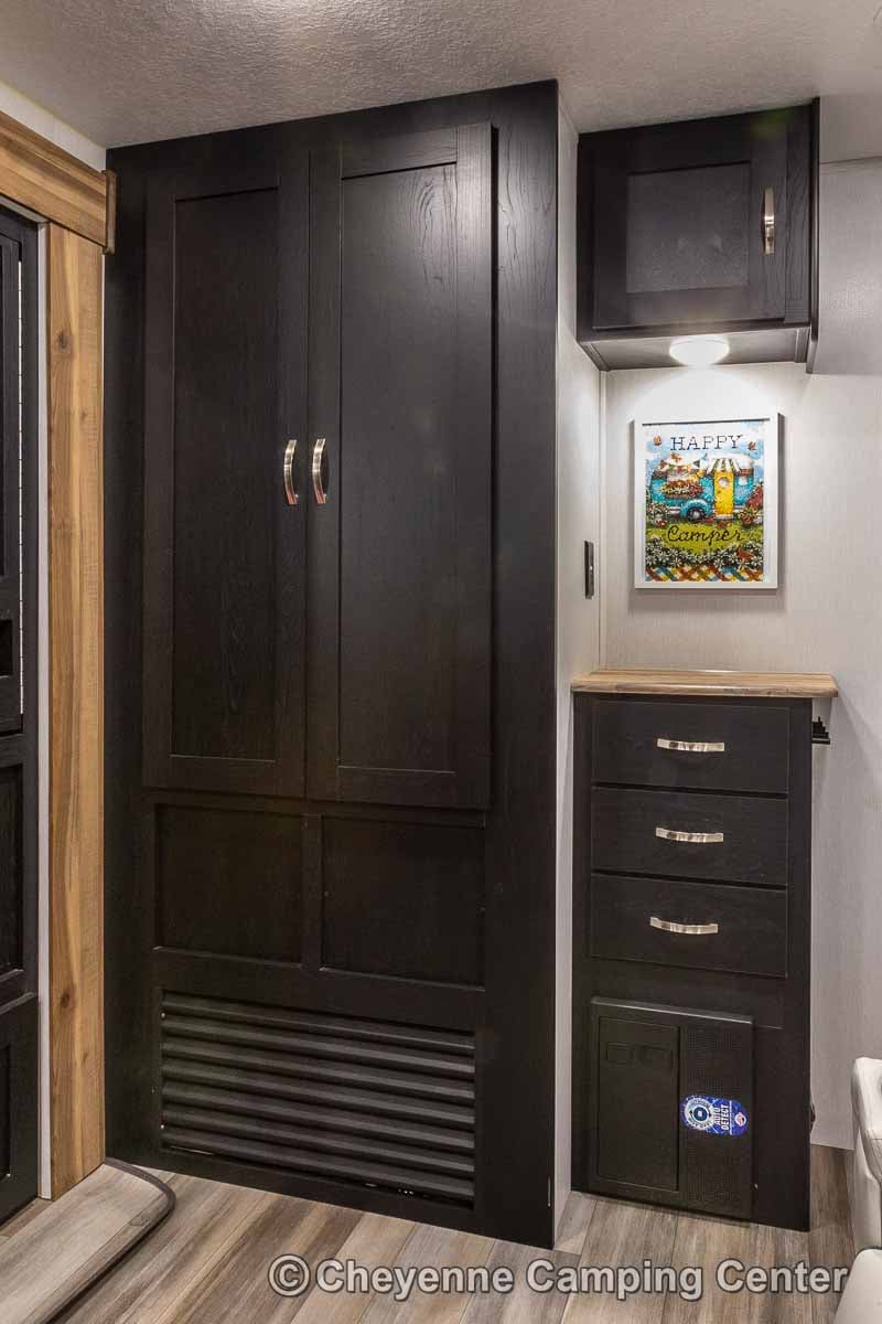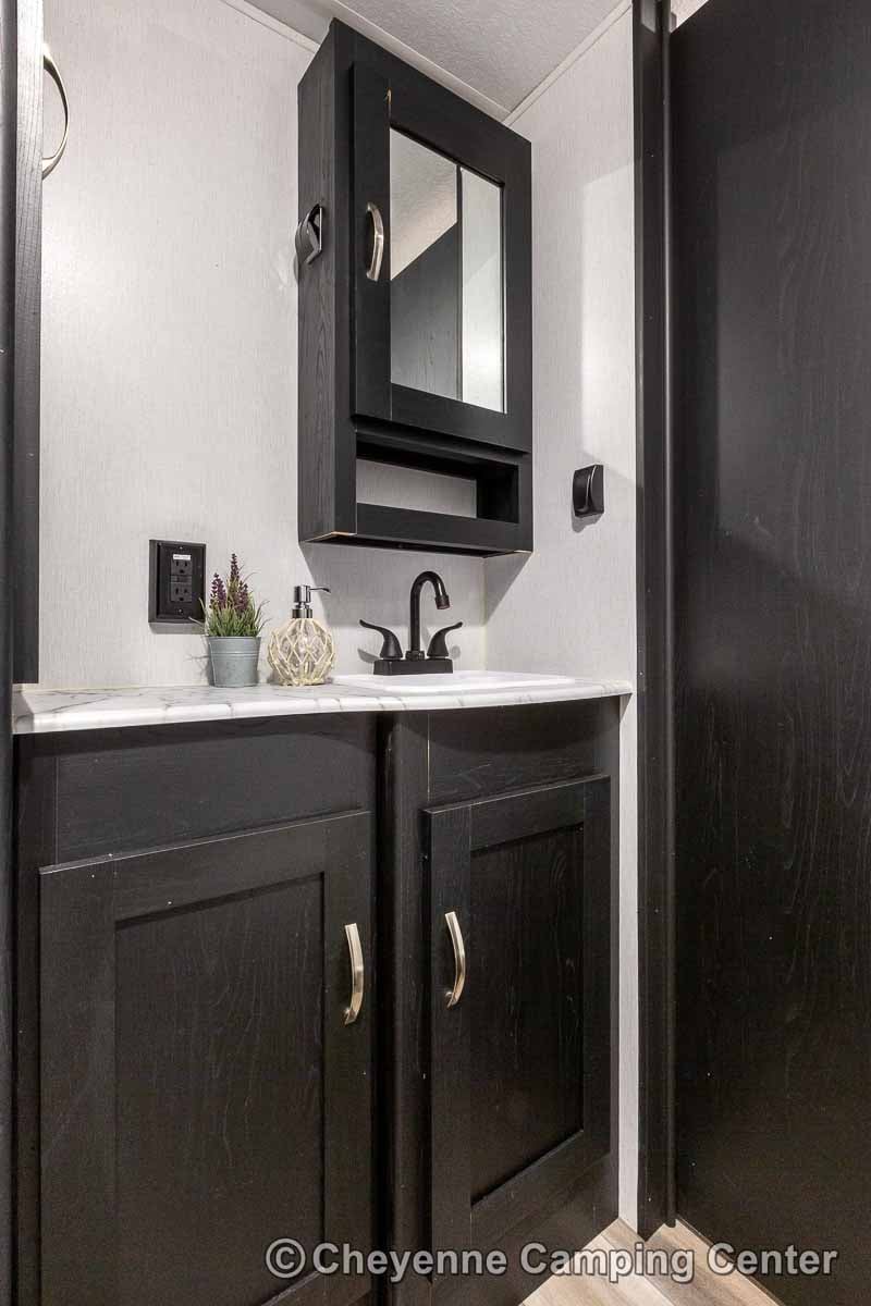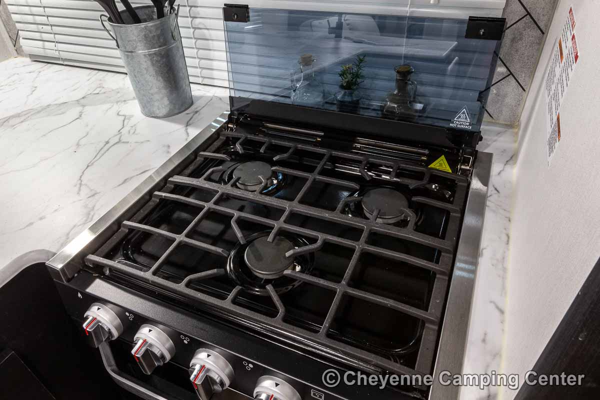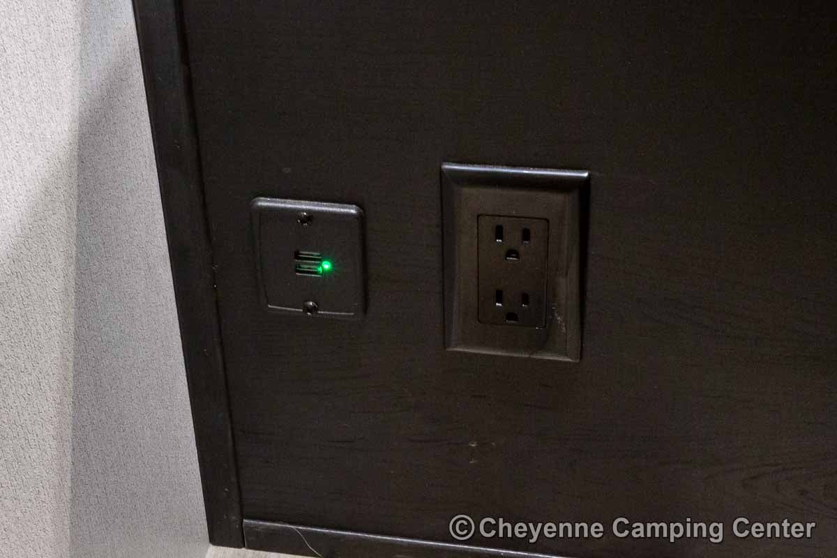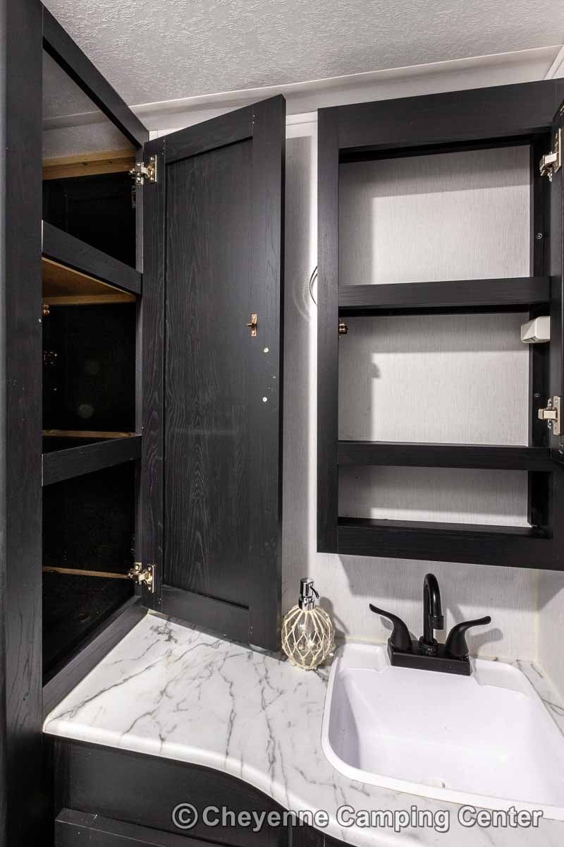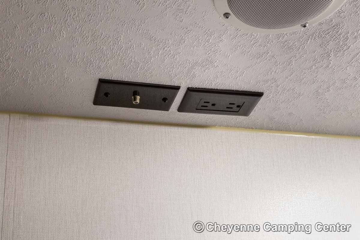 Outside, you’ll find gel-gloss fiberglass, marine-grade speakers, an outdoor shower, multiple storage compartments, and an adjustable power awning for easy outdoor living.