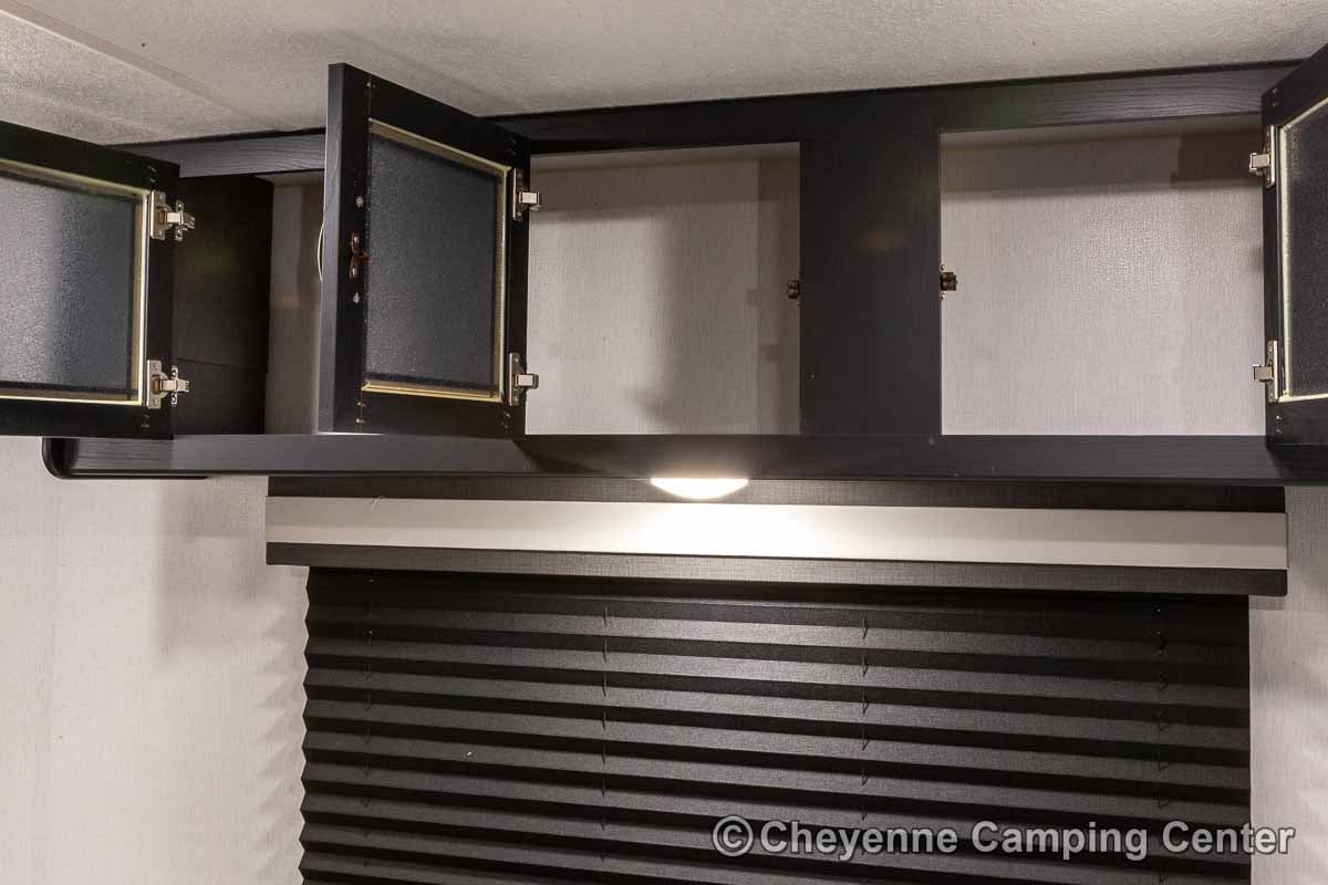 The bathroom features a glass-enclosed shower with skylight, a foot-flush toilet, a vent fan, a vanity with a medicine cabinet, and a linen closet. The bedroom offers a queen bed with underbed storage, wardrobes, and overhead cabinets.