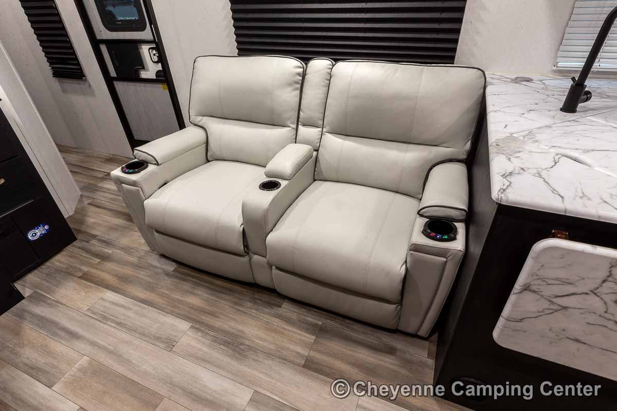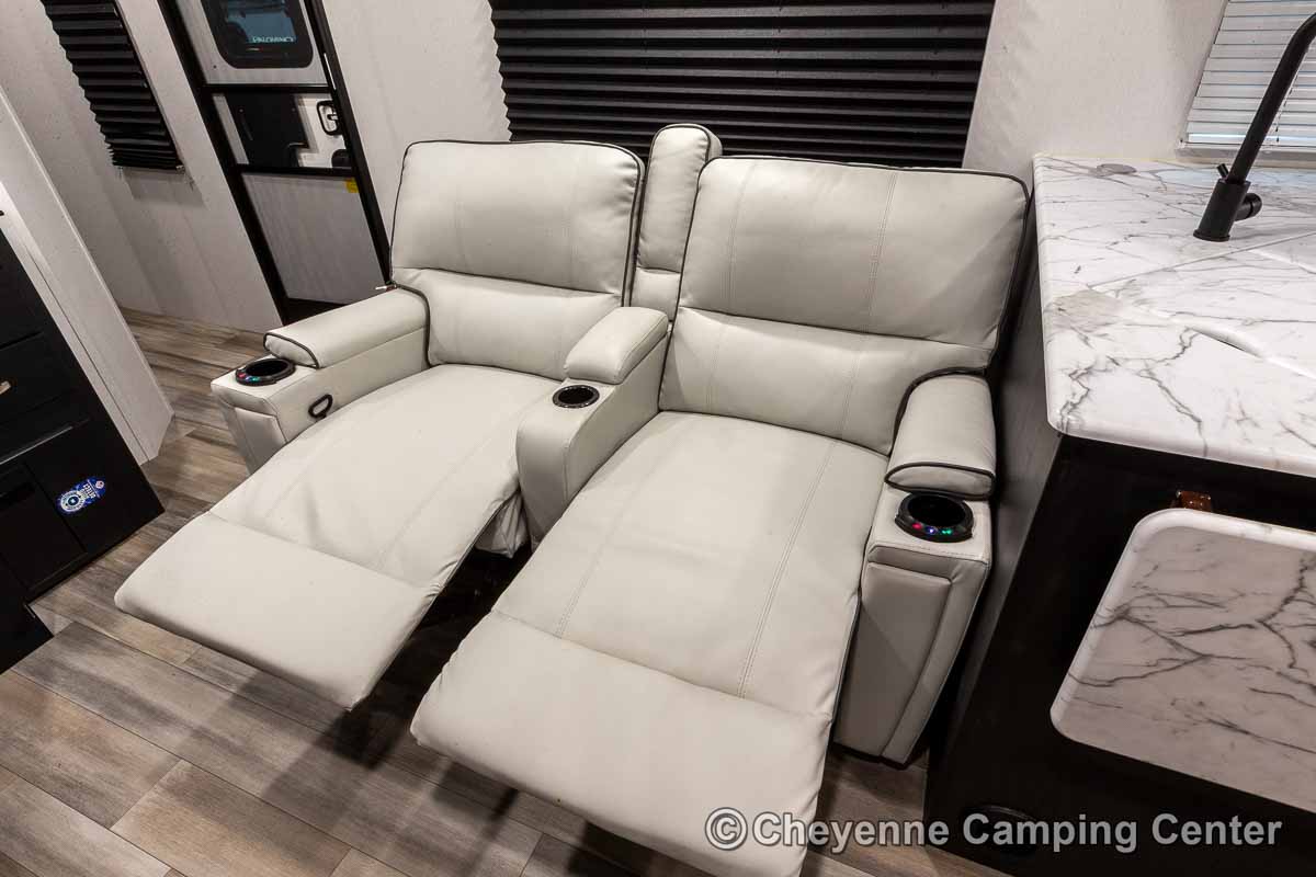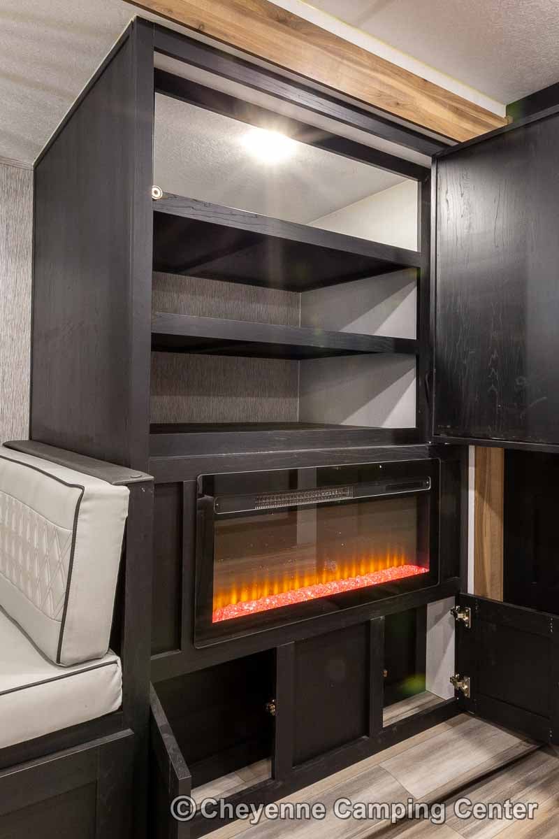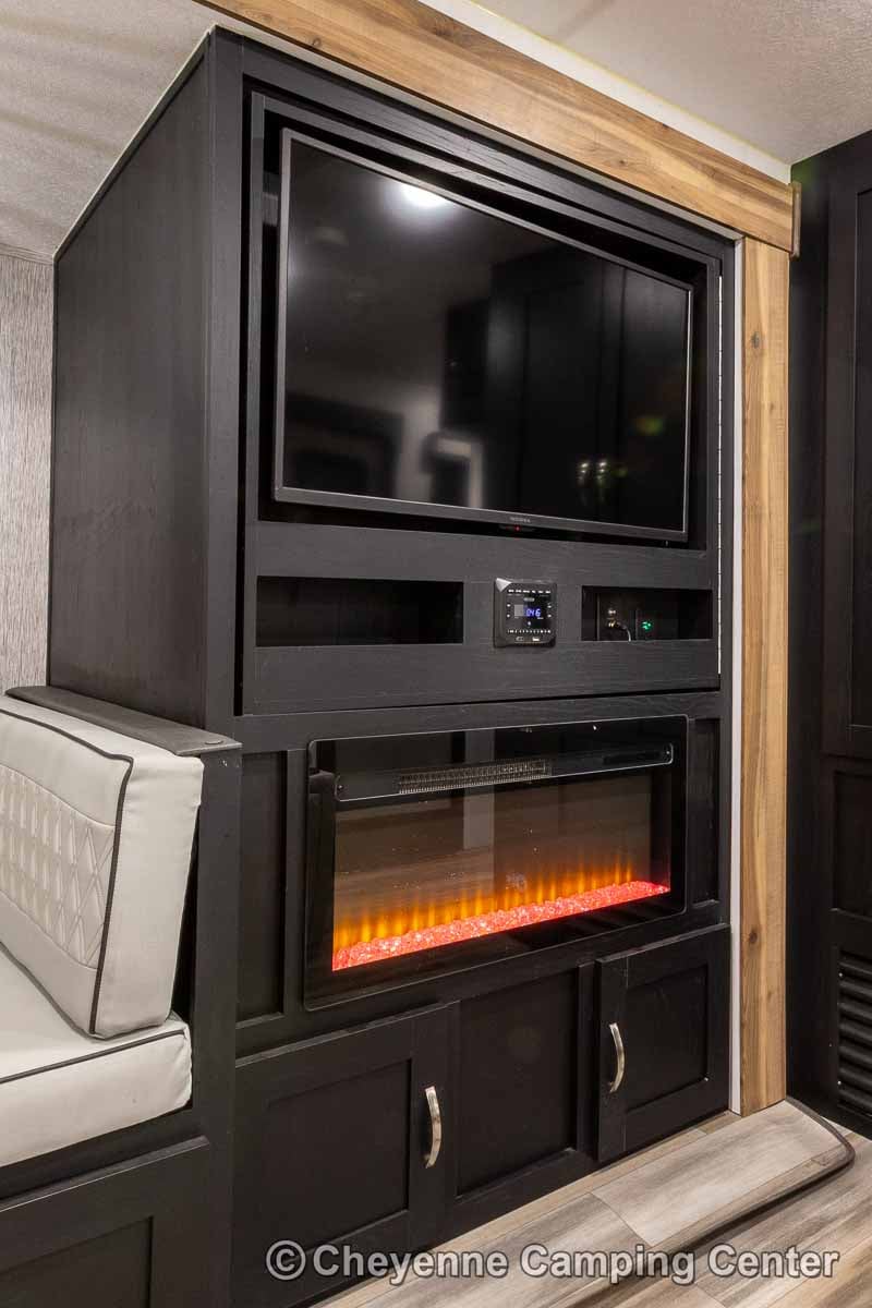 The living area includes an entertainment center with a Jensen Bluetooth stereo, a 32″ HD TV, and an electric fireplace, all easily enjoyed from the reclining theater seats.