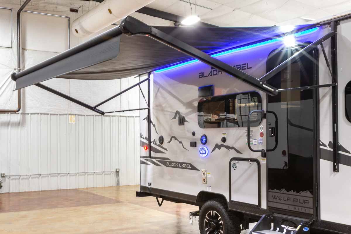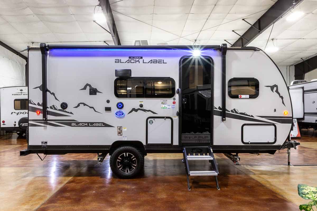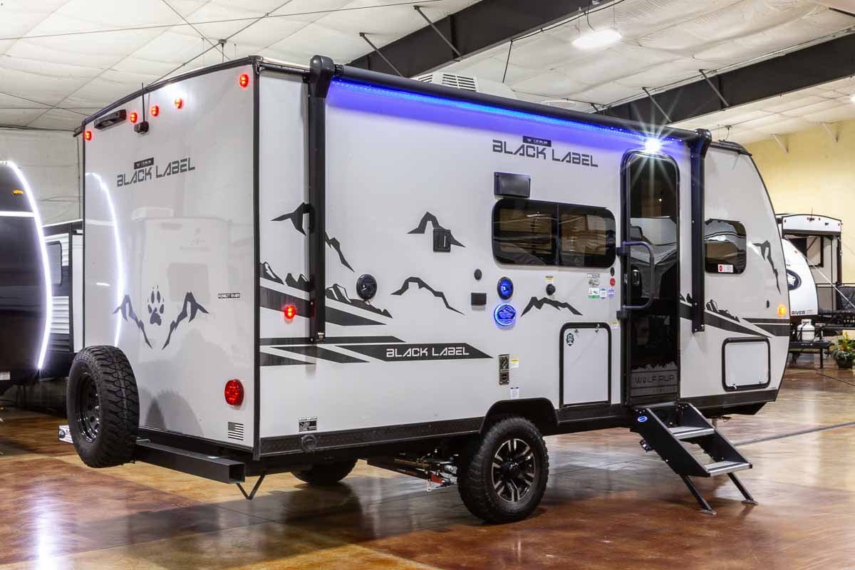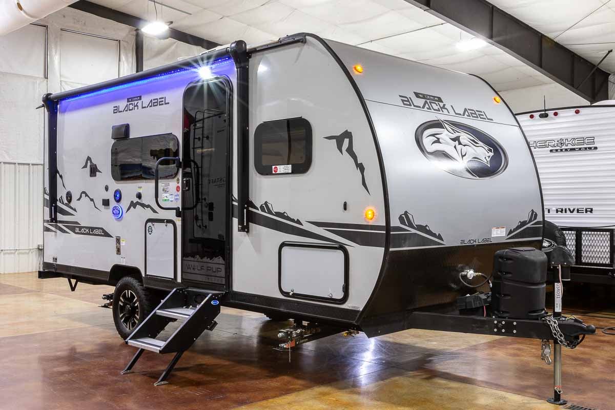 The 2024 Cherokee Wolf Pup Black Label 16BHSBL bunkhouse travel trailer may be small, but it has big features! This upgraded Black Label model enhances the standard Wolf Pup 16BHS with a gel-coat fiberglass exterior, frameless windows, power tongue jack, solid-surface countertops, upgraded shower head, Thermo-Foil insulation, and designer fabric!