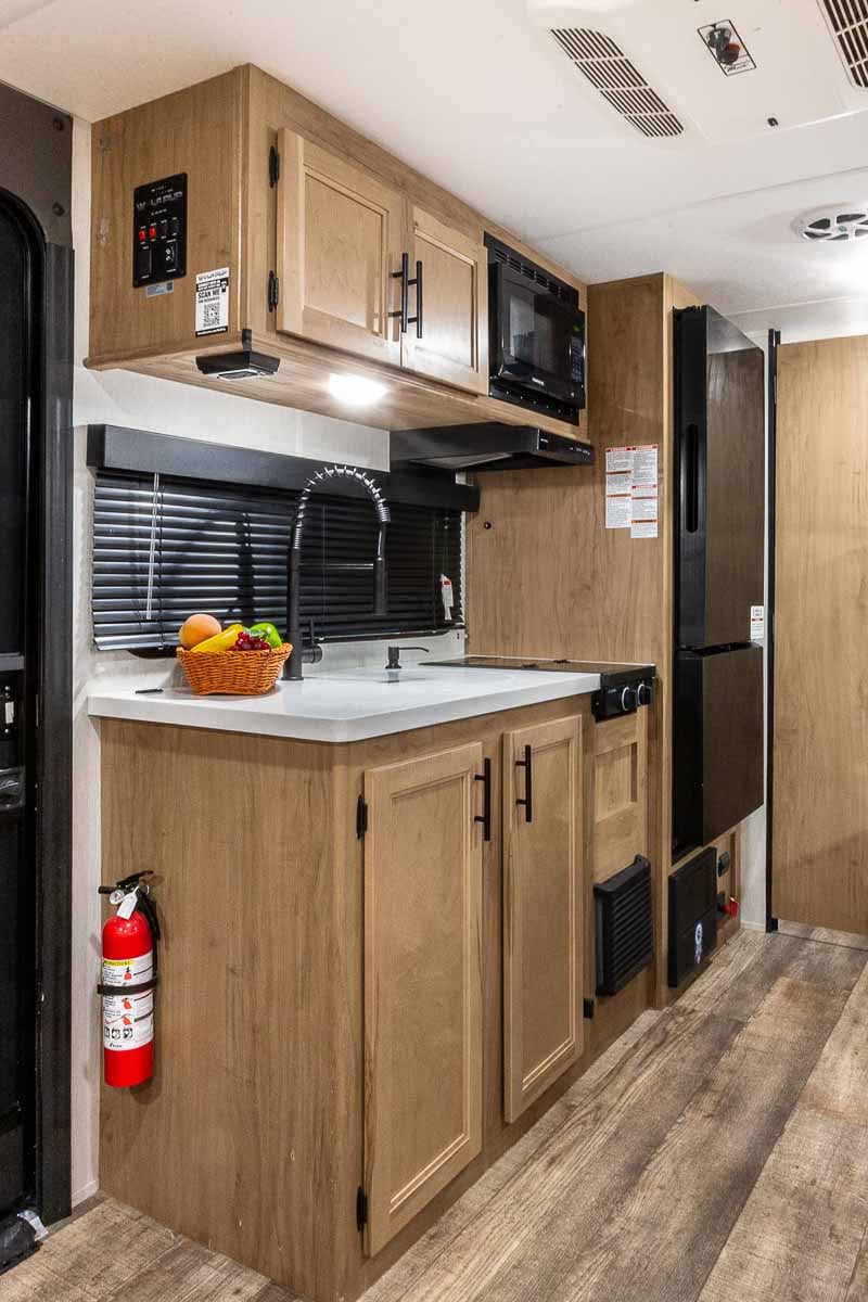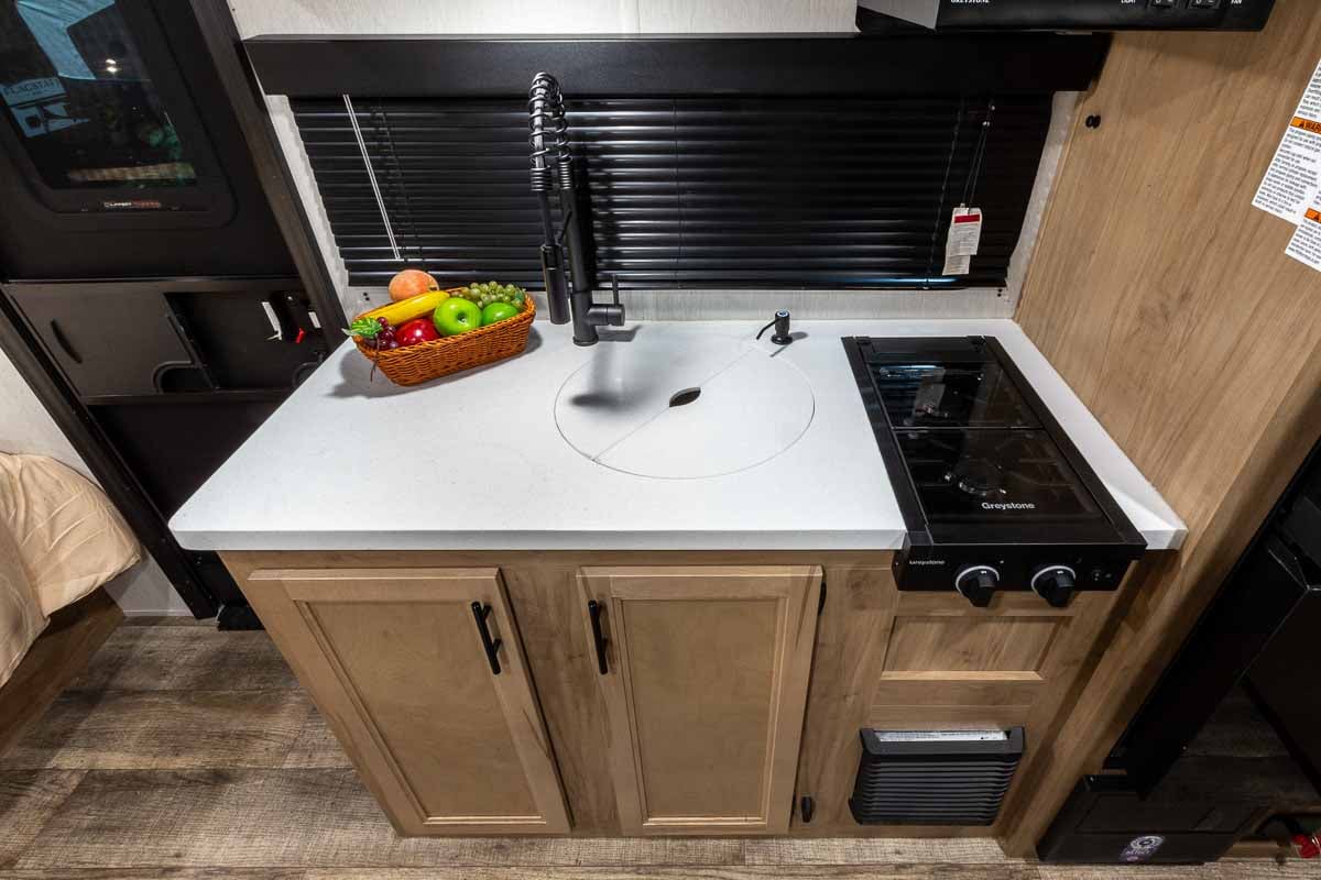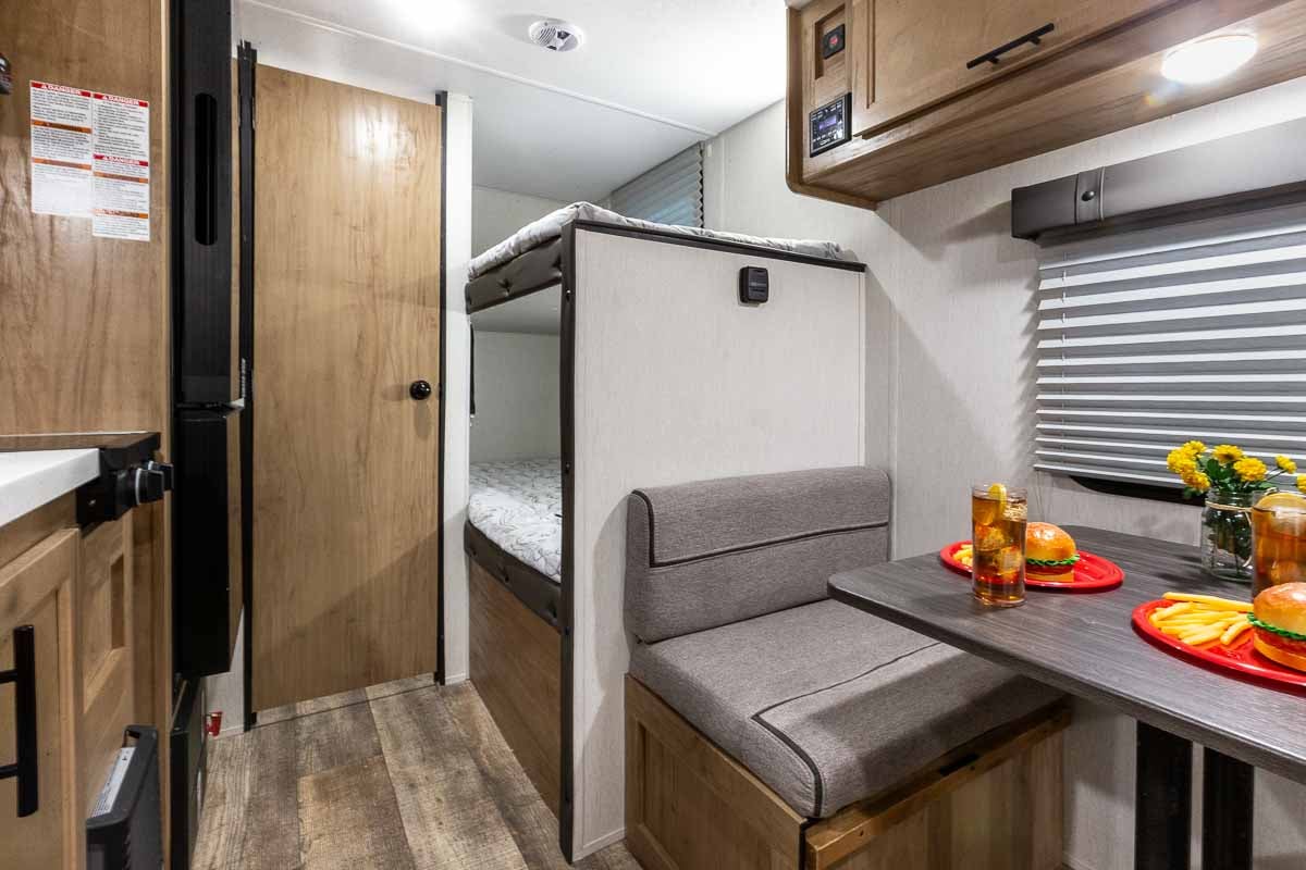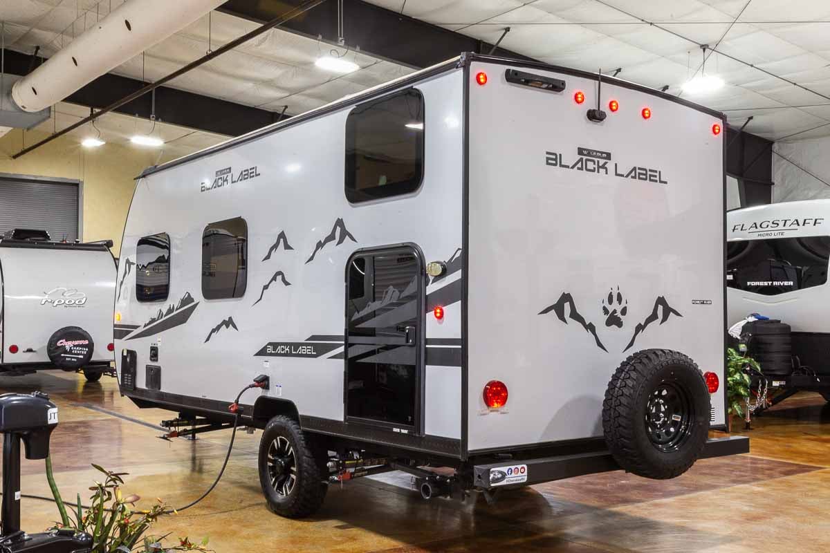 The 2024 Cherokee Wolf Pup Black Label 16BHSBL bunkhouse travel trailer may be small, but it has big features! This upgraded Black Label model enhances the standard Wolf Pup 16BHS with a gel-coat fiberglass exterior, frameless windows, power tongue jack, solid-surface countertops, upgraded shower head, Thermo-Foil insulation, and designer fabric!