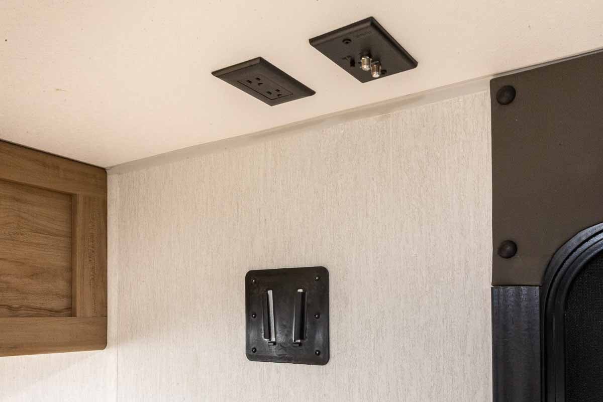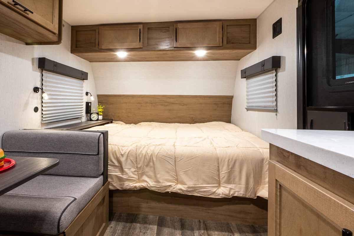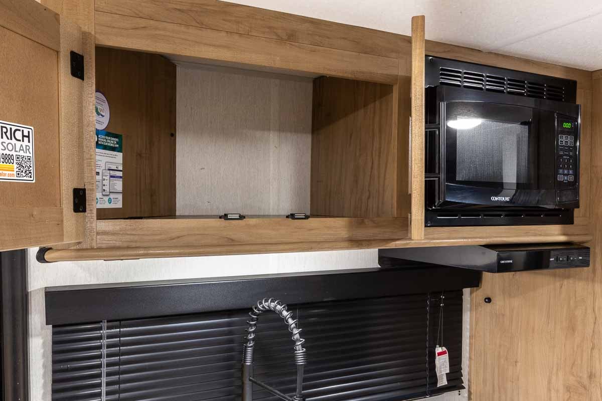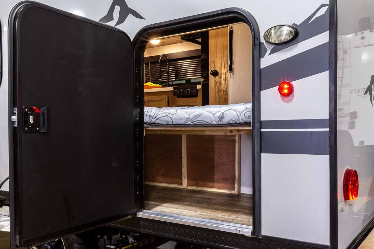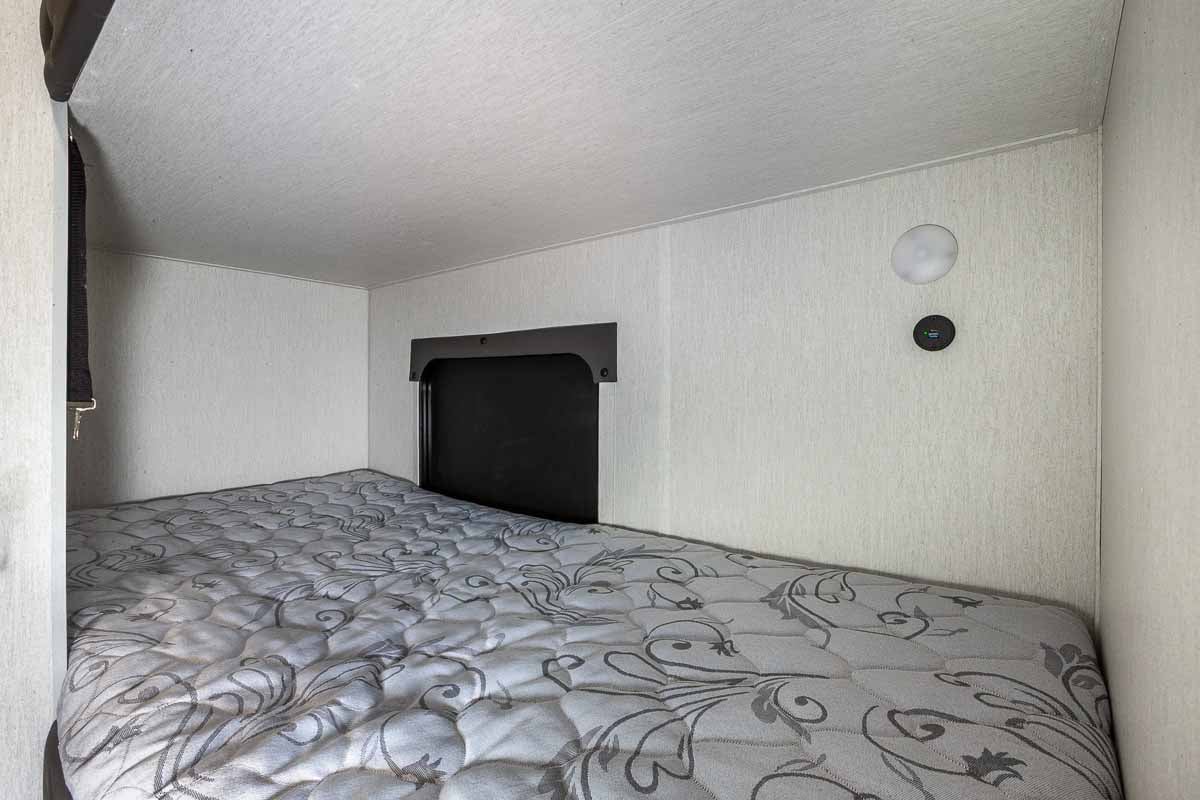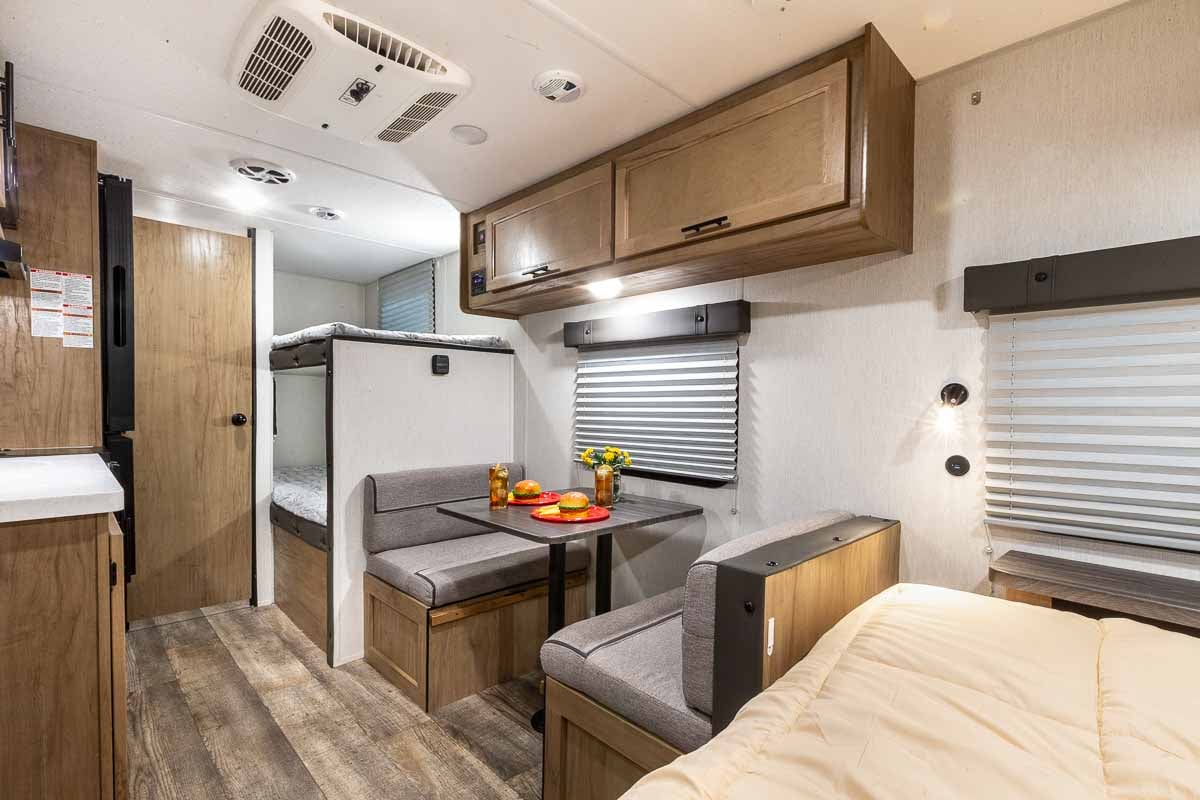 Lightweight yet fully equipped, the 16BHSBL sleeps five and offers abundant storage, including a large front compartment, rear door access to under-bunk/bike storage, and overhead cabinets. Key features include rear bunk beds with storage, a rear bath, a convertible dinette, a front queen bed, Bluetooth stereo with 200-watt subwoofer, exterior marine grade speakers, a large refrigerator, an outdoor shower, four Quick Drop stabilizer jacks, 13,500 BTU roof-mounted AC, a power awning with LED lighting, an outdoor refrigerator, deluxe wheels, a wireless backup camera, black glass entry door, a 100 watt solar panel, a 12V RV battery, and much more!