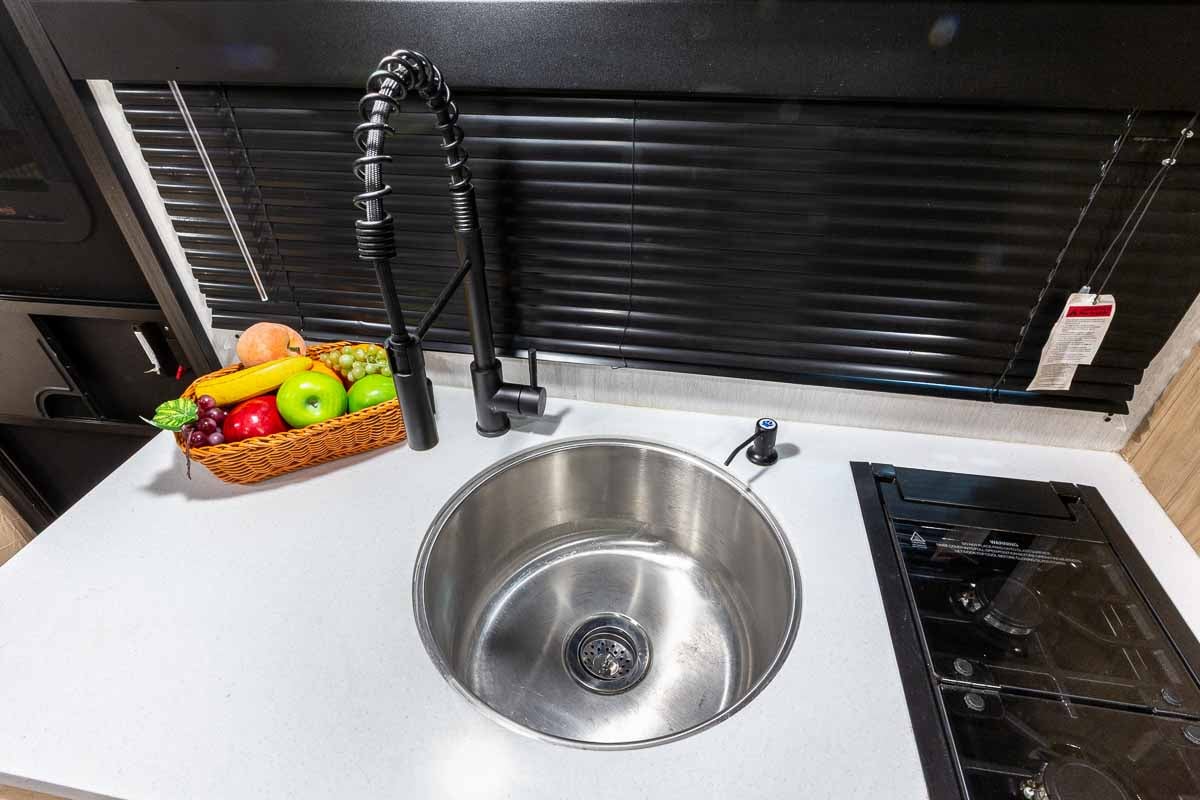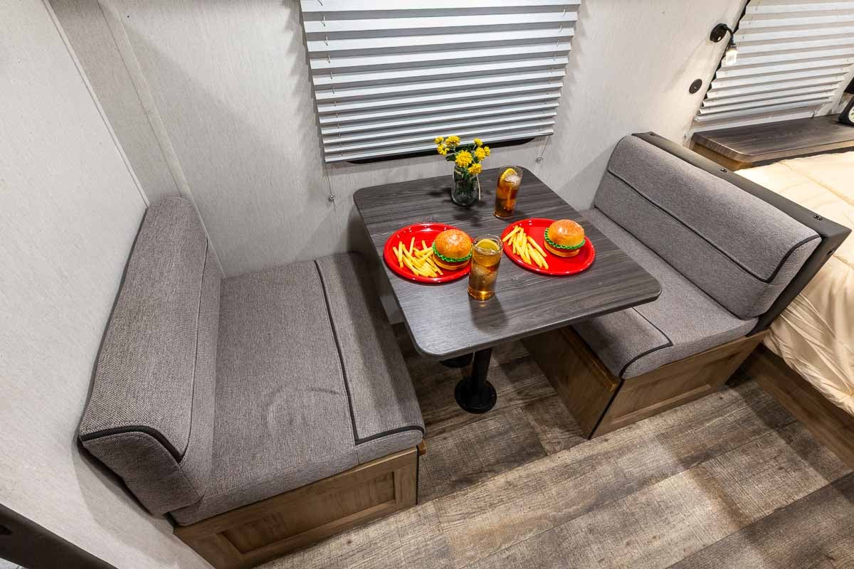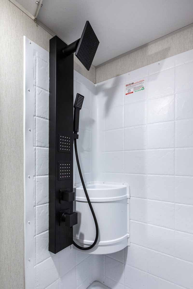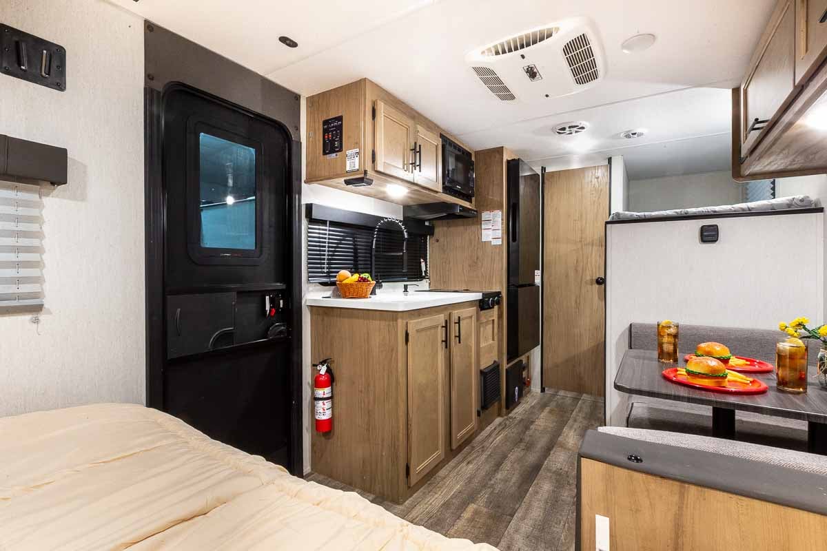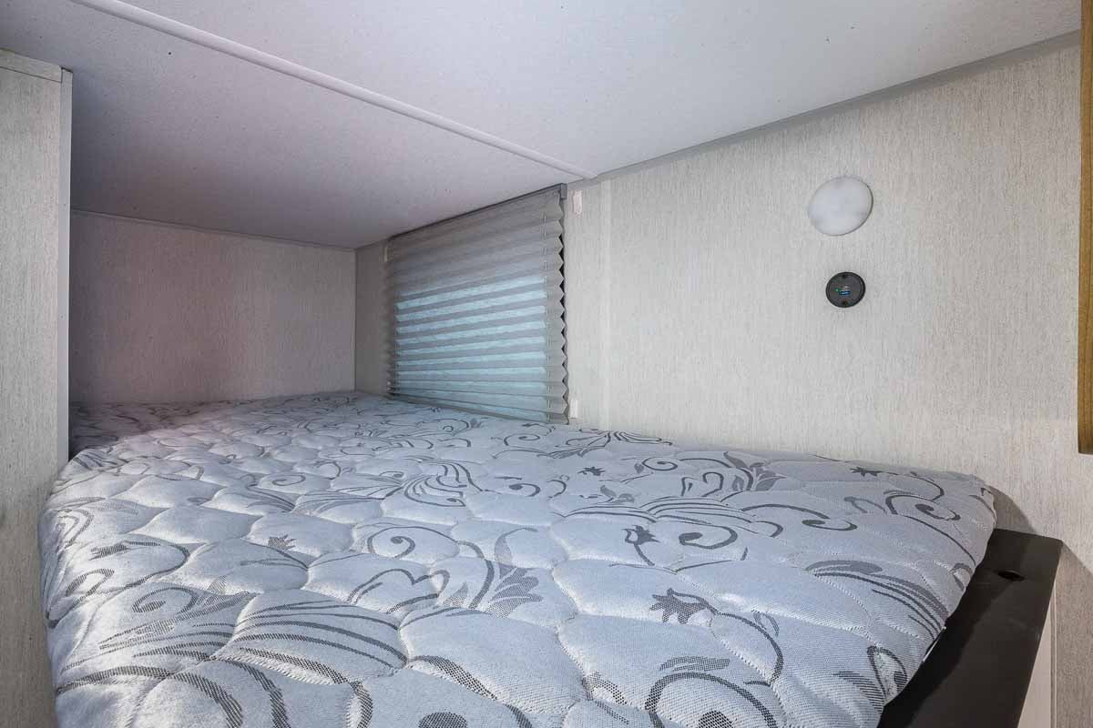 Lightweight yet fully equipped, the 16BHSBL sleeps five and offers abundant storage, including a large front compartment, rear door access to under-bunk/bike storage, and overhead cabinets. Key features include rear bunk beds with storage, a rear bath, a convertible dinette, a front queen bed, Bluetooth stereo with 200-watt subwoofer, exterior marine grade speakers, a large refrigerator, an outdoor shower, four Quick Drop stabilizer jacks, 13,500 BTU roof-mounted AC, a power awning with LED lighting, an outdoor refrigerator, deluxe wheels, a wireless backup camera, black glass entry door, a 100 watt solar panel, a 12V RV battery, and much more!