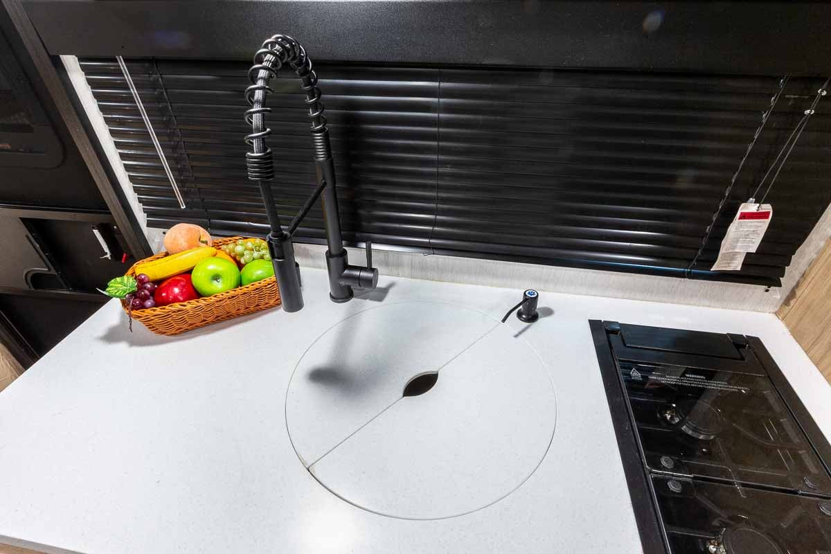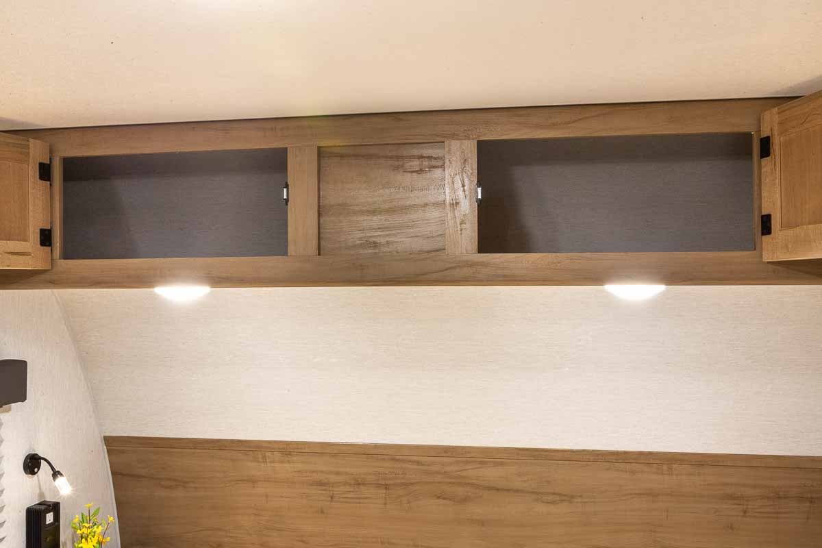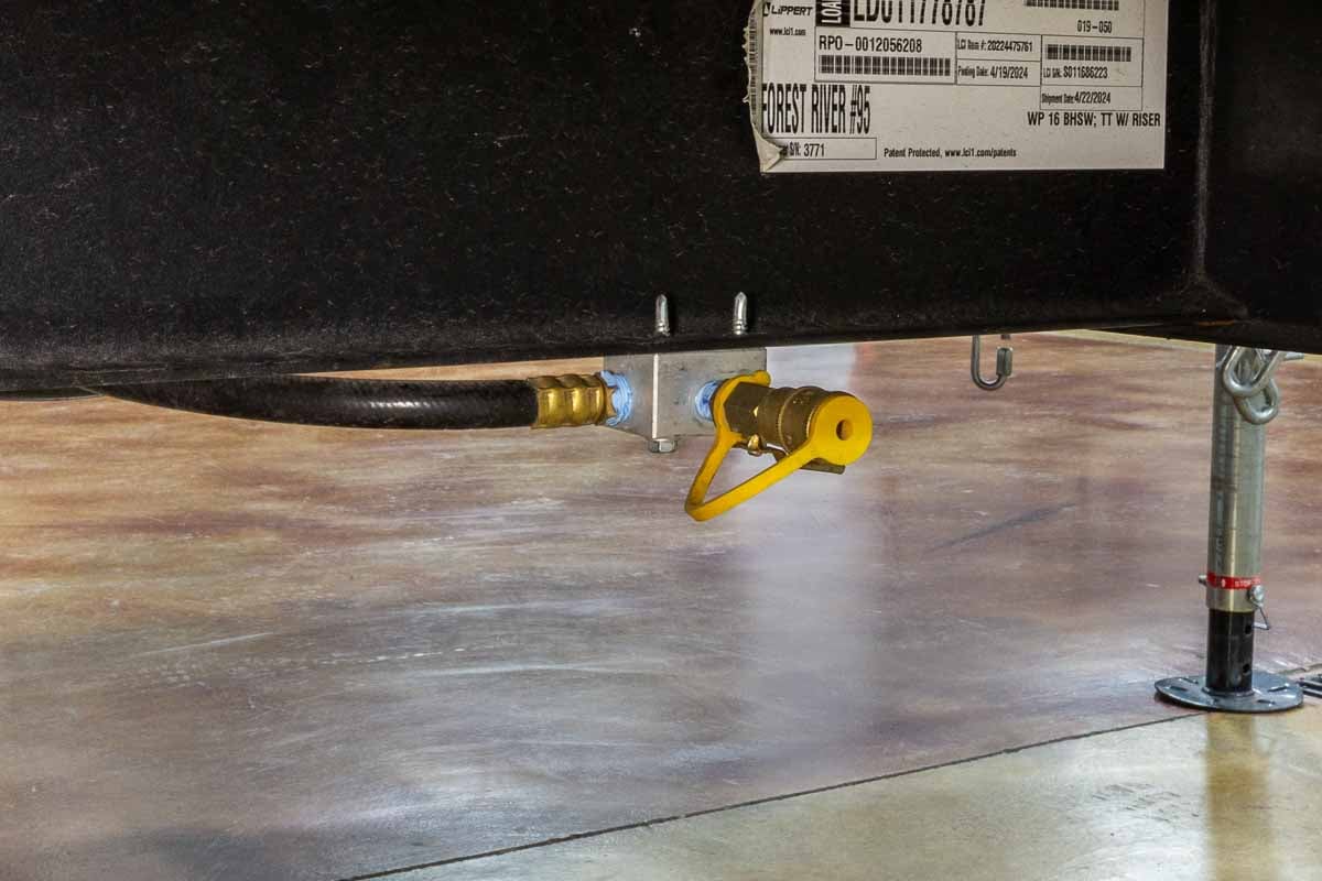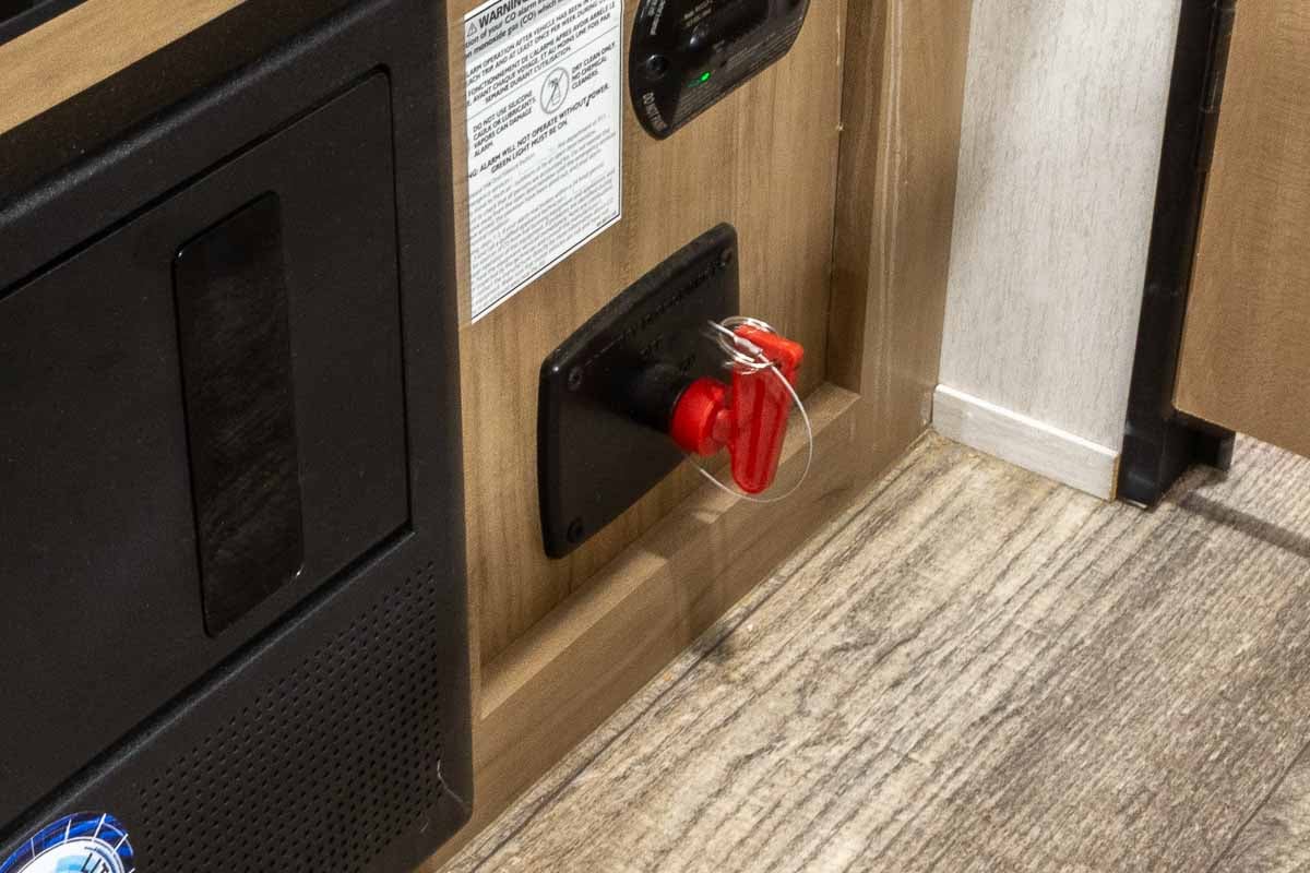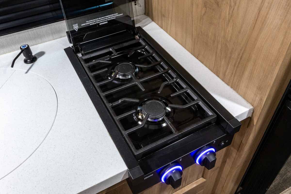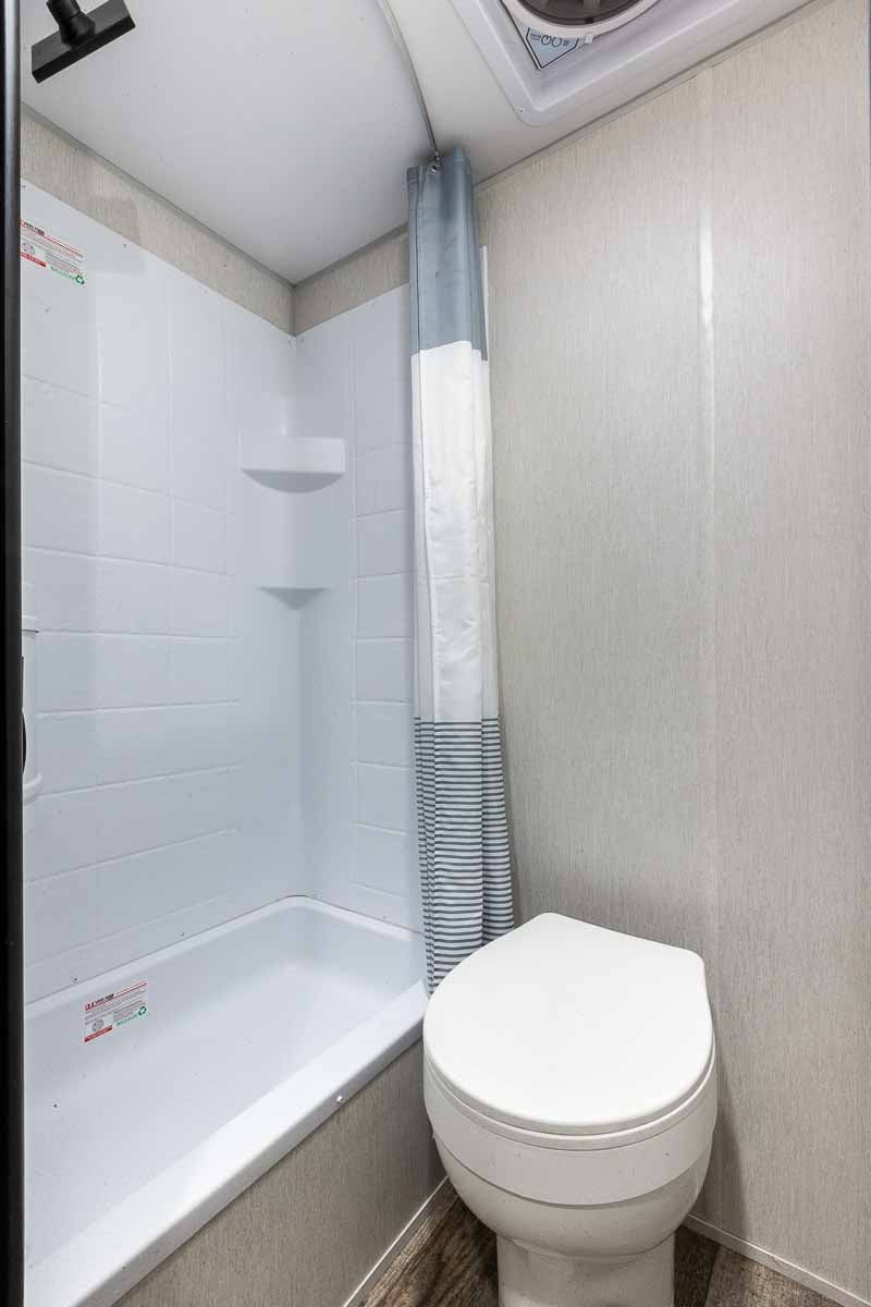 Lightweight yet fully equipped, the 16BHSBL sleeps five and offers abundant storage, including a large front compartment, rear door access to under-bunk/bike storage, and overhead cabinets. Key features include rear bunk beds with storage, a rear bath, a convertible dinette, a front queen bed, Bluetooth stereo with 200-watt subwoofer, exterior marine grade speakers, a large refrigerator, an outdoor shower, four Quick Drop stabilizer jacks, 13,500 BTU roof-mounted AC, a power awning with LED lighting, an outdoor refrigerator, deluxe wheels, a wireless backup camera, black glass entry door, a 100 watt solar panel, a 12V RV battery, and much more!