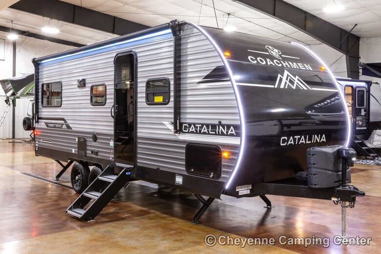 This Catalina Summit Series 221EPIC for sale at Cheyenne Camping Center is very well-equipped. It features power stabilizer jacks, GE appliances, a JBL Bluetooth stereo with exterior marine grade speaker, a 32″ TV, LED lighting, ducted air conditioning, hardwood cabinet doors, dark tint windows, seamless countertops, an 18′ power awning w/ multi-colored LED lighting, front pass through storage, solar prep, premium aluminum entry steps, one-year manufacturer’s warranty, one-year complimentary 24/7 roadside assistance, and much more!