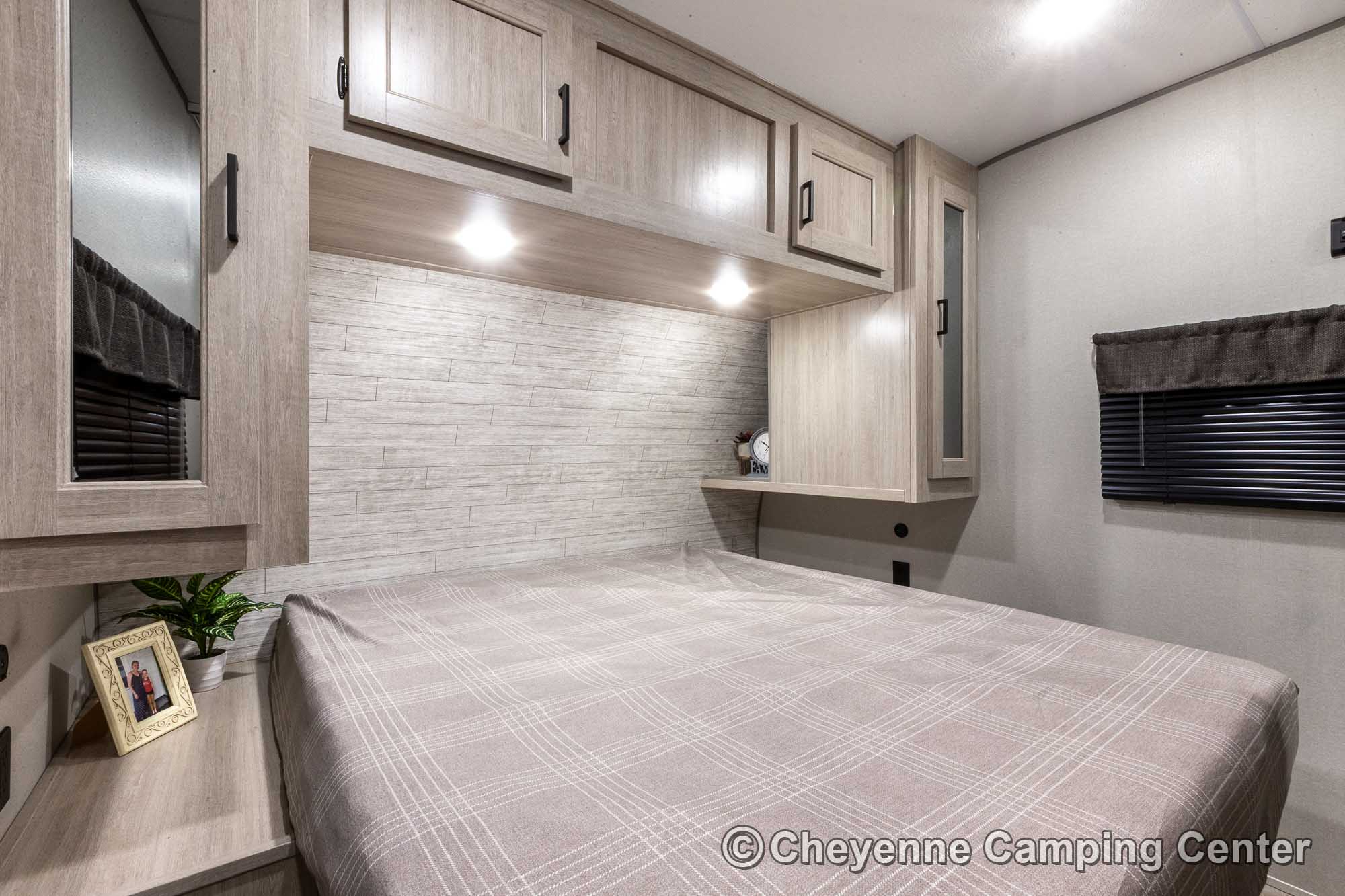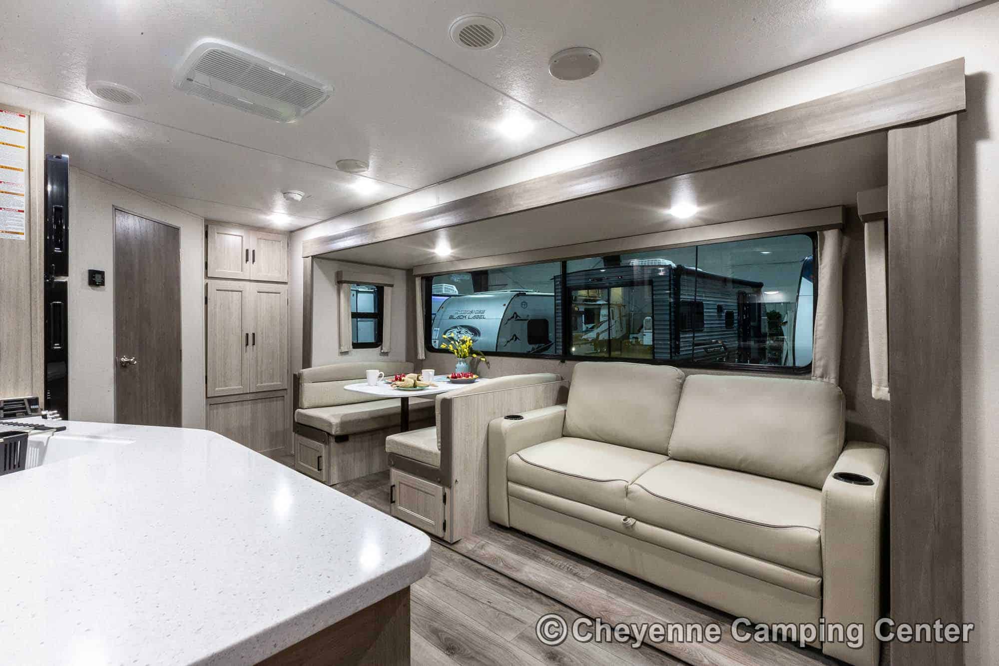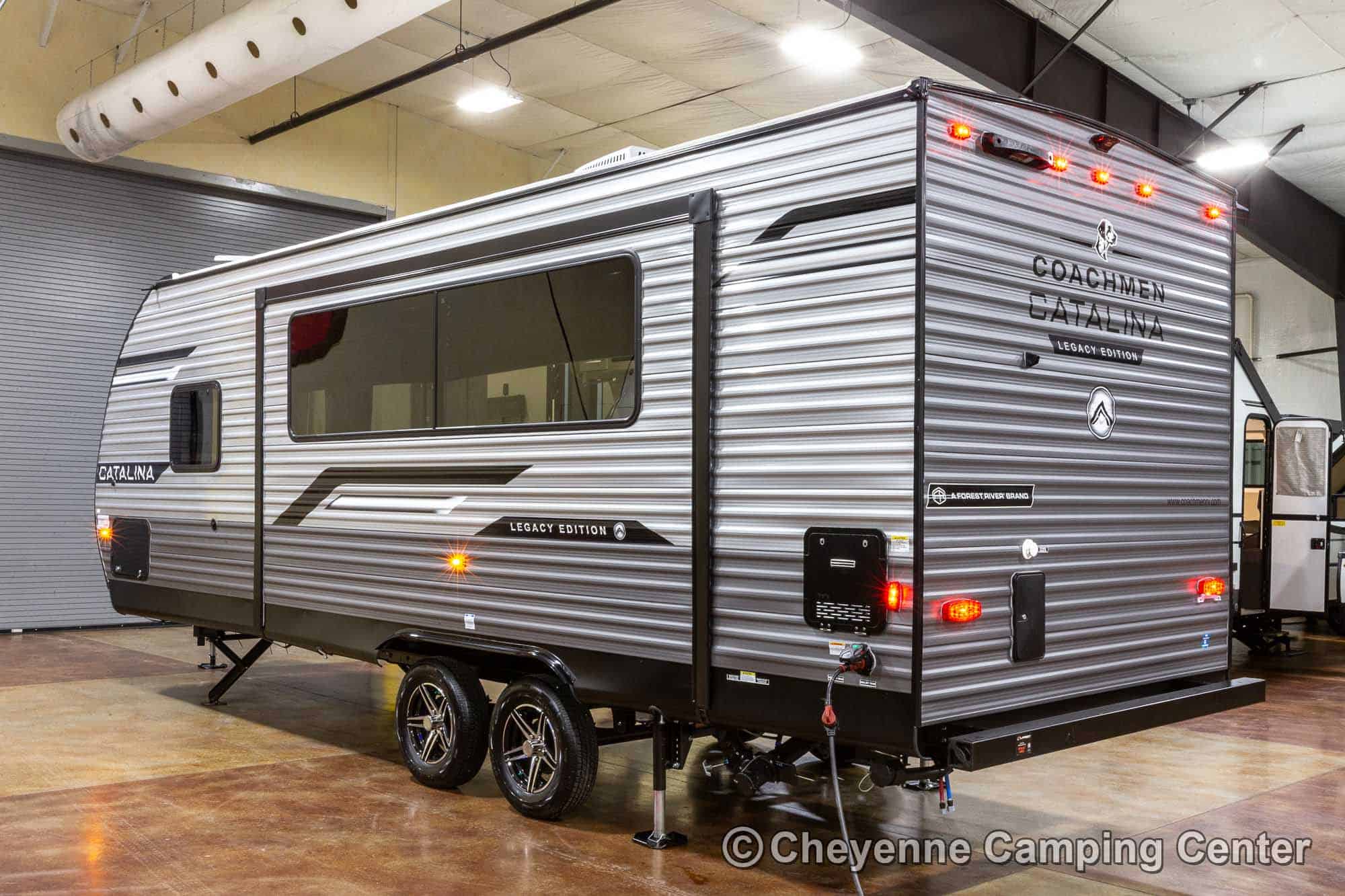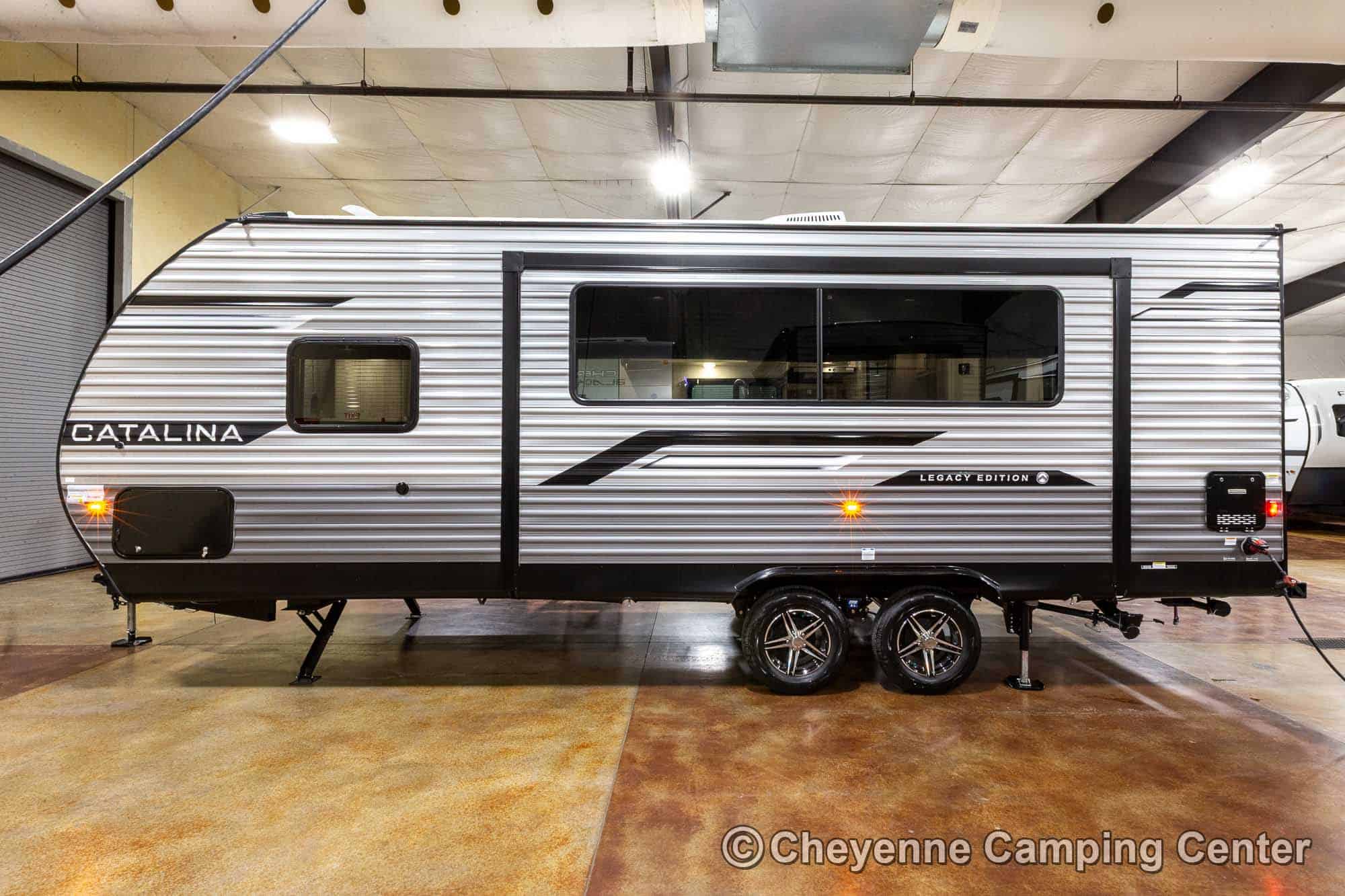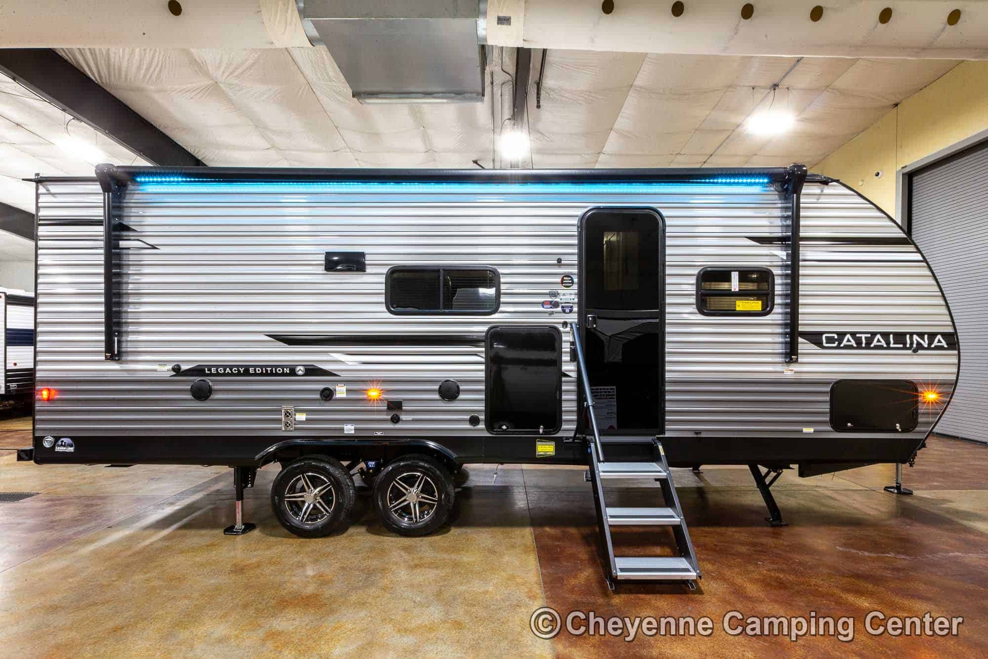 Additional features include pleated window shades, ducted heat, 15,000 BTU GE ducted A/C, tankless water heater, enclosed underbelly, 12V deep cycle battery, filled LP tanks, one-year manufacturer warranty, and one year of 24/7 roadside assistance. The Catalina Legacy Edition 243RBS for sale at Cheyenne Camping Center is the ultimate couples travel trailer for relaxing in comfort and exploring in style.