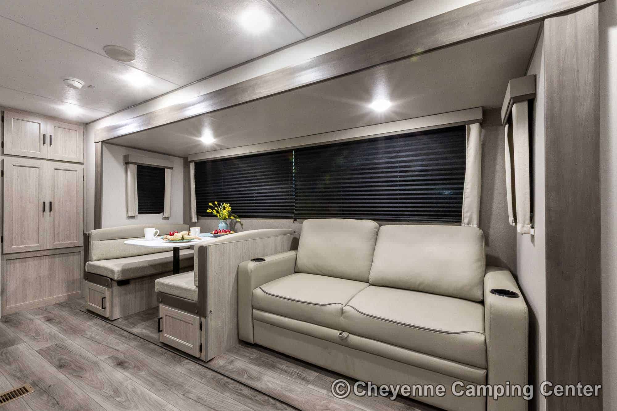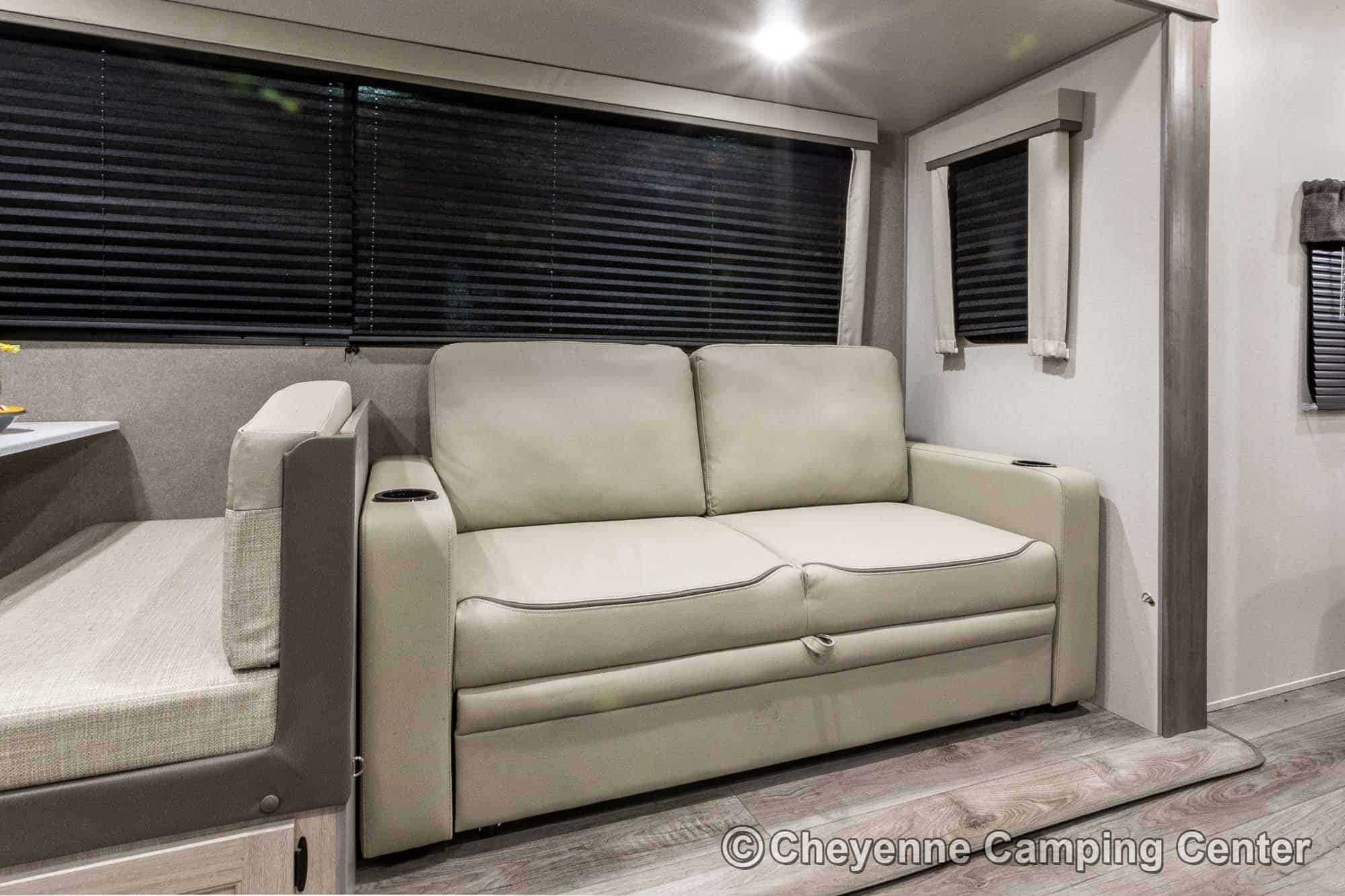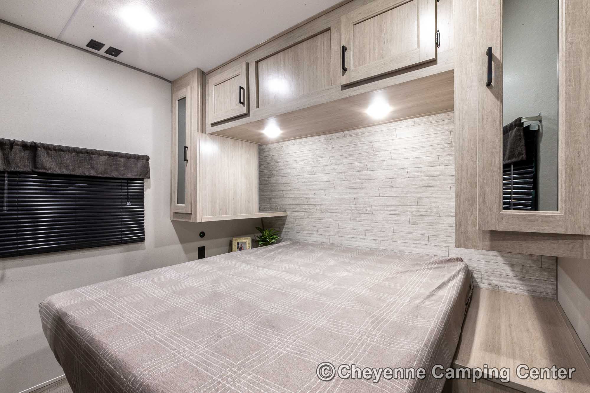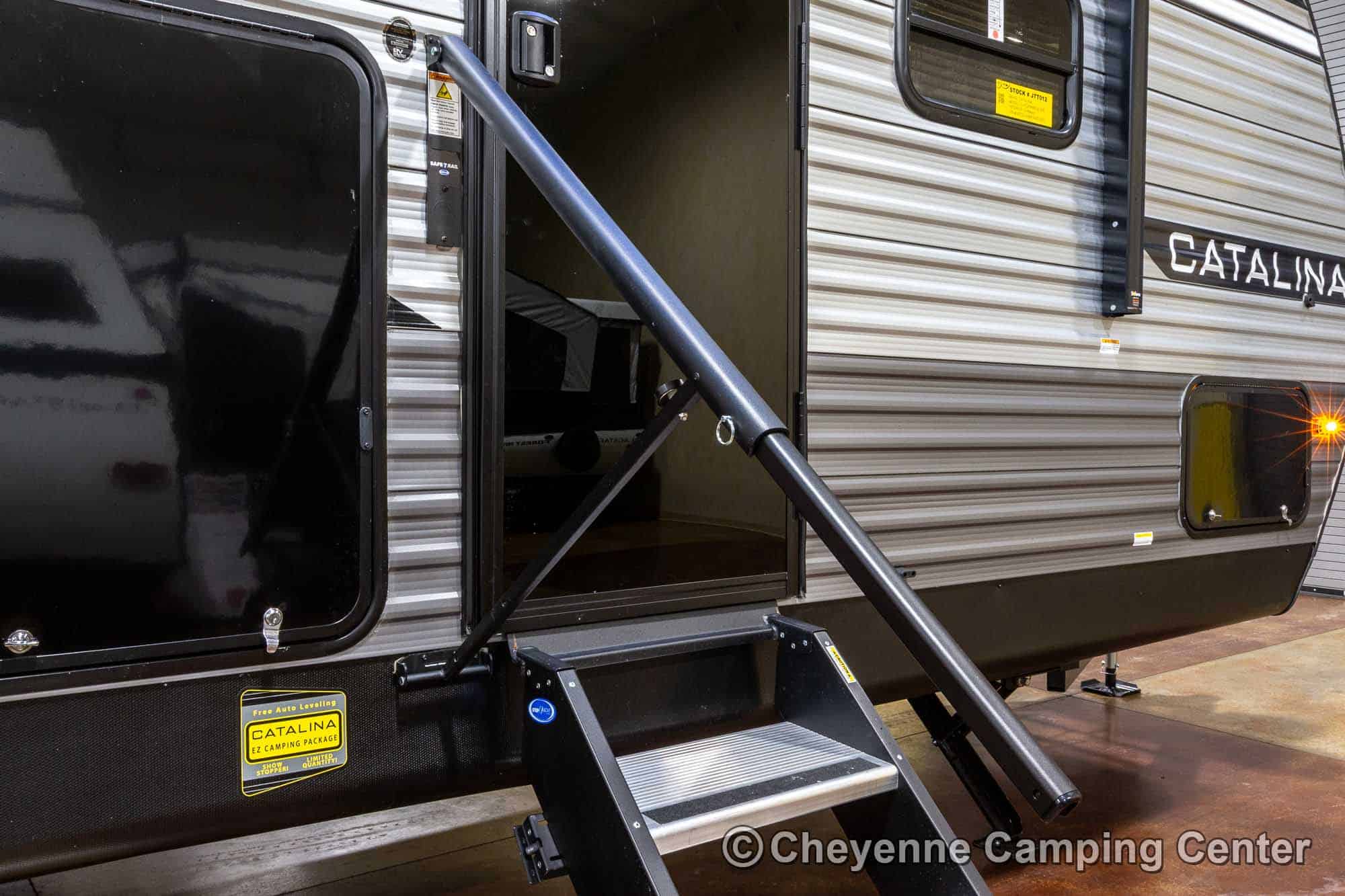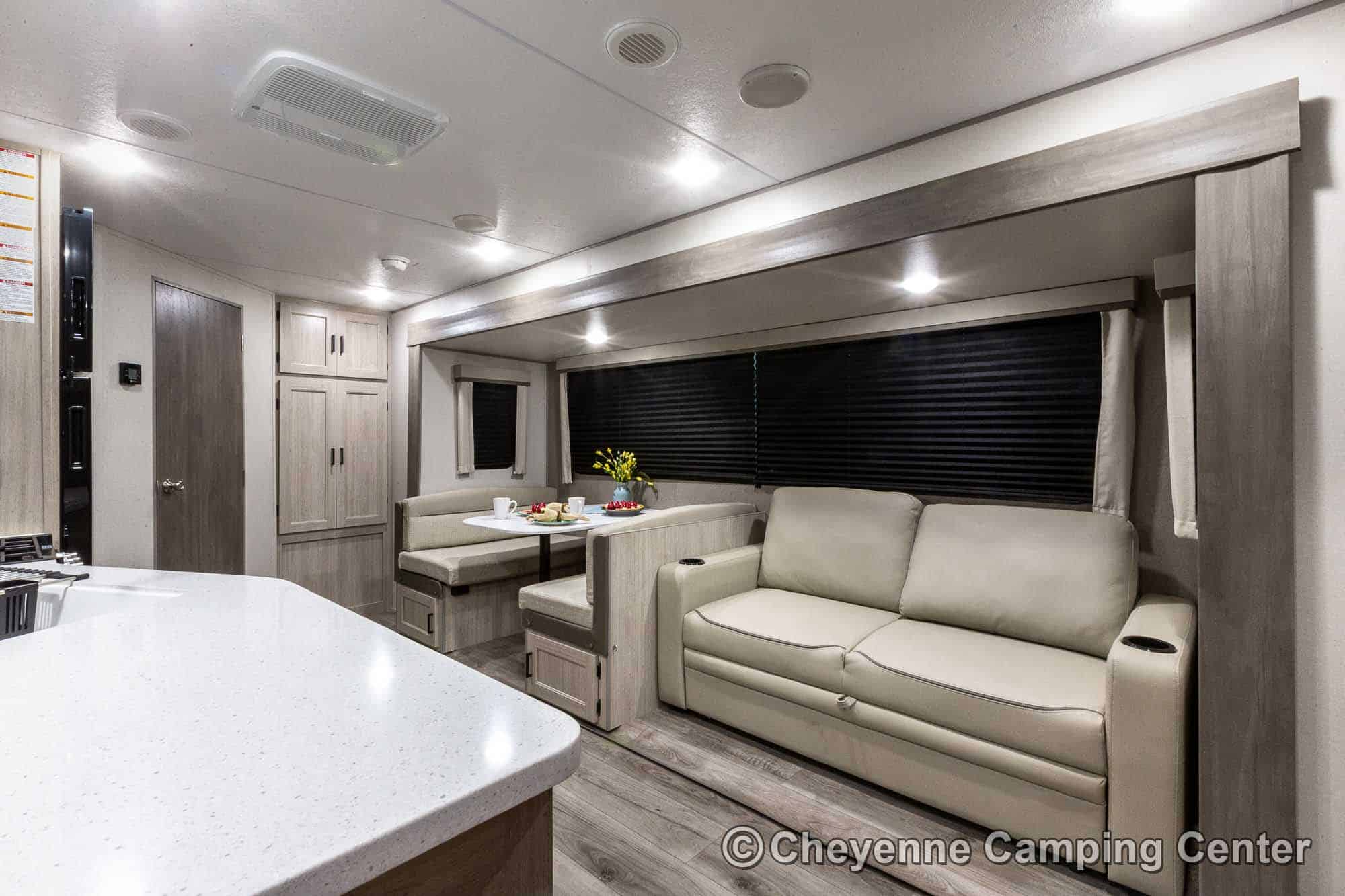 Additional features include pleated window shades, ducted heat, 15,000 BTU GE ducted A/C, tankless water heater, enclosed underbelly, 12V deep cycle battery, filled LP tanks, one-year manufacturer warranty, and one year of 24/7 roadside assistance. The Catalina Legacy Edition 243RBS for sale at Cheyenne Camping Center is the ultimate couples travel trailer for relaxing in comfort and exploring in style.