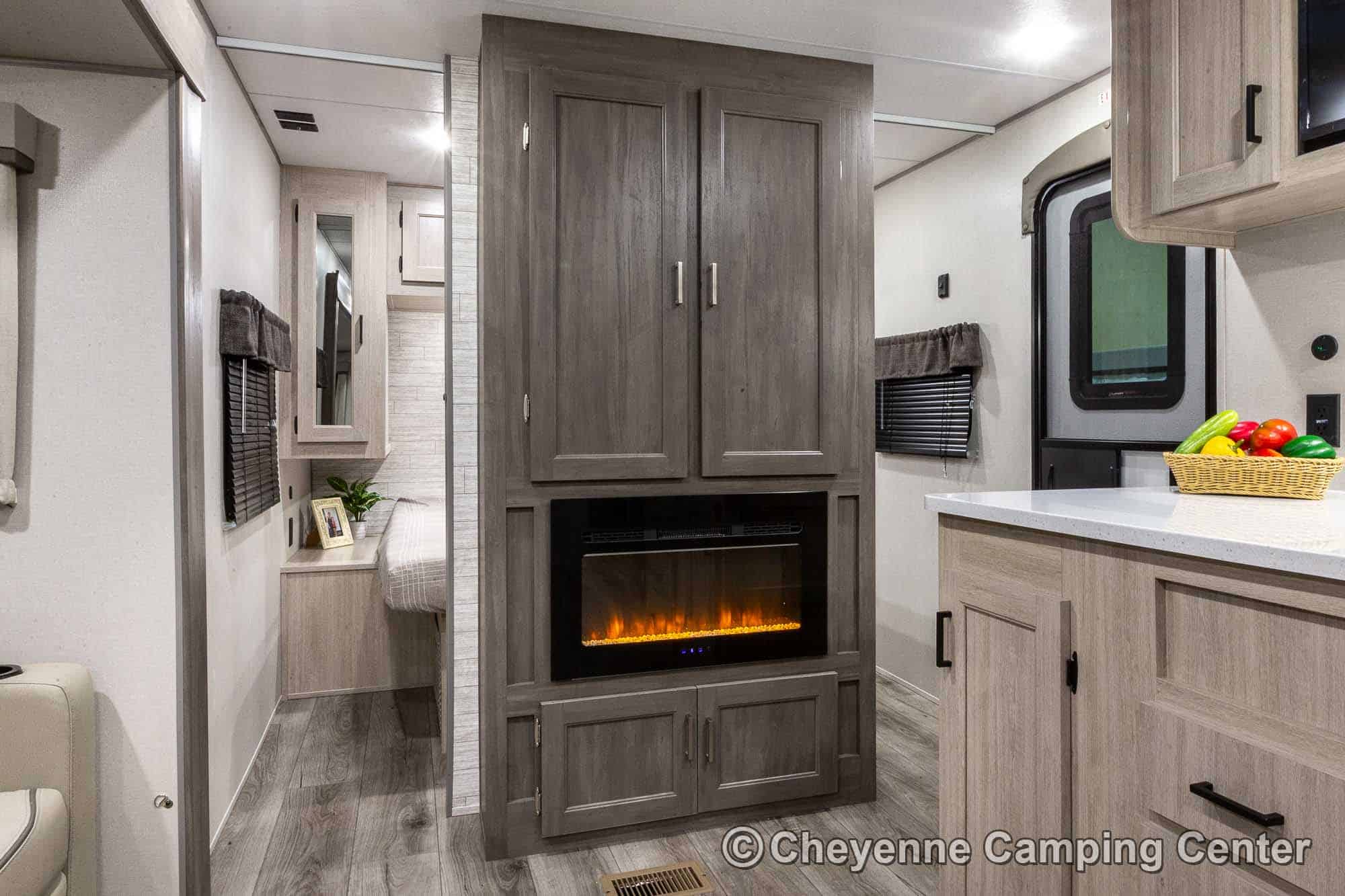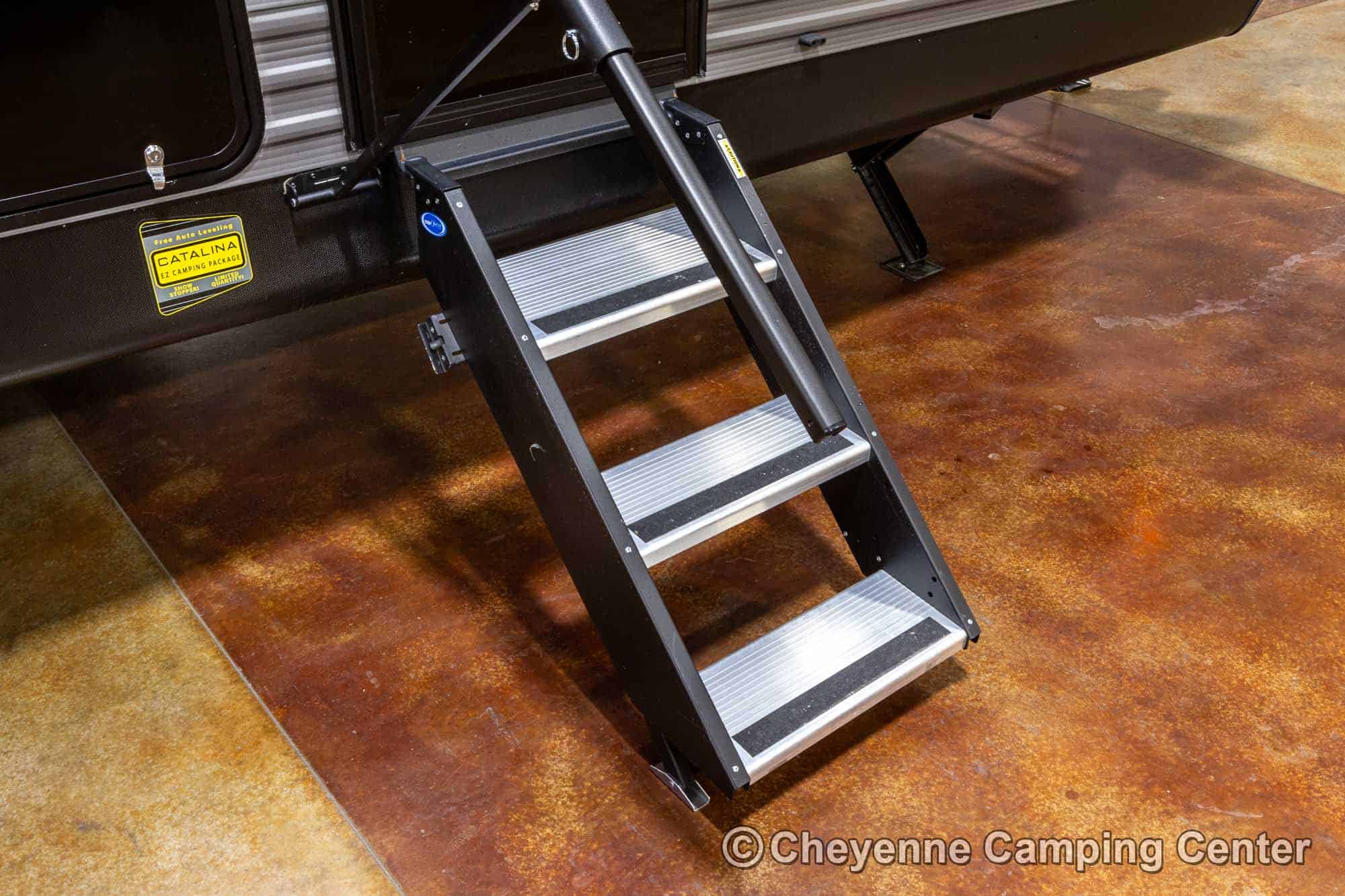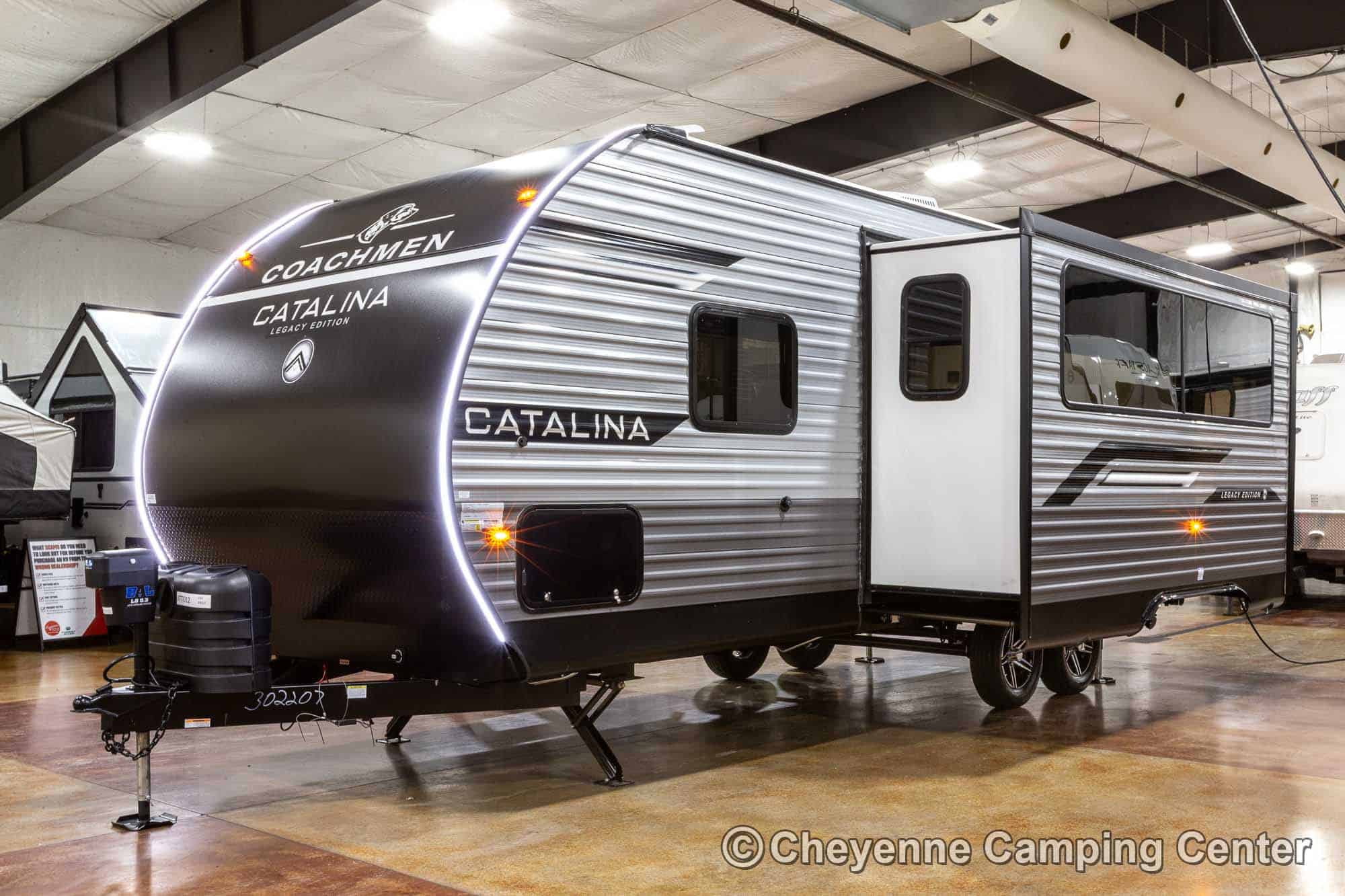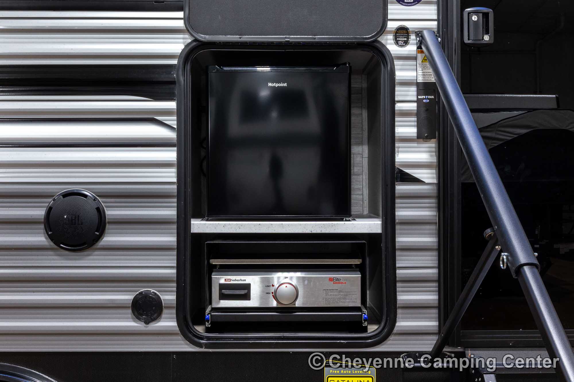 Additional features include pleated window shades, ducted heat, 15,000 BTU GE ducted A/C, tankless water heater, enclosed underbelly, 12V deep cycle battery, filled LP tanks, one-year manufacturer warranty, and one year of 24/7 roadside assistance. The Catalina Legacy Edition 243RBS for sale at Cheyenne Camping Center is the ultimate couples travel trailer for relaxing in comfort and exploring in style.
