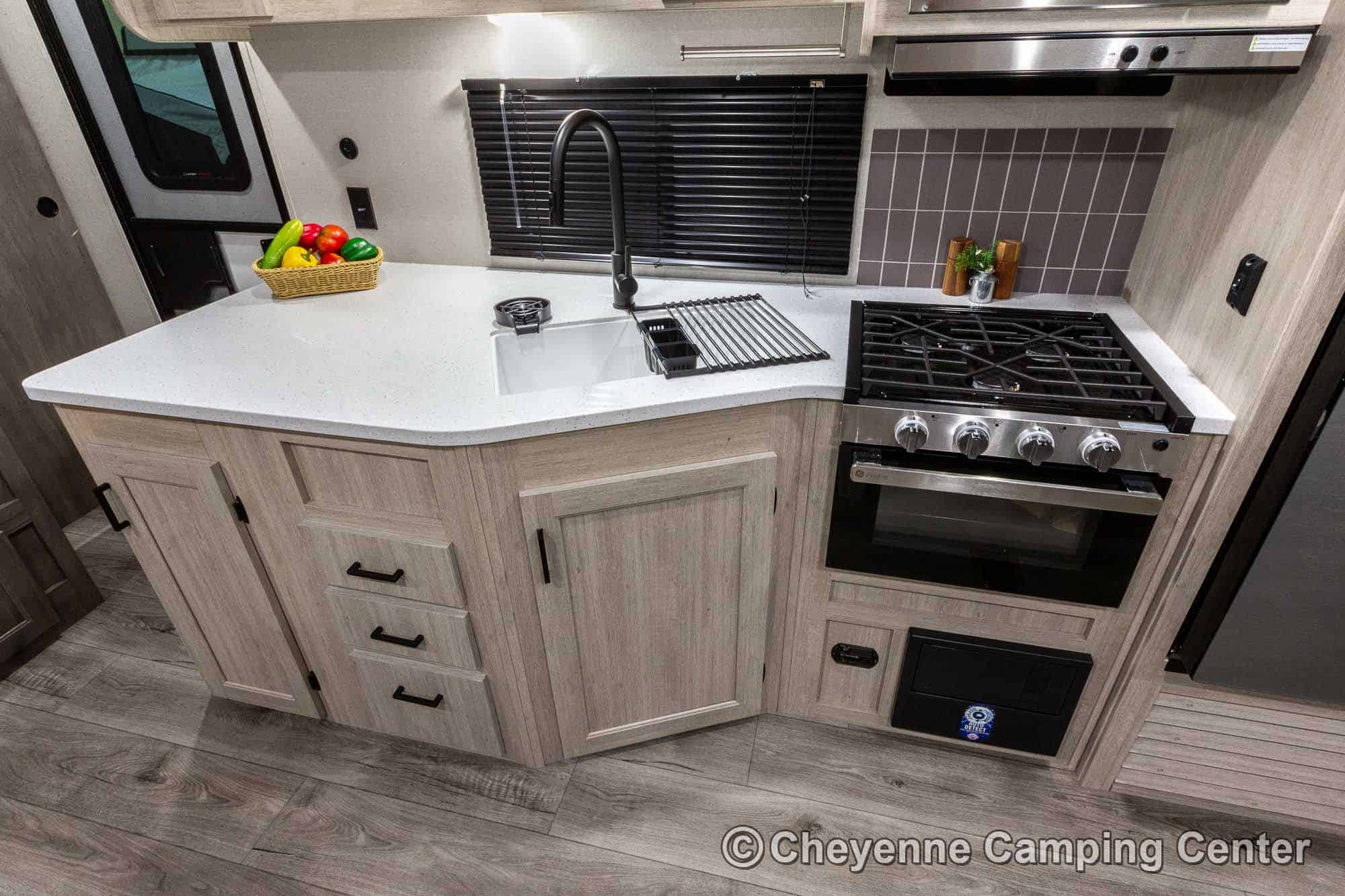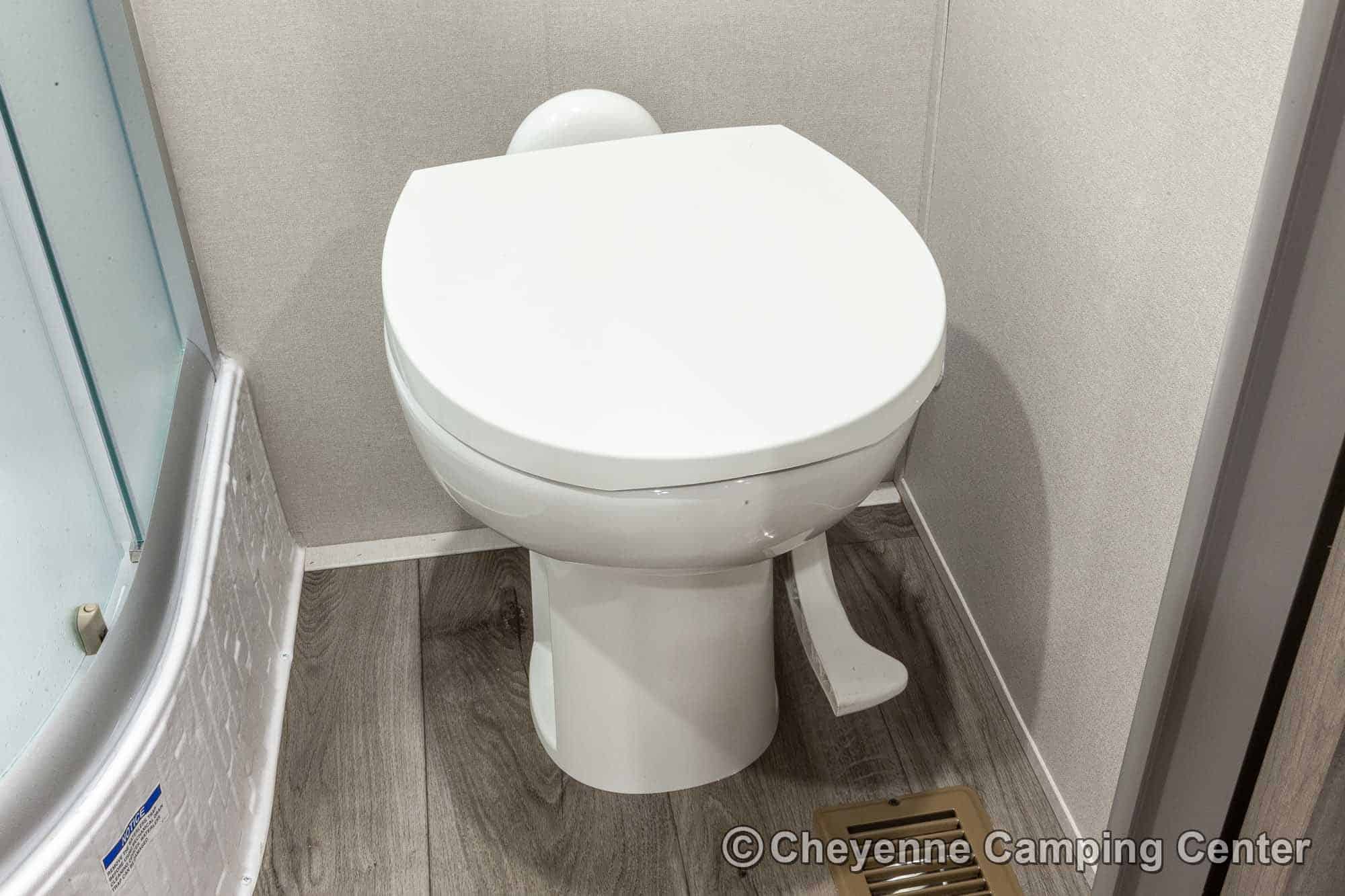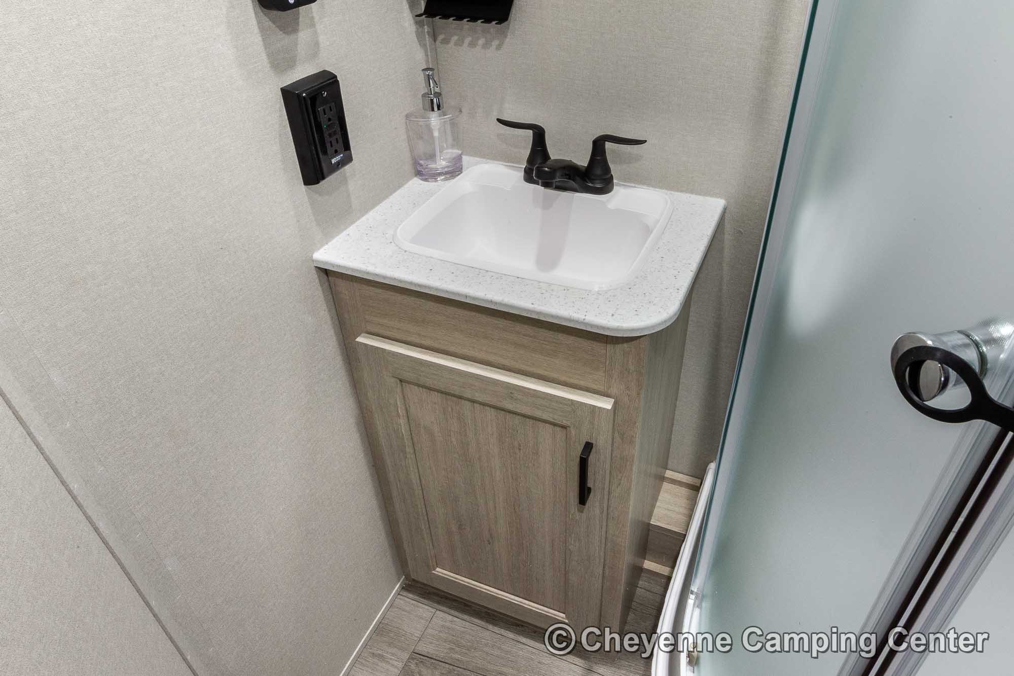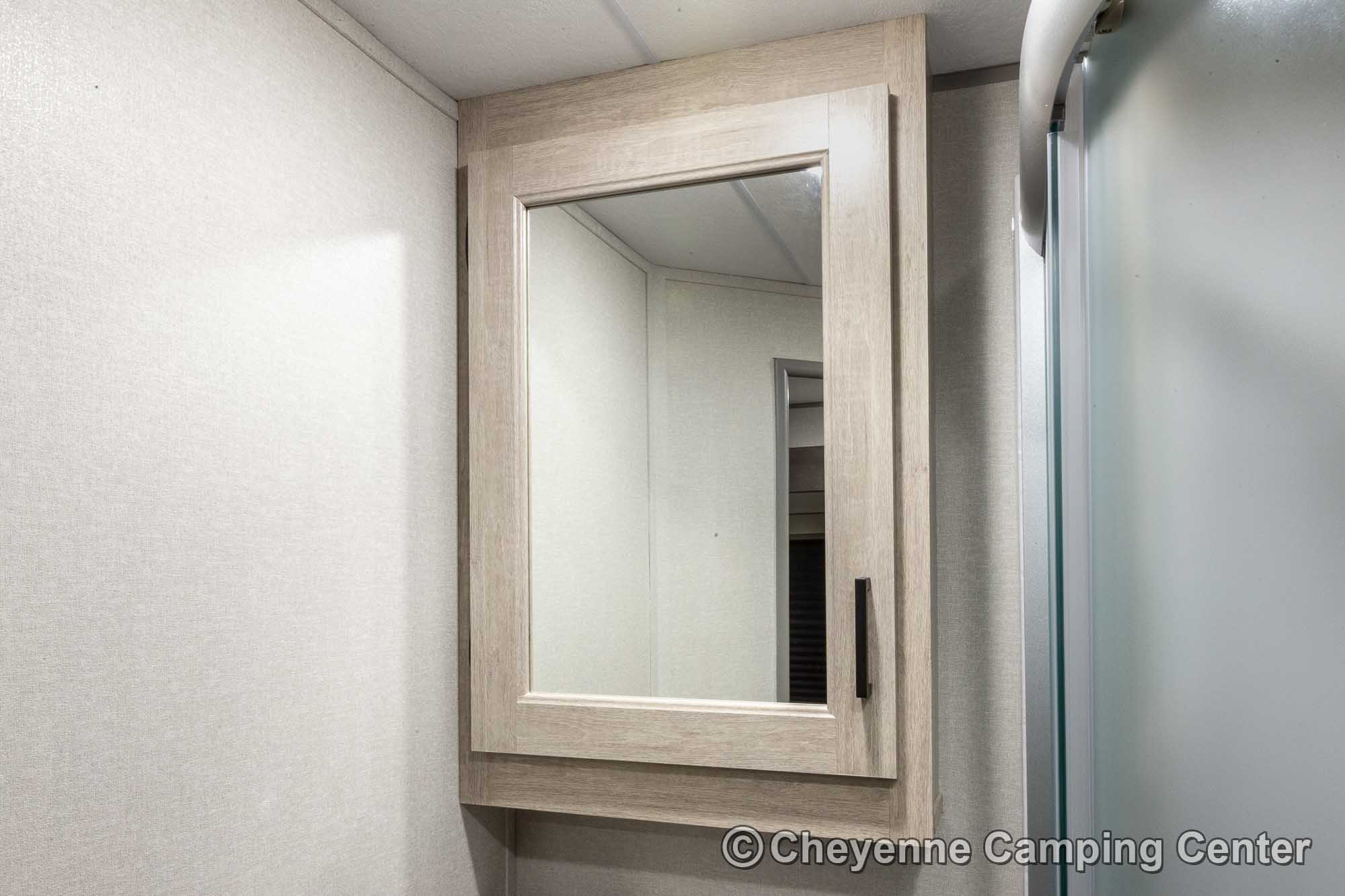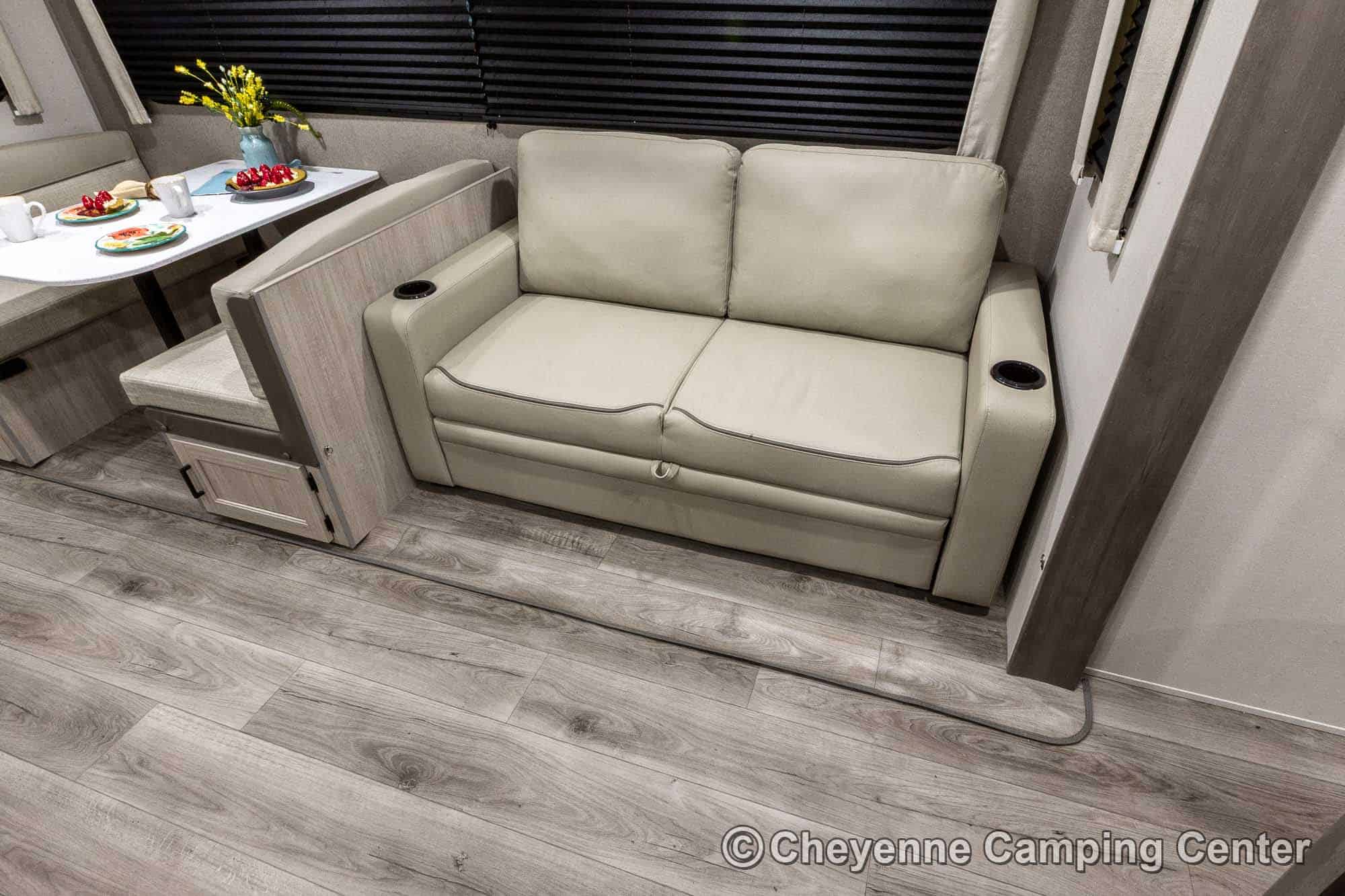 Additional features include pleated window shades, ducted heat, 15,000 BTU GE ducted A/C, tankless water heater, enclosed underbelly, 12V deep cycle battery, filled LP tanks, one-year manufacturer warranty, and one year of 24/7 roadside assistance. The Catalina Legacy Edition 243RBS for sale at Cheyenne Camping Center is the ultimate couples travel trailer for relaxing in comfort and exploring in style.