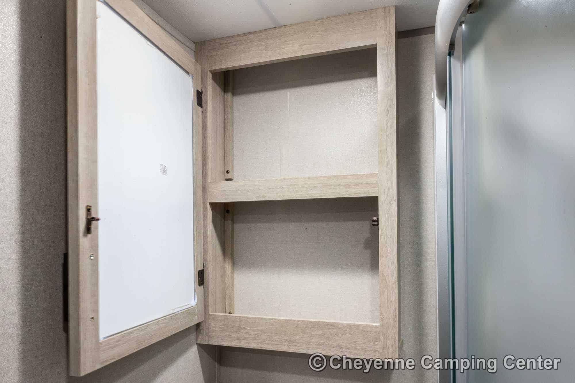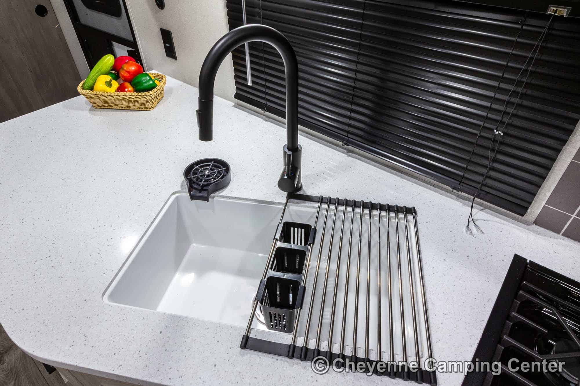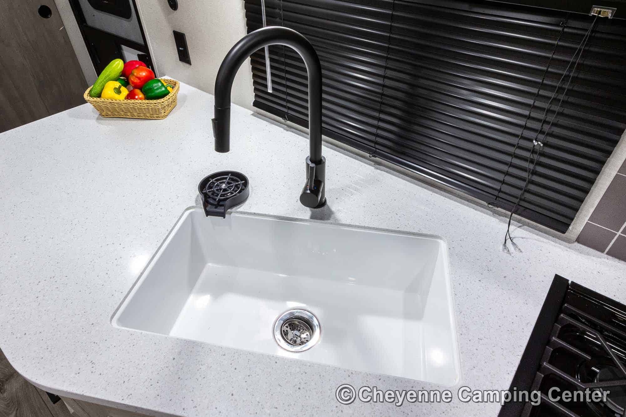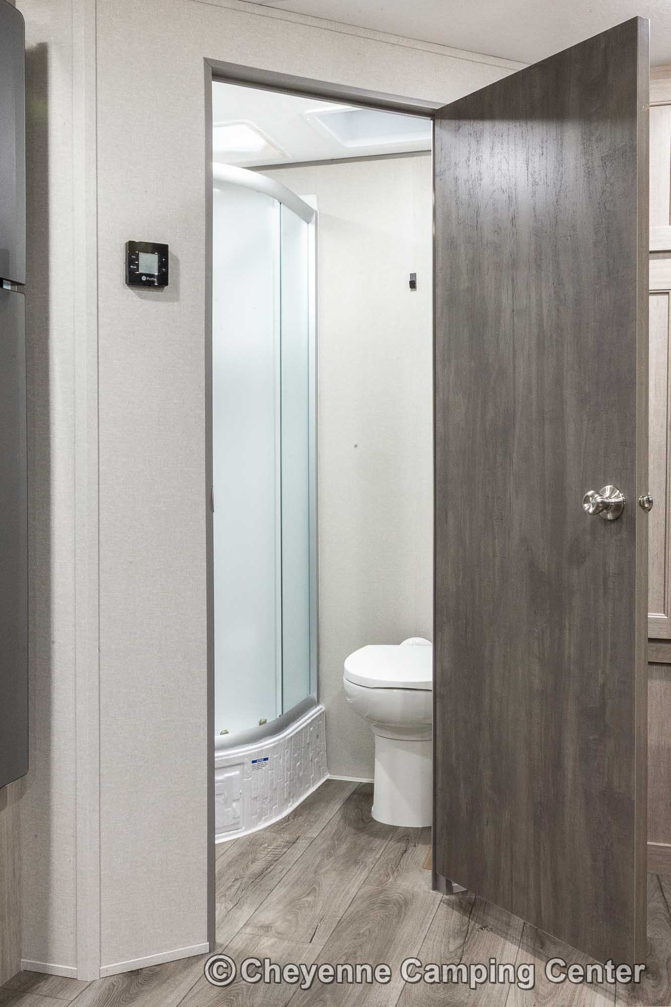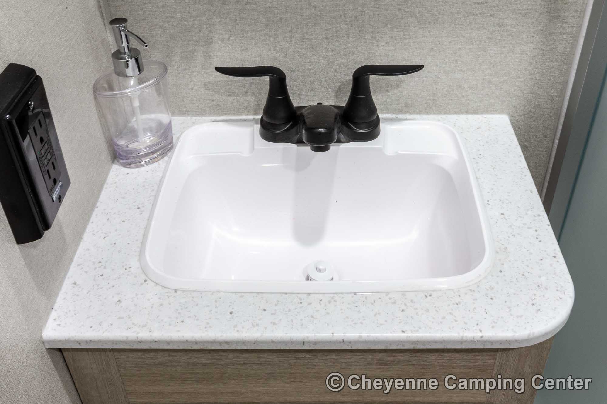 Additional features include pleated window shades, ducted heat, 15,000 BTU GE ducted A/C, tankless water heater, enclosed underbelly, 12V deep cycle battery, filled LP tanks, one-year manufacturer warranty, and one year of 24/7 roadside assistance. The Catalina Legacy Edition 243RBS for sale at Cheyenne Camping Center is the ultimate couples travel trailer for relaxing in comfort and exploring in style.