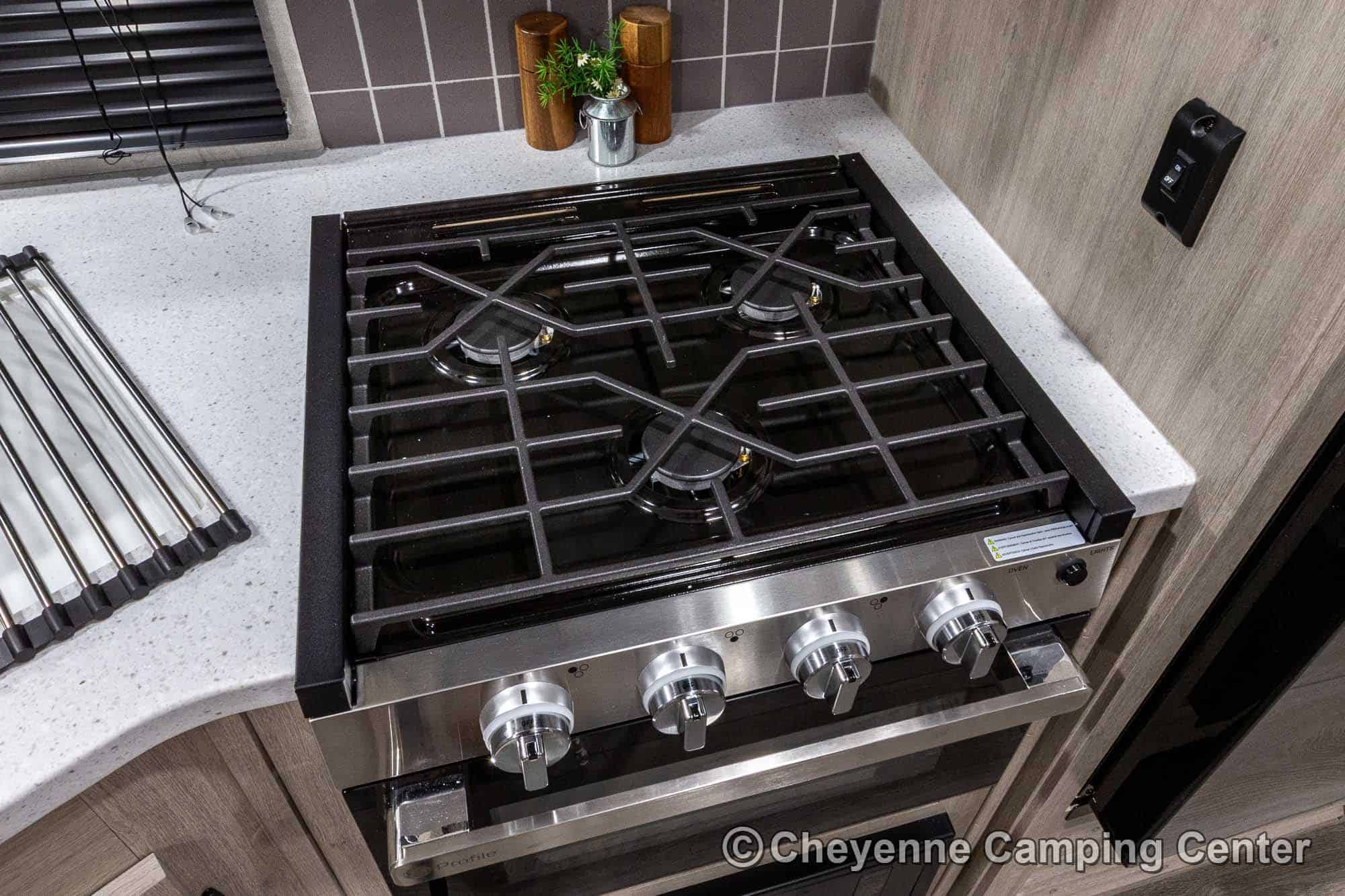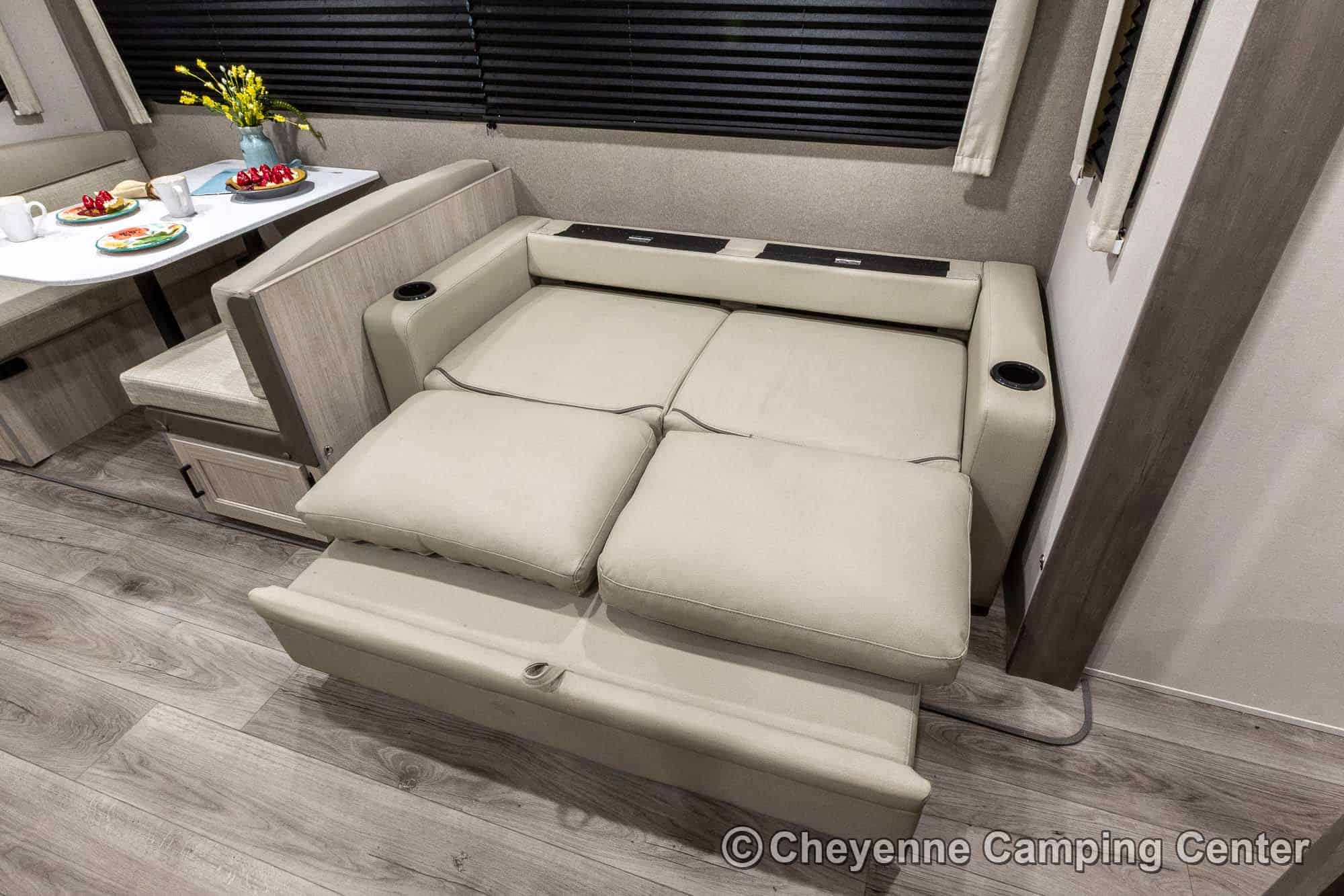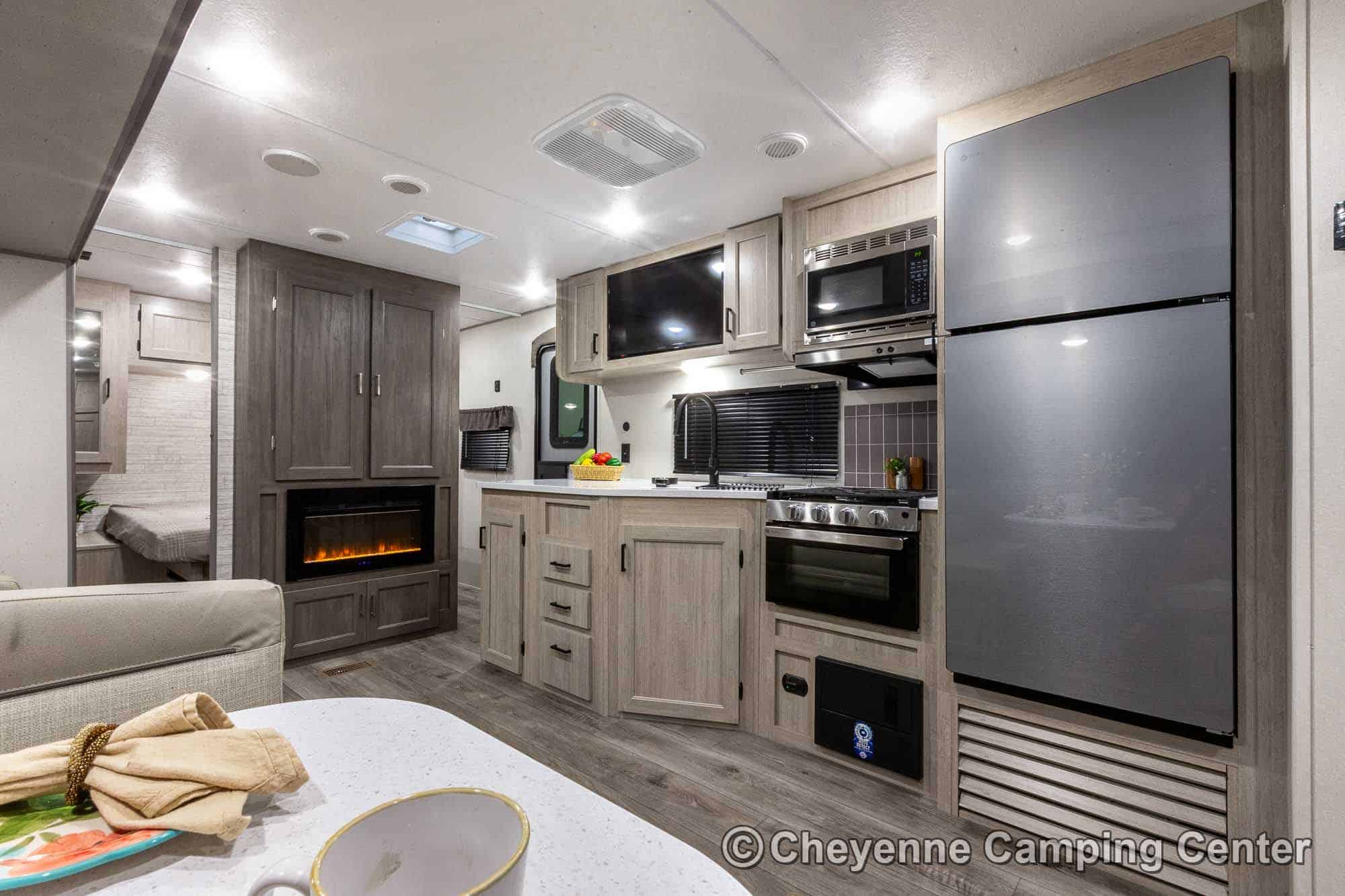 Inside, you’ll find a spacious living area with a hide-a-bed sofa, electric fireplace with heat, 32″ smart TV, JBL Bluetooth stereo, and additional storage. The kitchen is outfitted with GE appliances, including a microwave, range/oven, and 10 cu. ft. 12V refrigerator. You’ll also have a residential-style faucet, a large pantry with washer/dryer prep, and a convertible dinette.