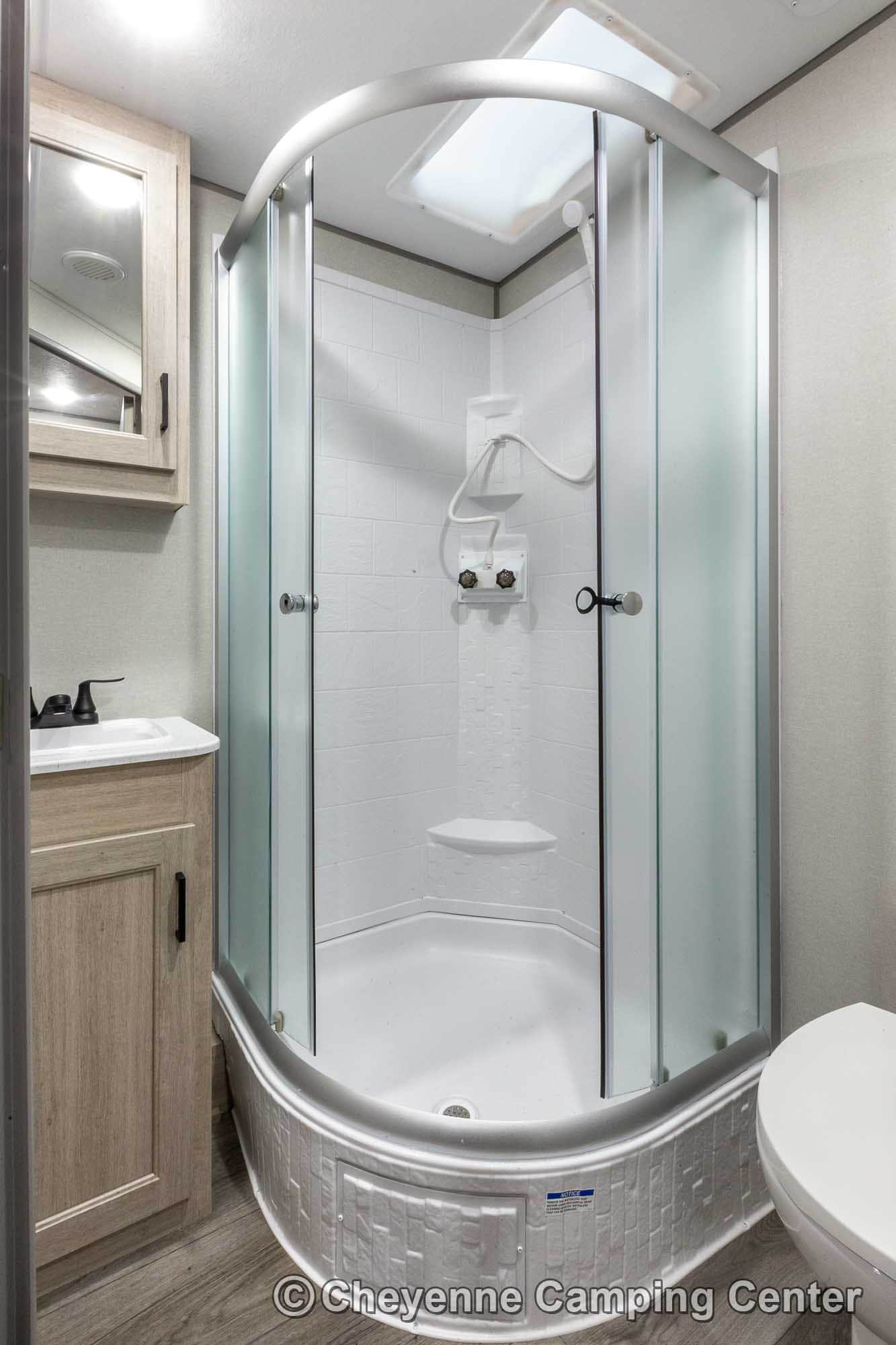 The private front bedroom features a walk-around queen bed, dual wardrobes, overhead cabinets, USB ports, under-bed storage, and TV hookups. The bathroom includes a glass-enclosed shower with skylight, vanity, and foot-flush toilet.