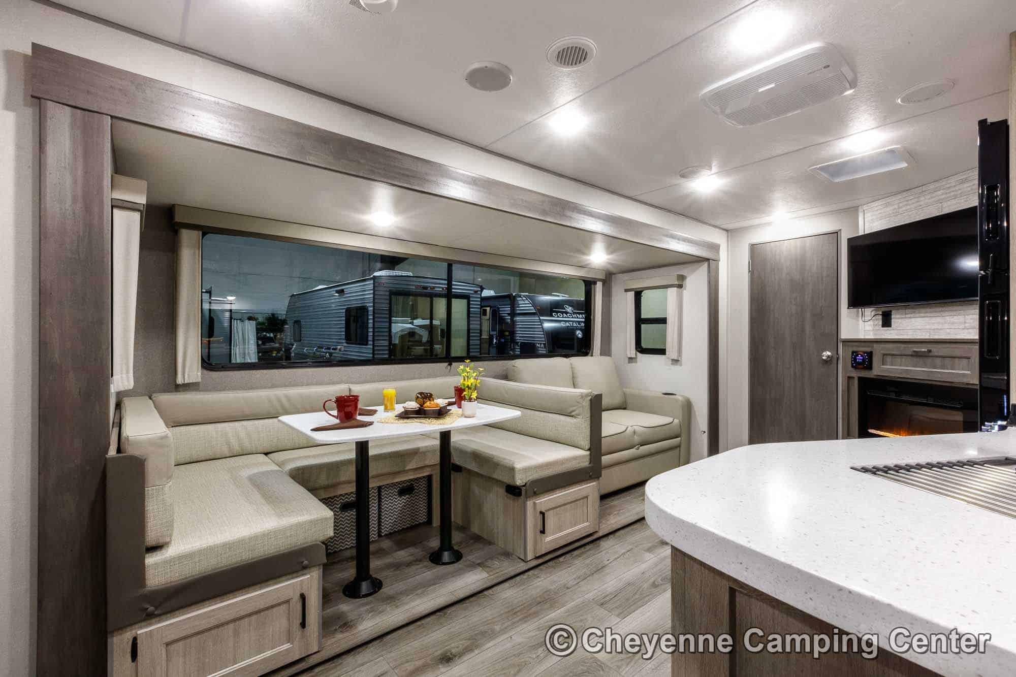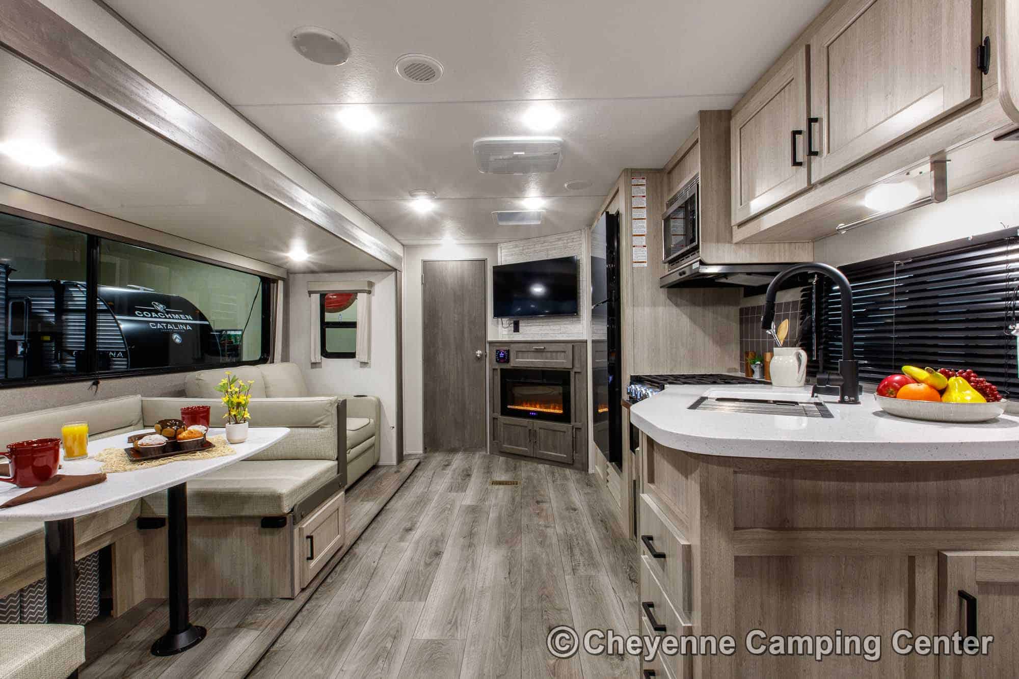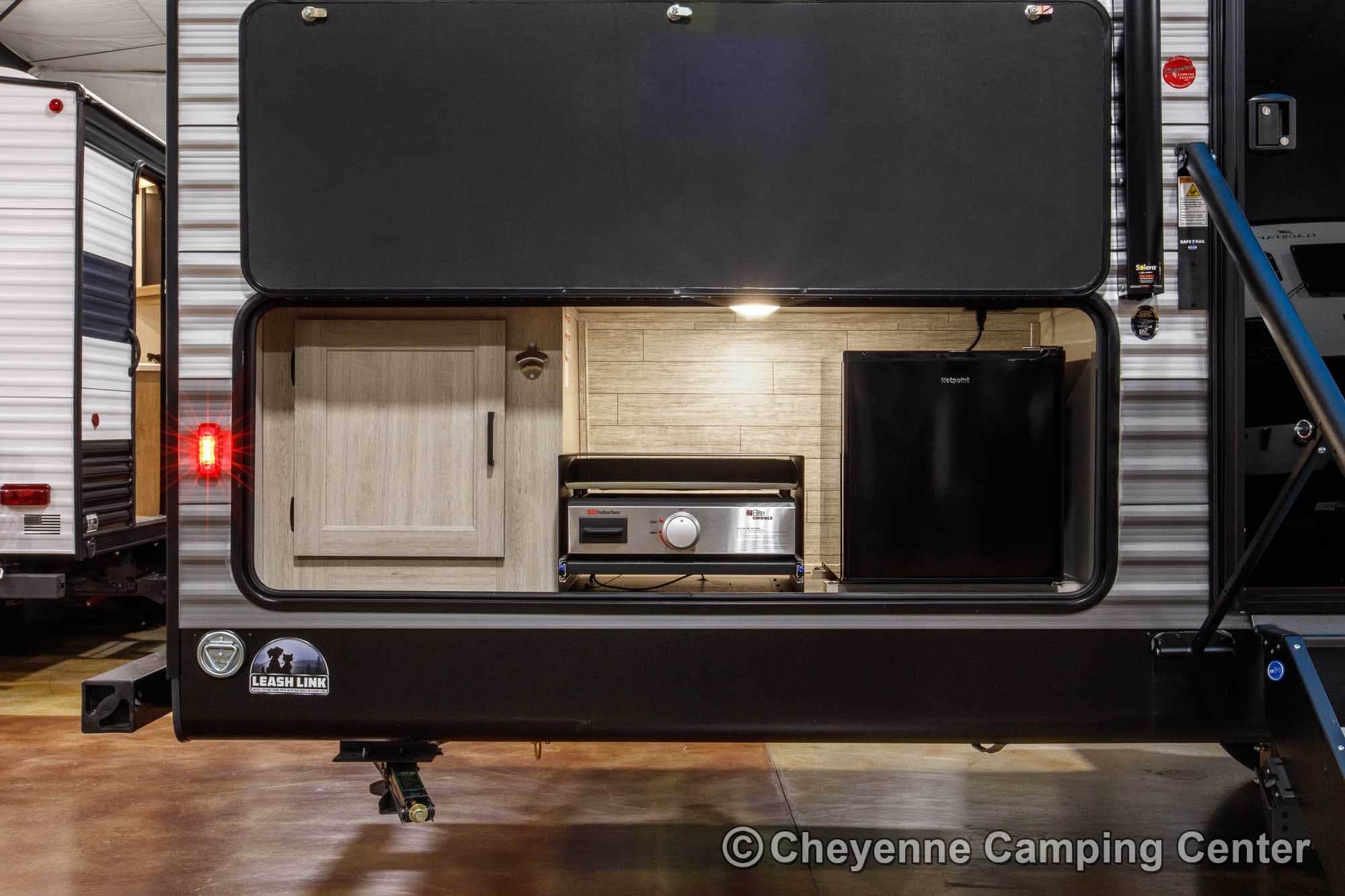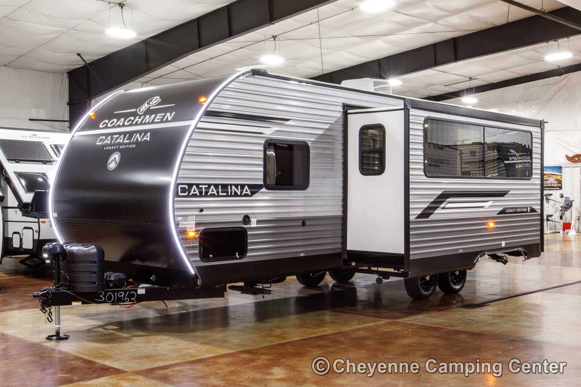 The Catalina Legacy Edition 263BHSCK is very well equipped! Outside, you’ll have a camp kitchen with a refrigerator & griddle, premium MORryde entry steps and handrail, Leash link for pets, battery disconnect, power awning with multicolor LED lighting, aluminum wheels, shower fixture, black tank flush fixture, and front pass-thru storage.