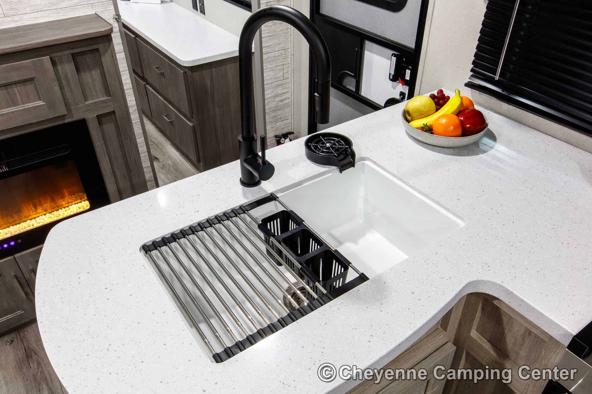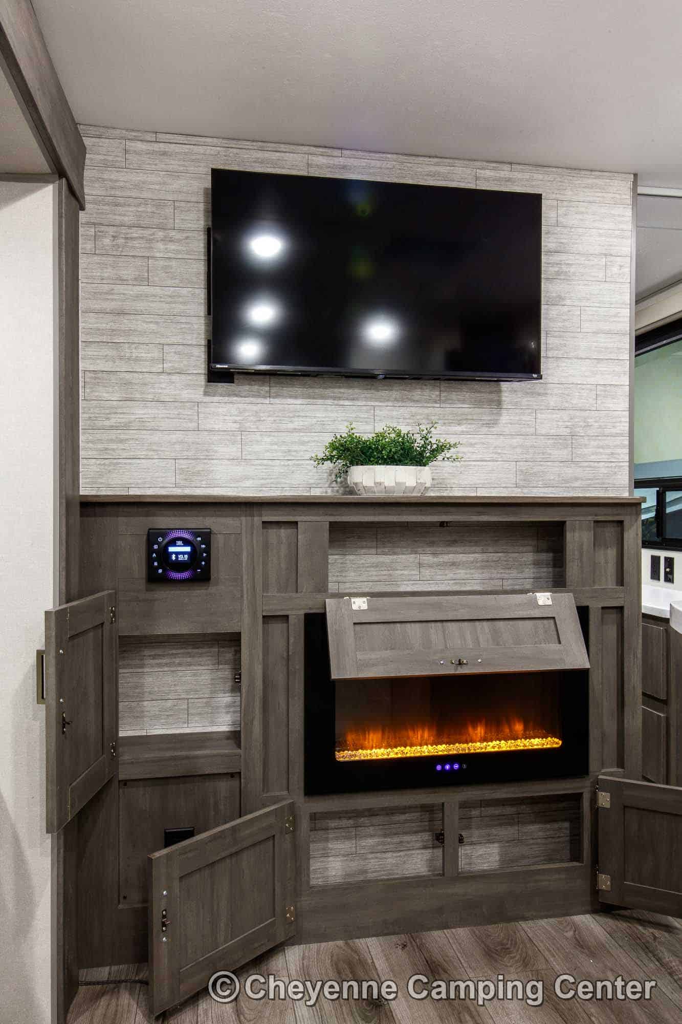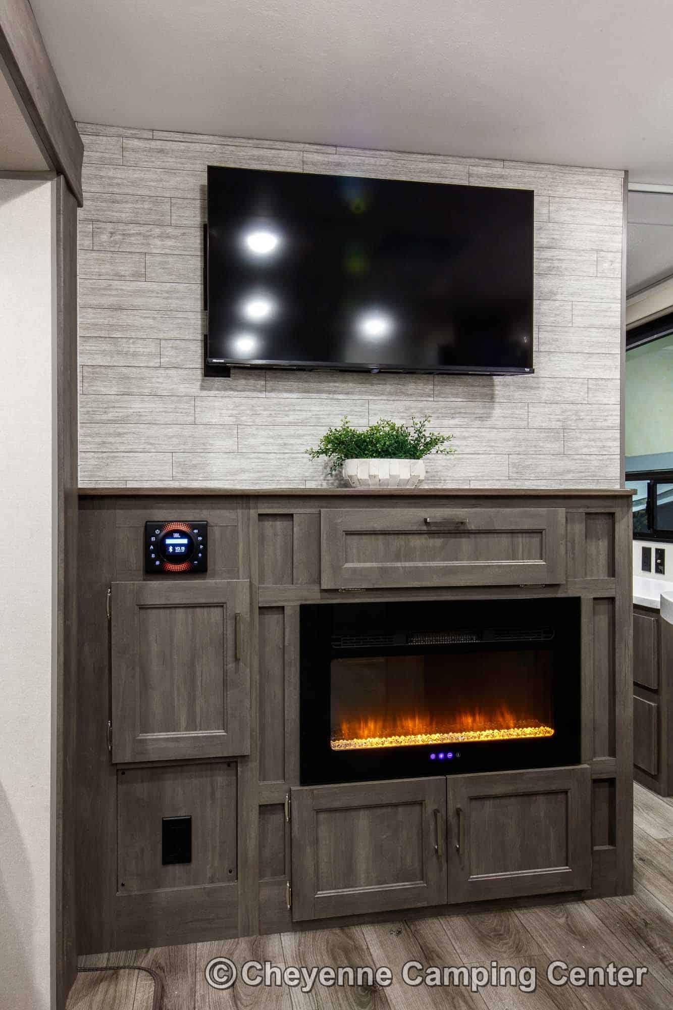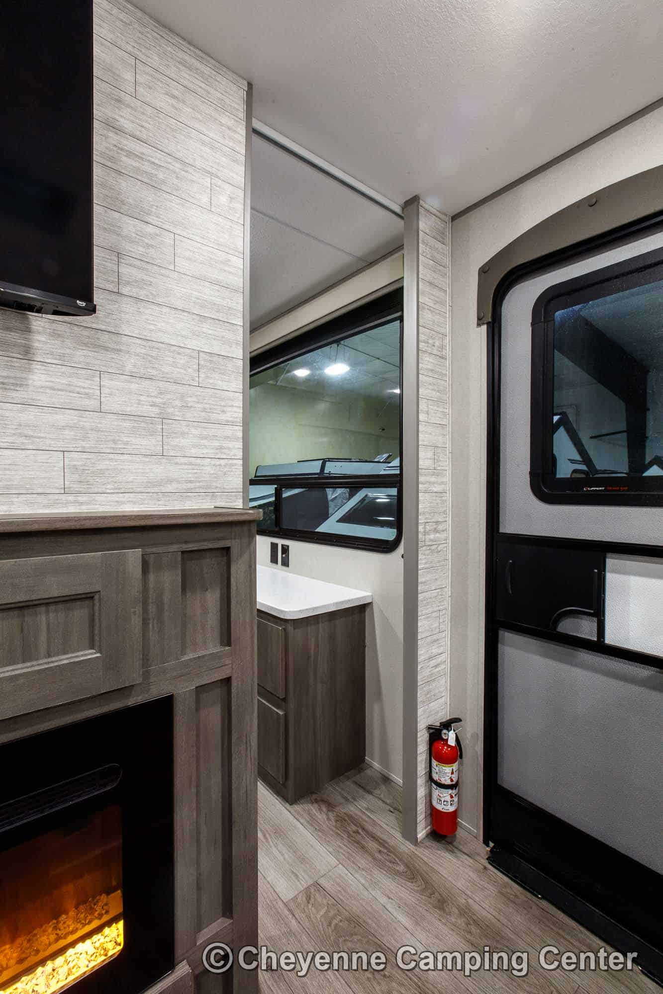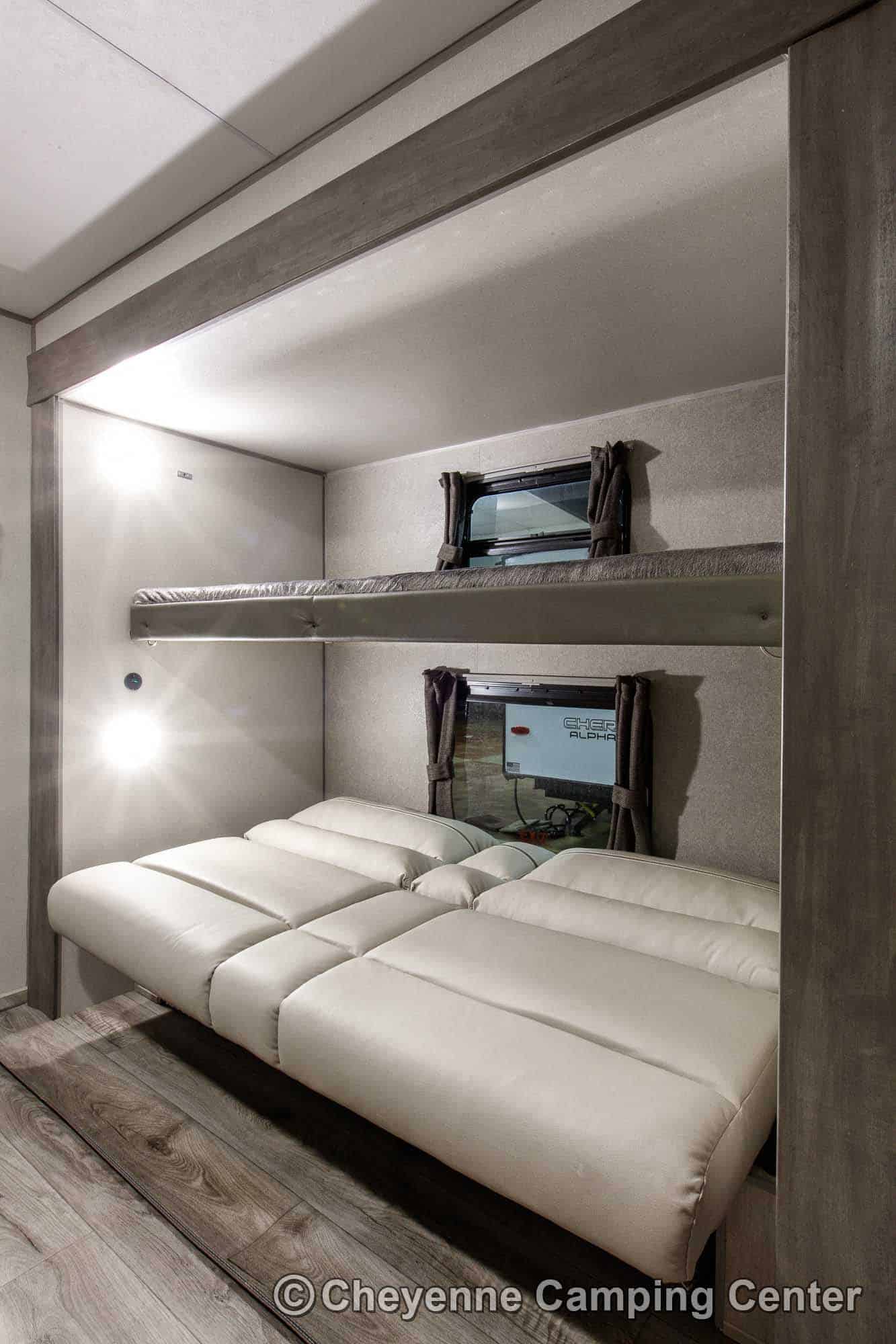 Inside, you’ll have sleeping for 8 with the bunks, sleeper sofa, convertible dinette, and queen bed. The living room features the “Sit-Lounge-Sleep” sofa that converts to a bed or lounger, and an entertainment center with 39′ HD TV, JBL stereo, electric fireplace, and storage. The kitchen features GE appliances (microwave, range/oven & 10 cubic foot 12V refrigerator), solid-surface countertops, a residential faucet, and large pantry. The private front slide-out bedroom has a queen bed, large wardrobes, overhead cabinets, washer/dryer prep in a dedicated closet, USB charging ports, a second air conditioner, and TV hookups. The bathroom includes a glass-enclosed shower with skylight, vanity, and foot flush toilet.