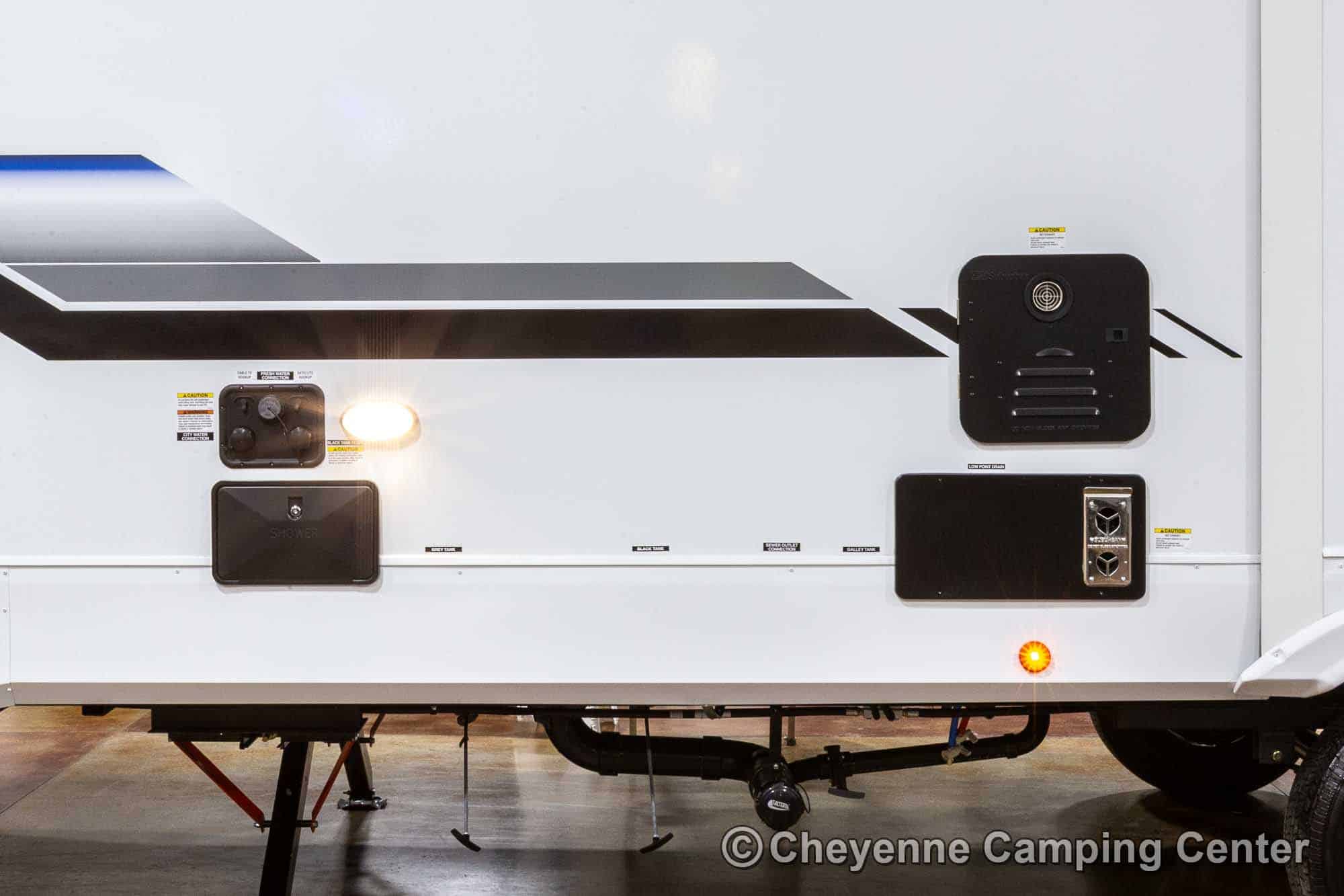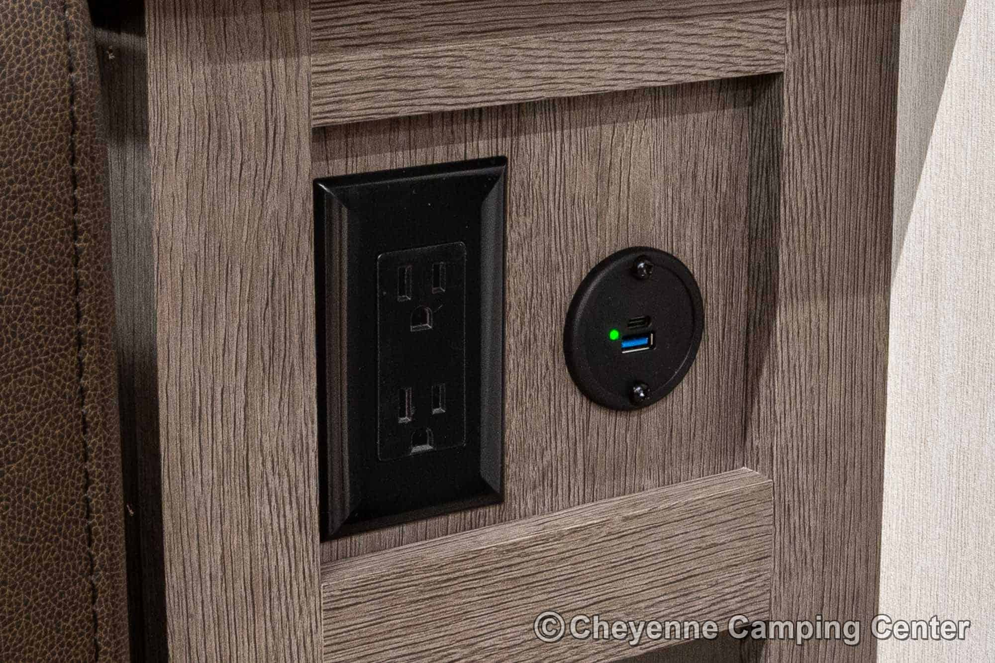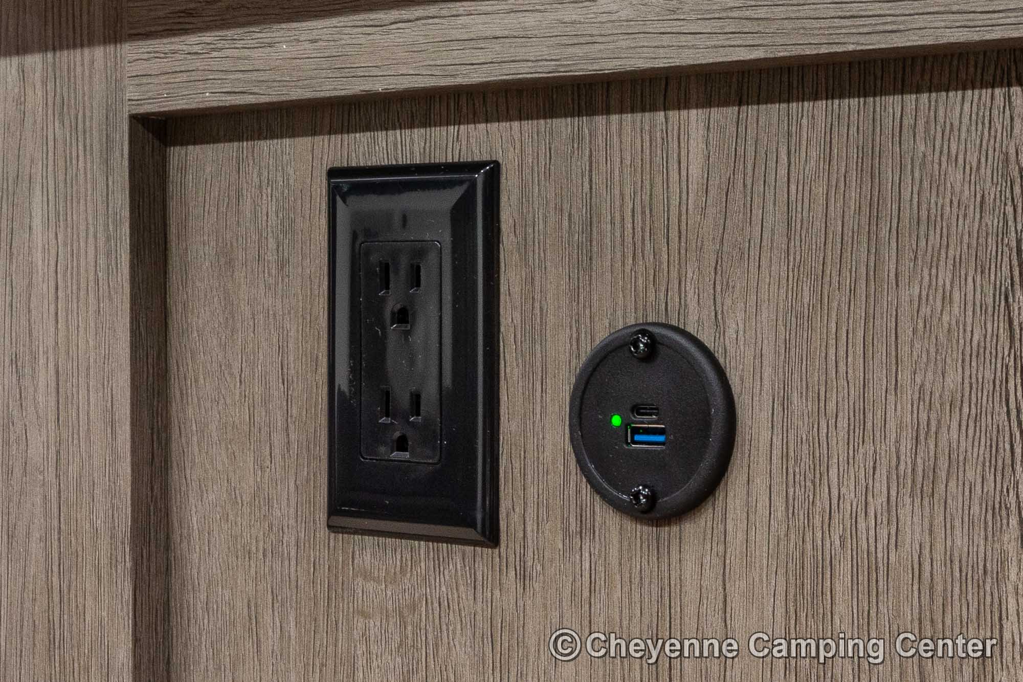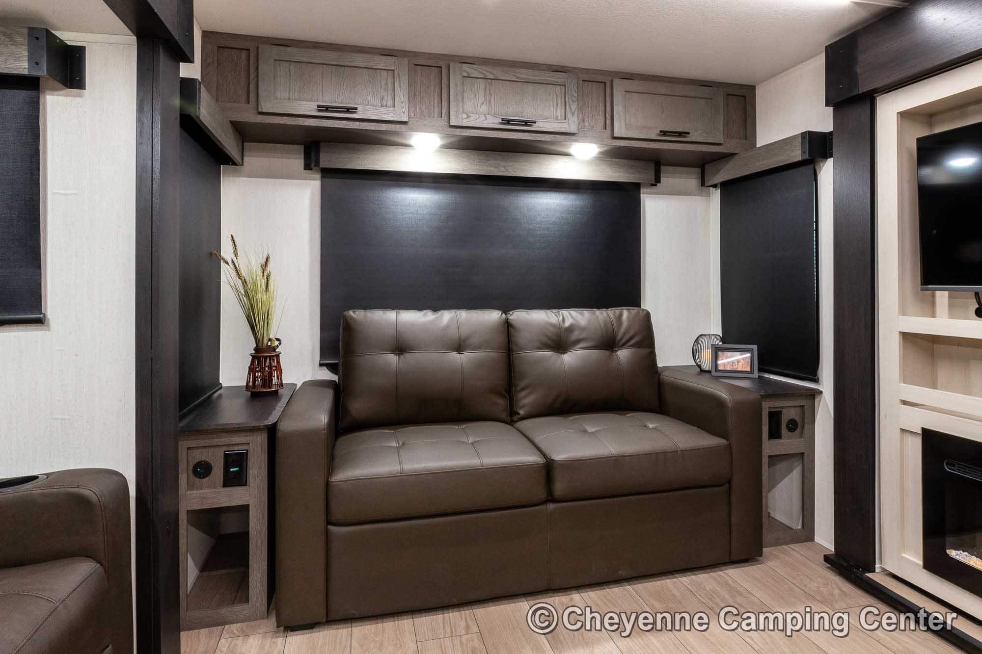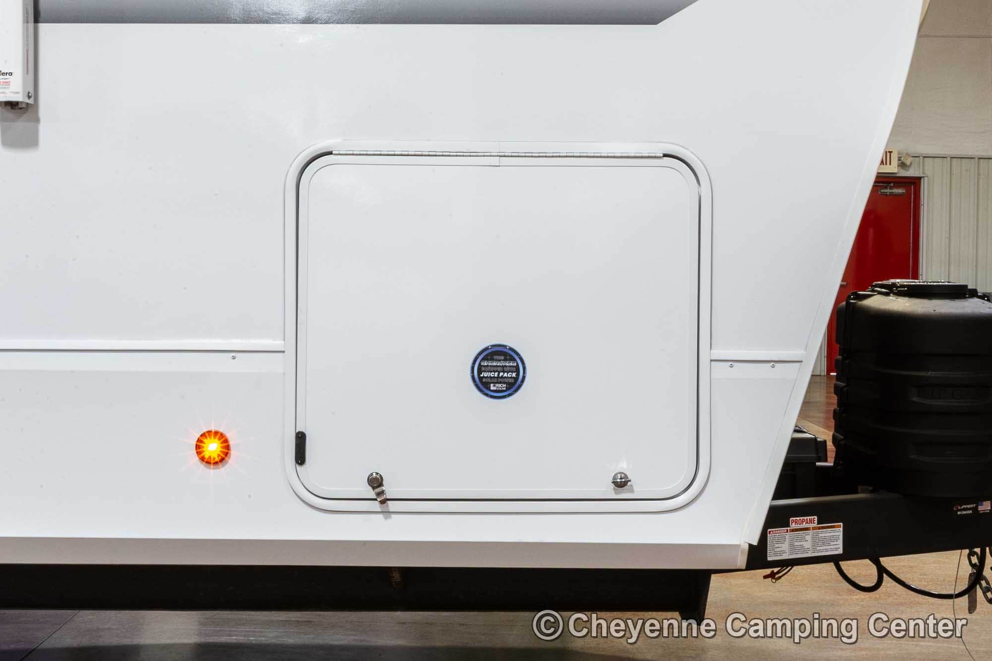 Outside, you’ll have a 100-watt solar panel, premium entry steps, a receiver accessory hitch, Leash Latch for pets, two power awning with LED lighting, premium wheels, a hot/cold shower, black tank flush, a nicely finished pass-thru storage compartment, power stabilizer jacks, a power tongue jack, and enclosed heated holding tanks for extended-season adventures.