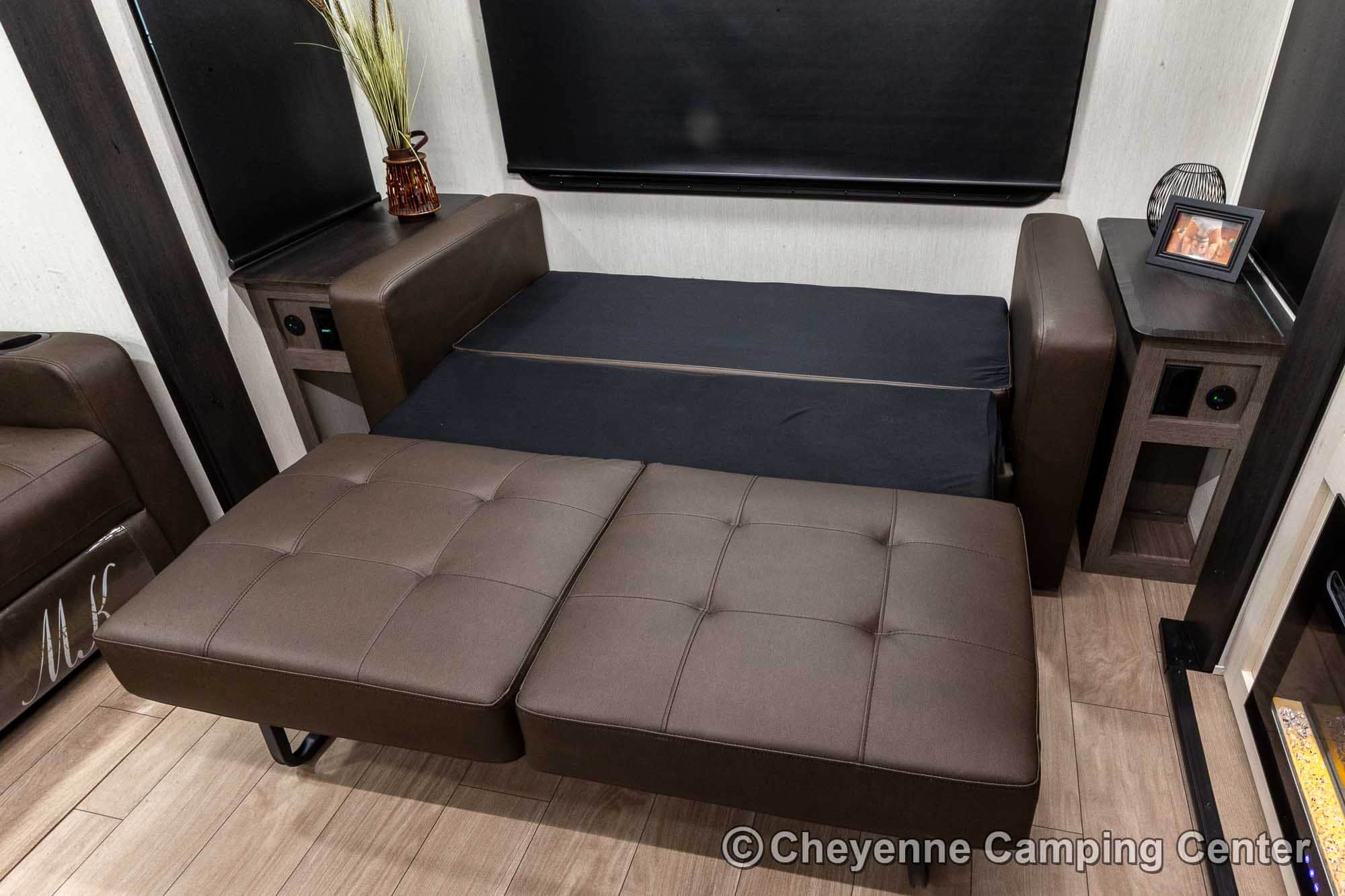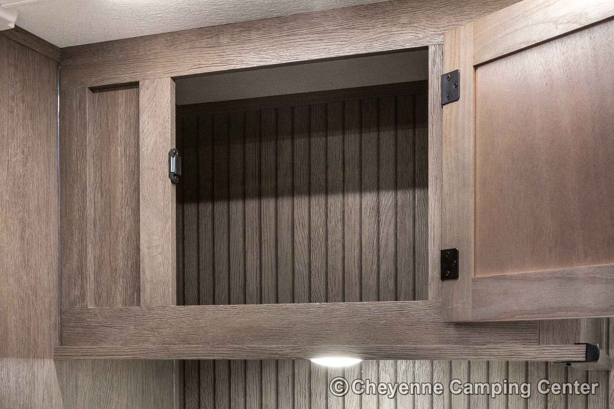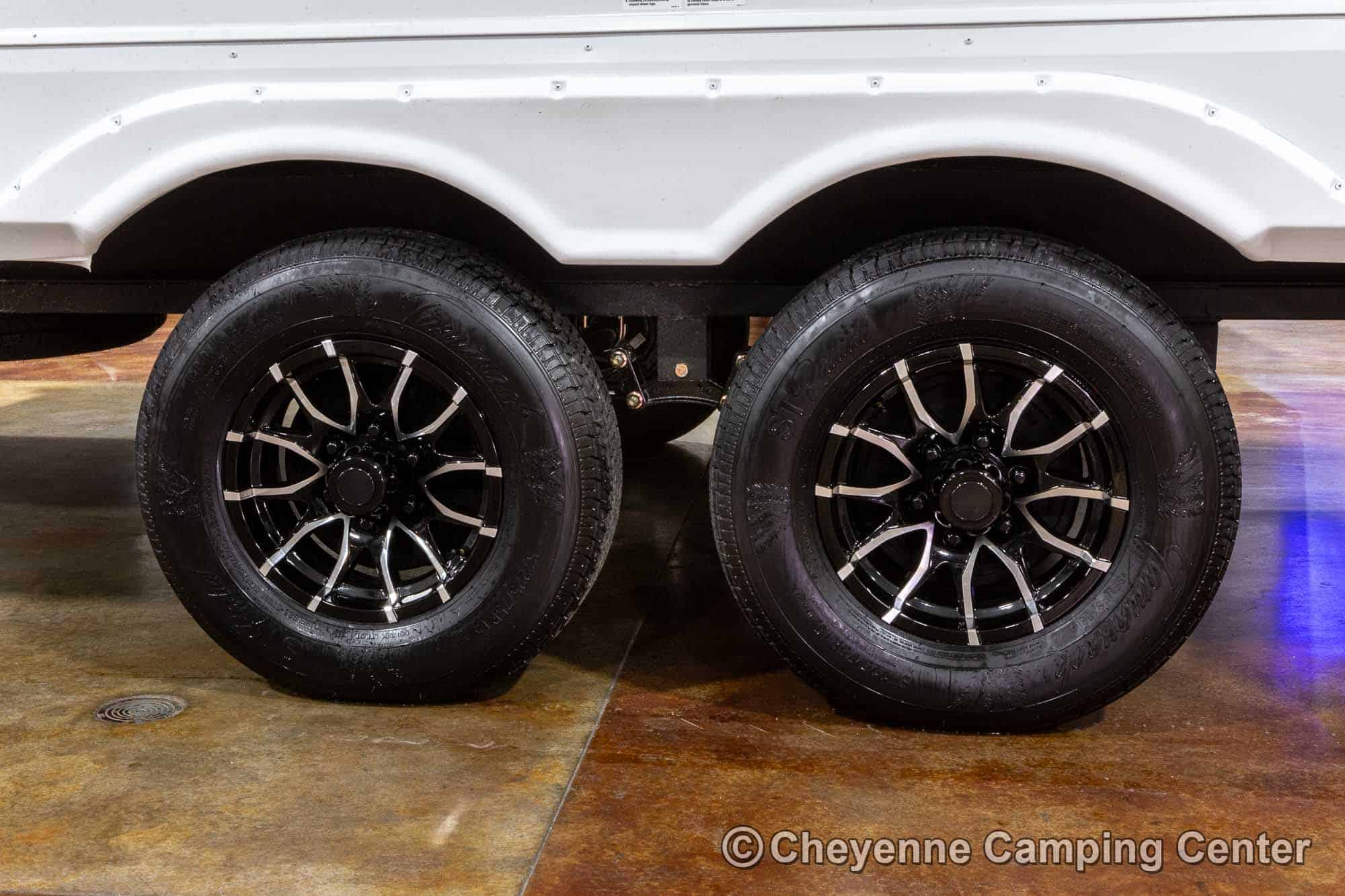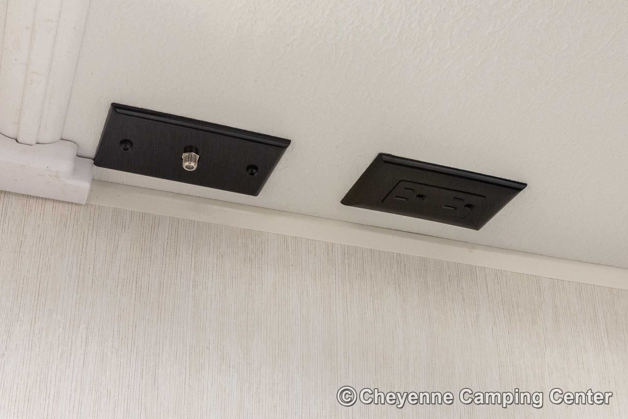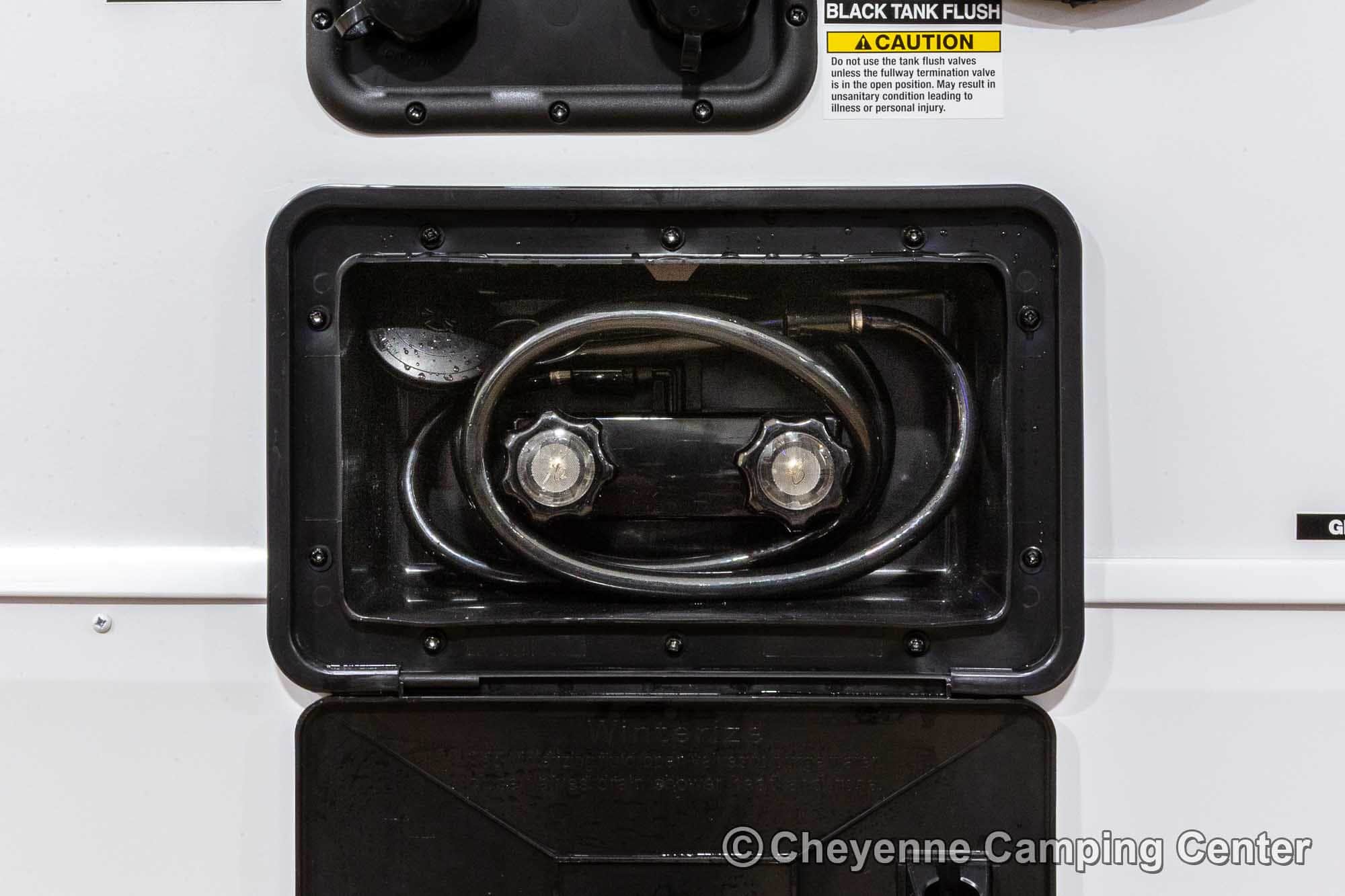 Outside, you’ll have a 100-watt solar panel, premium entry steps, a receiver accessory hitch, Leash Latch for pets, two power awning with LED lighting, premium wheels, a hot/cold shower, black tank flush, a nicely finished pass-thru storage compartment, power stabilizer jacks, a power tongue jack, and enclosed heated holding tanks for extended-season adventures.