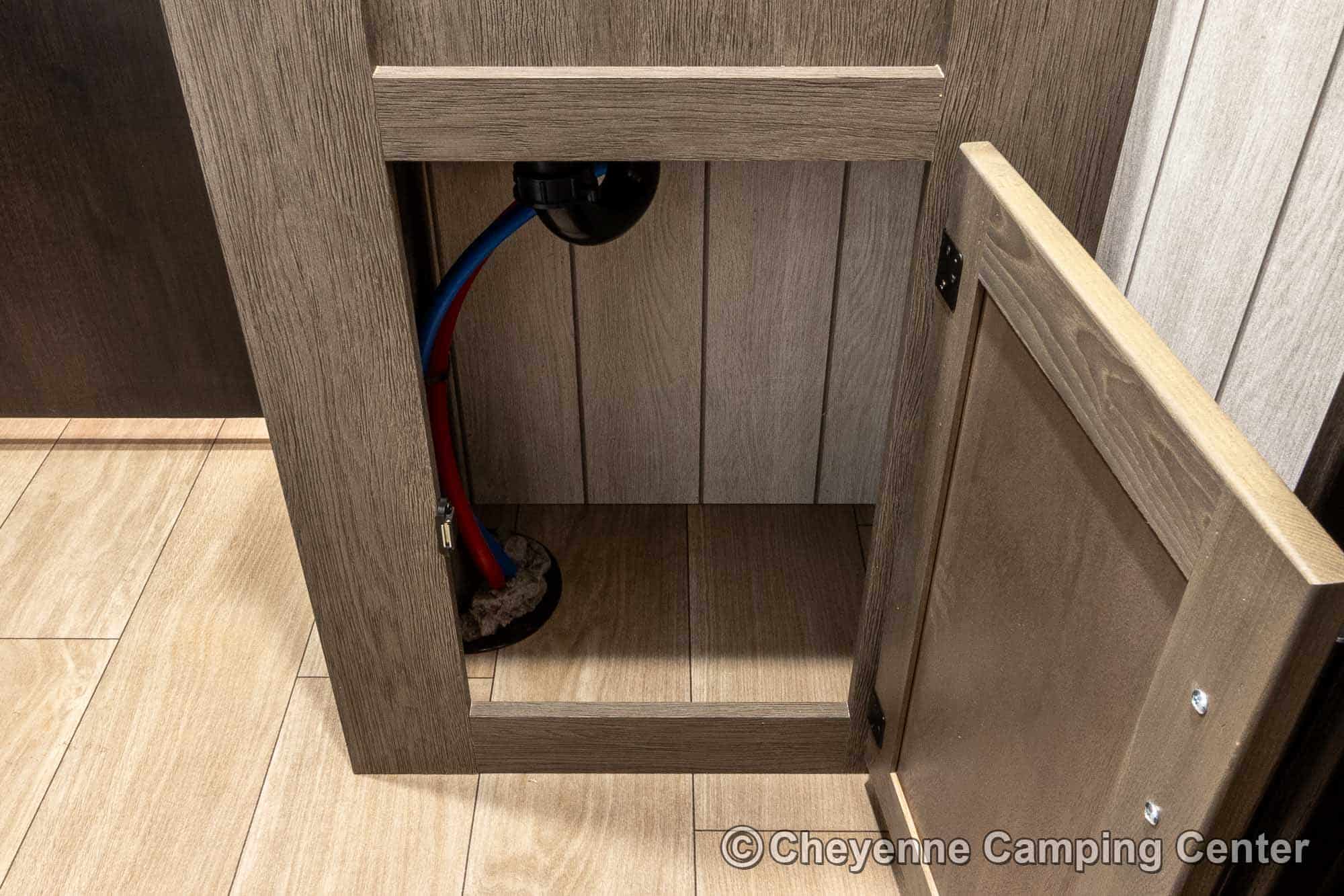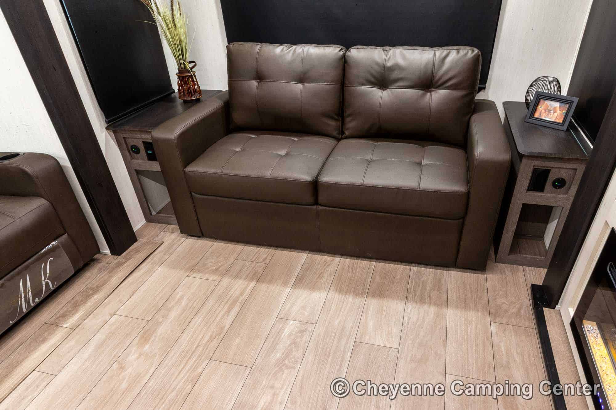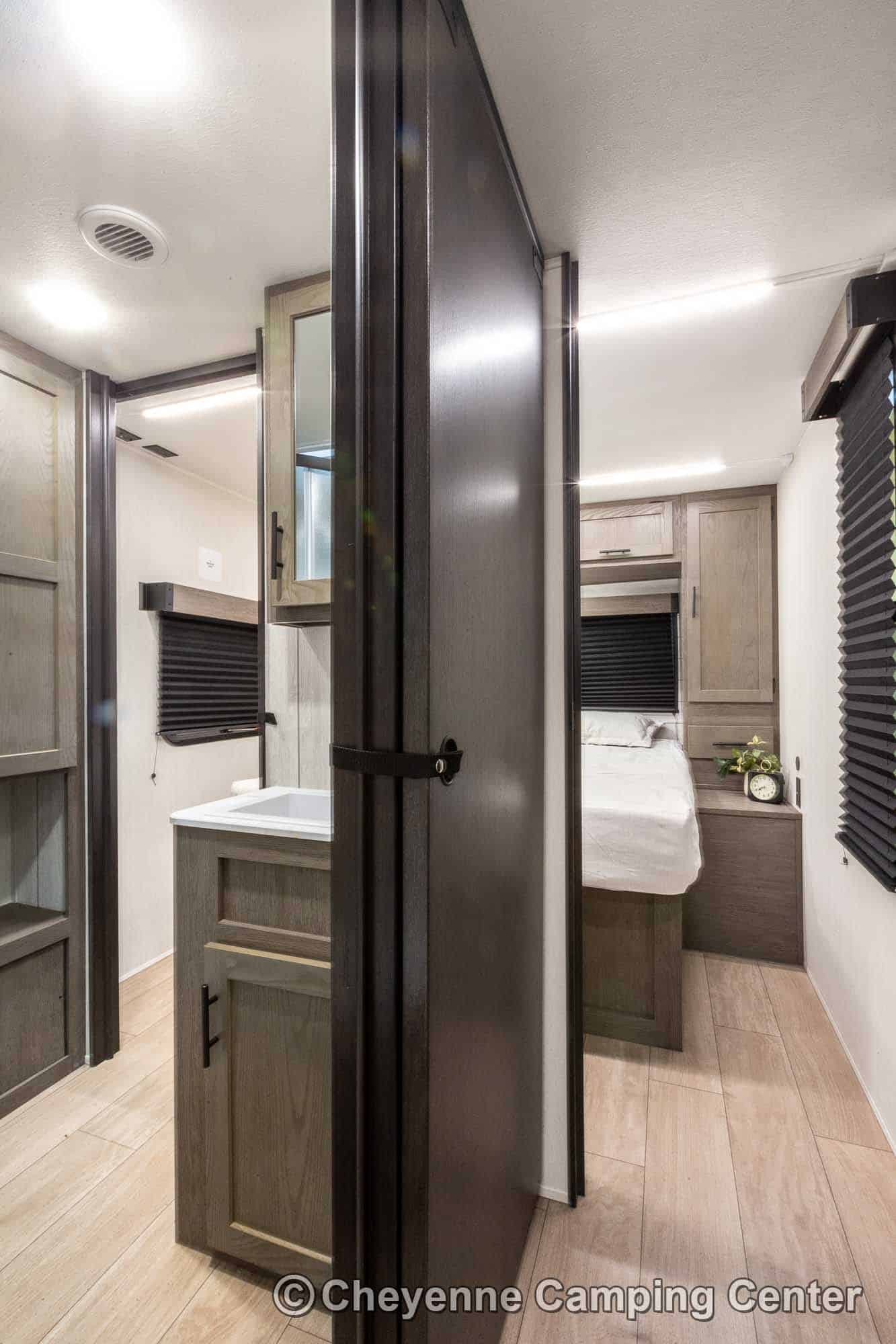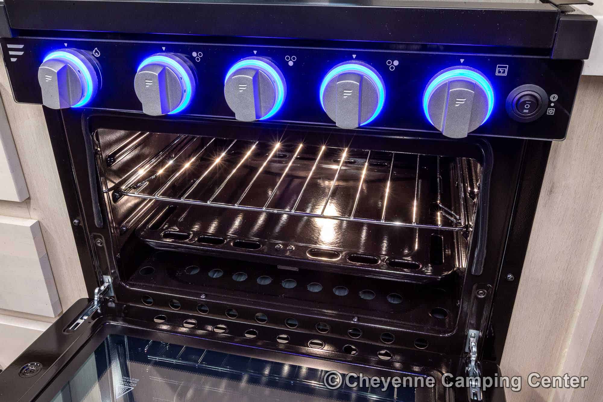 Outside, you’ll have a 100-watt solar panel, premium entry steps, a receiver accessory hitch, Leash Latch for pets, two power awning with LED lighting, premium wheels, a hot/cold shower, black tank flush, a nicely finished pass-thru storage compartment, power stabilizer jacks, a power tongue jack, and enclosed heated holding tanks for extended-season adventures.