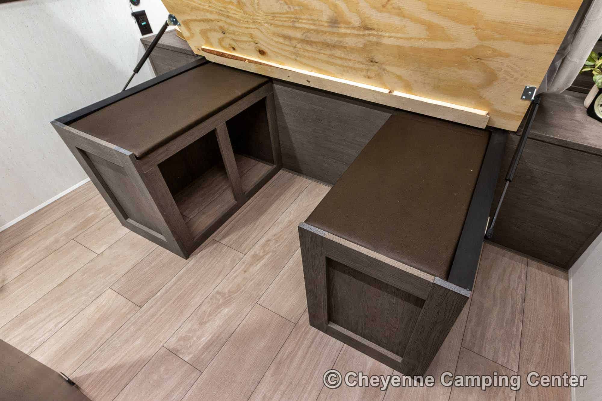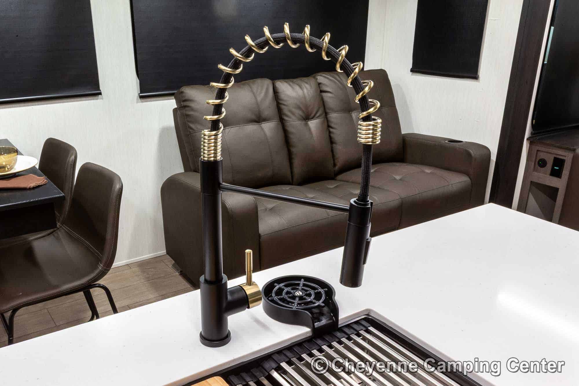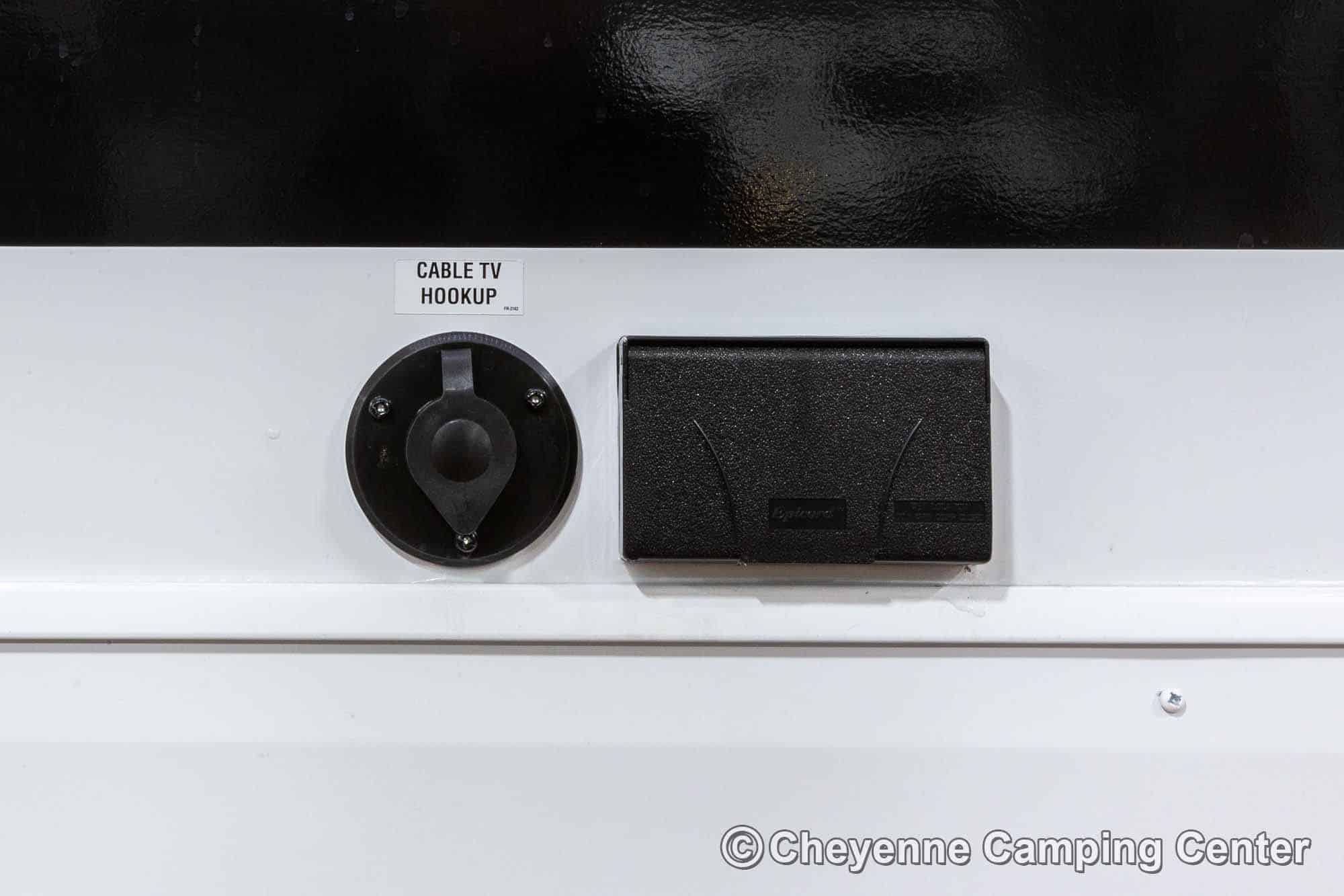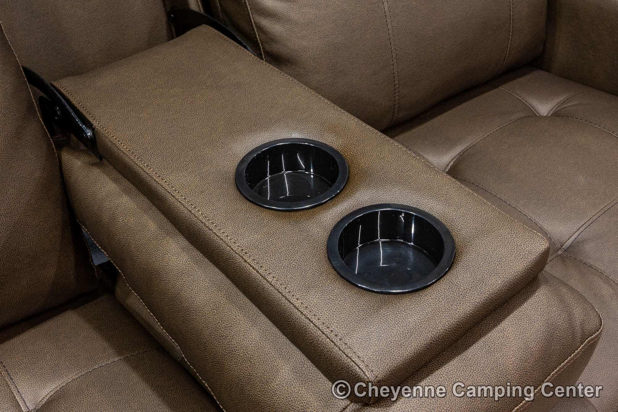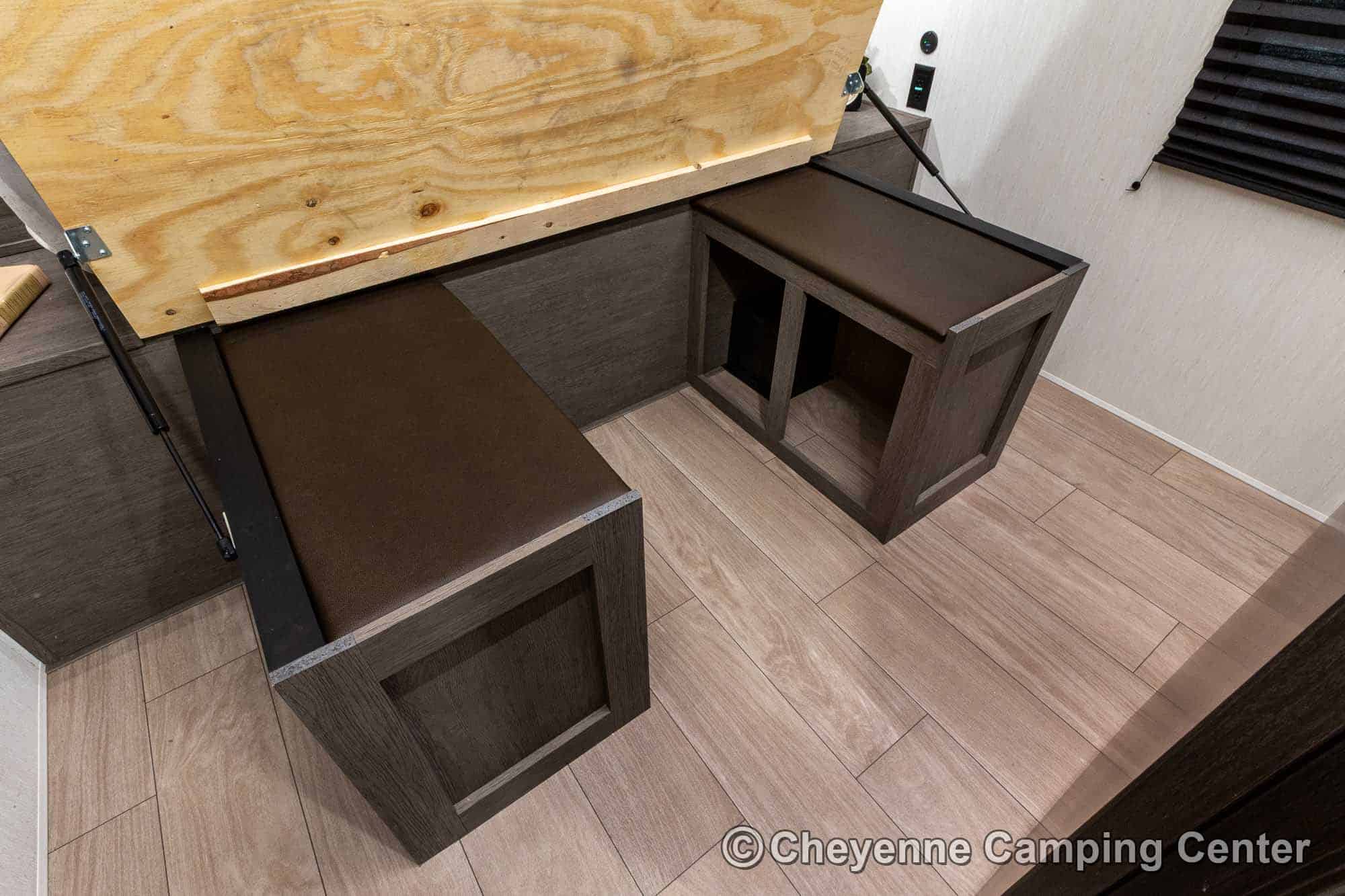 Outside, you’ll have a 100-watt solar panel, premium entry steps, a receiver accessory hitch, Leash Latch for pets, two power awning with LED lighting, premium wheels, a hot/cold shower, black tank flush, a nicely finished pass-thru storage compartment, power stabilizer jacks, a power tongue jack, and enclosed heated holding tanks for extended-season adventures.