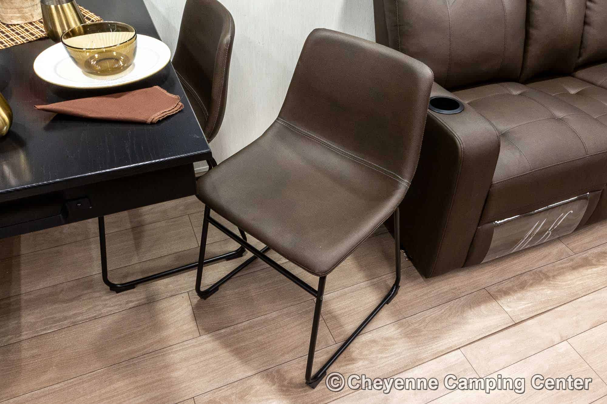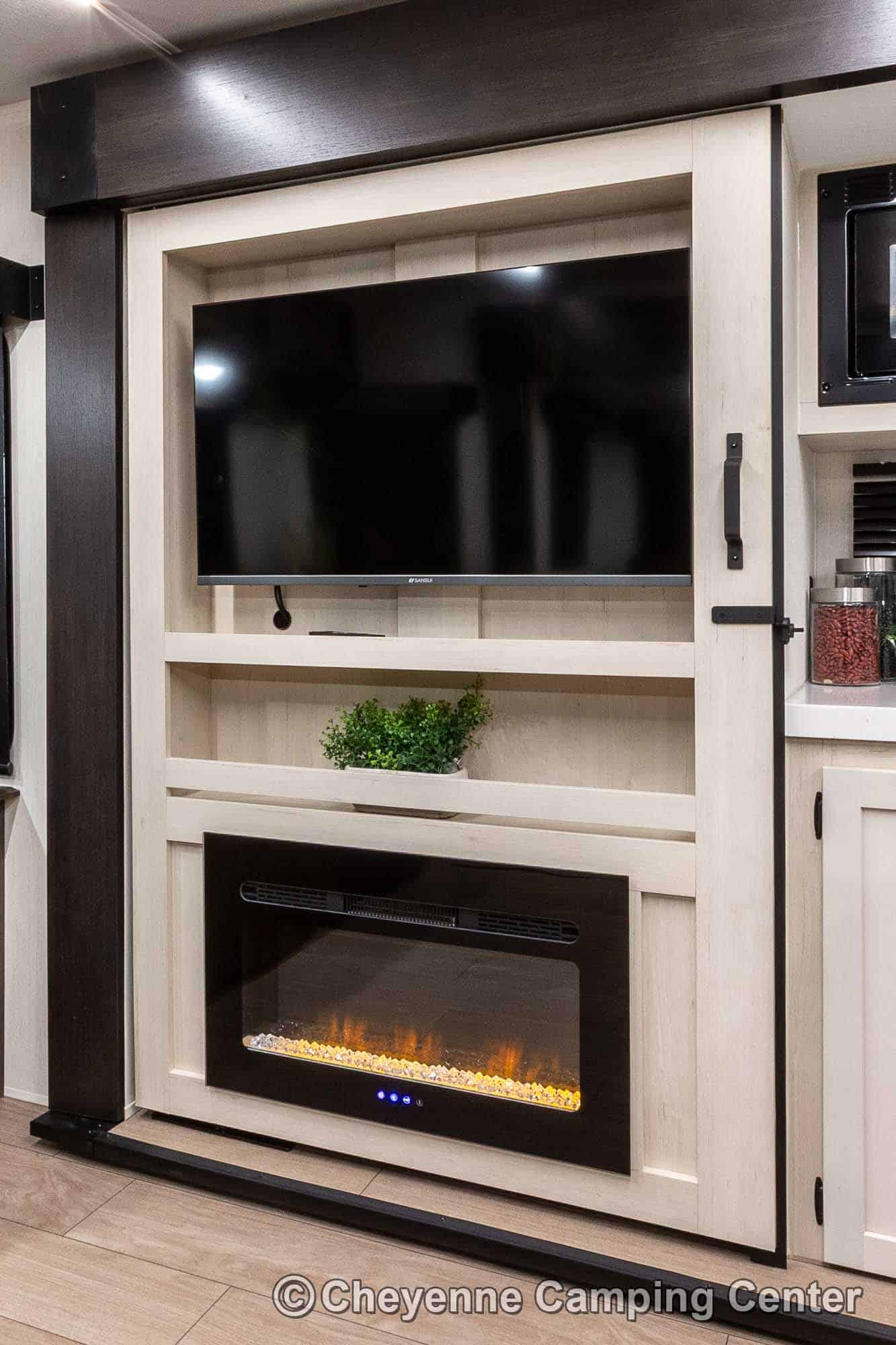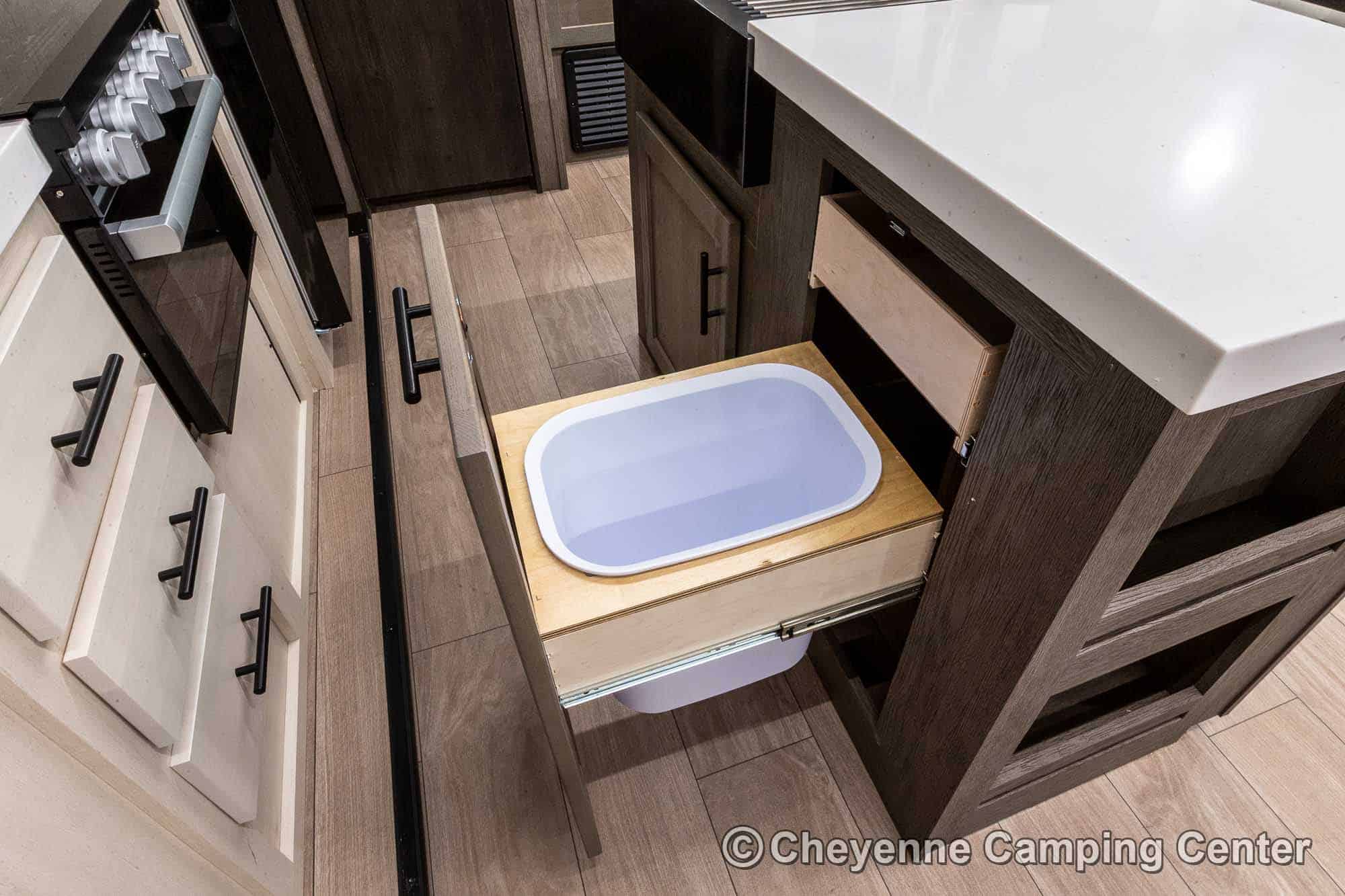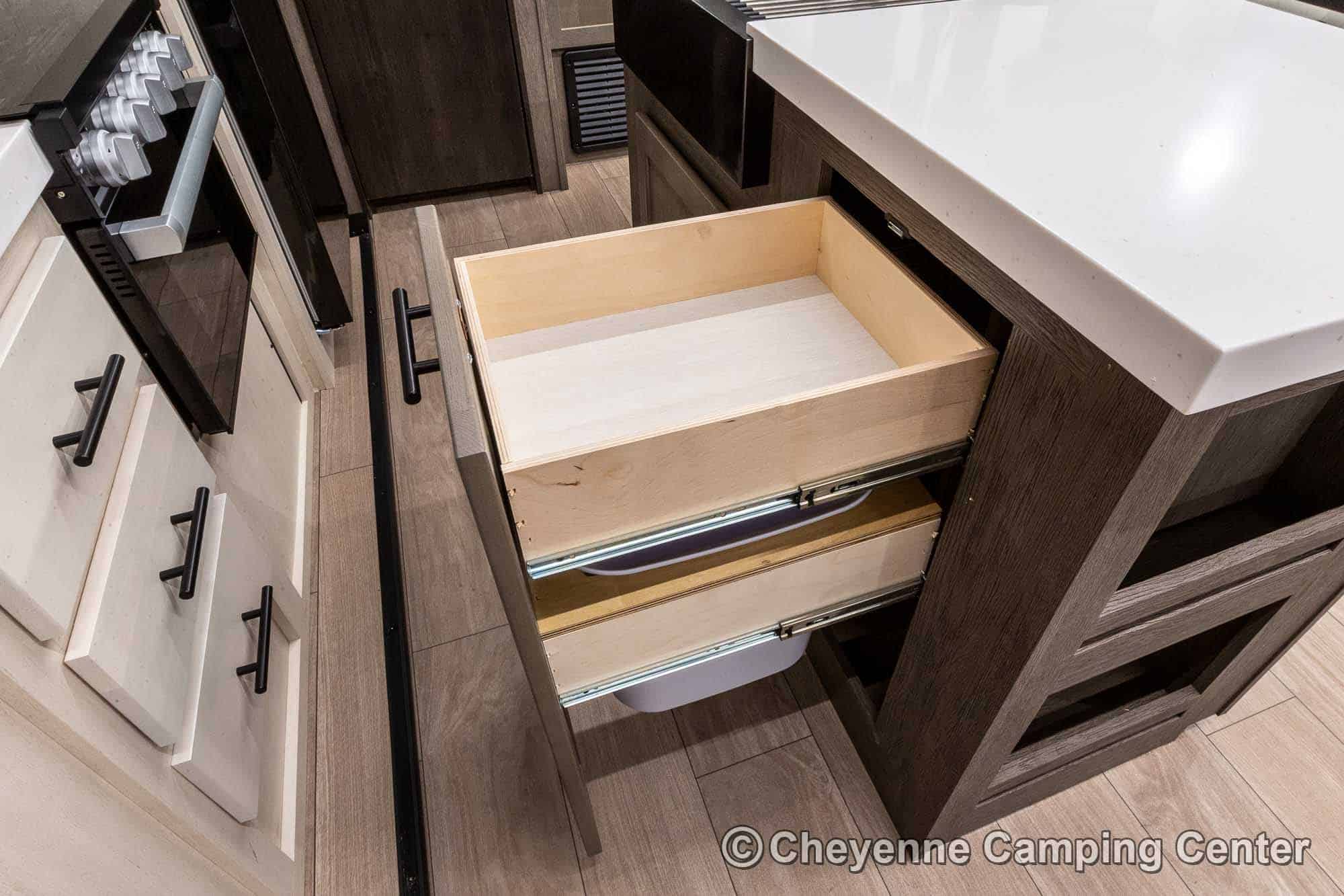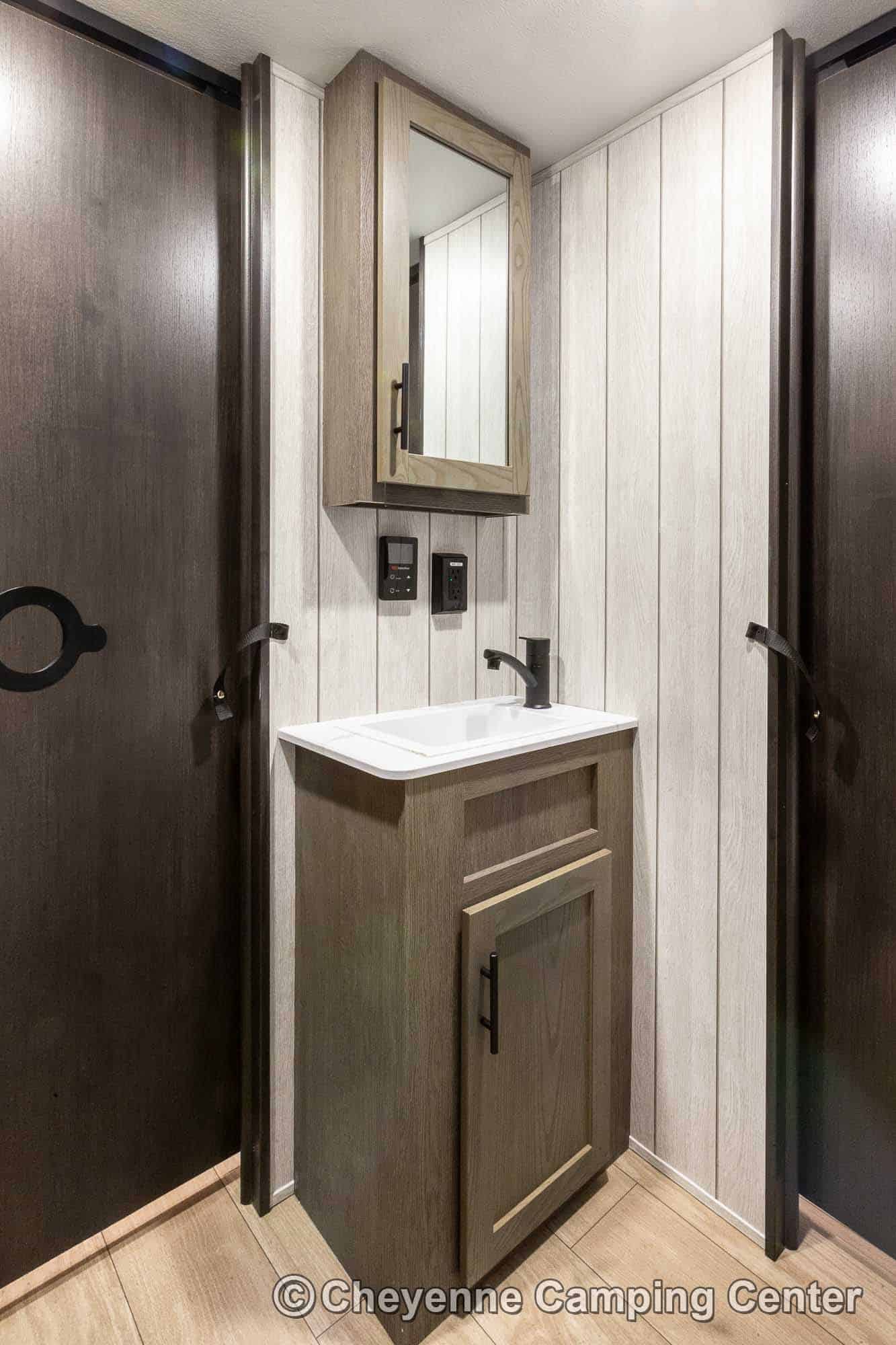 Outside, you’ll have a 100-watt solar panel, premium entry steps, a receiver accessory hitch, Leash Latch for pets, two power awning with LED lighting, premium wheels, a hot/cold shower, black tank flush, a nicely finished pass-thru storage compartment, power stabilizer jacks, a power tongue jack, and enclosed heated holding tanks for extended-season adventures.