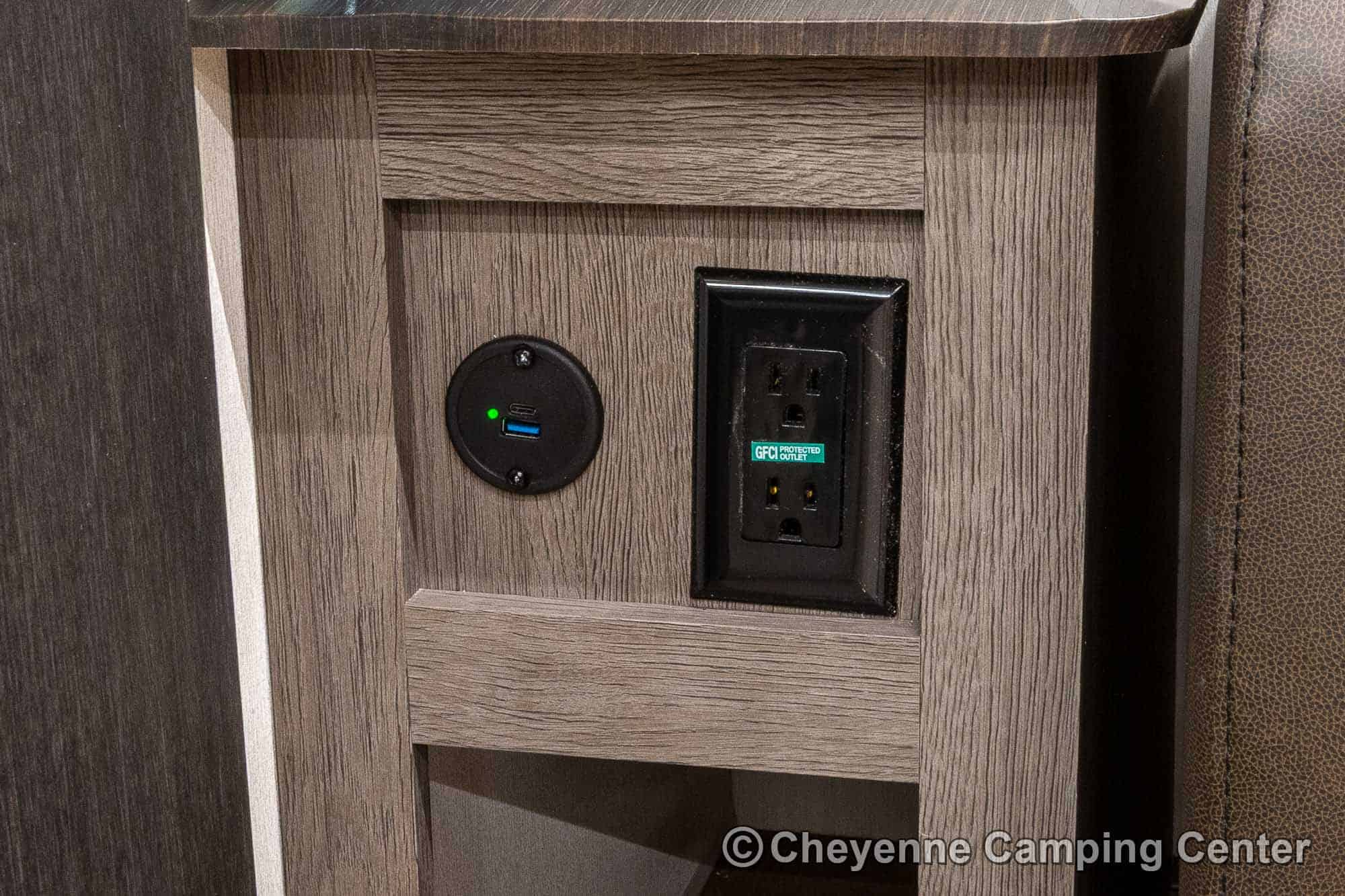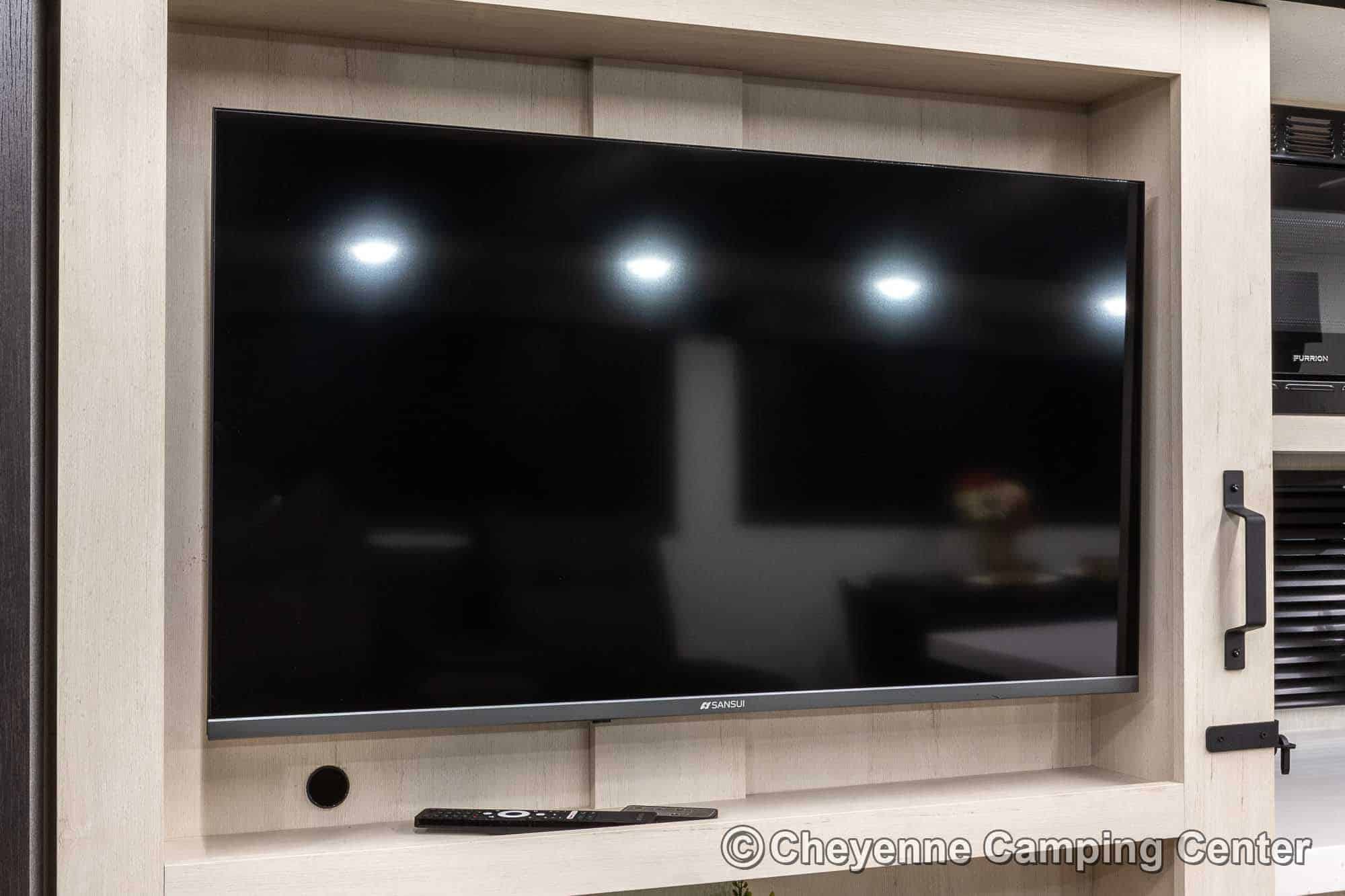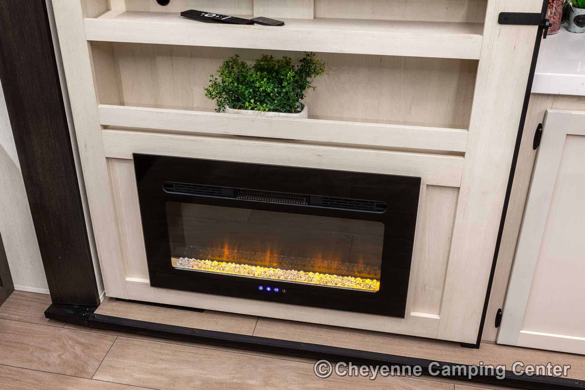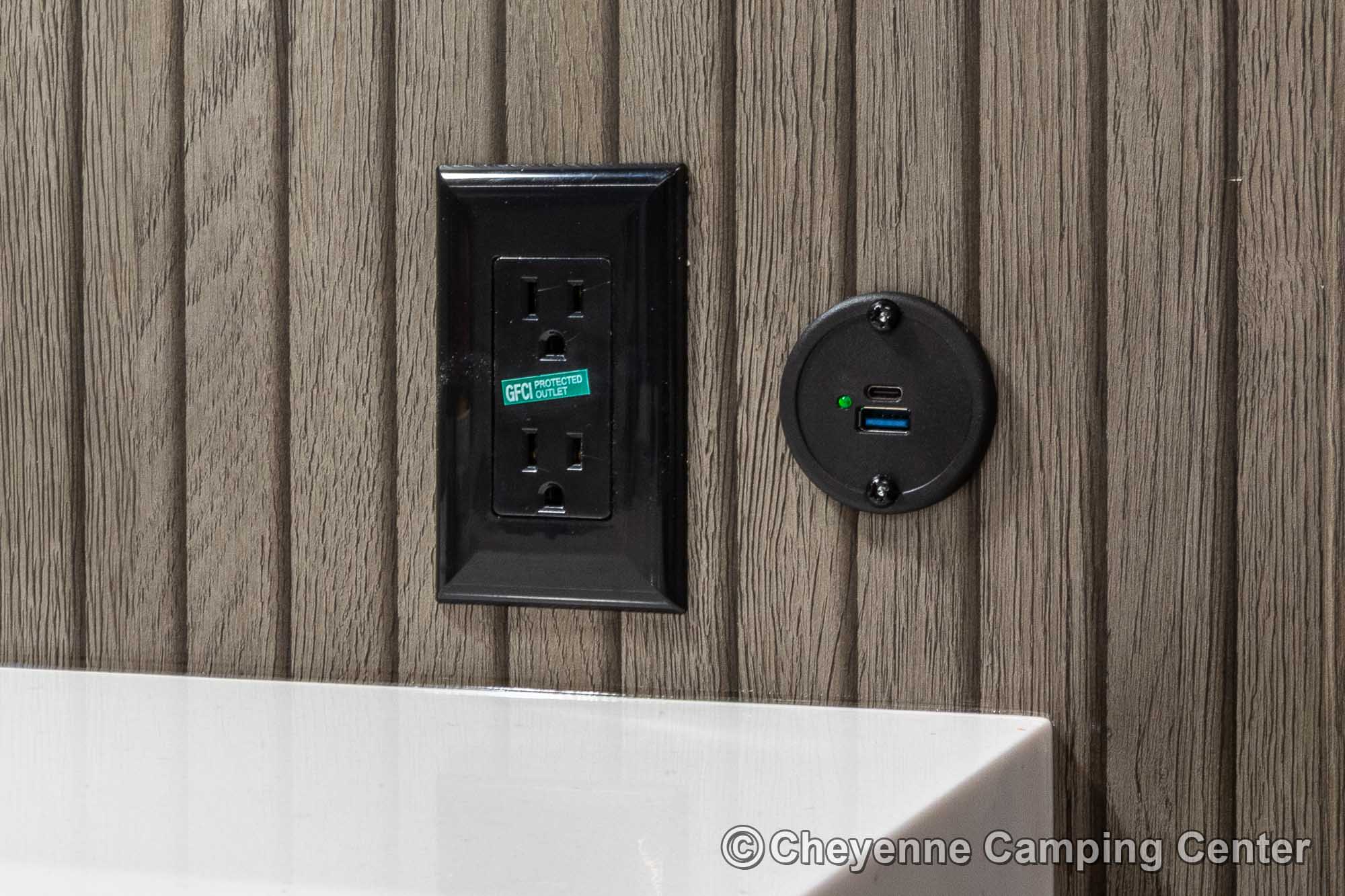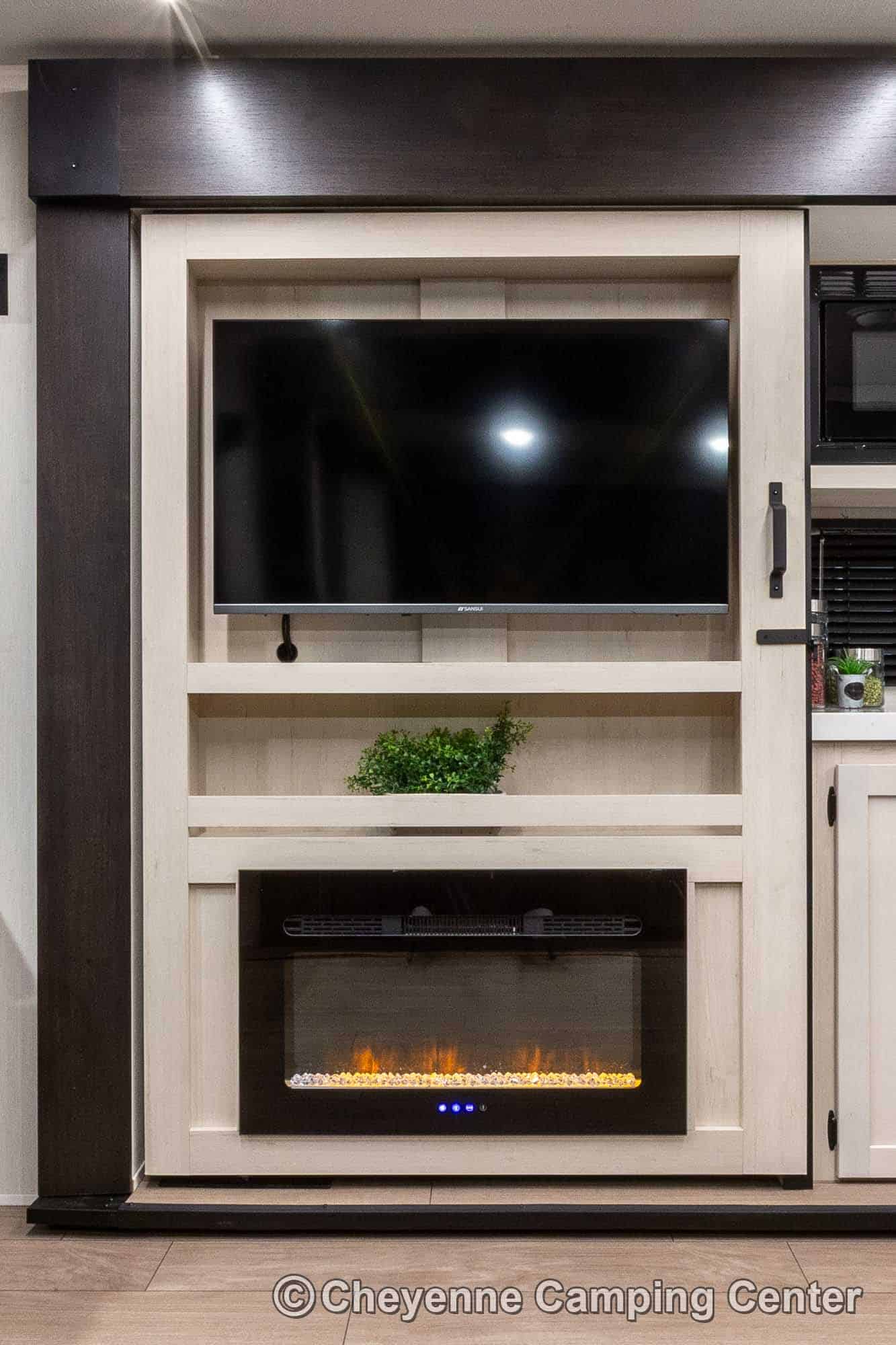 Outside, you’ll have a 100-watt solar panel, premium entry steps, a receiver accessory hitch, Leash Latch for pets, two power awning with LED lighting, premium wheels, a hot/cold shower, black tank flush, a nicely finished pass-thru storage compartment, power stabilizer jacks, a power tongue jack, and enclosed heated holding tanks for extended-season adventures.