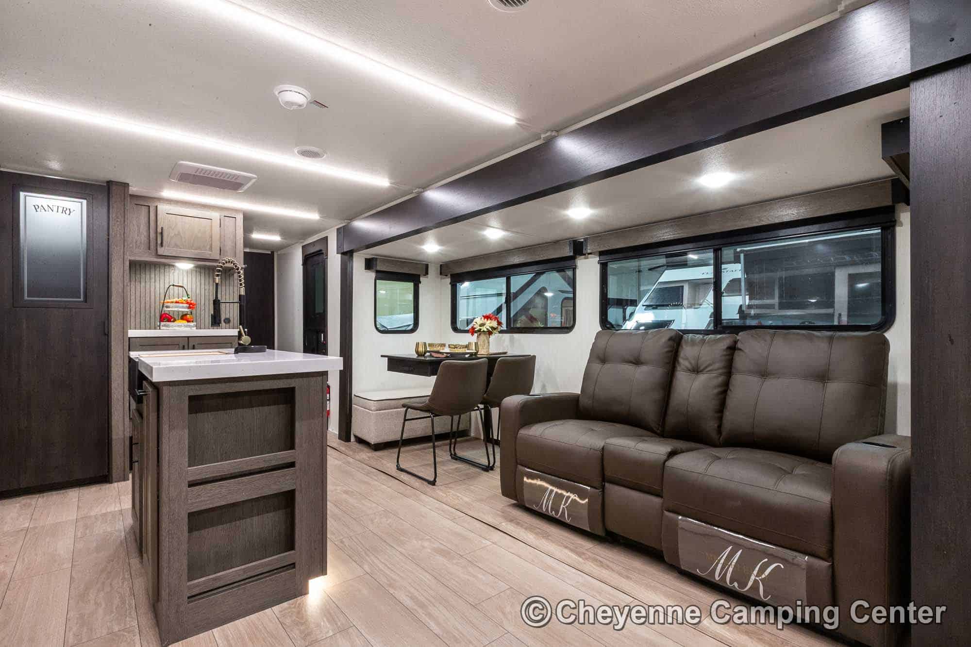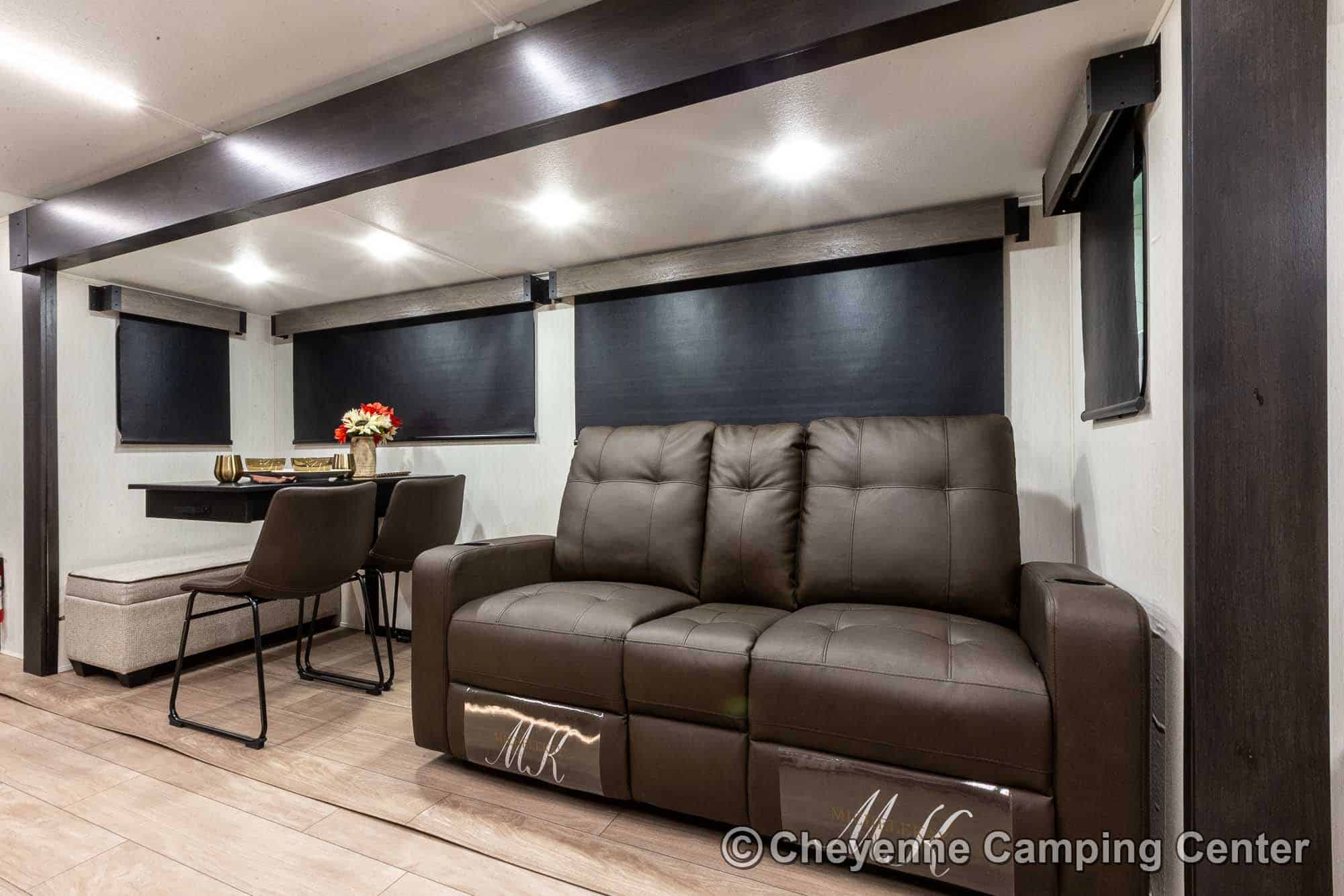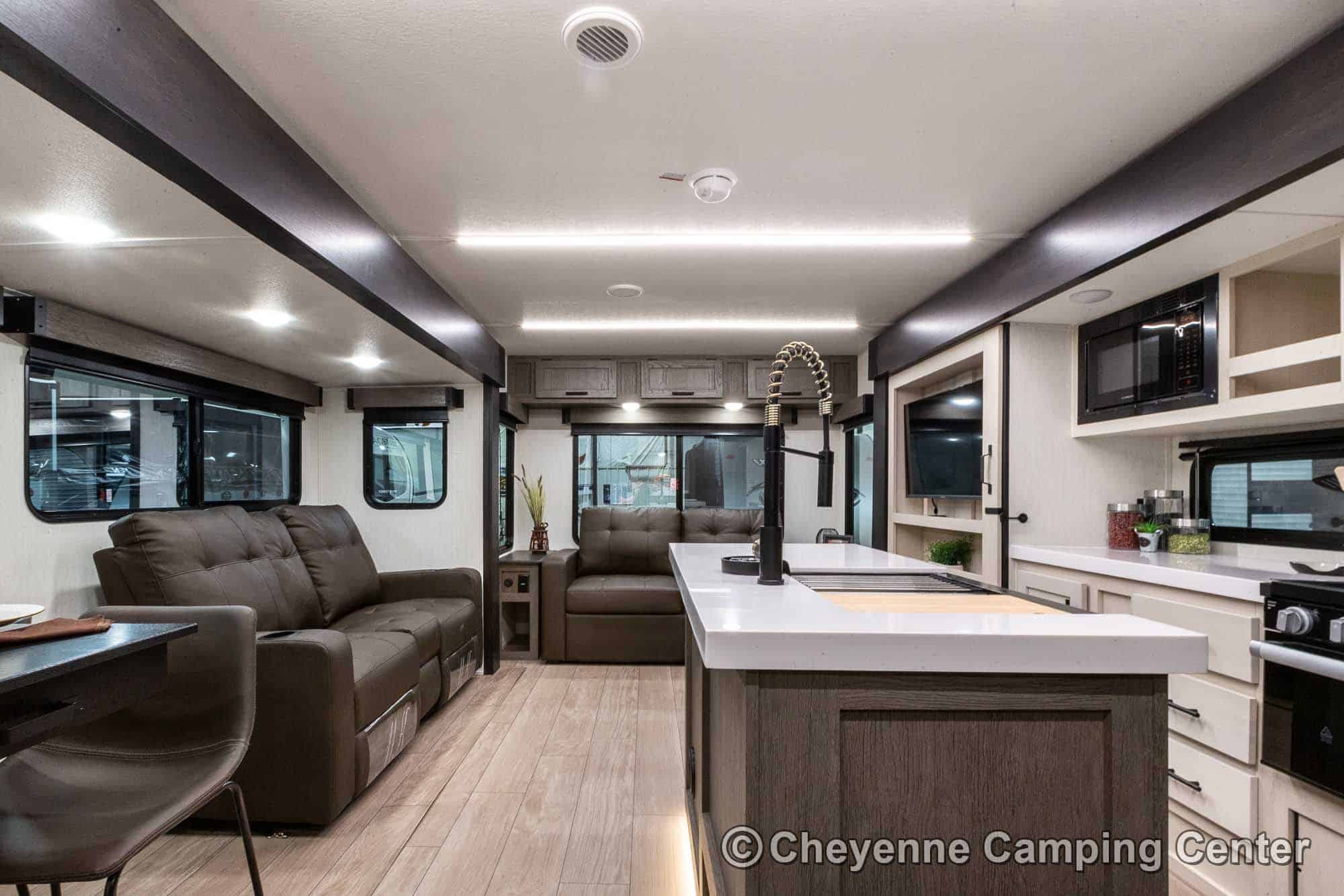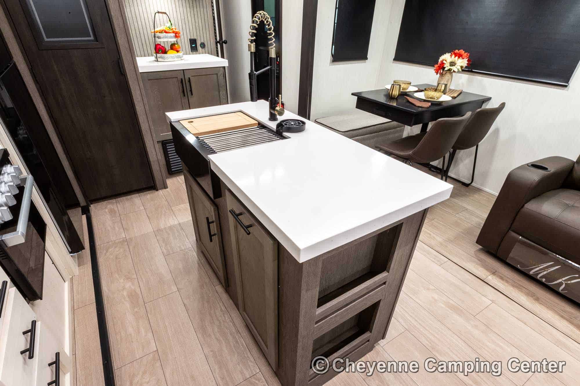Inside the Cherokee Alpha Wolf 26RL-L, the open floorplan and elegant finishes create a welcoming space. The living area offers cozy theater seating, a tri-fold sofa sleeper, and an entertainment center with a 39” HD TV, electric fireplace, and a hidden pantry/storage behind. The island kitchen is well-appointed with a 10 cu. ft. 12V refrigerator, a large workstation farm sink with a glass rinsing fixture, residential faucet, gas range and oven, microwave, solid surface countertops, pantry, and a dinette table with a storage drawer, 2 chairs, and bench.