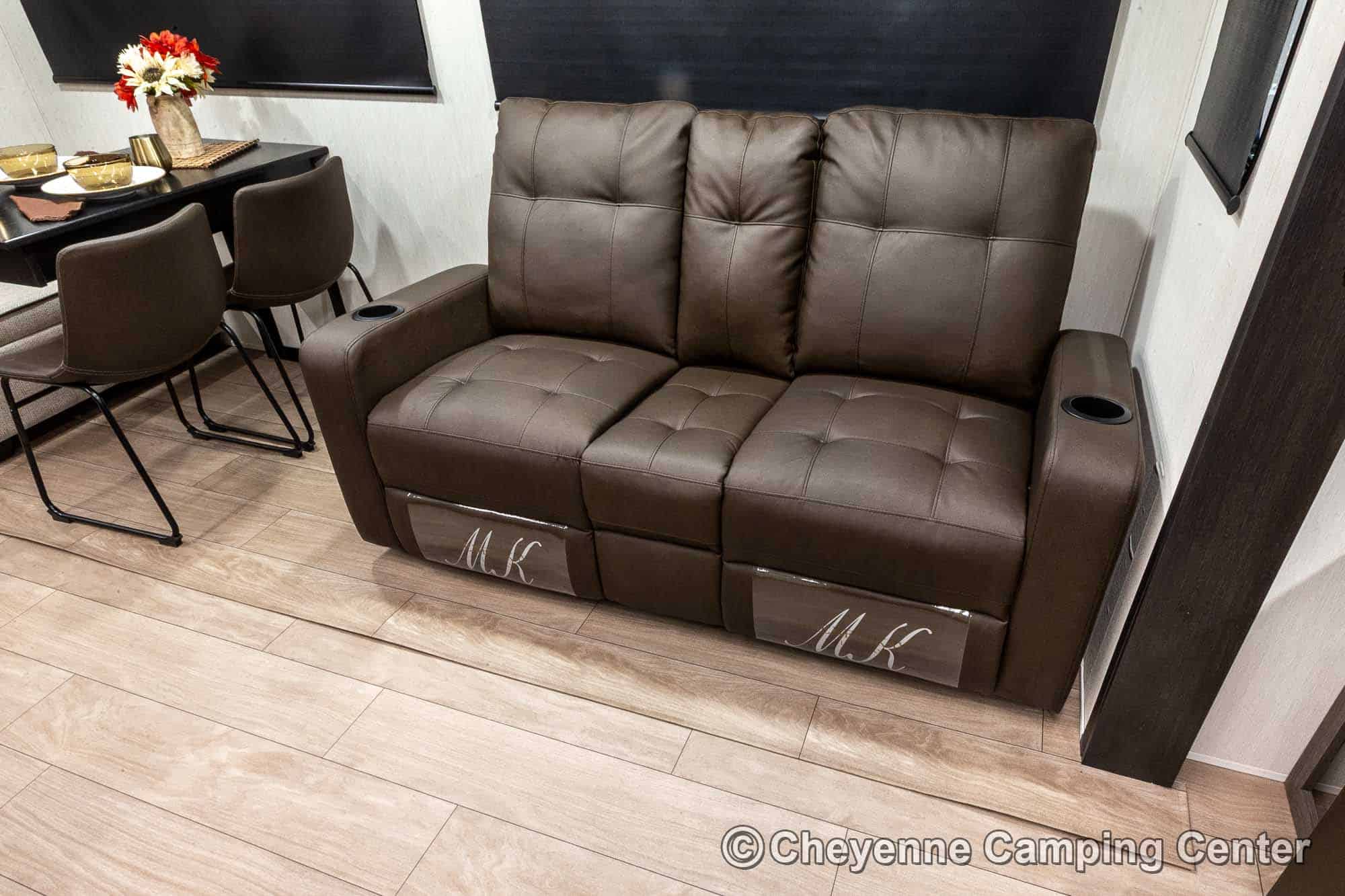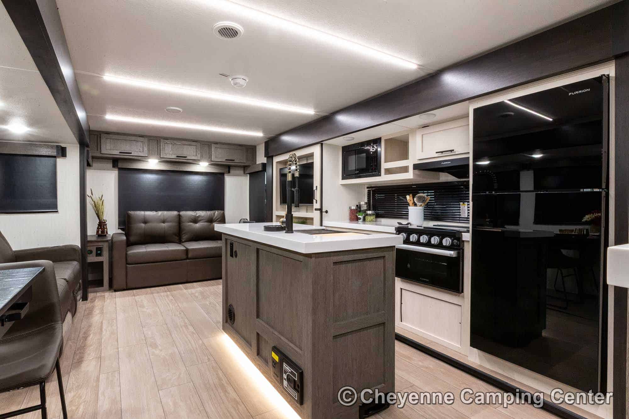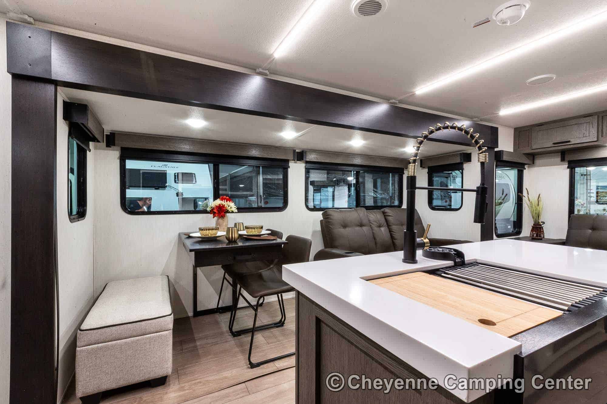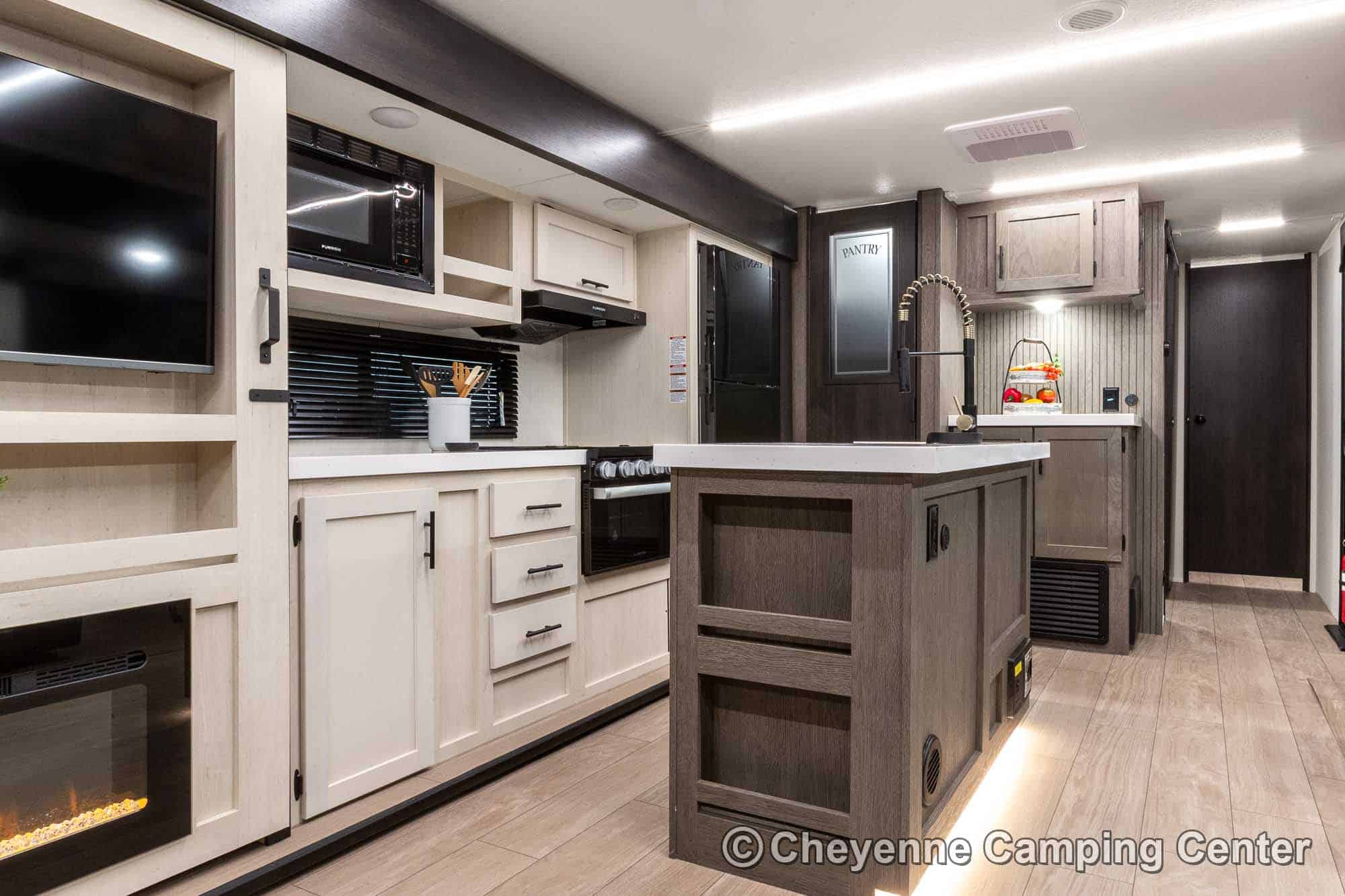 Inside the Cherokee Alpha Wolf 26RL-L, the open floorplan and elegant finishes create a welcoming space. The living area offers cozy theater seating, a tri-fold sofa sleeper, and an entertainment center with a 39” HD TV, electric fireplace, and a hidden pantry/storage behind. The island kitchen is well-appointed with a 10 cu. ft. 12V refrigerator, a large workstation farm sink with a glass rinsing fixture, residential faucet, gas range and oven, microwave, solid surface countertops, pantry, and a dinette table with a storage drawer, 2 chairs, and bench.