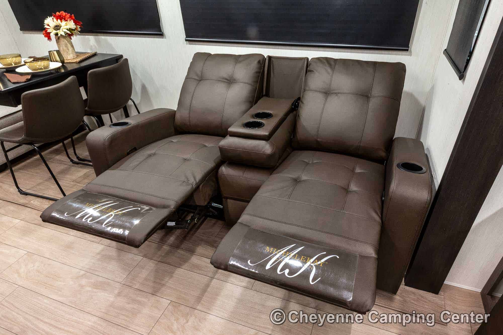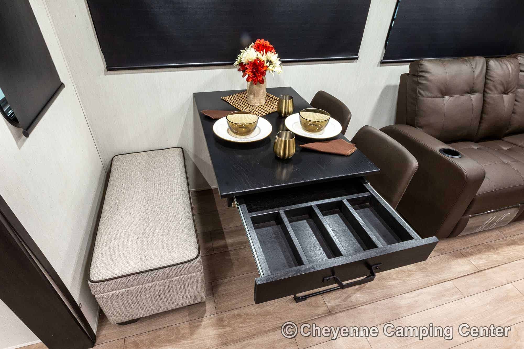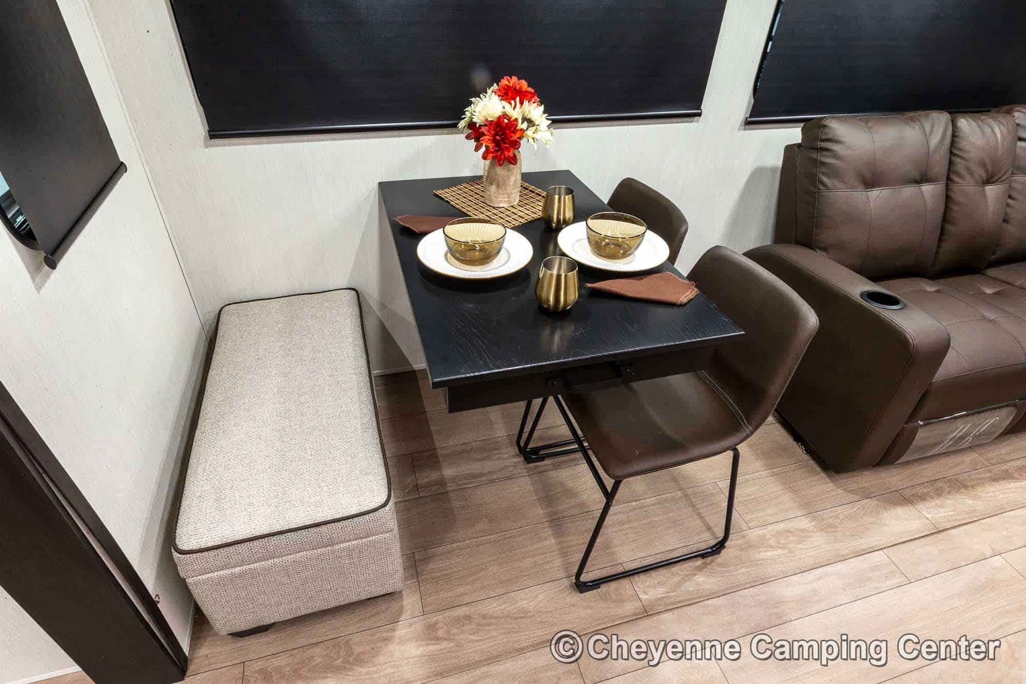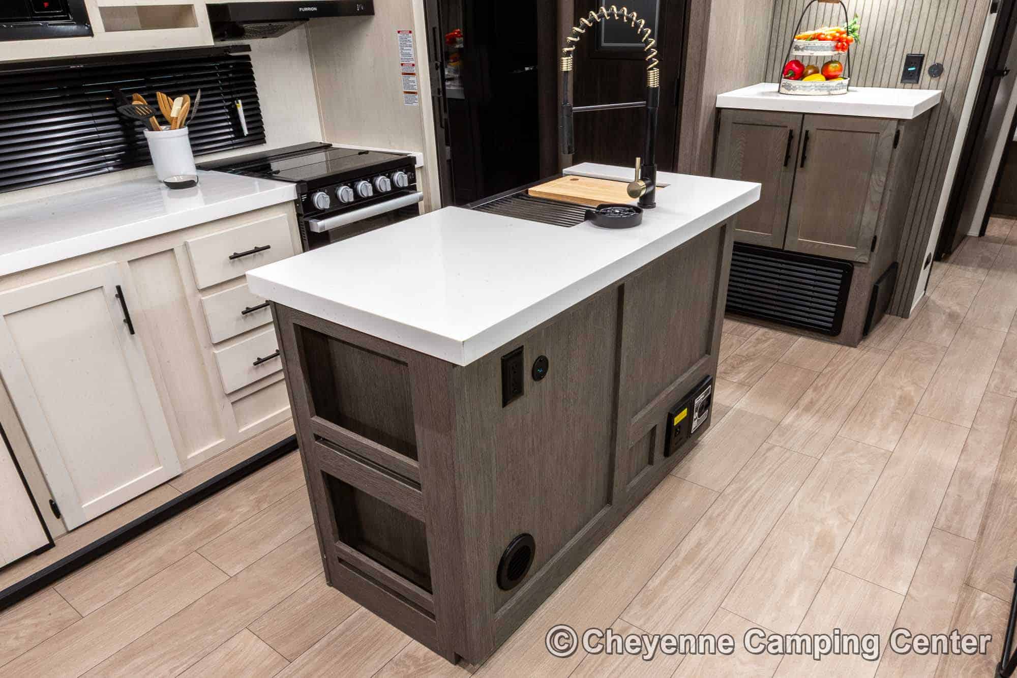 Inside the Cherokee Alpha Wolf 26RL-L, the open floorplan and elegant finishes create a welcoming space. The living area offers cozy theater seating, a tri-fold sofa sleeper, and an entertainment center with a 39” HD TV, electric fireplace, and a hidden pantry/storage behind. The island kitchen is well-appointed with a 10 cu. ft. 12V refrigerator, a large workstation farm sink with a glass rinsing fixture, residential faucet, gas range and oven, microwave, solid surface countertops, pantry, and a dinette table with a storage drawer, 2 chairs, and bench.