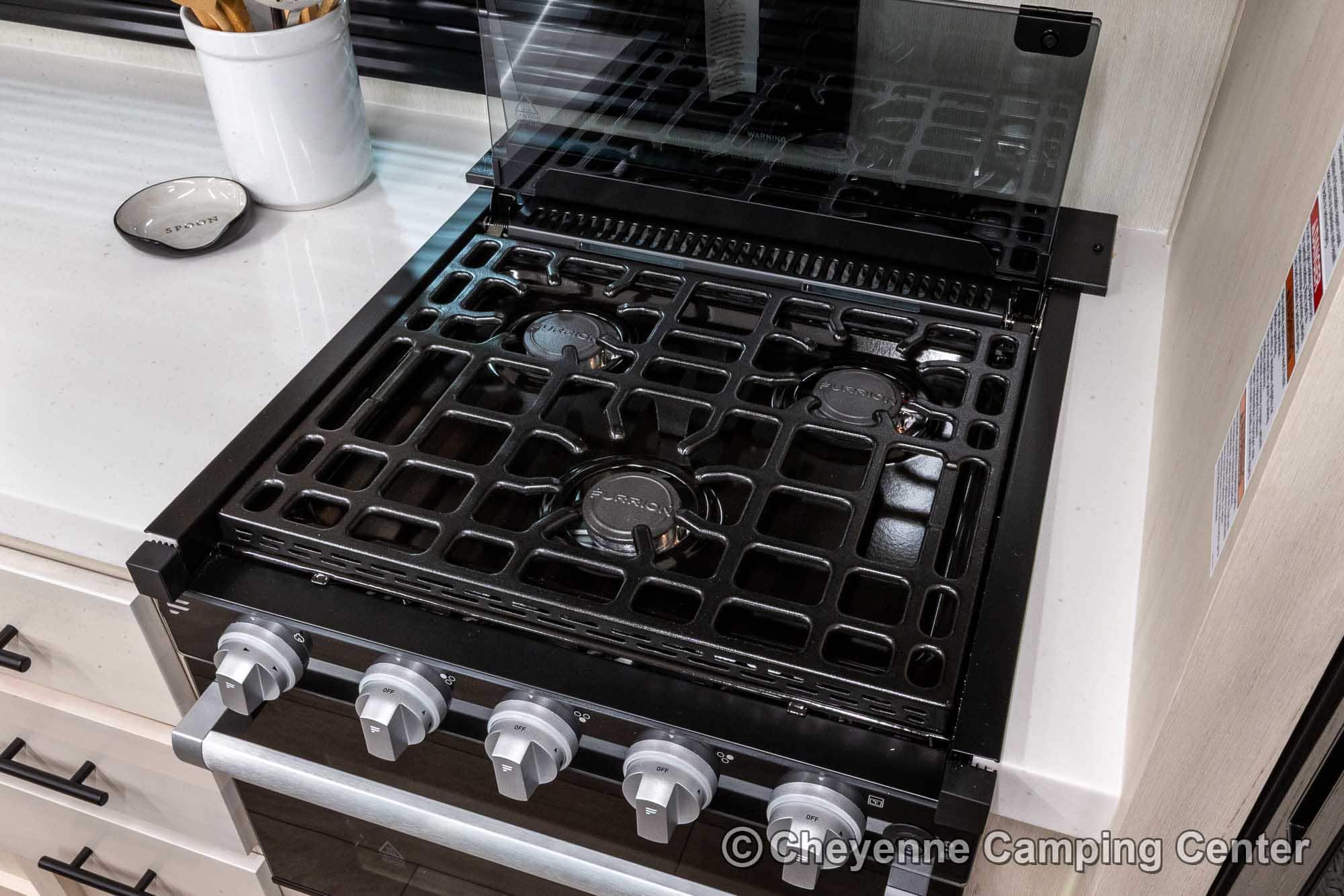 - Large Range w/ Steel Grated 3-Burner Cooktop and Glass Cover