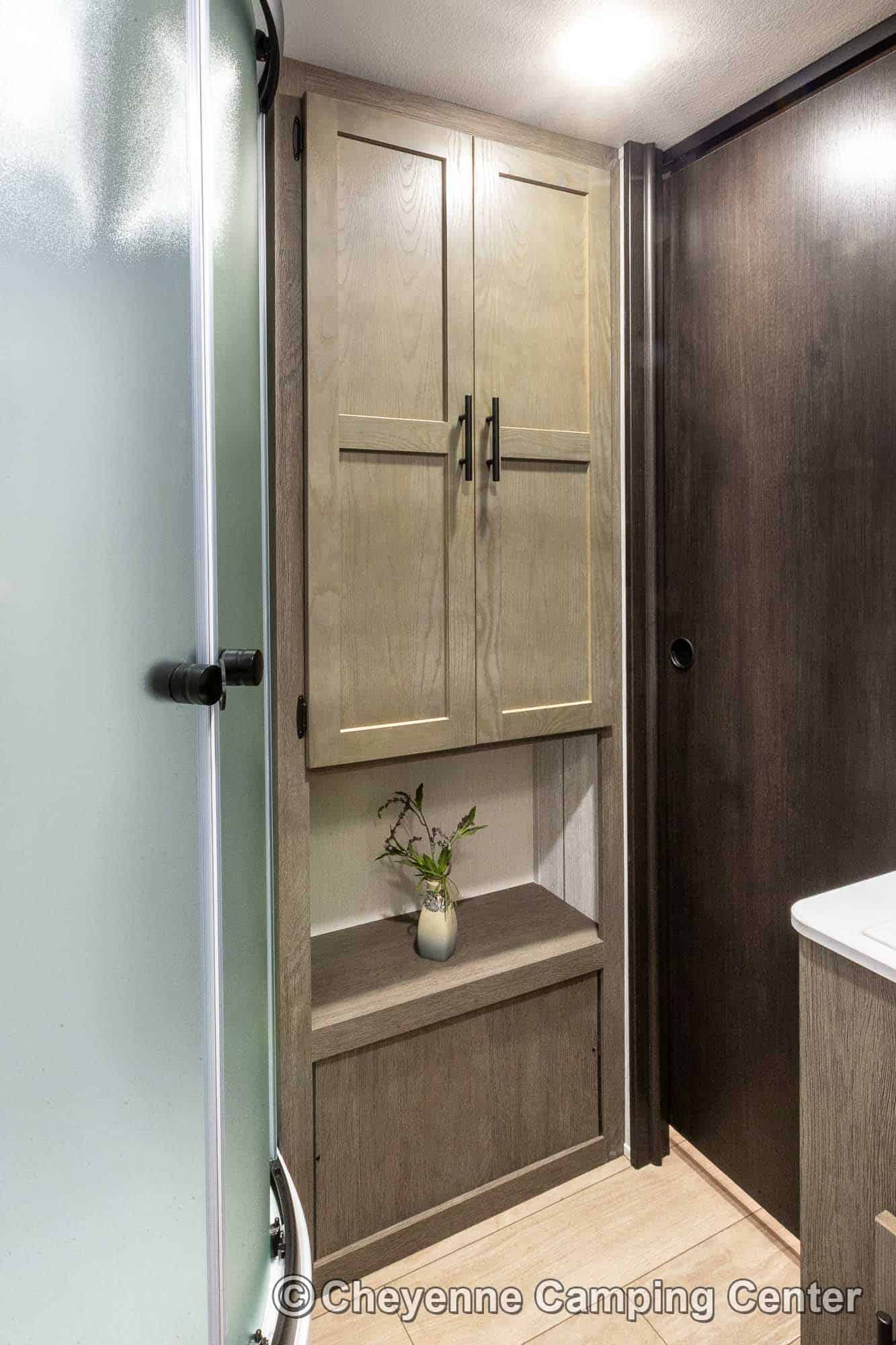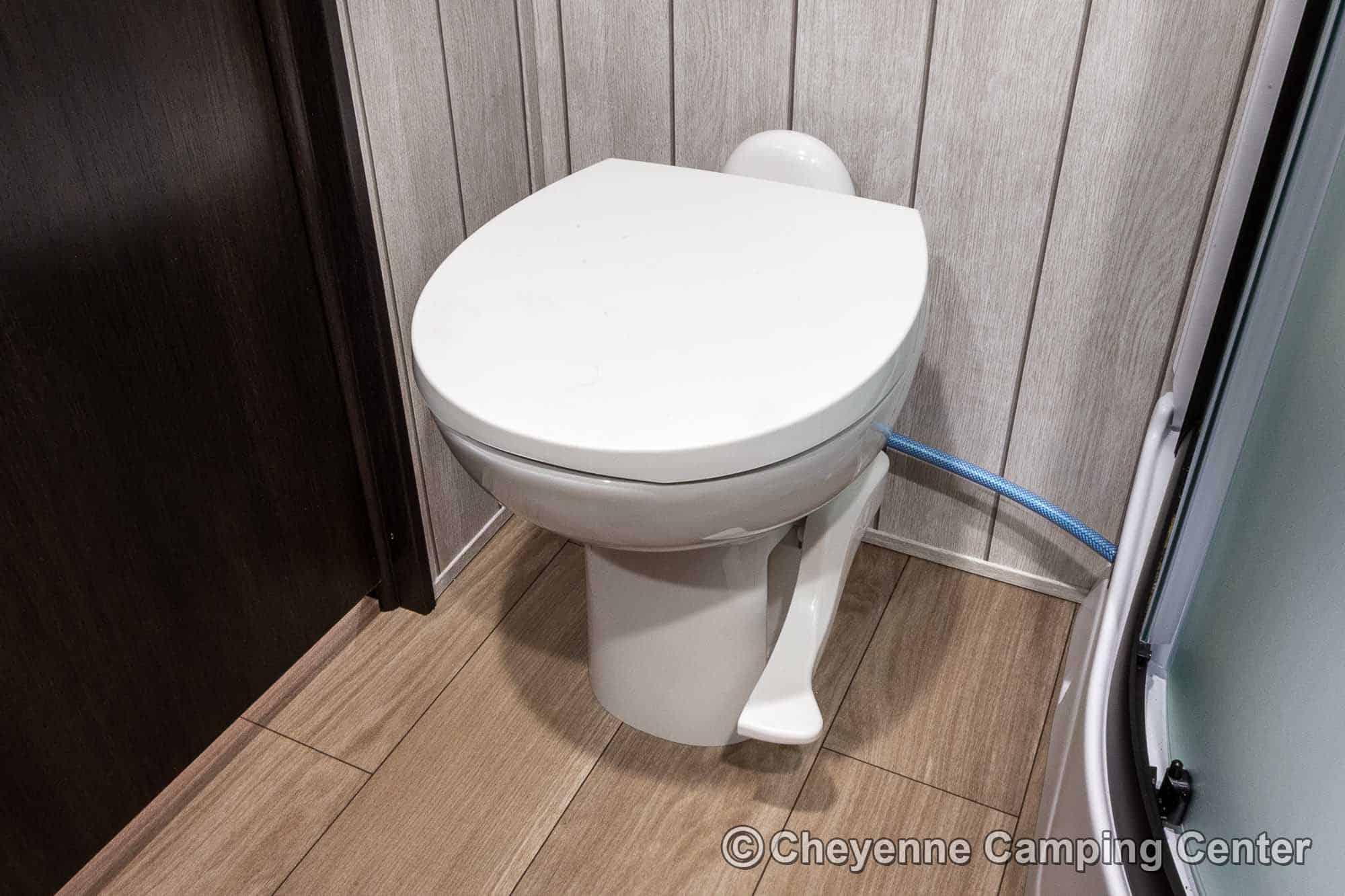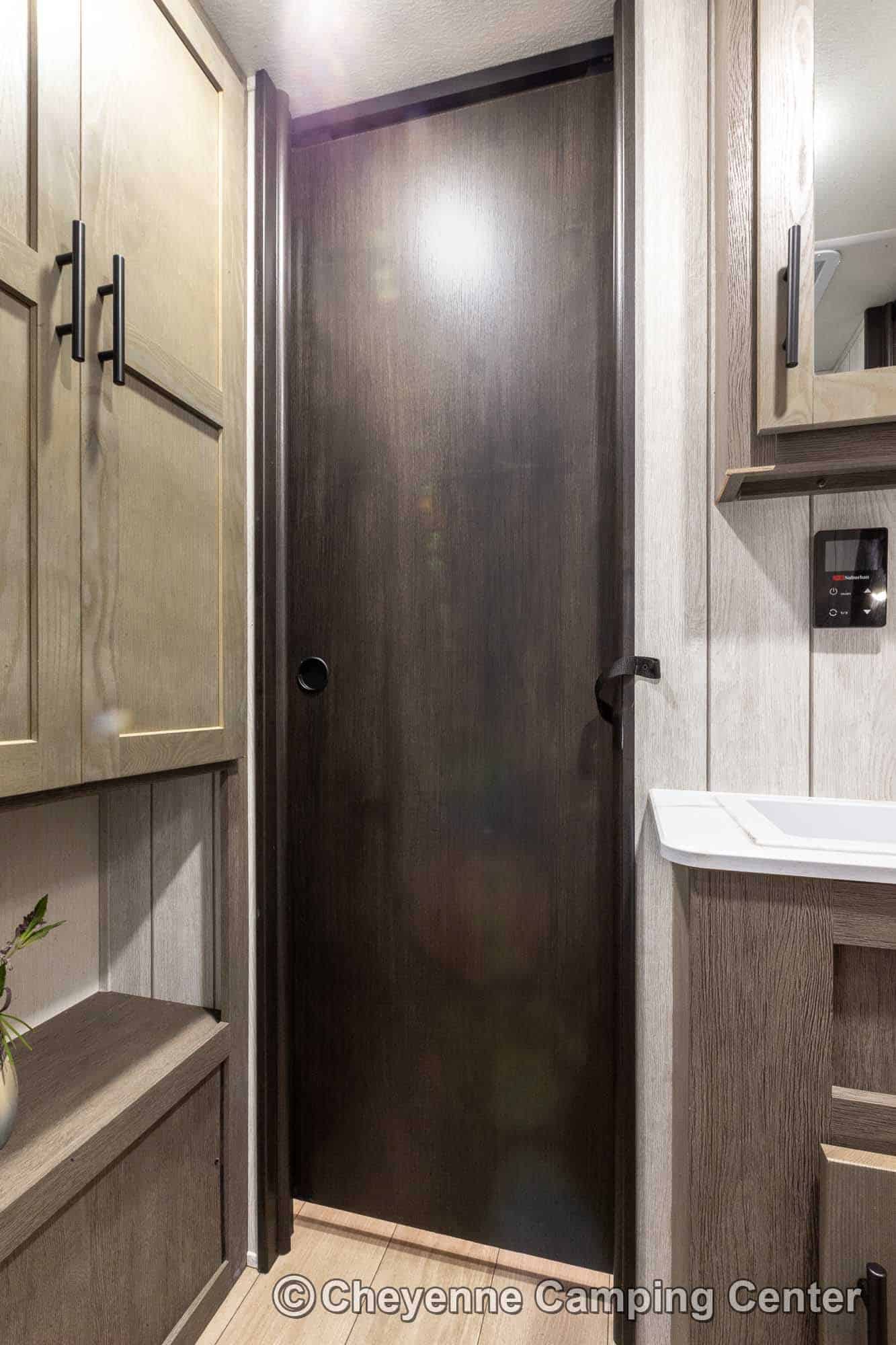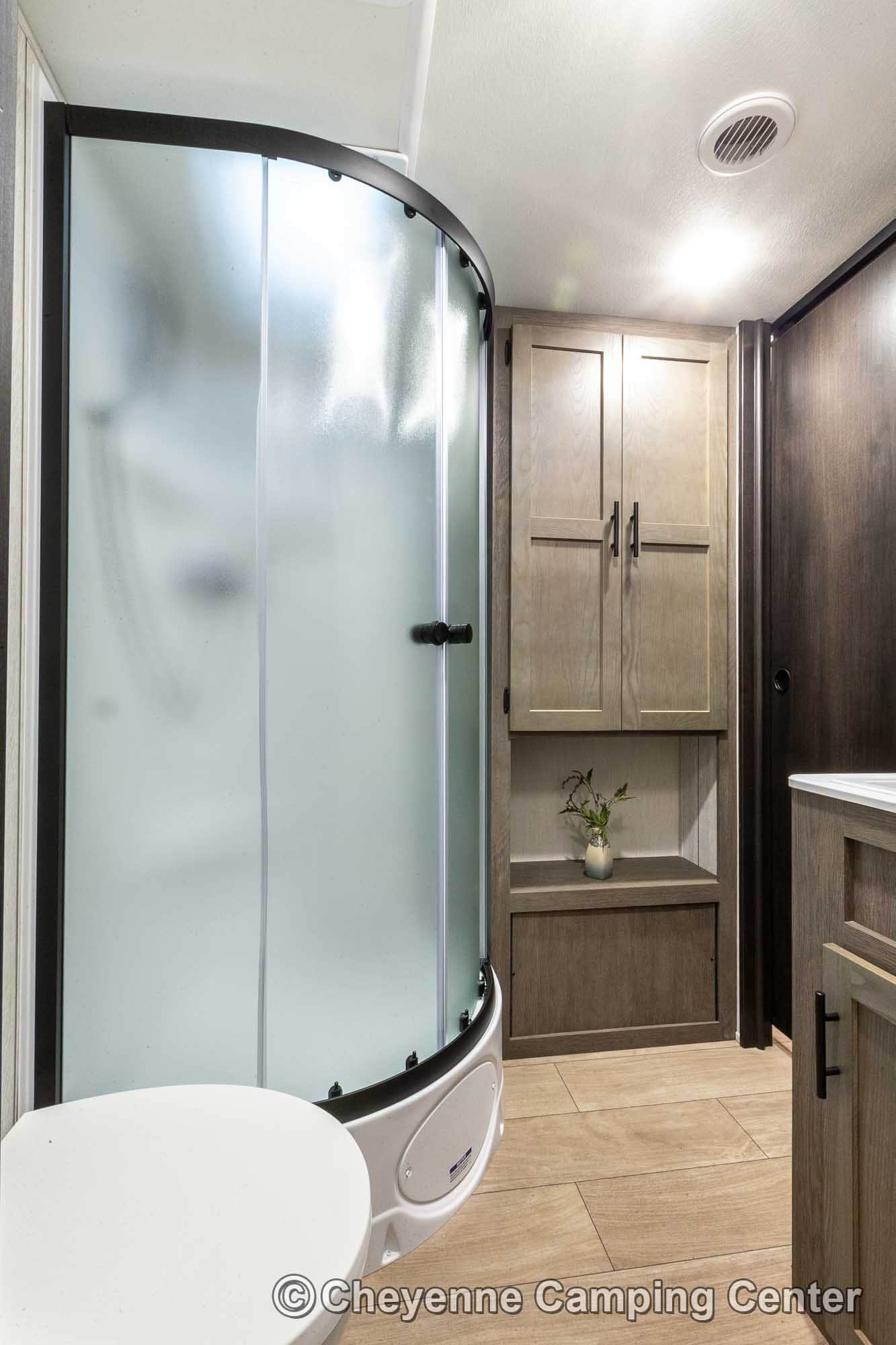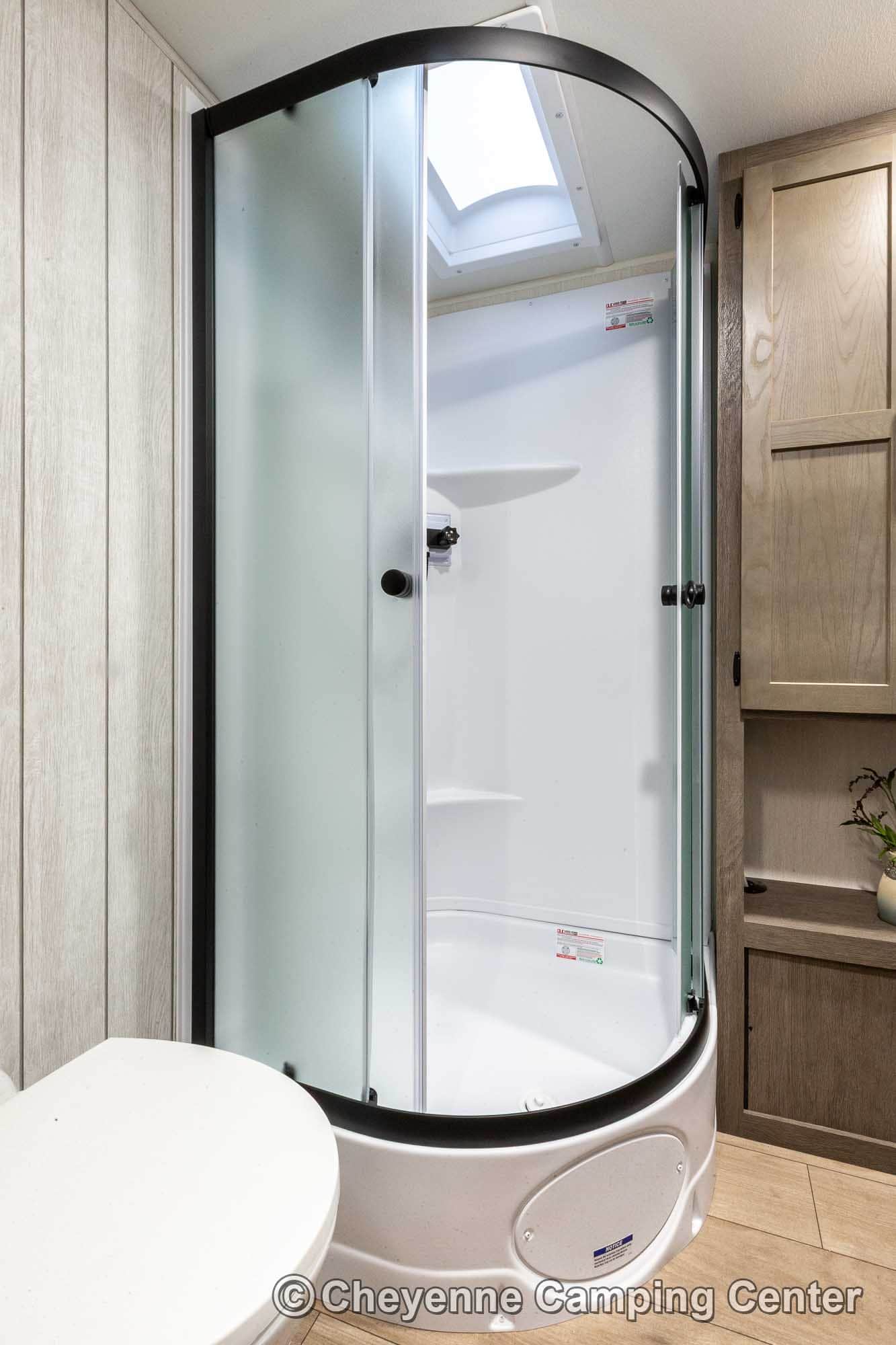 The bathroom offers a spacious glass-enclosed shower with a skylight, a vanity, linen closet, storage cabinets, a porcelain foot-flush toilet, and a premium vent fan. The private front bedroom features a 60” x 80” queen bed, wardrobes, overhead cabinets, under-bed storage, a laundry chute, USB charging ports, and TV hookups.