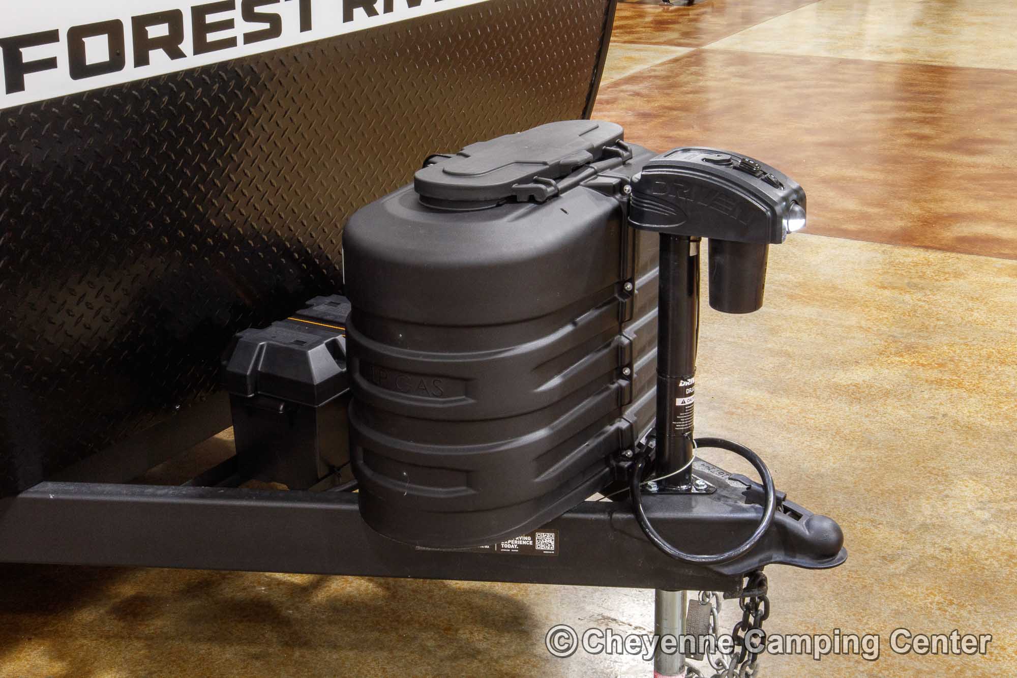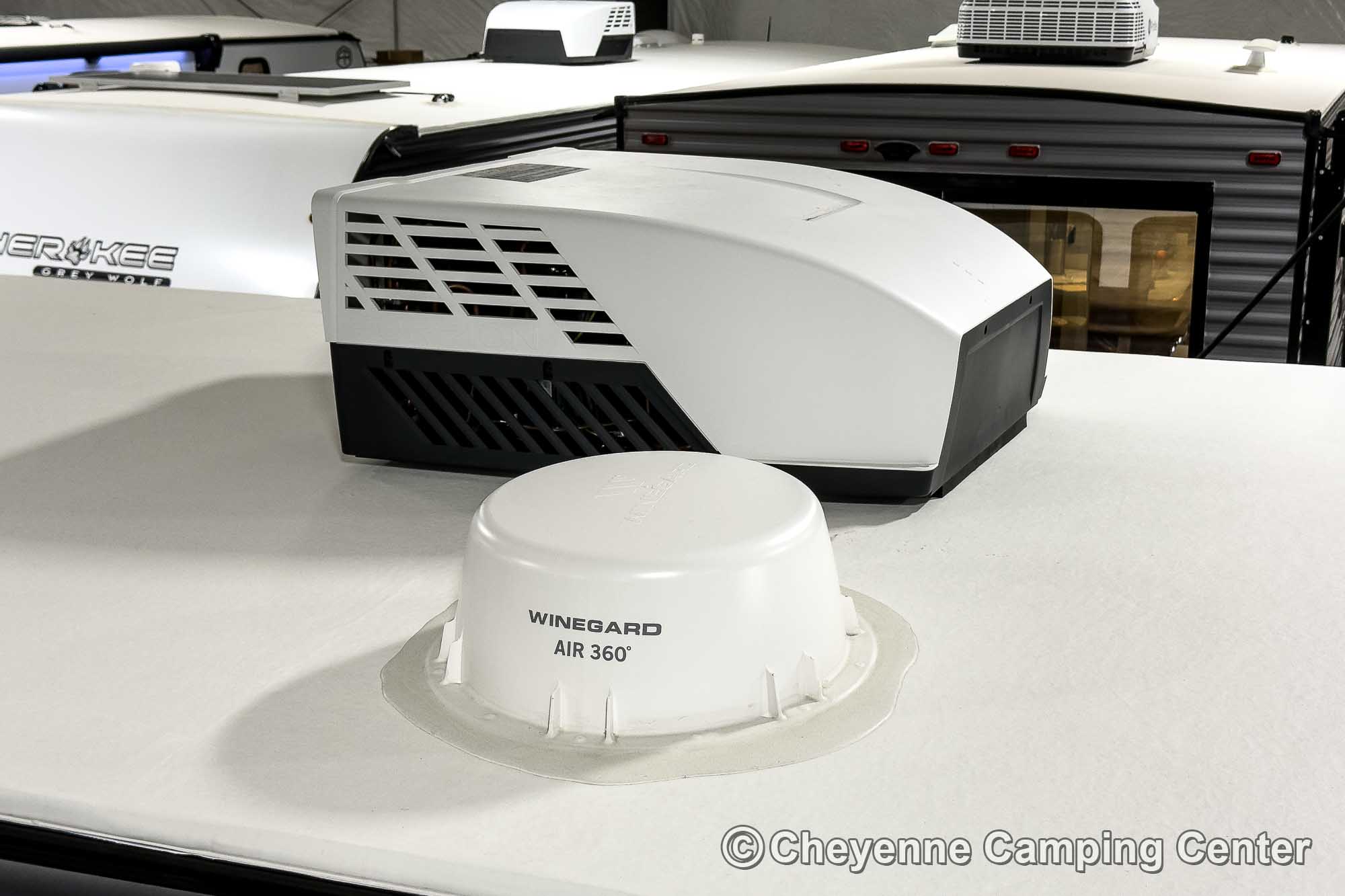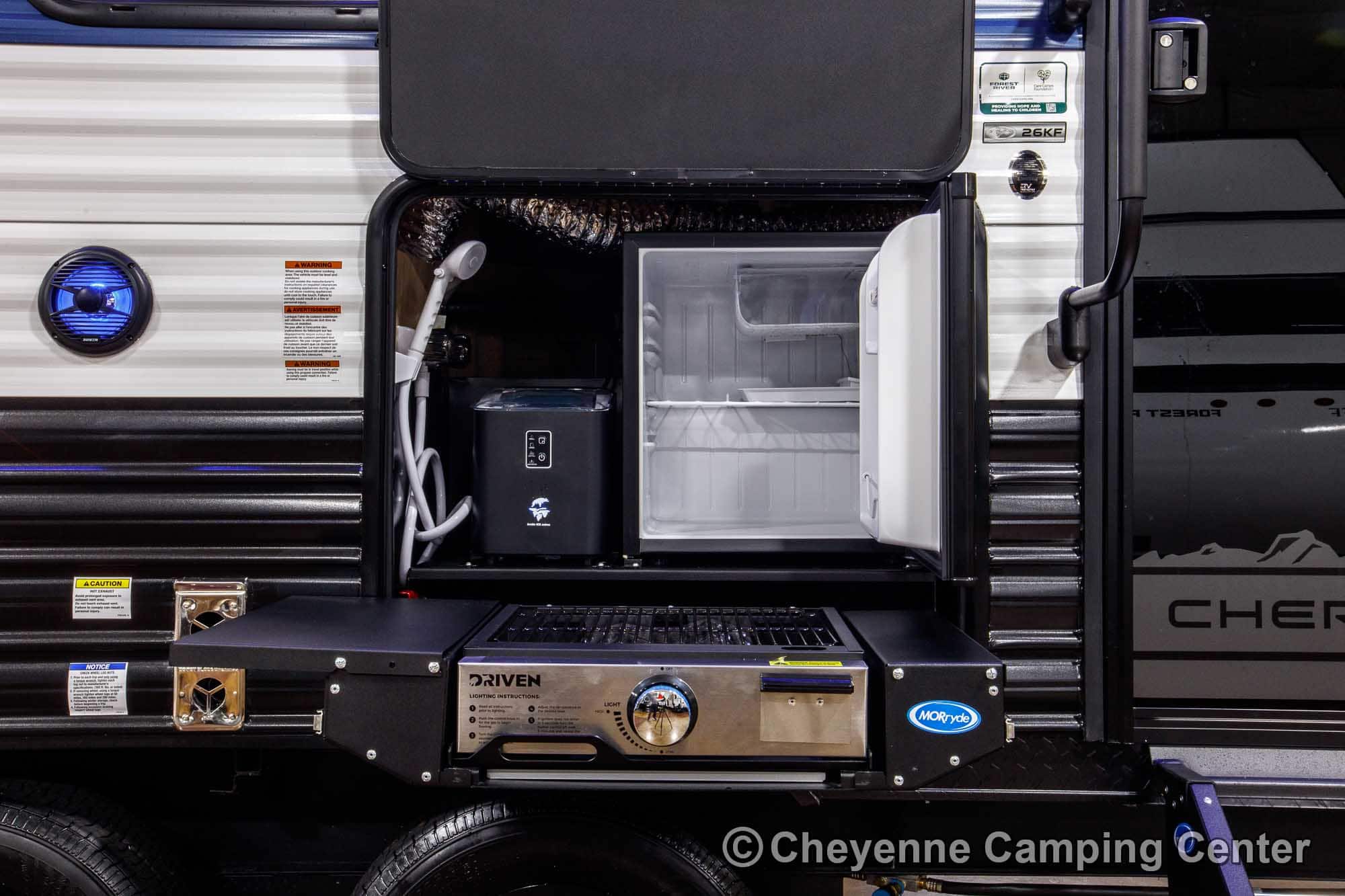 The Grey Wolf 26KF is perfect for outdoor living. It features a convenient mini kitchen complete with a refrigerator, grill/griddle, ice maker, and water hookup. Two entry doors offer easy access, while the 15’ power awning with LED lighting creates the perfect space to relax in the shade. You’ll also find a 200-watt solar panel, MorRyde premium entry step at the main entry, a Leash Latch for pets, premium wheels, an exterior hot/cold shower, a black tank flush, power stabilizer jacks, a power tongue jack, marine-grade speakers, a flip-down rear cargo rack, battery disconnect, filled LP tanks, a 12V deep cycle battery, a spacious front drop-frame pass-thru storage compartment, and another storage compartment at the rear. For extended season comfort, the 26KF includes an LP gas furnace, a 15,000 BTU ducted air conditioner, and enclosed holding tanks with heat pads.