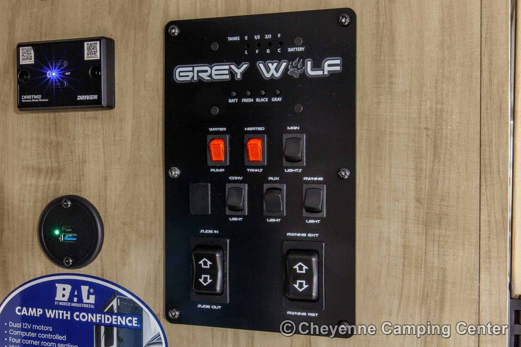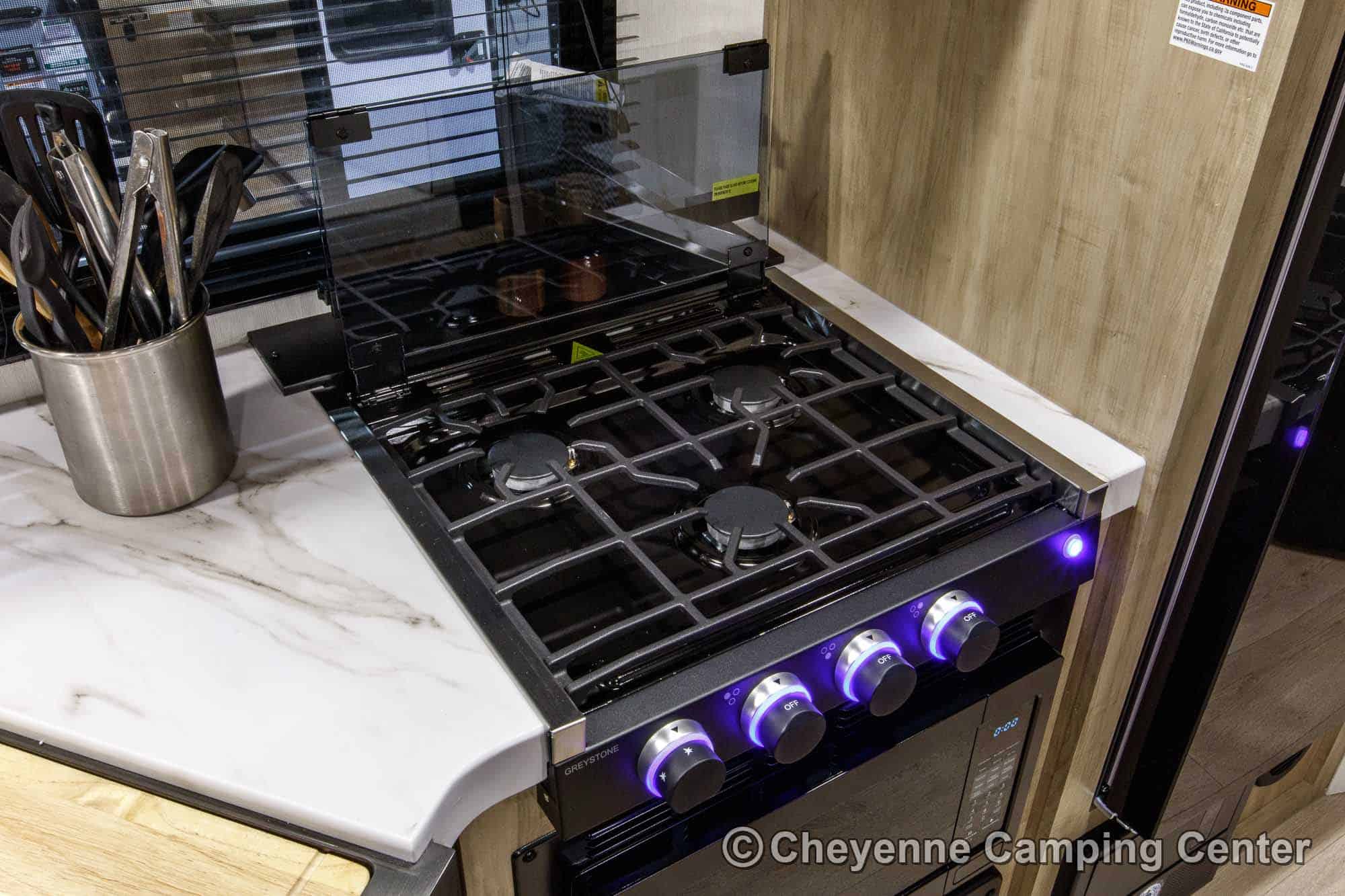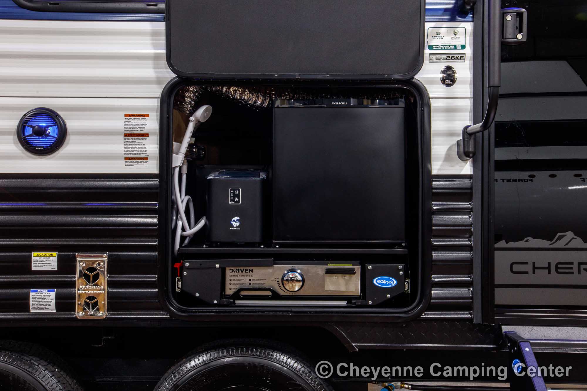 The Grey Wolf 26KF is perfect for outdoor living. It features a convenient mini kitchen complete with a refrigerator, grill/griddle, ice maker, and water hookup. Two entry doors offer easy access, while the 15’ power awning with LED lighting creates the perfect space to relax in the shade. You’ll also find a 200-watt solar panel, MorRyde premium entry step at the main entry, a Leash Latch for pets, premium wheels, an exterior hot/cold shower, a black tank flush, power stabilizer jacks, a power tongue jack, marine-grade speakers, a flip-down rear cargo rack, battery disconnect, filled LP tanks, a 12V deep cycle battery, a spacious front drop-frame pass-thru storage compartment, and another storage compartment at the rear. For extended season comfort, the 26KF includes an LP gas furnace, a 15,000 BTU ducted air conditioner, and enclosed holding tanks with heat pads.