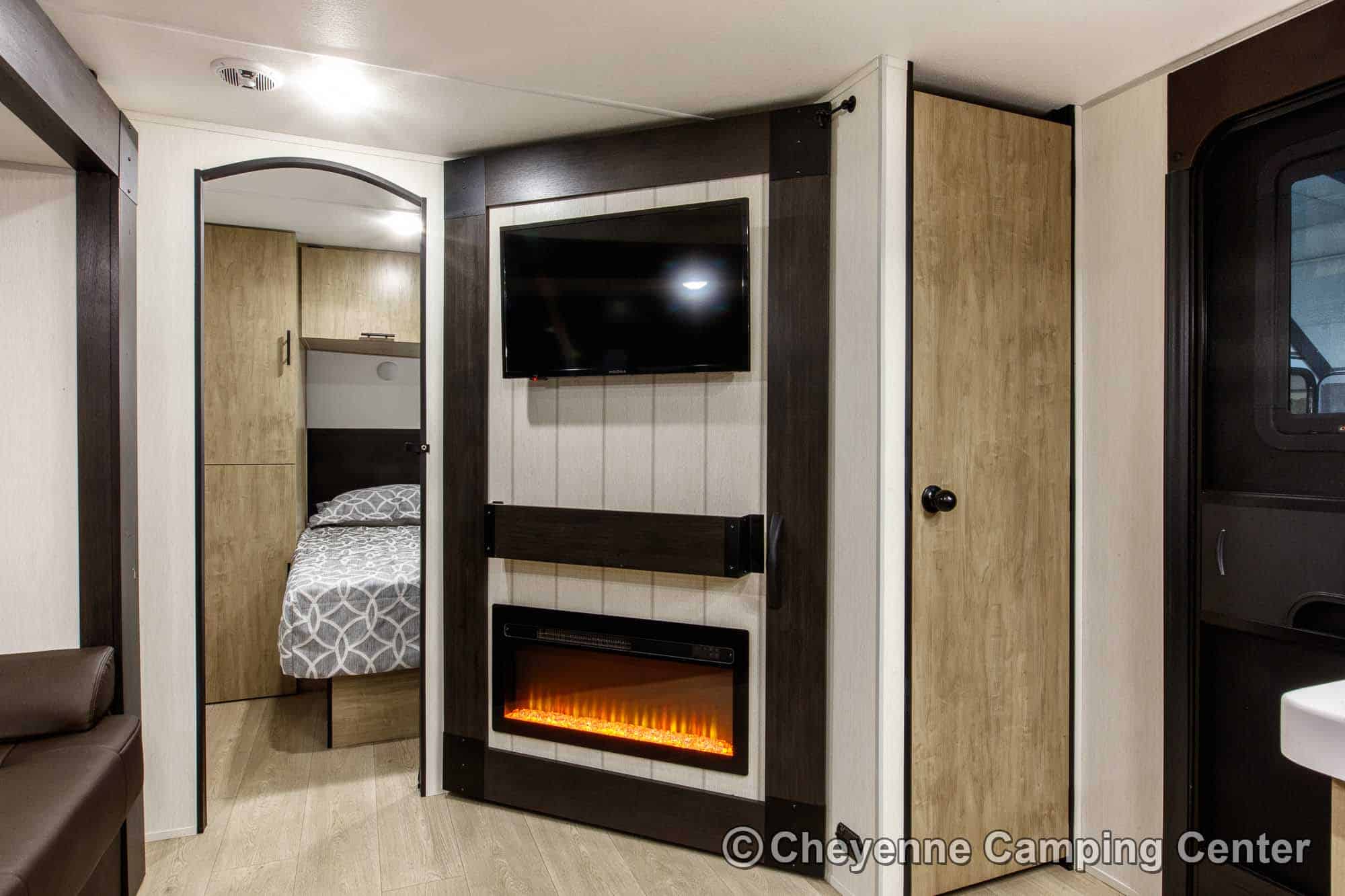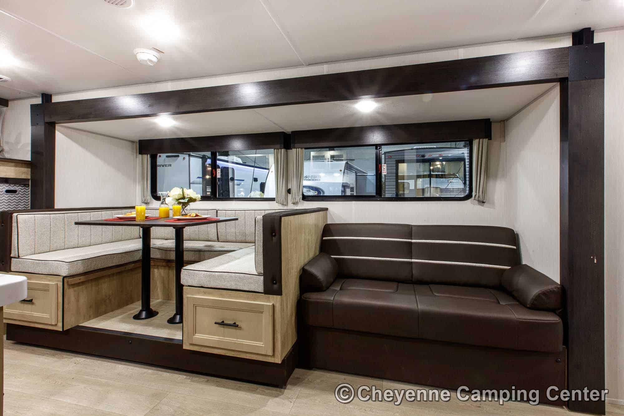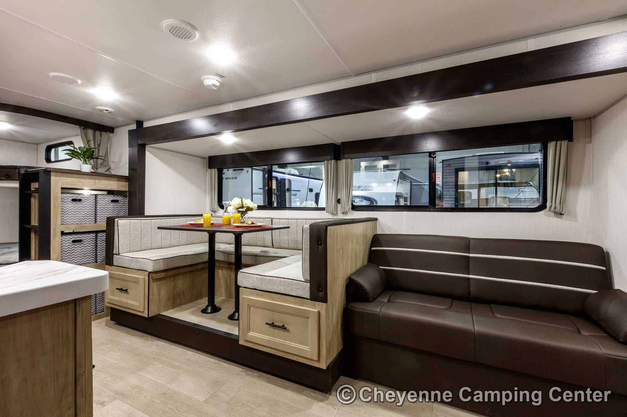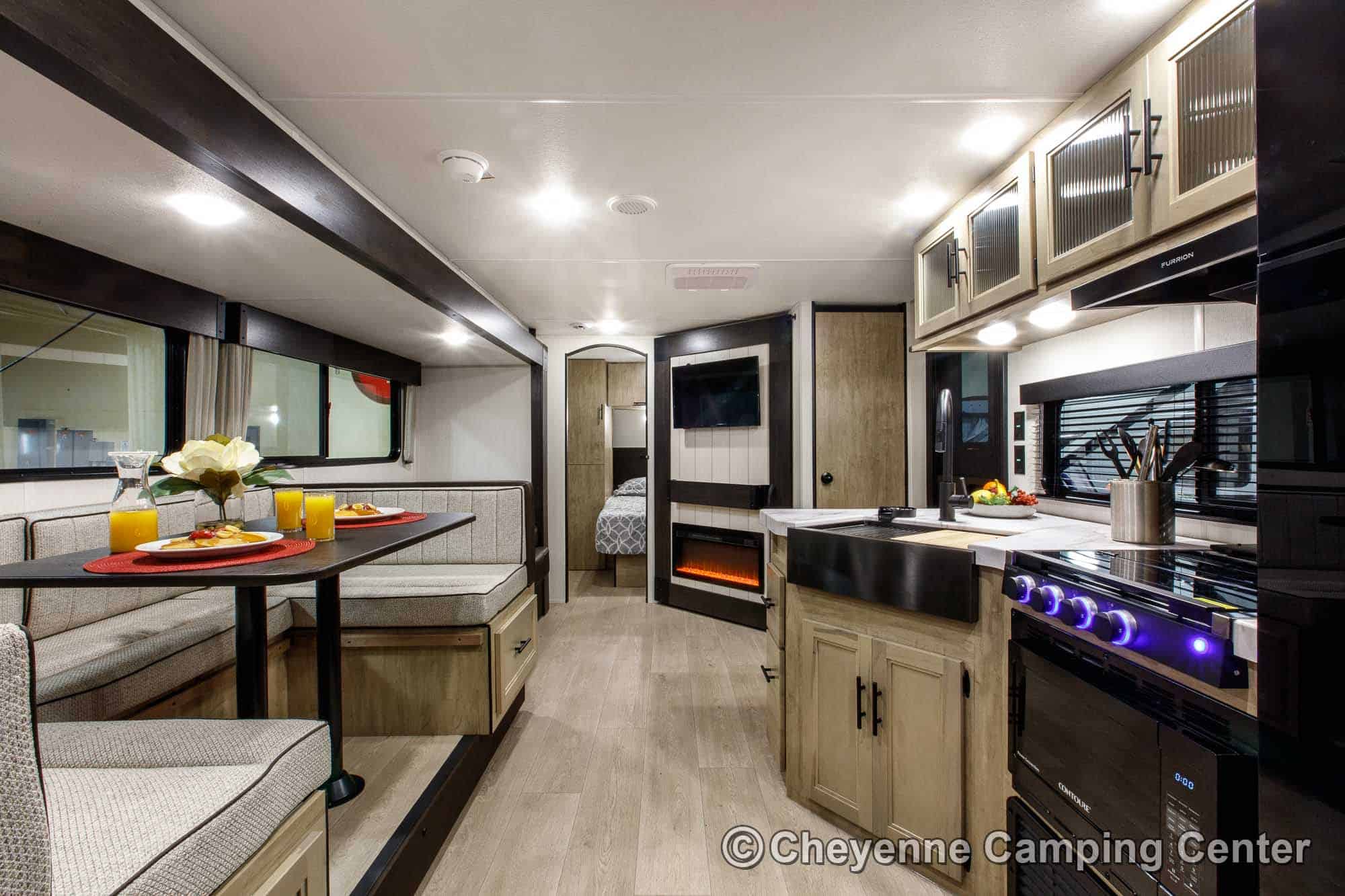 Inside, the Cherokee Grey Wolf 26KF provides versatile sleeping arrangements with rear double-over-double bunks, a jackknife sofa, a large U-shaped dinette, and a front RV king bed. The living area includes panoramic windows for a great view and added light, a 32” HD TV, a Bluetooth media receiver, and a cozy electric fireplace, making it a great space to relax after a day of adventure.