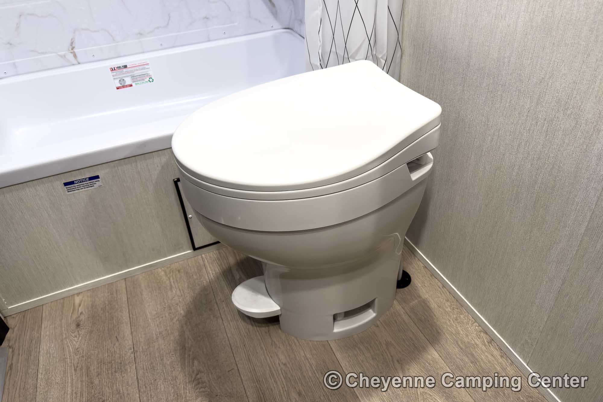 The rear bathroom features a hybrid tub/shower with skylight, a vanity with storage, a foot-flush toilet, a premium vent fan, and a second entry door for convenient access from outside.