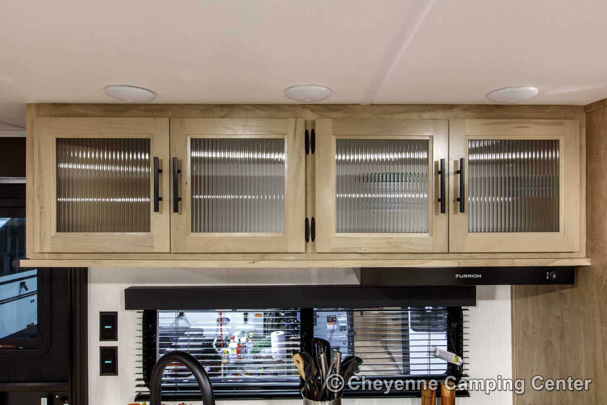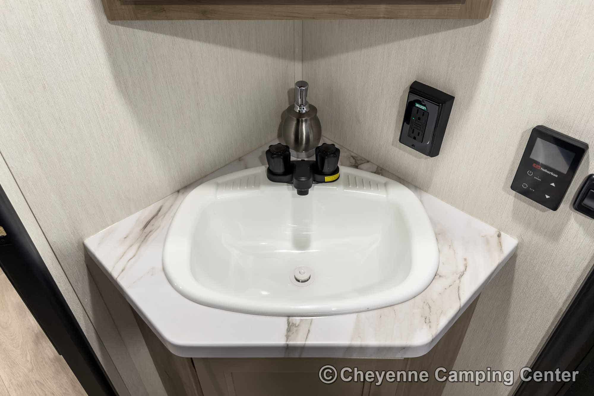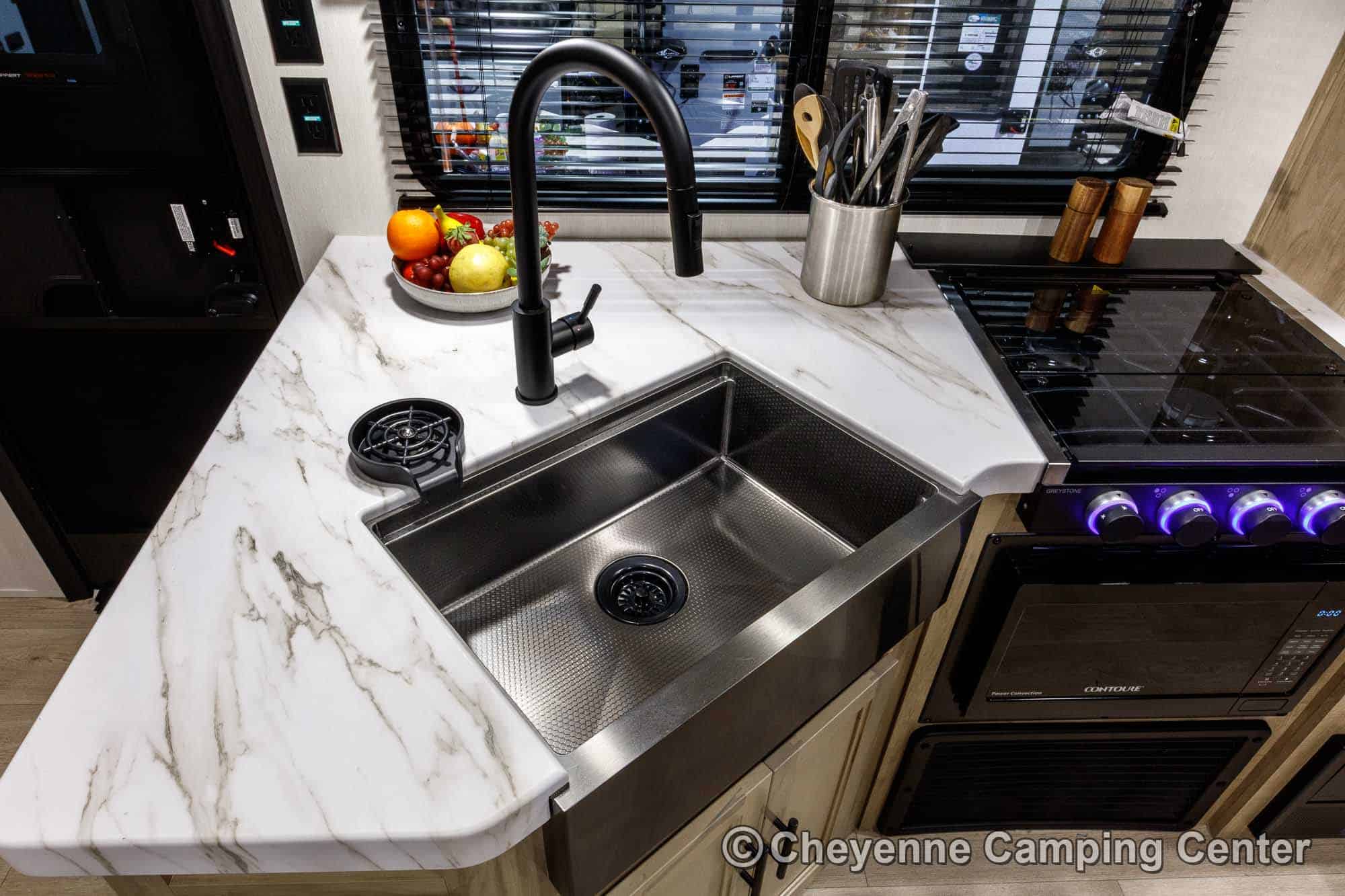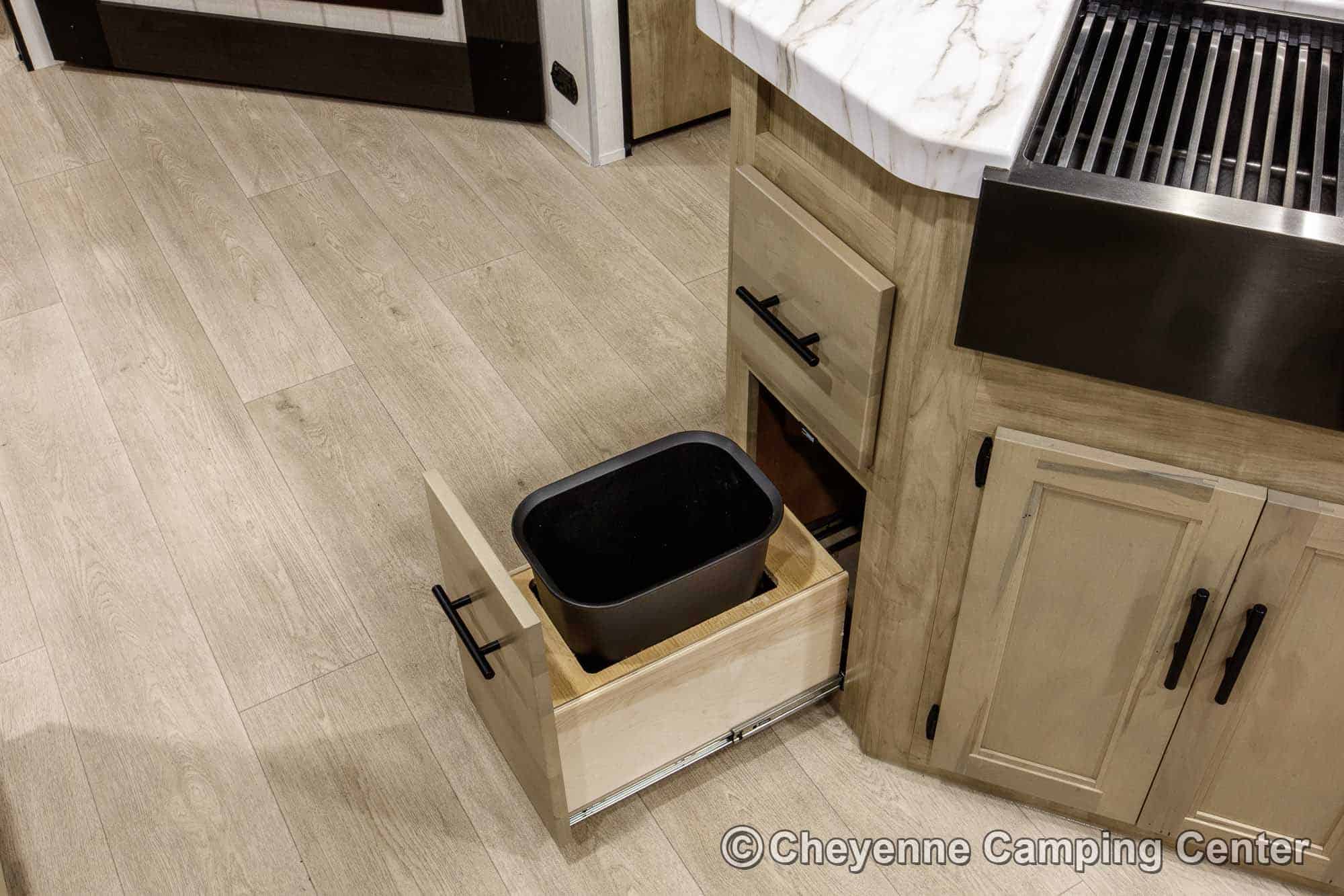 The kitchen is well-equipped with a 10 cu. ft. 12V refrigerator, large undermount workstation sink, residential-style faucet with a glass rinsing fixture, a gas cooktop, a microwave/convection oven with built-in air fryer, and seamless countertops. A generous pantry offers plenty of space for food and supplies. You’ll also have a hidden pantry behind the entertainment center for added storage!
