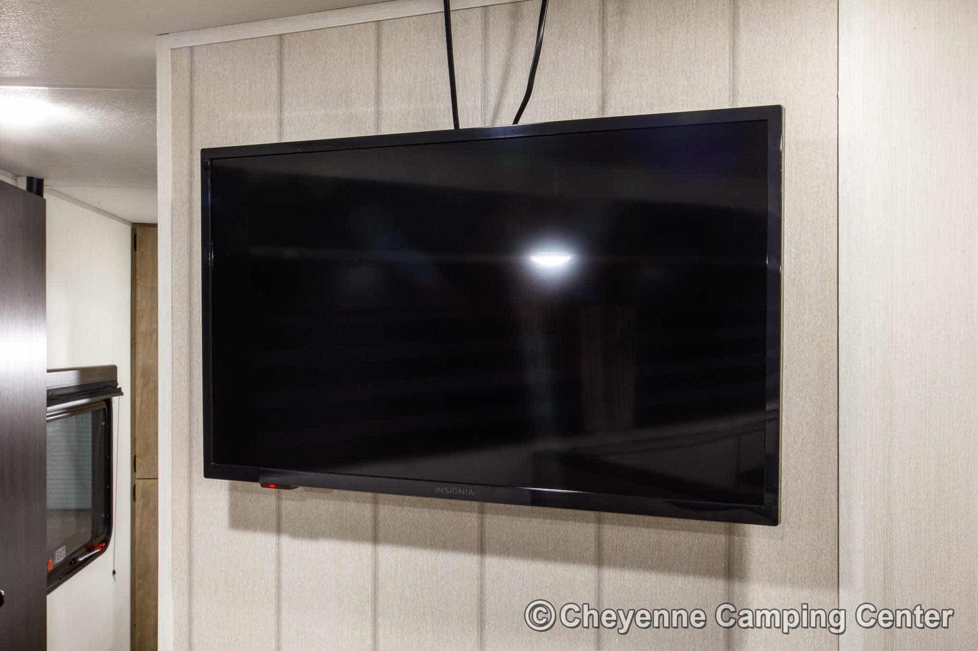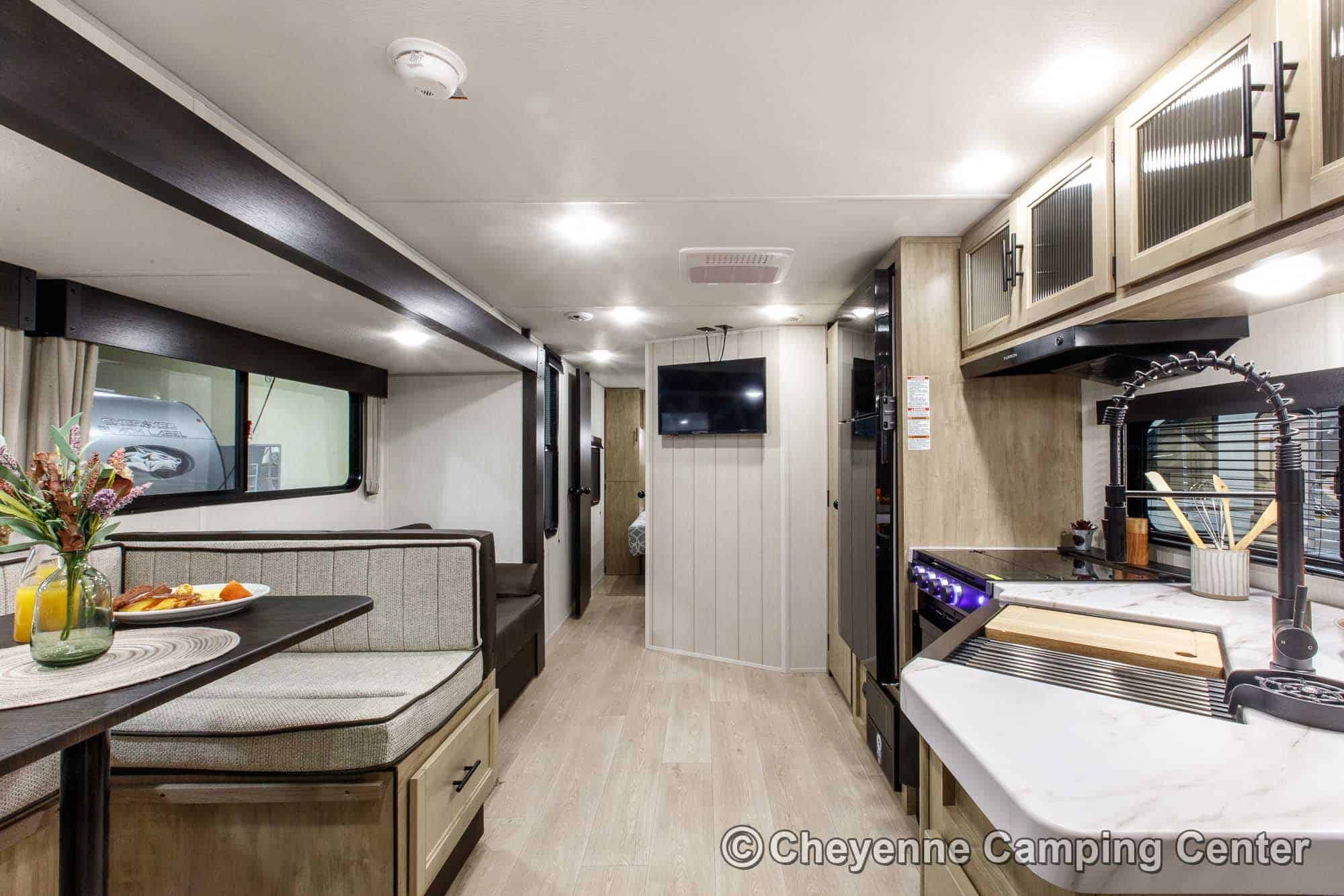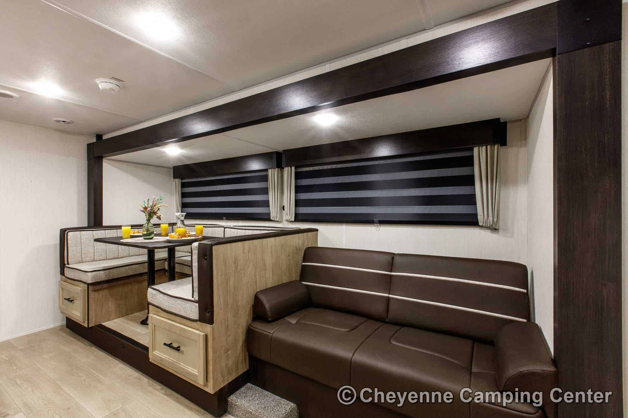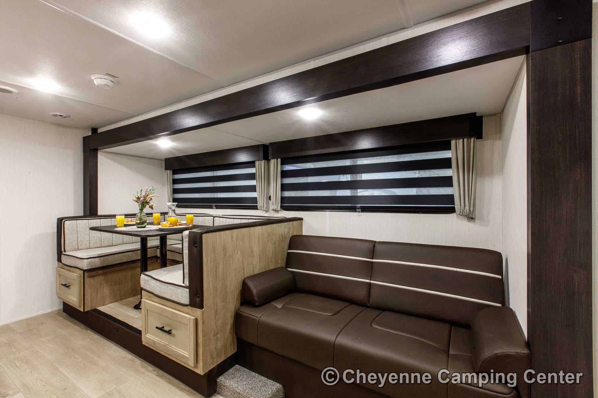 Inside, the Cherokee Grey Wolf 29TE provides versatile sleeping arrangements with a private rear bunk room, a jackknife sofa, a large U-shaped dinette, and a front RV king bed. The living area includes panoramic windows for a great view and added light, a 32” HD TV, and a Bluetooth media receiver.