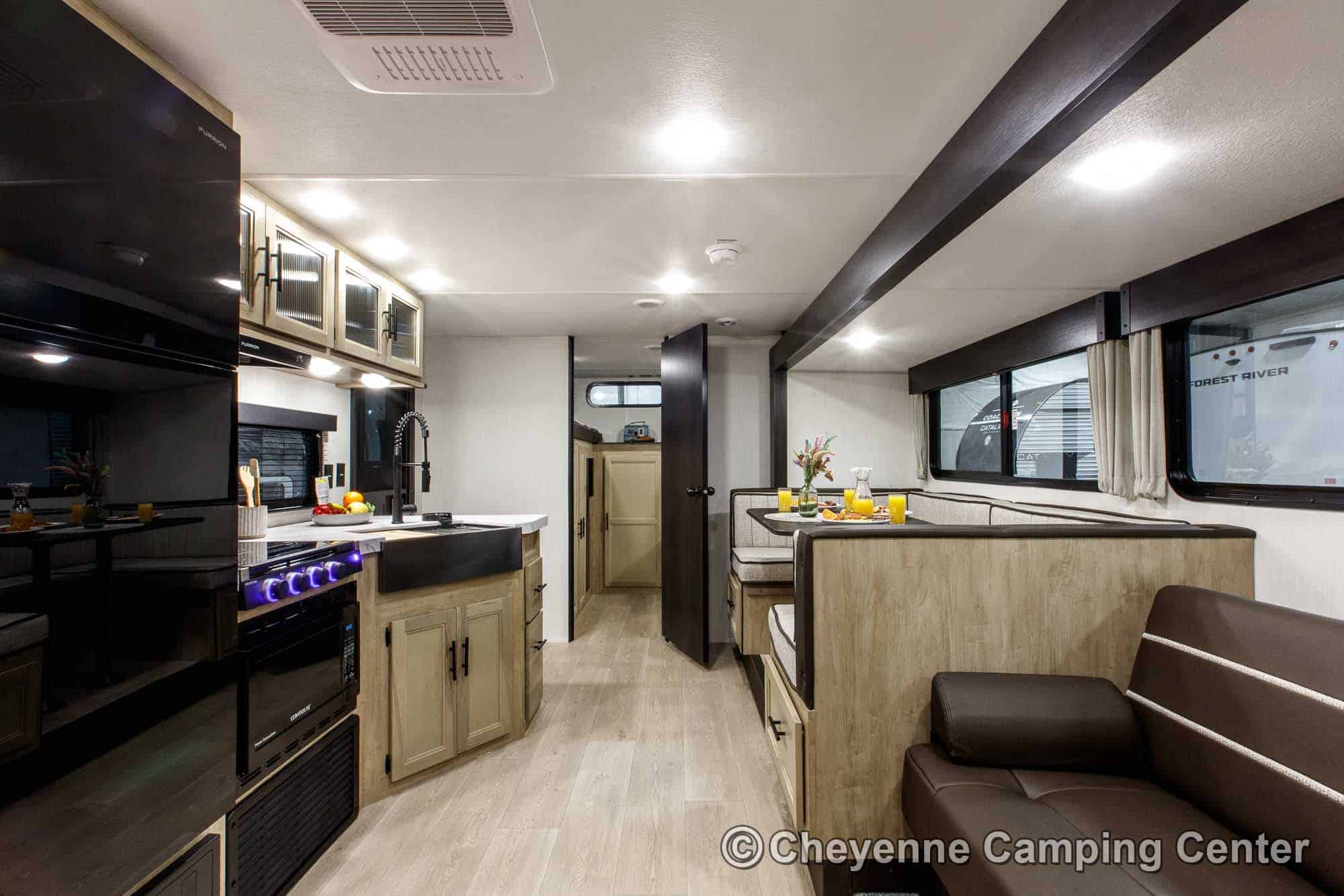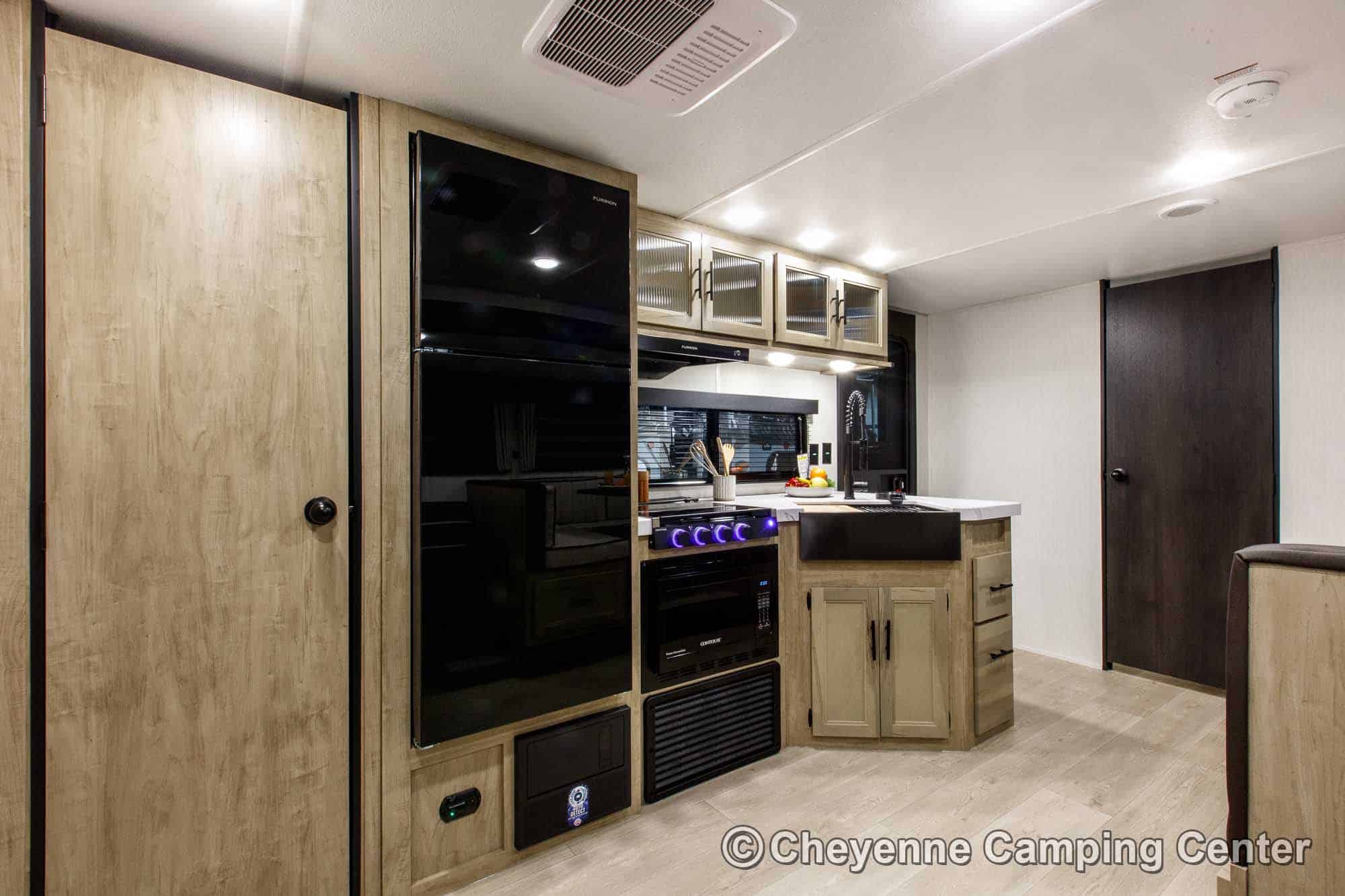 The well-equipped kitchen includes a 10 cu. ft. 12V refrigerator, large farm-style workstation sink, residential-style faucet with a glass rinsing fixture, a gas cooktop, a microwave/convection oven with built-in air fryer, and seamless countertops. A generous pantry offers plenty of space for food and supplies.