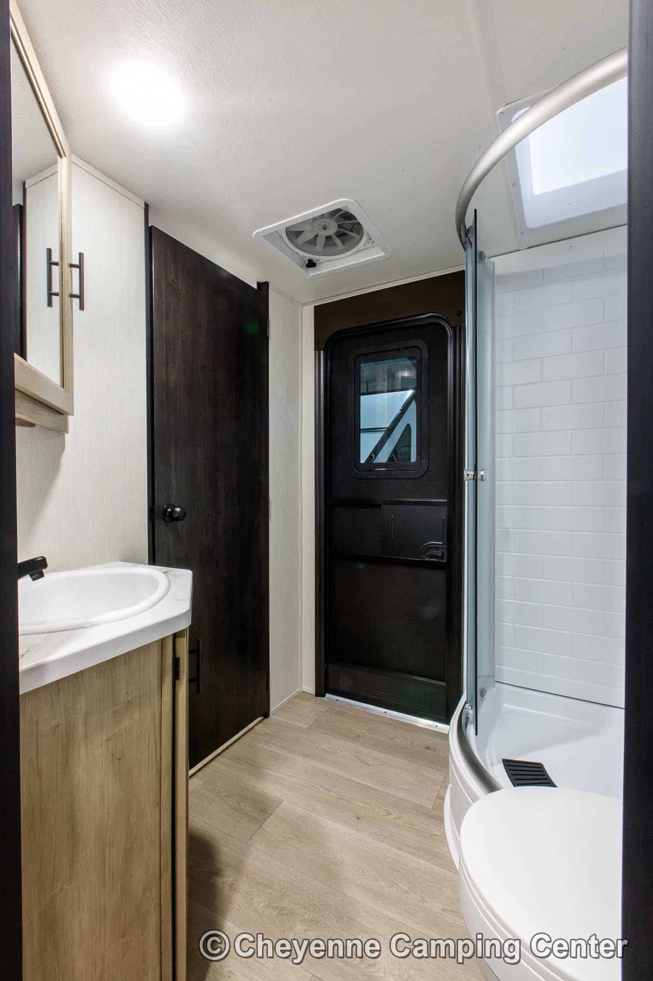 The bathroom features a glass enclosed shower with skylight, a vanity with storage, a foot-flush toilet, a premium vent fan, and a second entry door for convenient access from the bedroom.