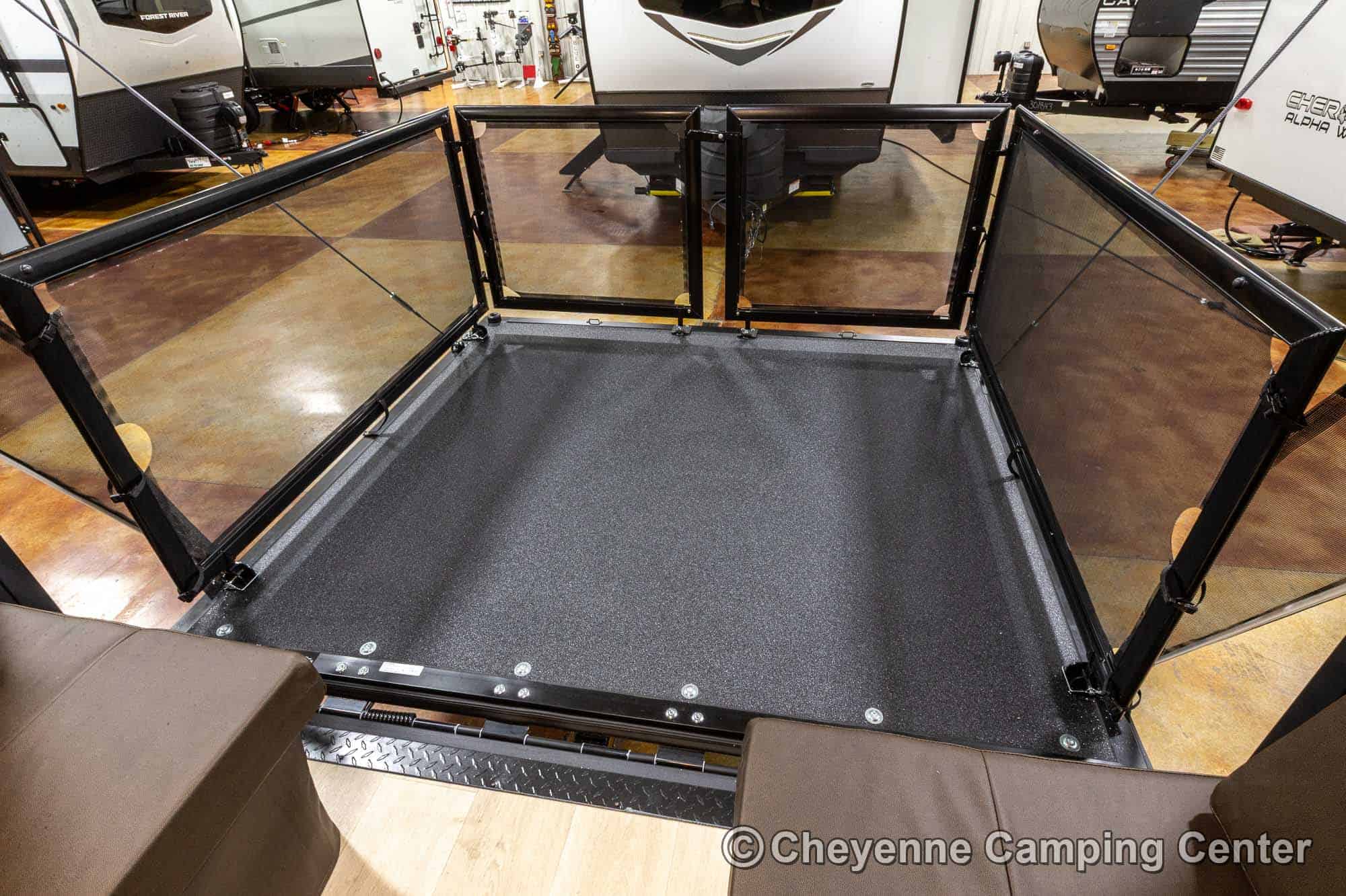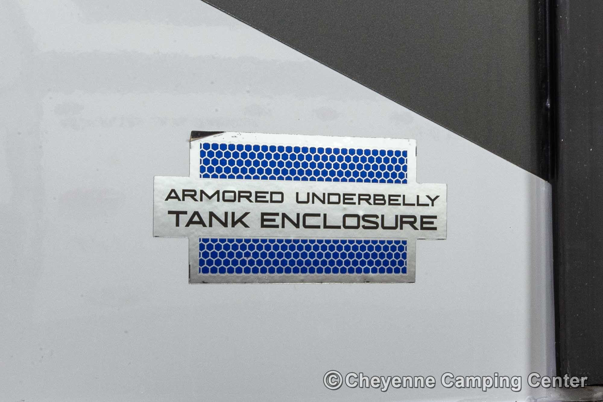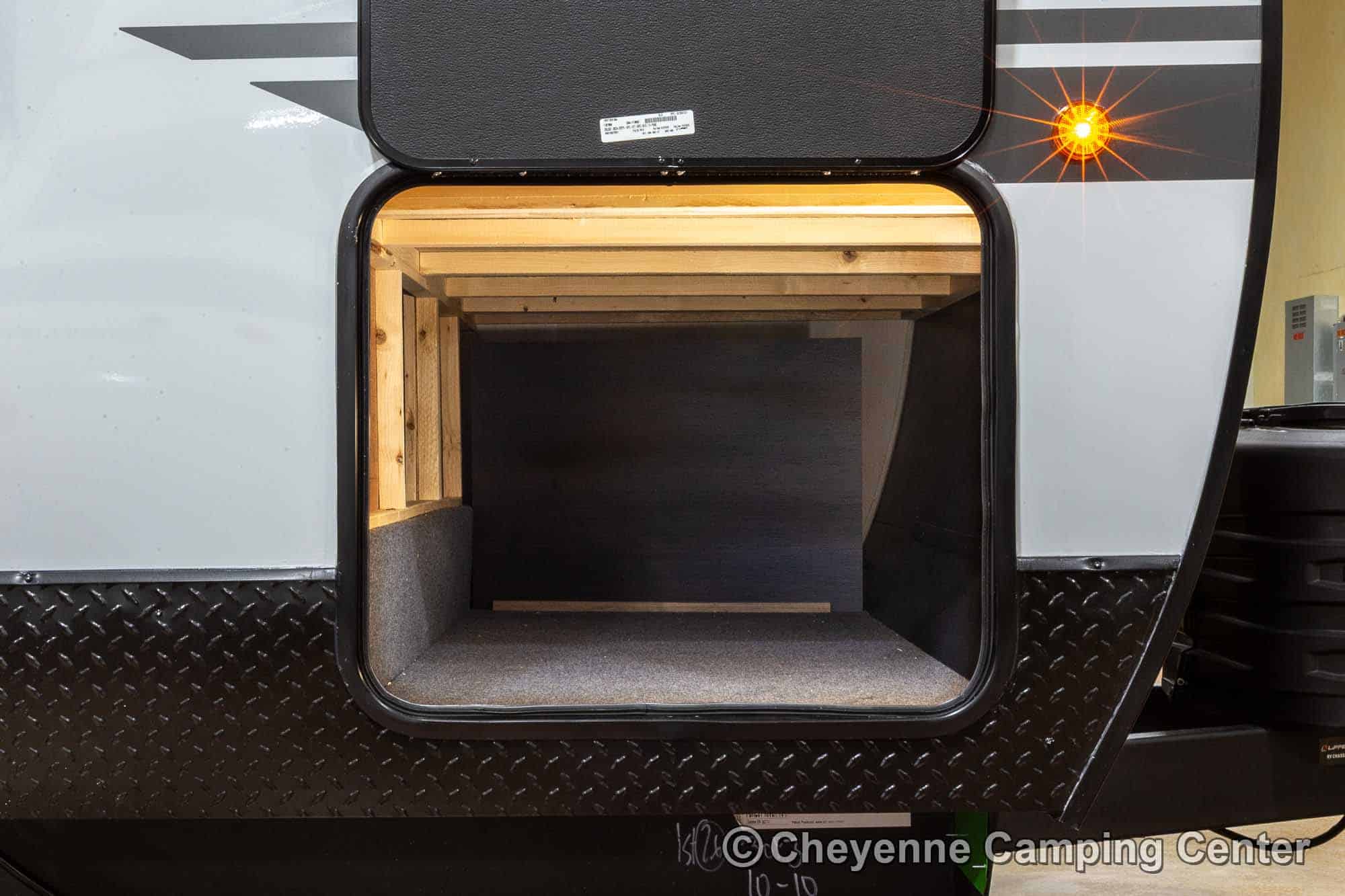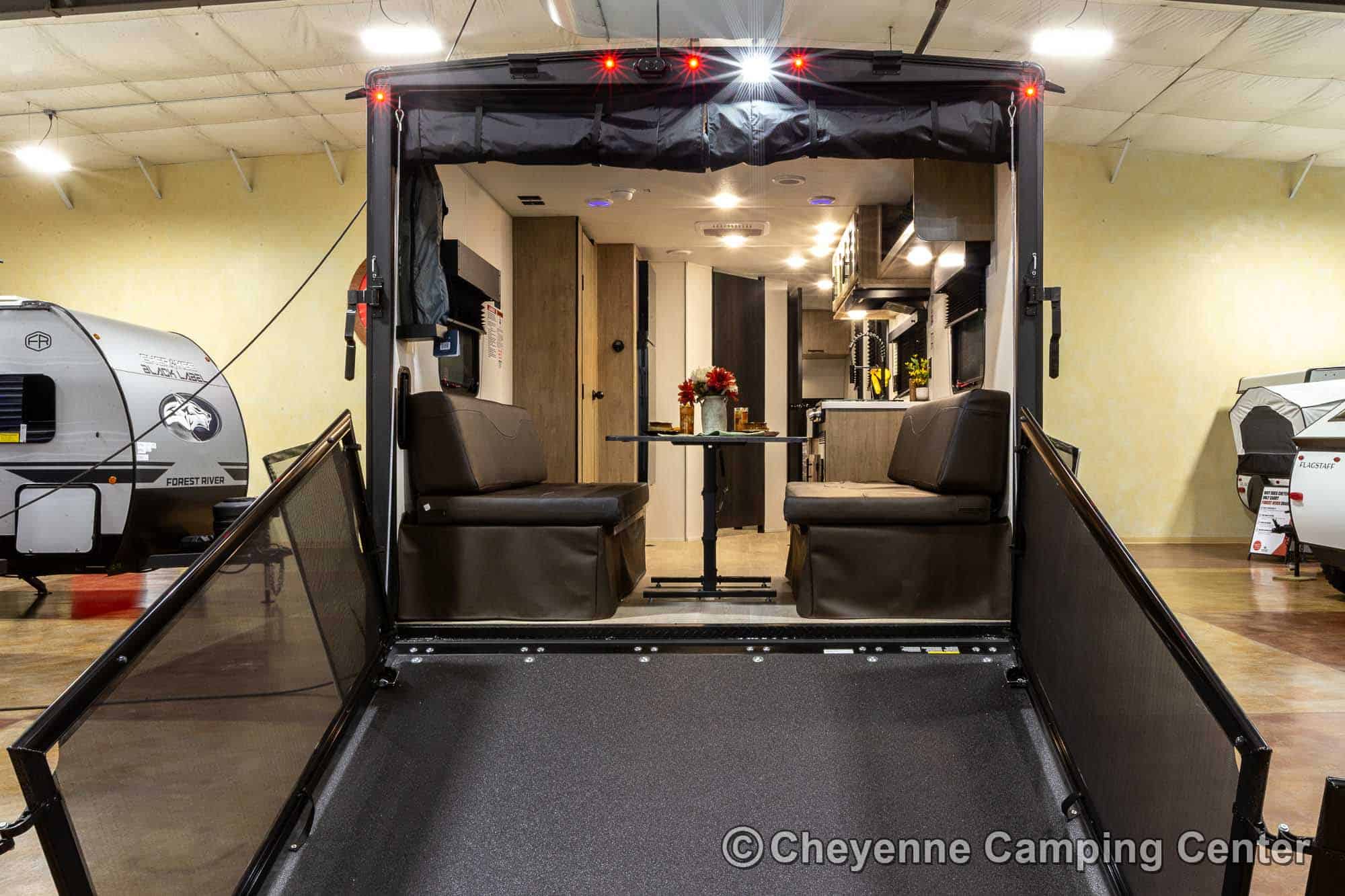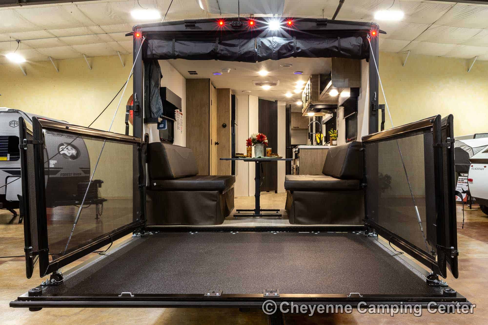 It also comes with the Limited, Campfire, and Base Camp Packages. You’ll have a 153″ x 70″ cargo area with a large rear access door, screen enclosure, and a ramp patio deck system. Other features include a private front RV king bedroom, a 200-watt solar panel, premium wheels, glass entry door, a 15,000 BTU A/C, an exterior shower, a black tank flush, a backup camera, heated holding tanks, MORryde entry steps, and a tankless water heater.