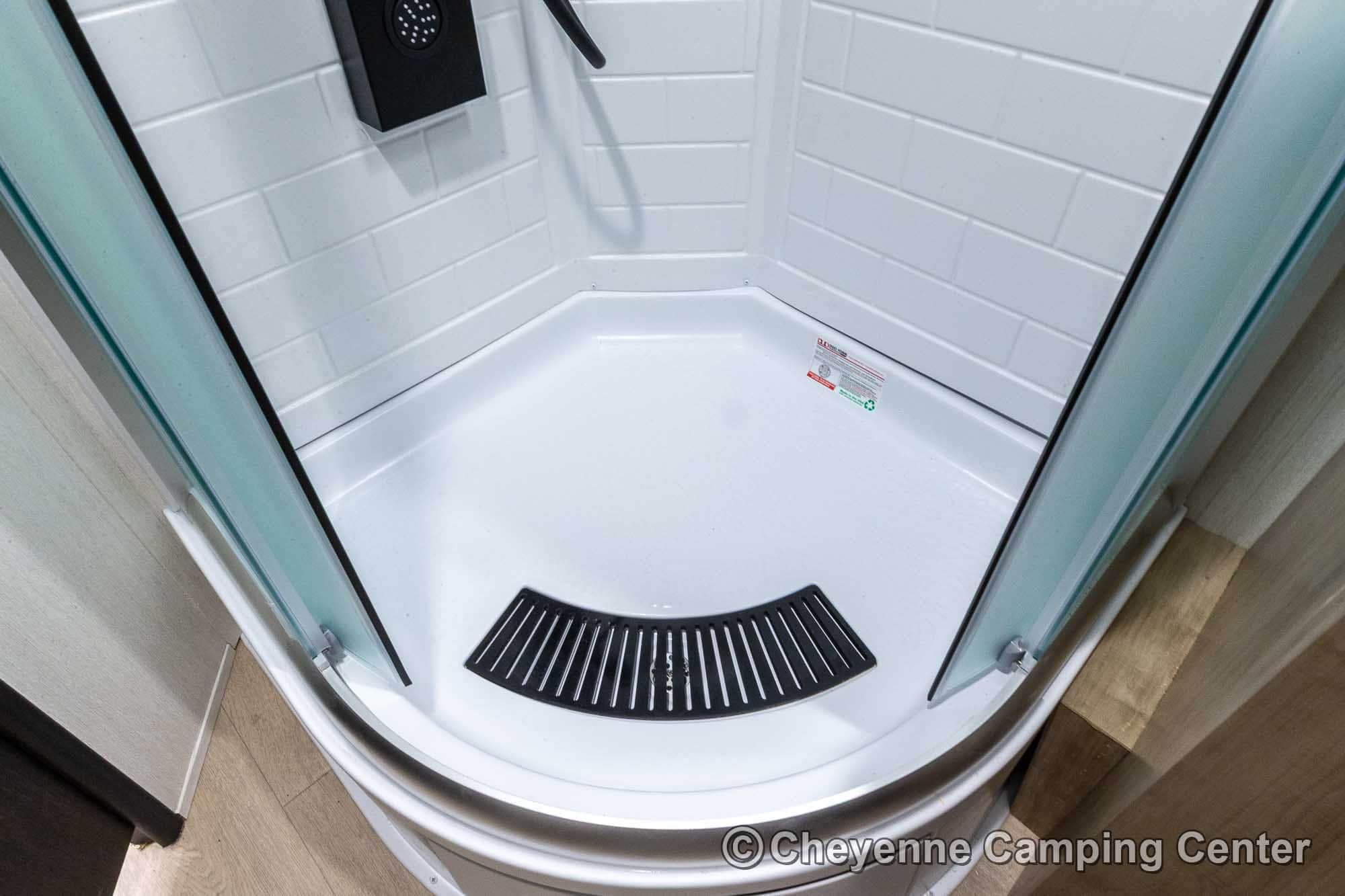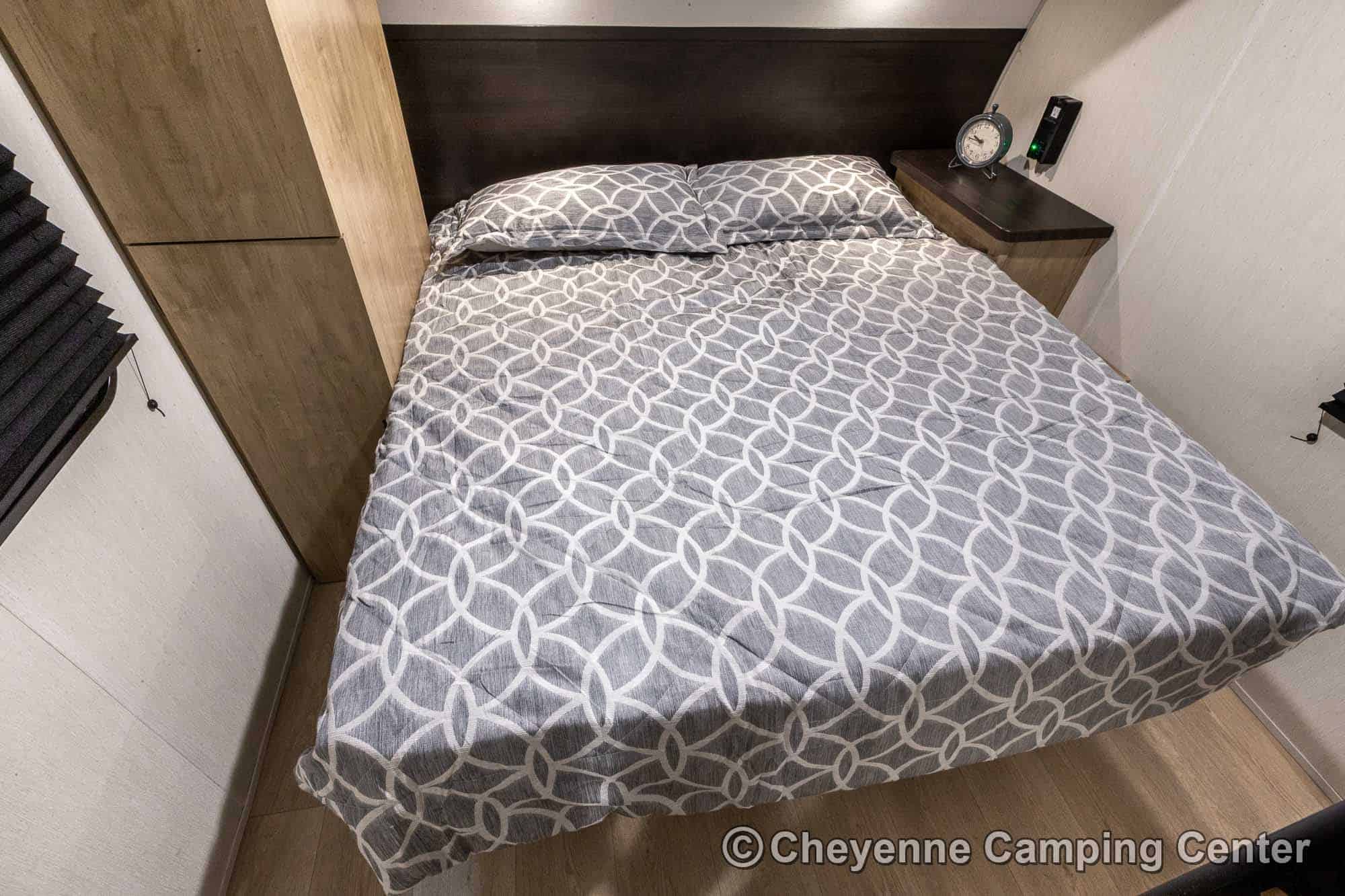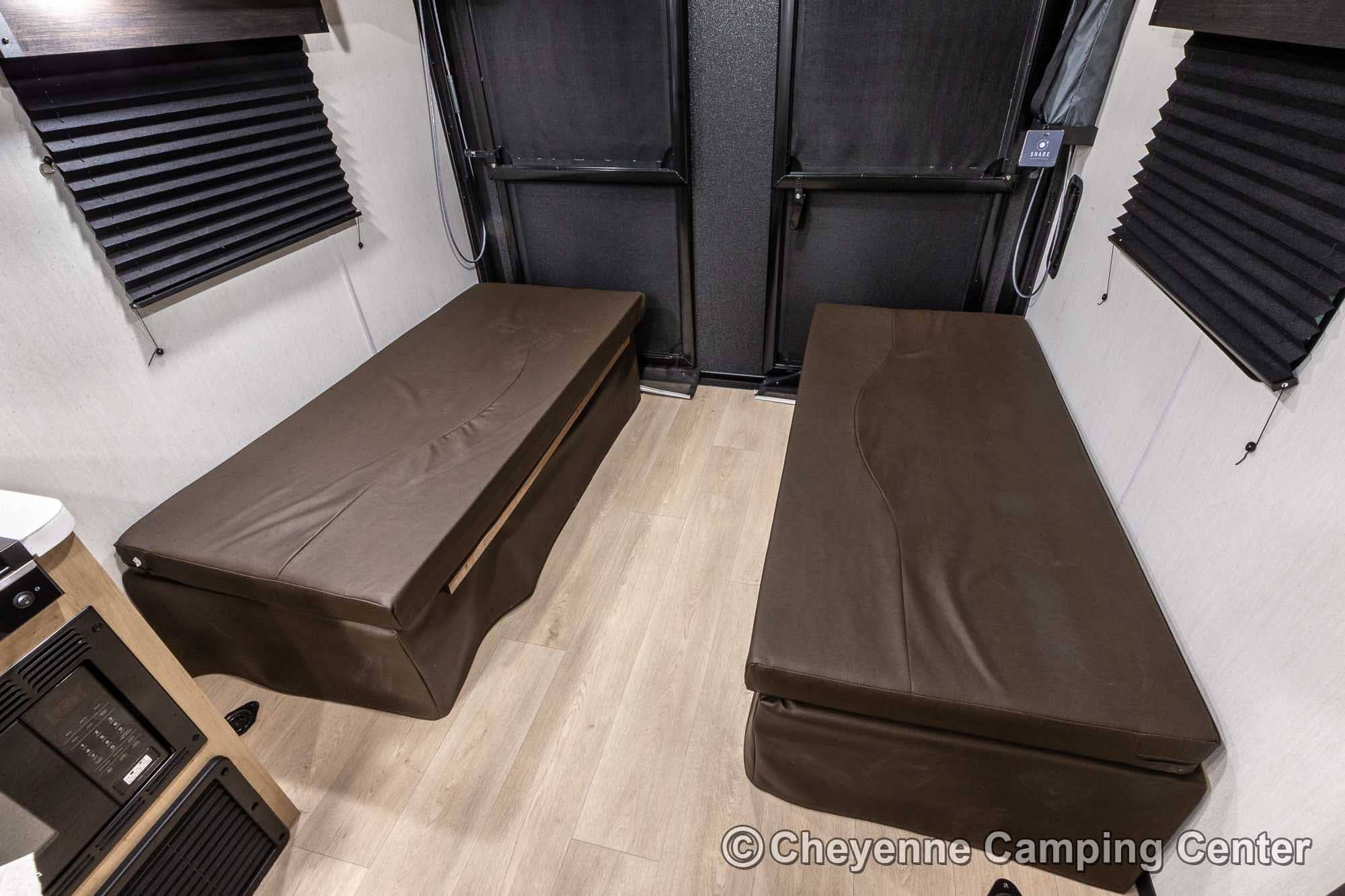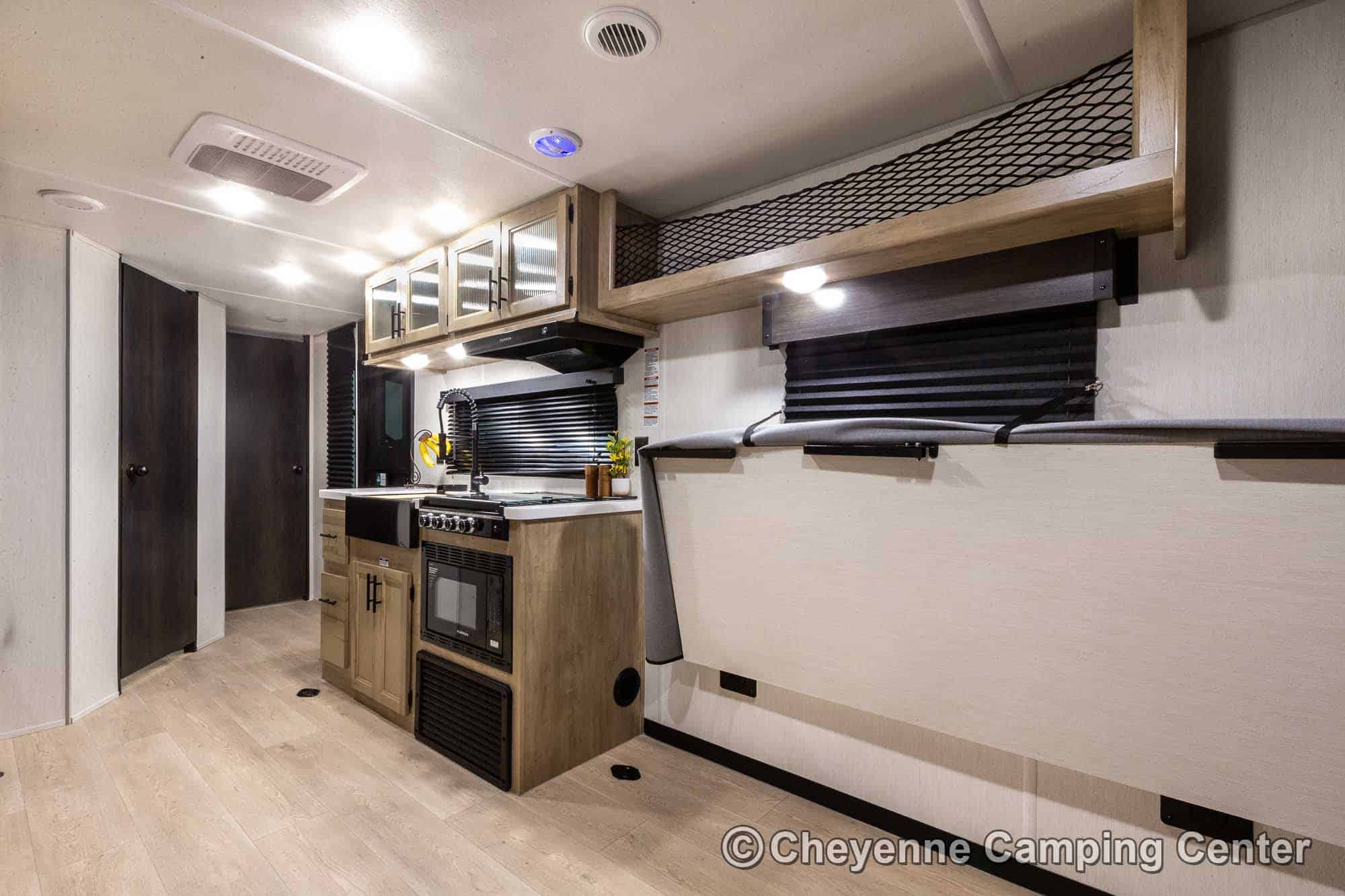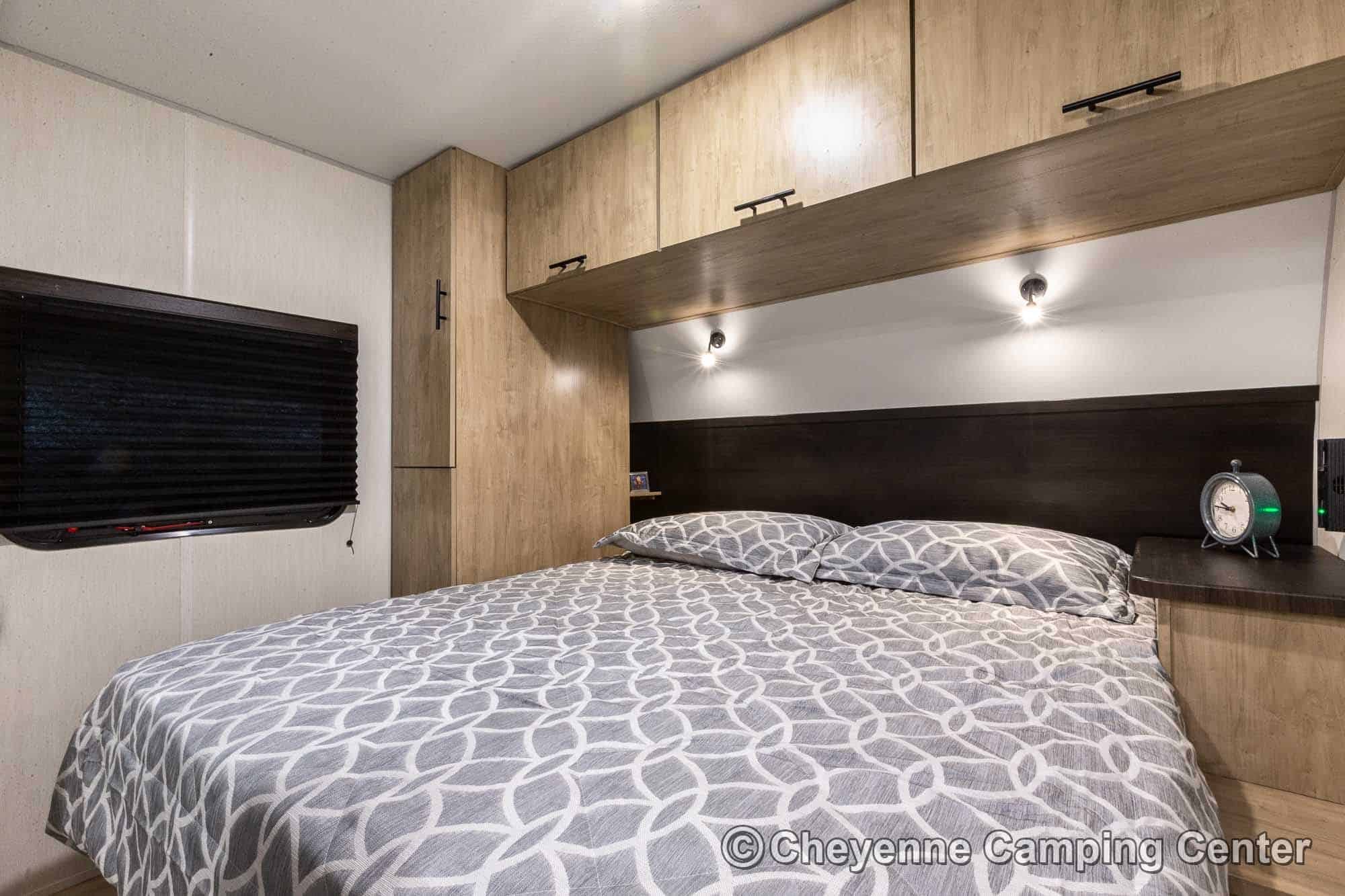 It also comes with the Limited, Campfire, and Base Camp Packages. You’ll have a 153″ x 70″ cargo area with a large rear access door, screen enclosure, and a ramp patio deck system. Other features include a private front RV king bedroom, a 200-watt solar panel, premium wheels, glass entry door, a 15,000 BTU A/C, an exterior shower, a black tank flush, a backup camera, heated holding tanks, MORryde entry steps, and a tankless water heater.