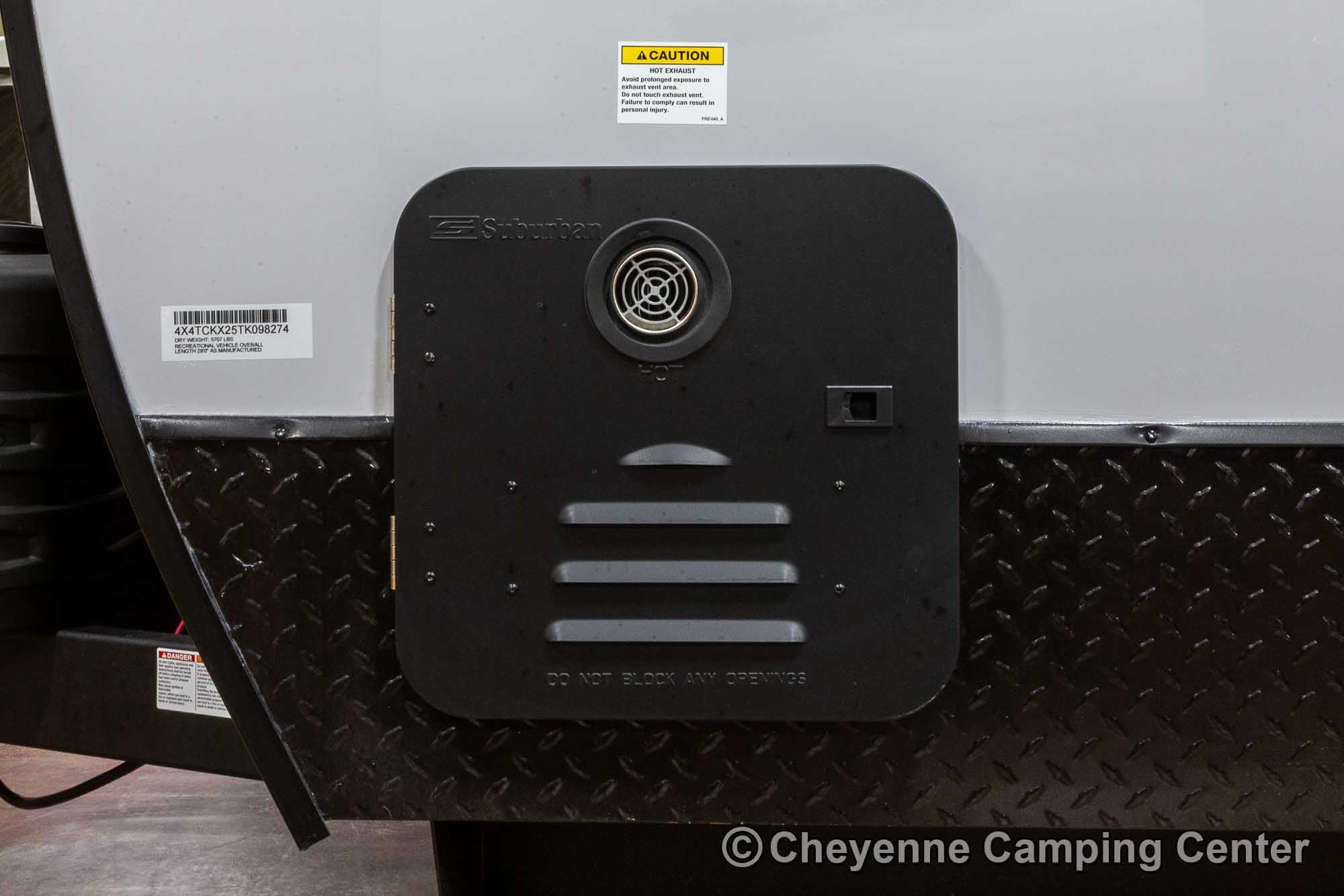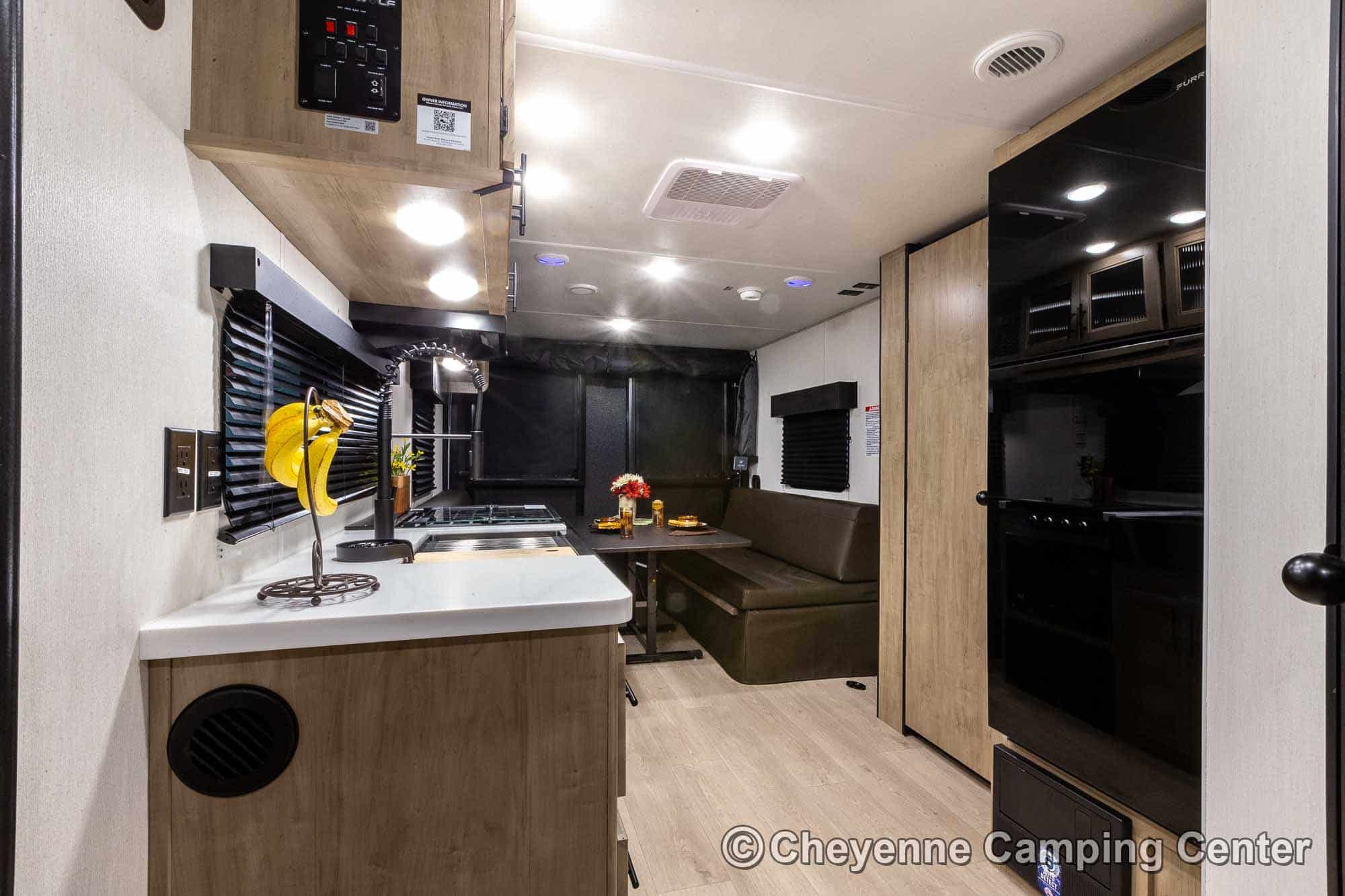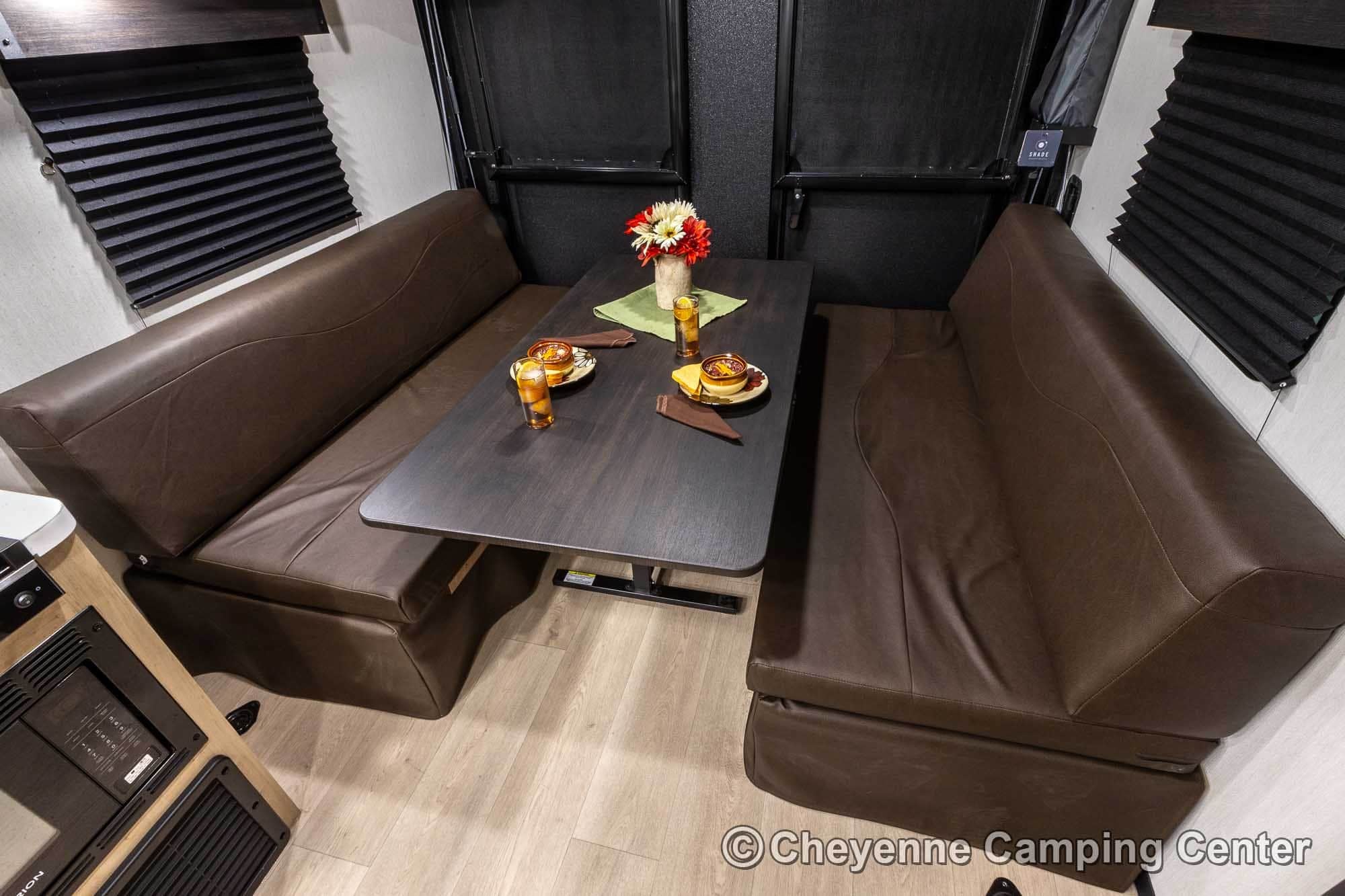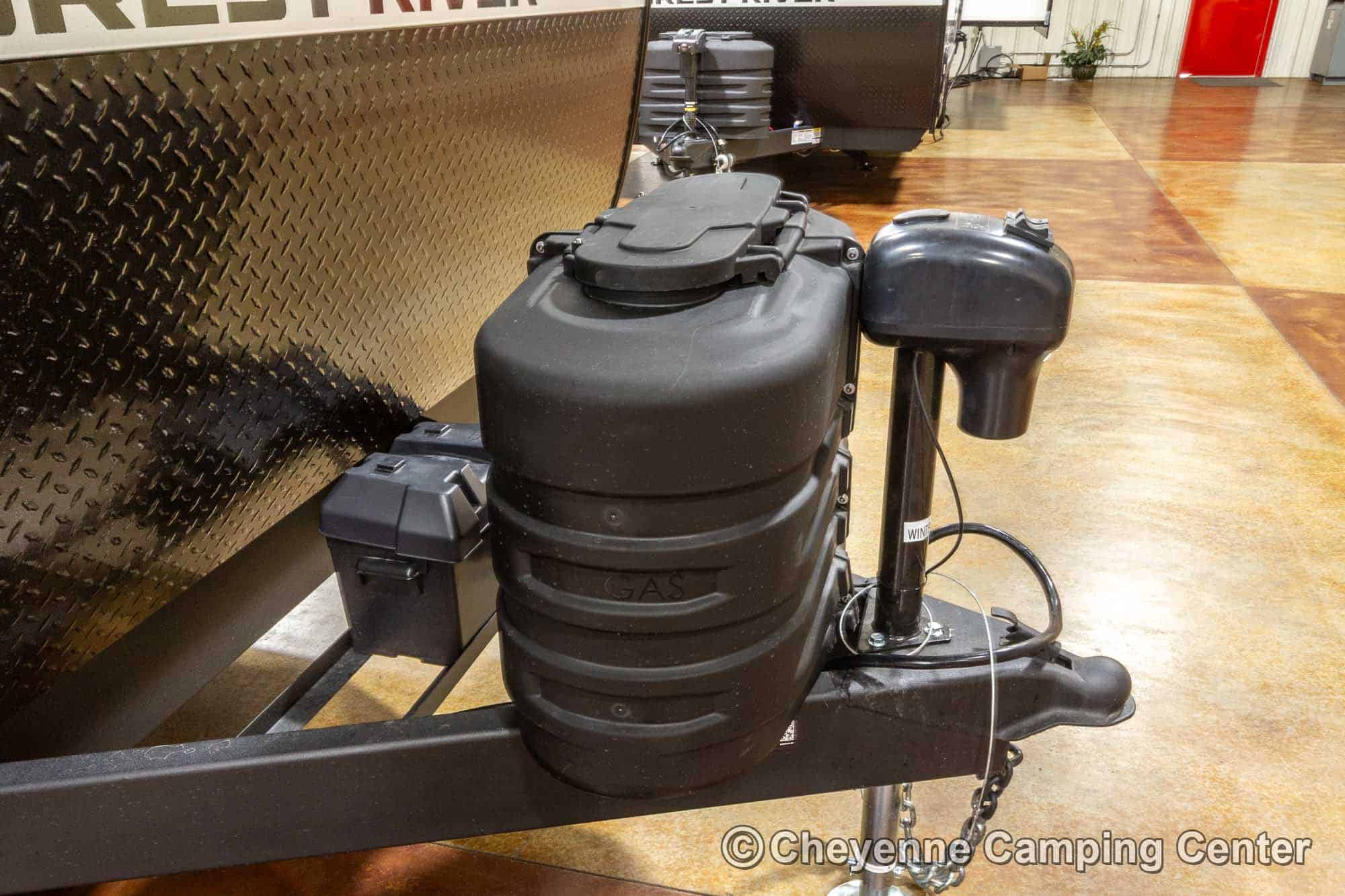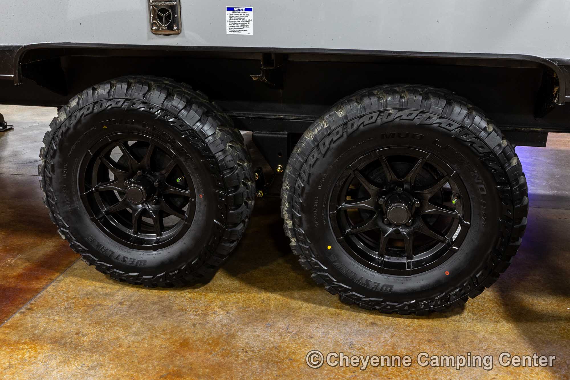 It also comes with the Limited, Campfire, and Base Camp Packages. You’ll have a 153″ x 70″ cargo area with a large rear access door, screen enclosure, and a ramp patio deck system. Other features include a private front RV king bedroom, a 200-watt solar panel, premium wheels, glass entry door, a 15,000 BTU A/C, an exterior shower, a black tank flush, a backup camera, heated holding tanks, MORryde entry steps, and a tankless water heater.