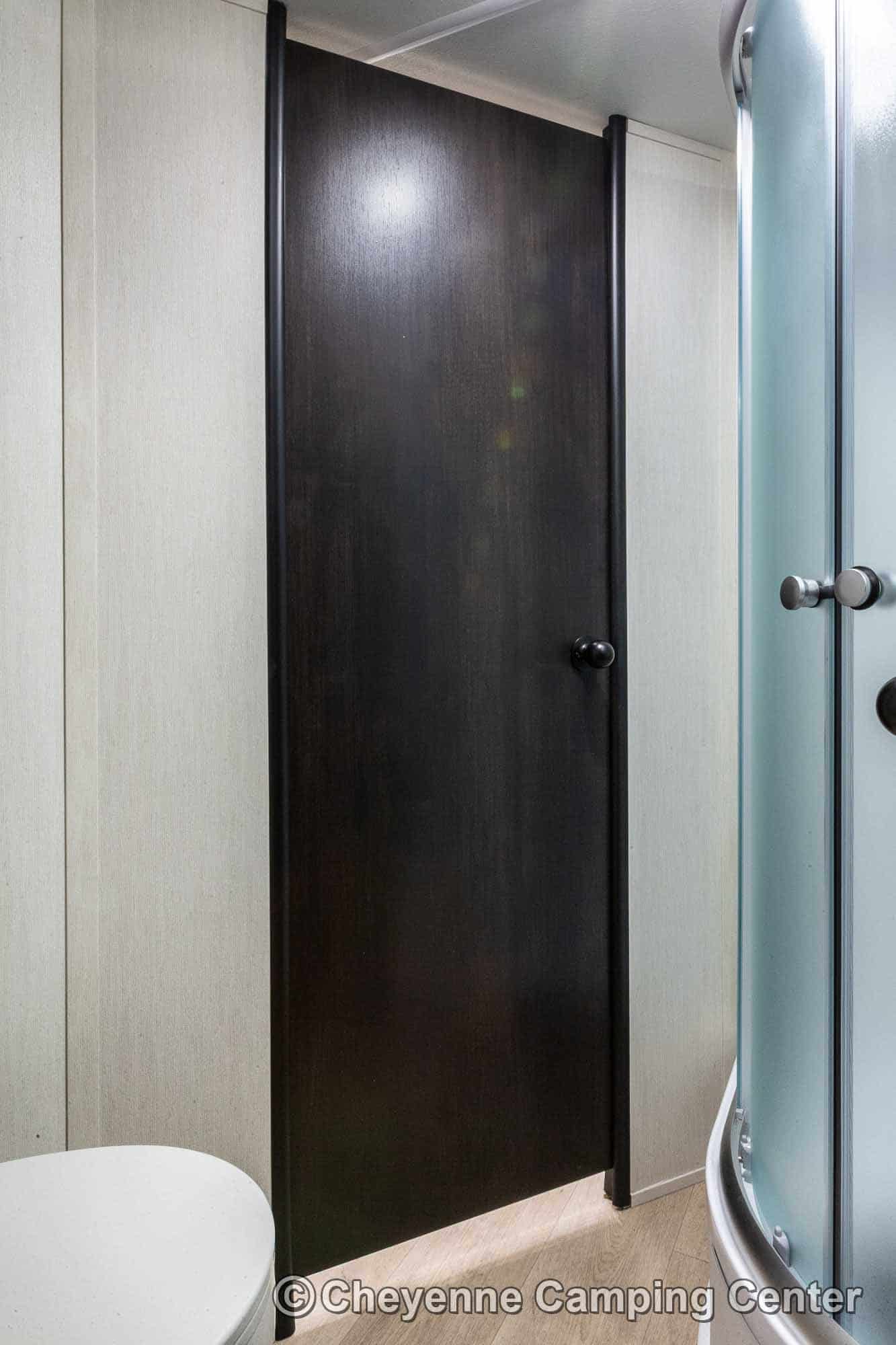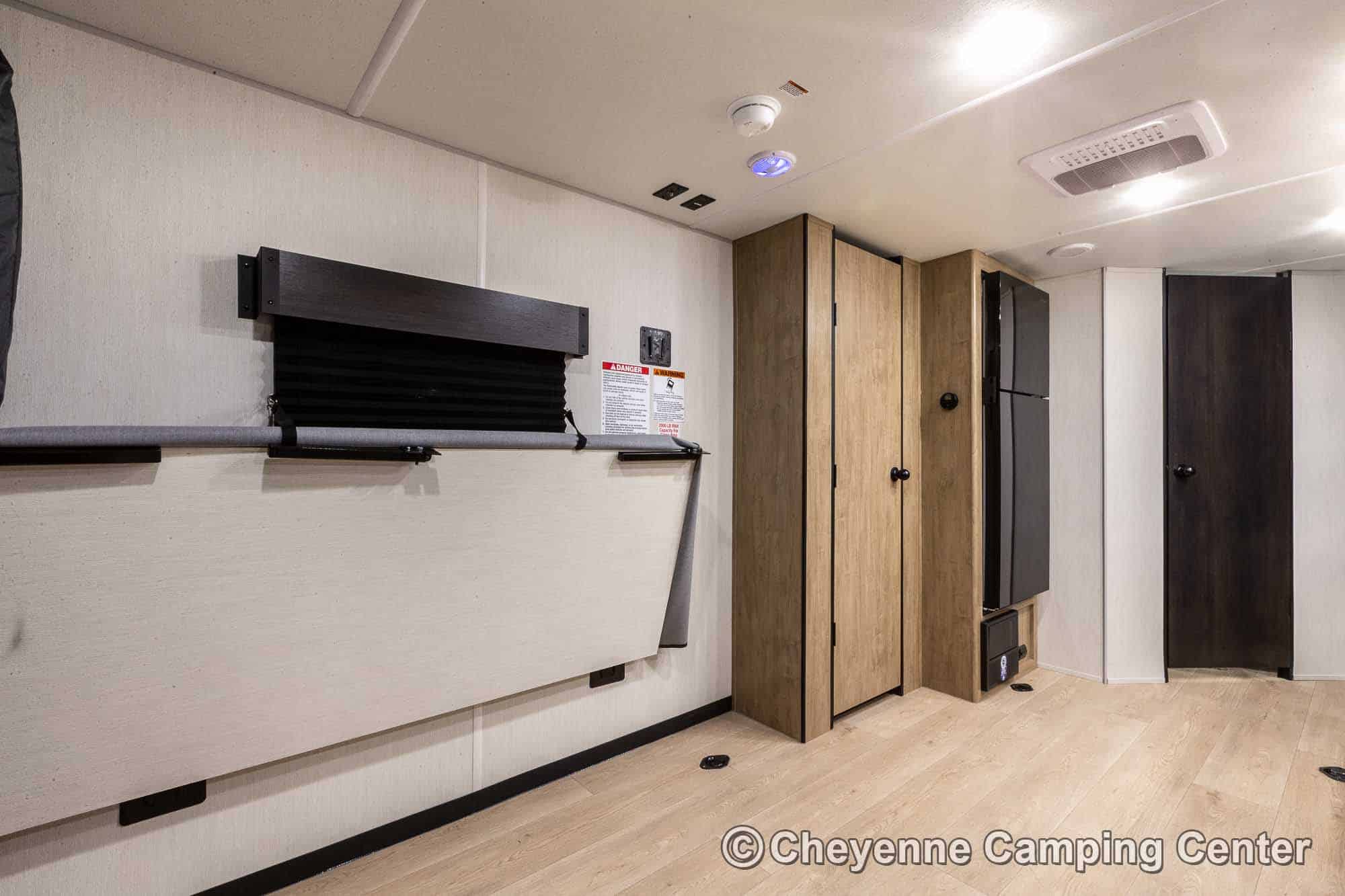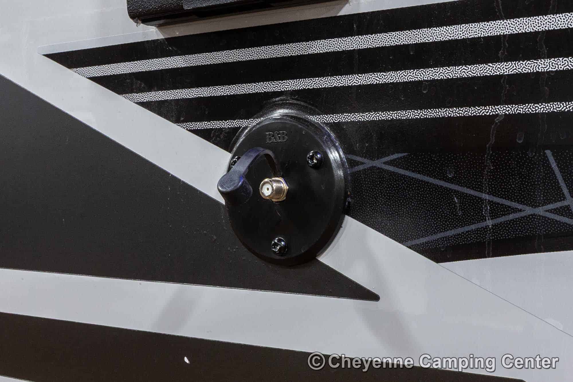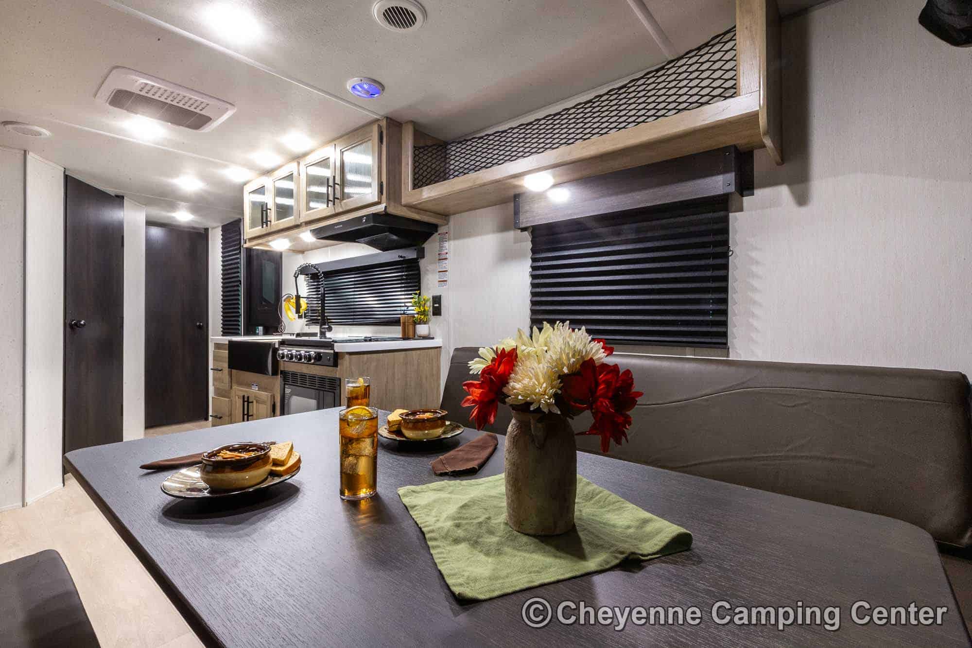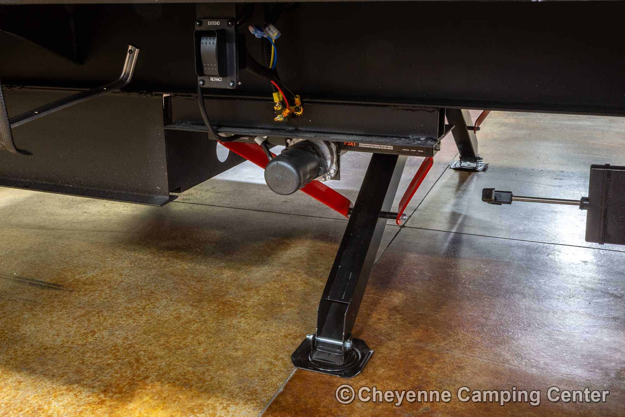 It also comes with the Limited, Campfire, and Base Camp Packages. You’ll have a 153″ x 70″ cargo area with a large rear access door, screen enclosure, and a ramp patio deck system. Other features include a private front RV king bedroom, a 200-watt solar panel, premium wheels, glass entry door, a 15,000 BTU A/C, an exterior shower, a black tank flush, a backup camera, heated holding tanks, MORryde entry steps, and a tankless water heater.