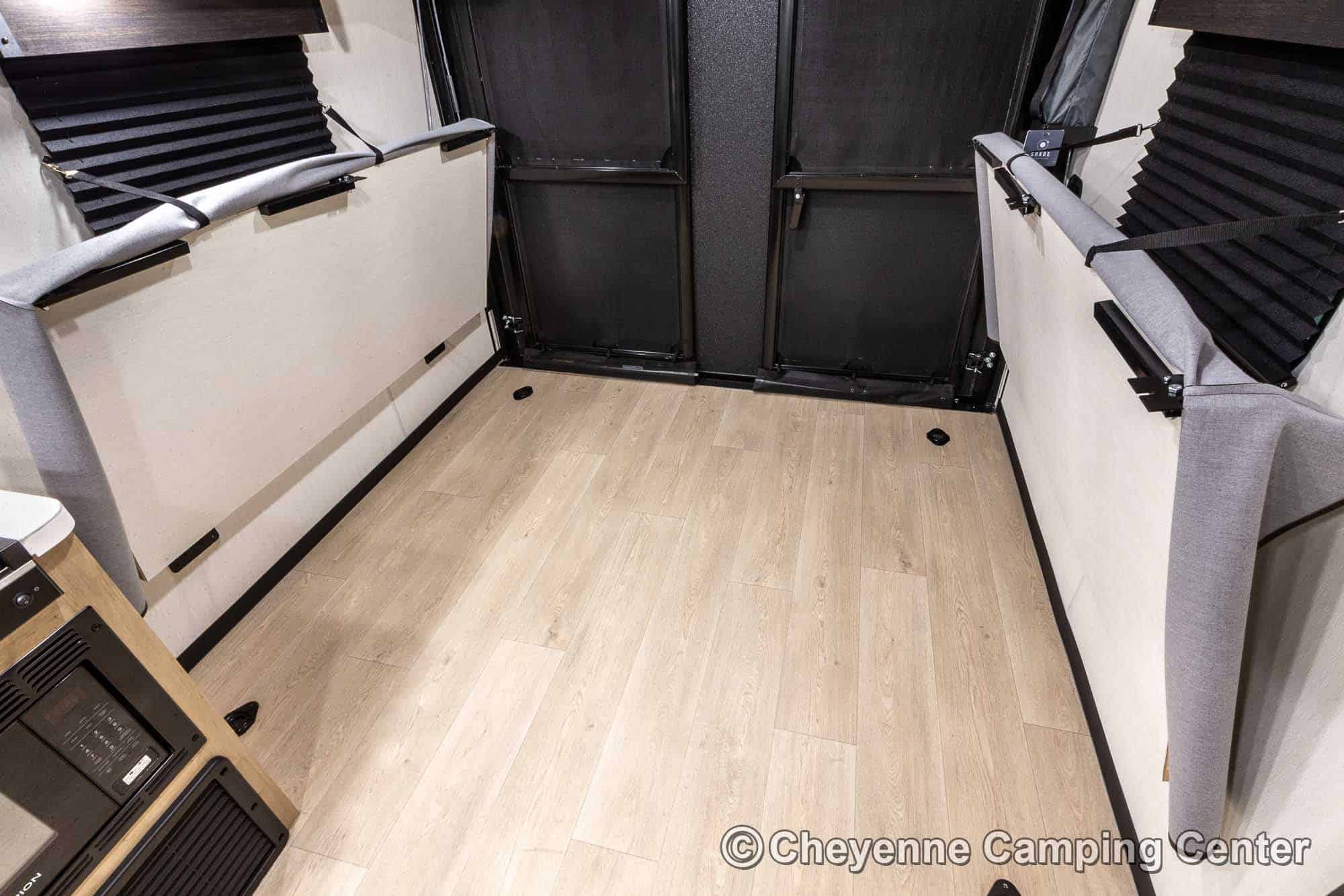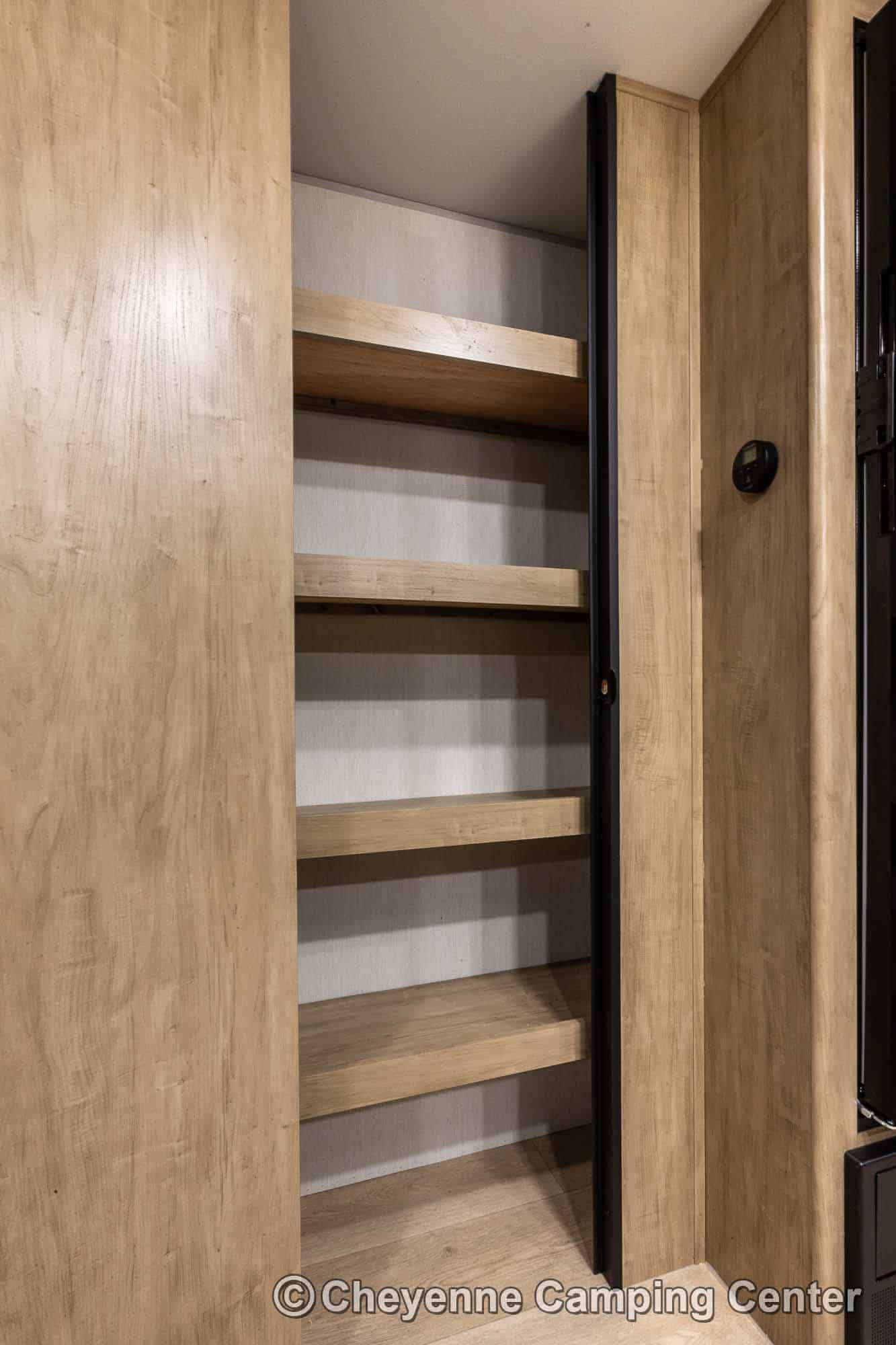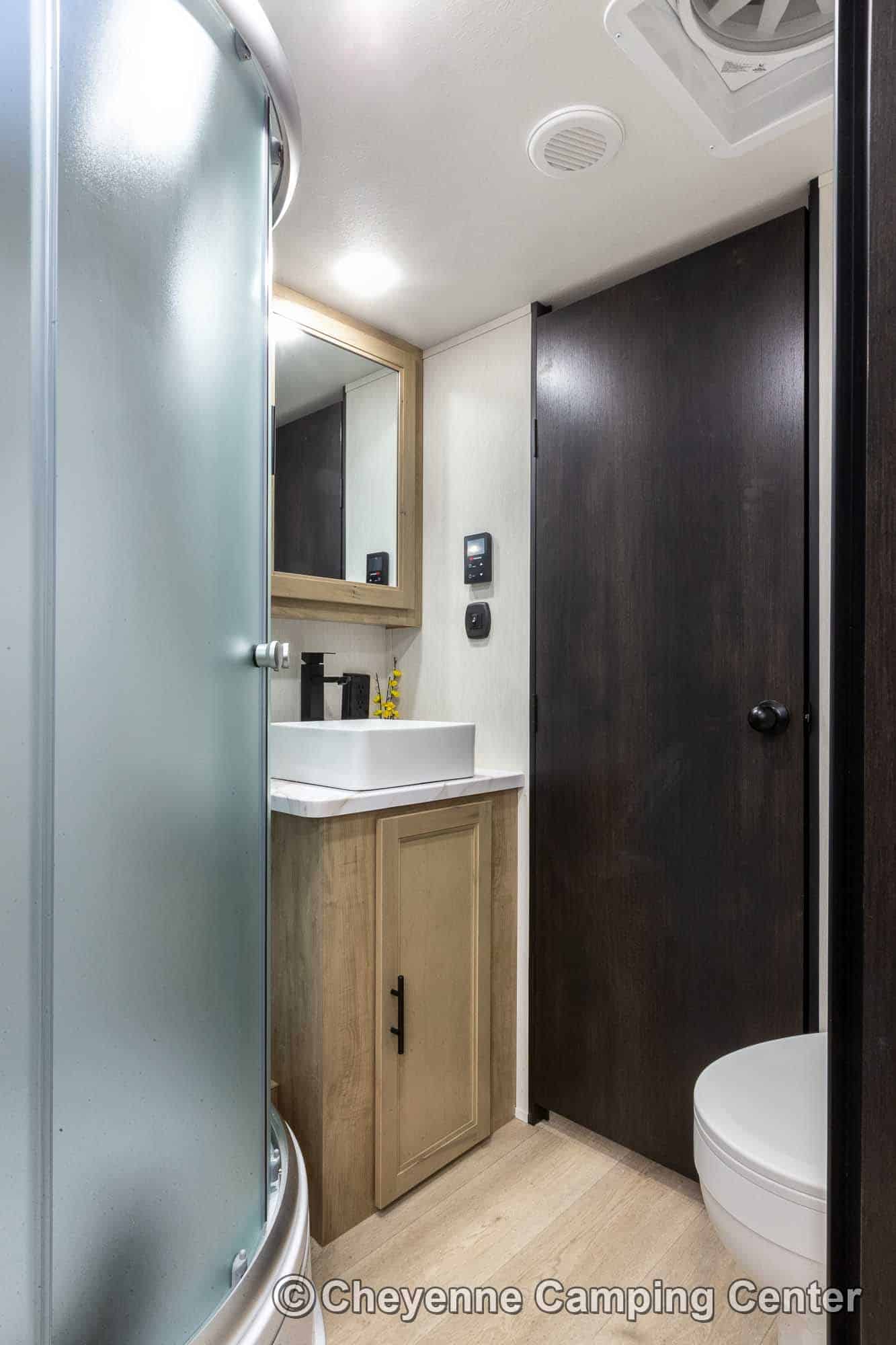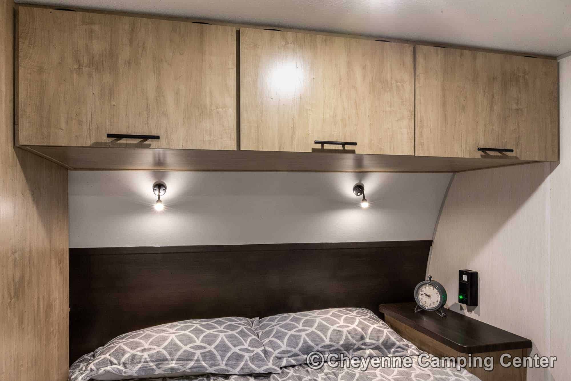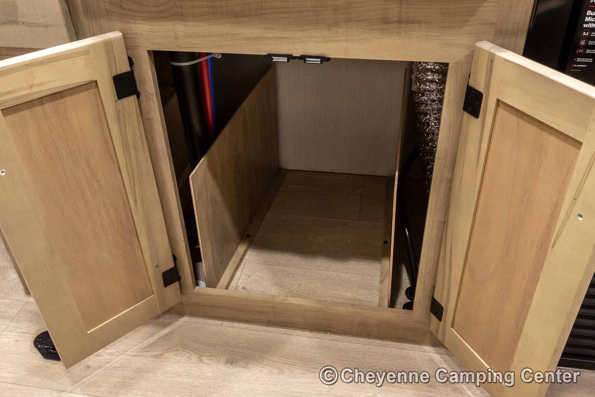 It also comes with the Limited, Campfire, and Base Camp Packages. You’ll have a 153″ x 70″ cargo area with a large rear access door, screen enclosure, and a ramp patio deck system. Other features include a private front RV king bedroom, a 200-watt solar panel, premium wheels, glass entry door, a 15,000 BTU A/C, an exterior shower, a black tank flush, a backup camera, heated holding tanks, MORryde entry steps, and a tankless water heater.