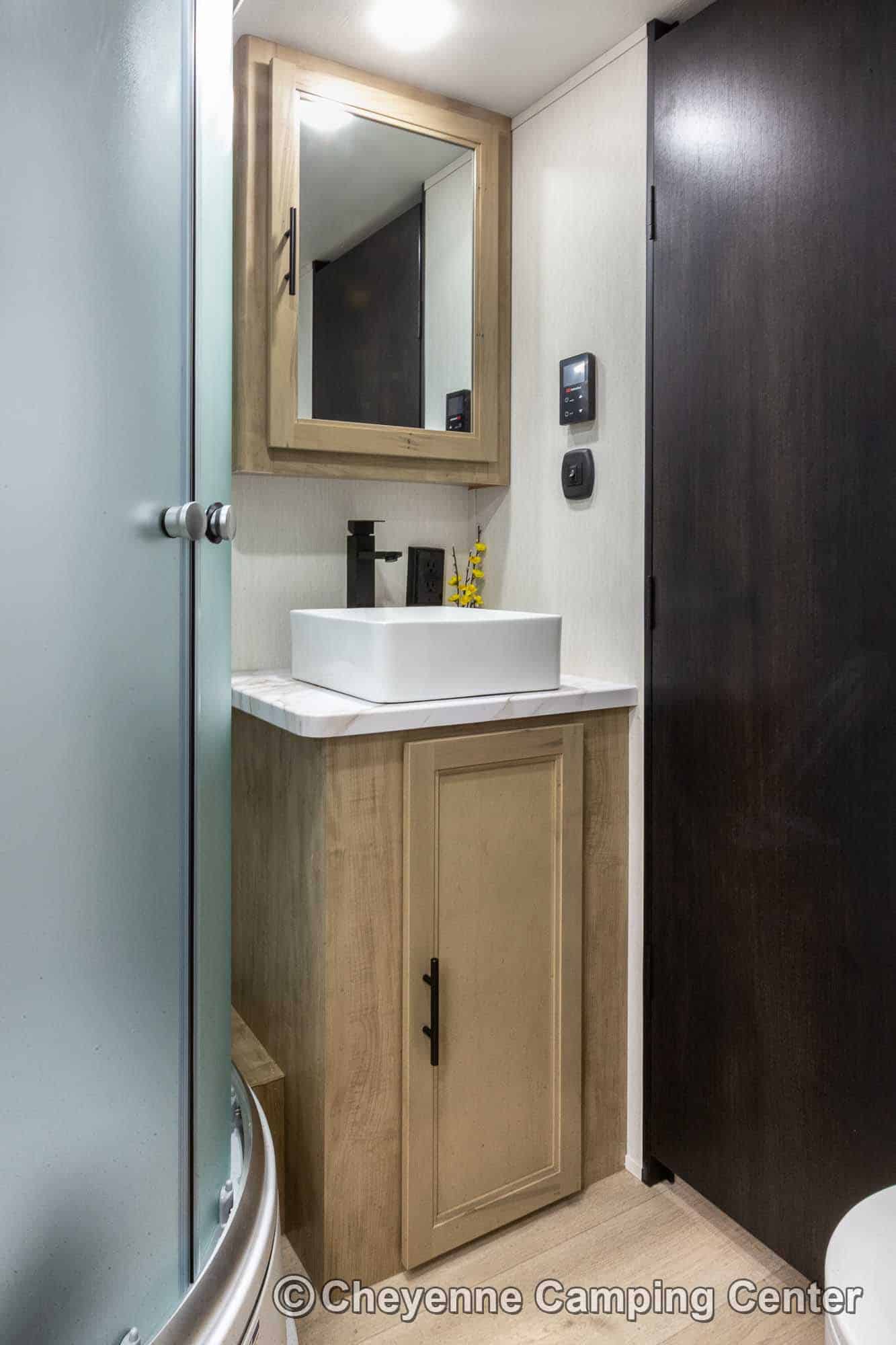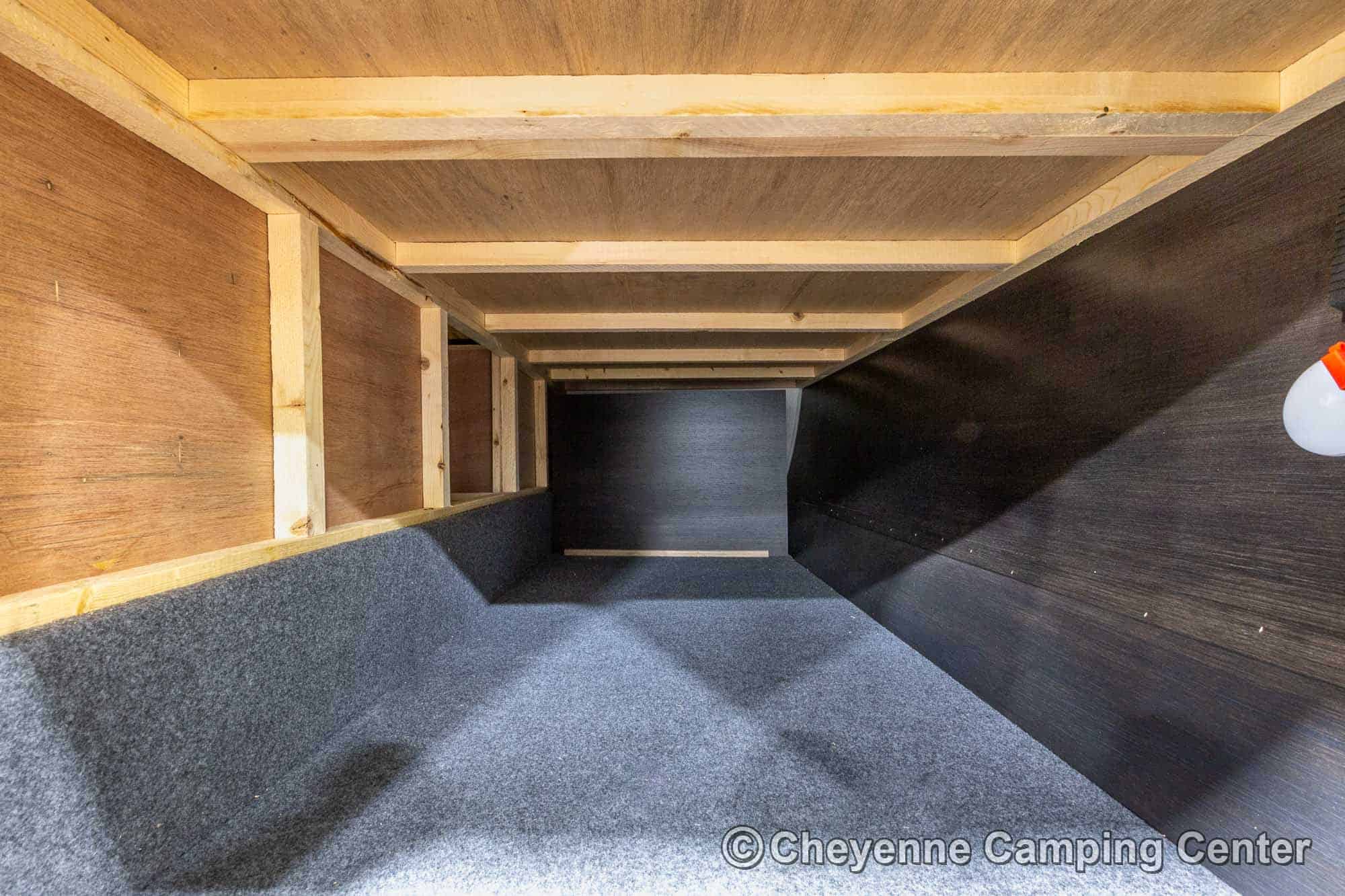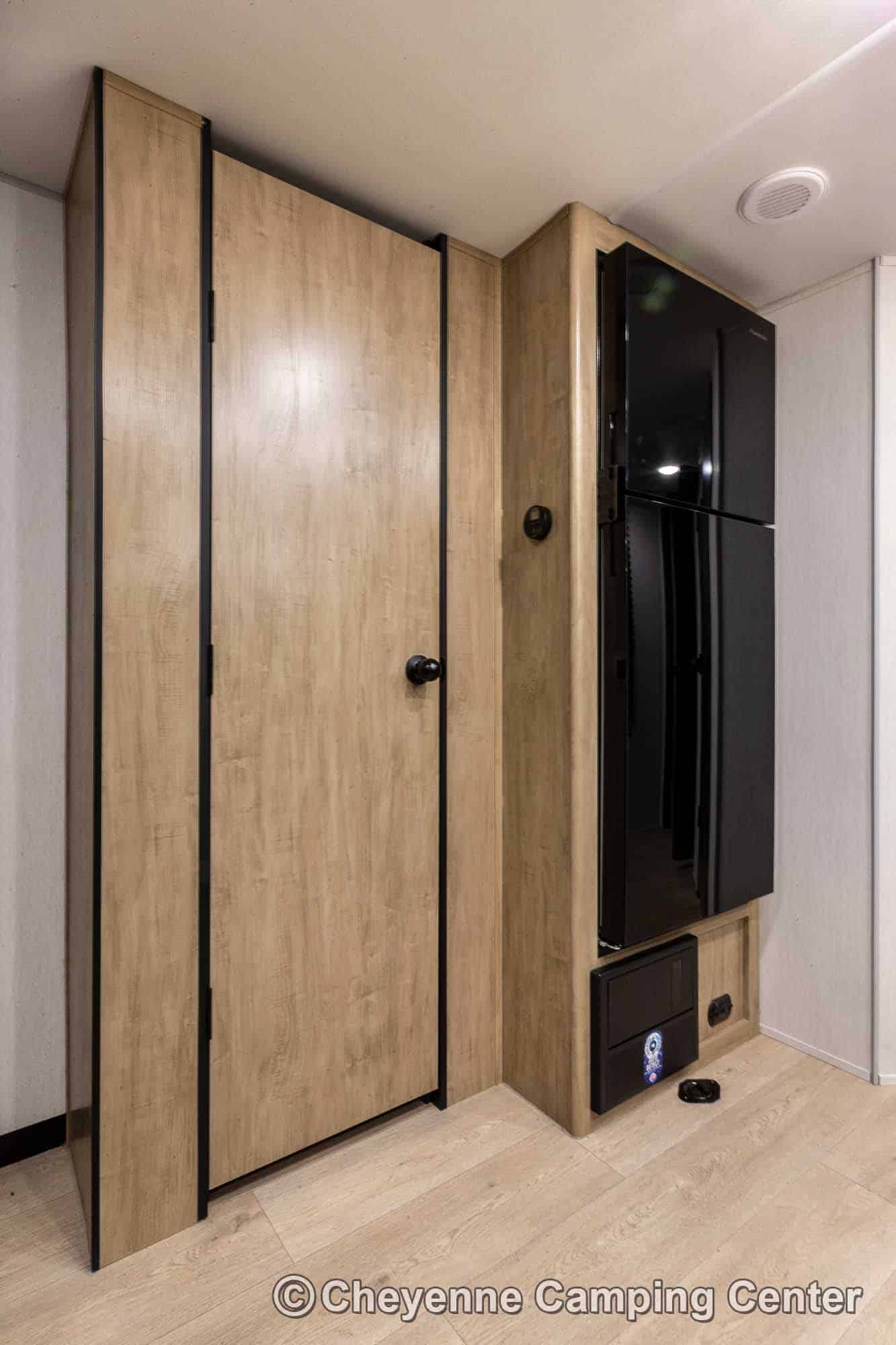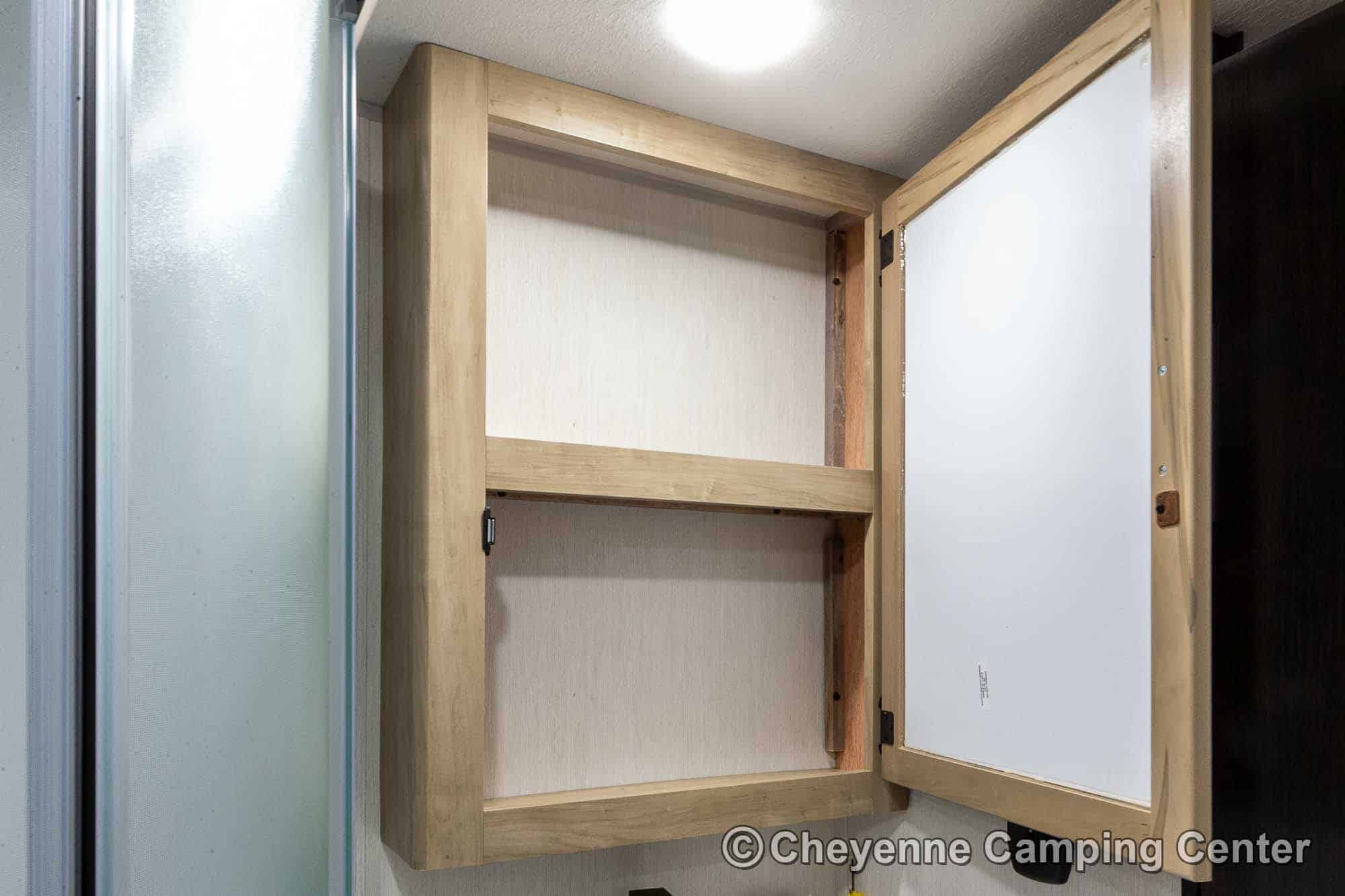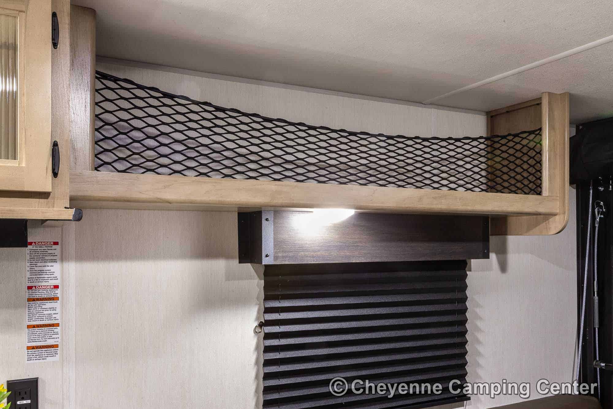 It also comes with the Limited, Campfire, and Base Camp Packages. You’ll have a 153″ x 70″ cargo area with a large rear access door, screen enclosure, and a ramp patio deck system. Other features include a private front RV king bedroom, a 200-watt solar panel, premium wheels, glass entry door, a 15,000 BTU A/C, an exterior shower, a black tank flush, a backup camera, heated holding tanks, MORryde entry steps, and a tankless water heater.
