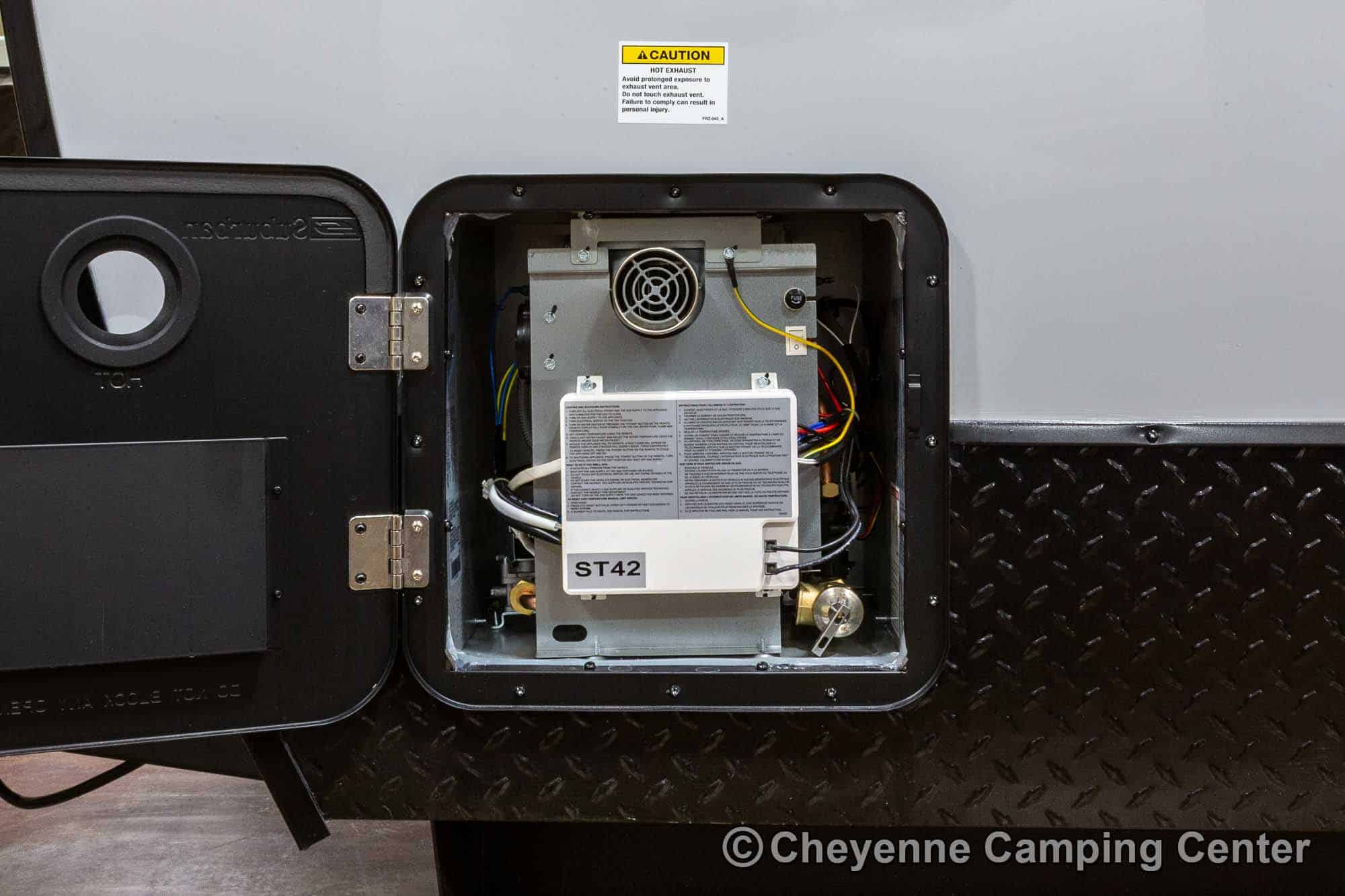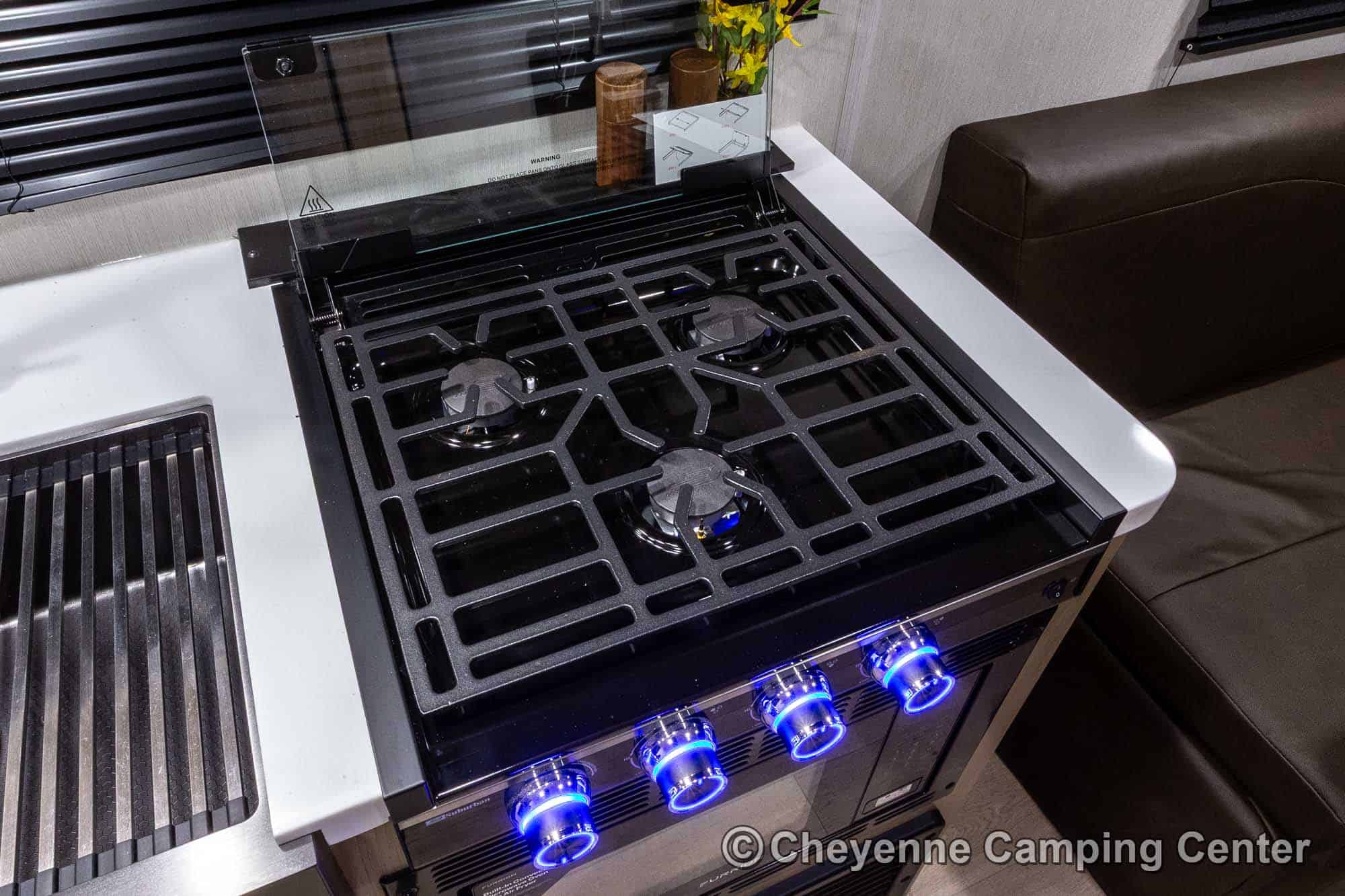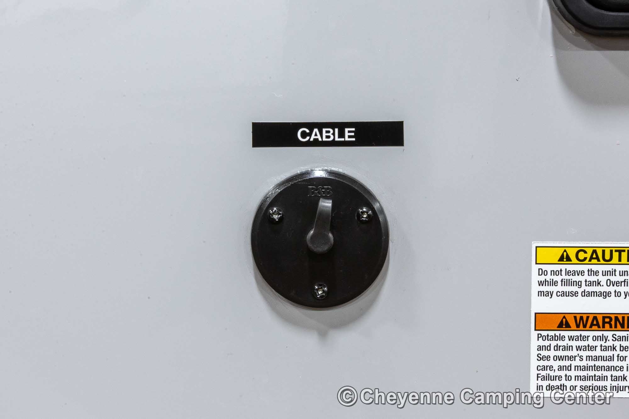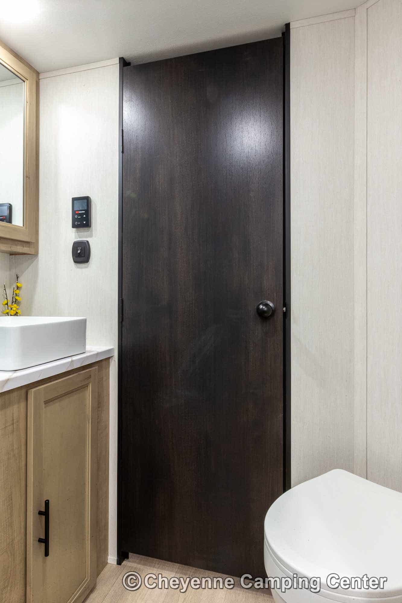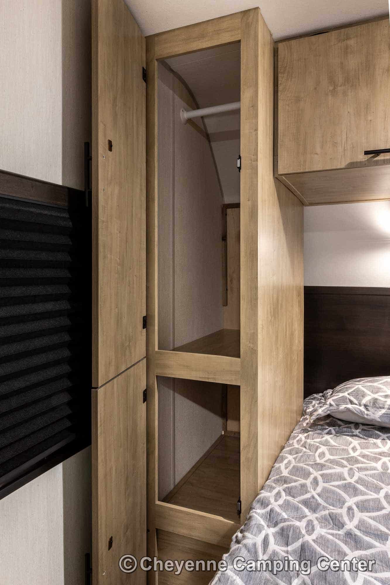 It also comes with the Limited, Campfire, and Base Camp Packages. You’ll have a 153″ x 70″ cargo area with a large rear access door, screen enclosure, and a ramp patio deck system. Other features include a private front RV king bedroom, a 200-watt solar panel, premium wheels, glass entry door, a 15,000 BTU A/C, an exterior shower, a black tank flush, a backup camera, heated holding tanks, MORryde entry steps, and a tankless water heater.